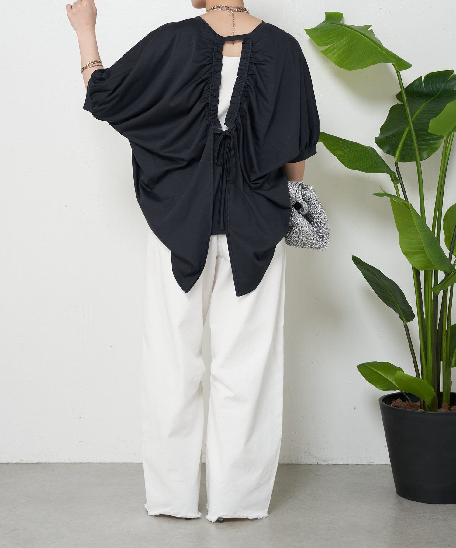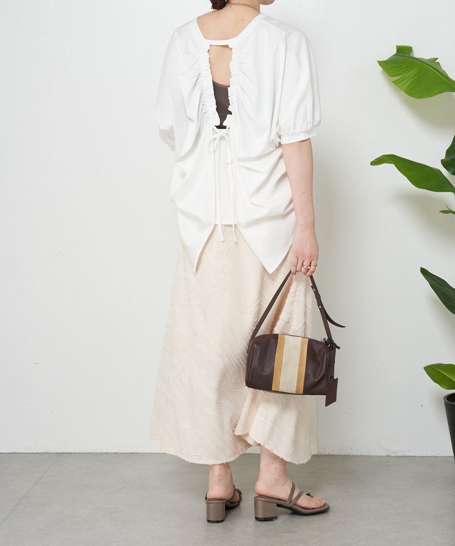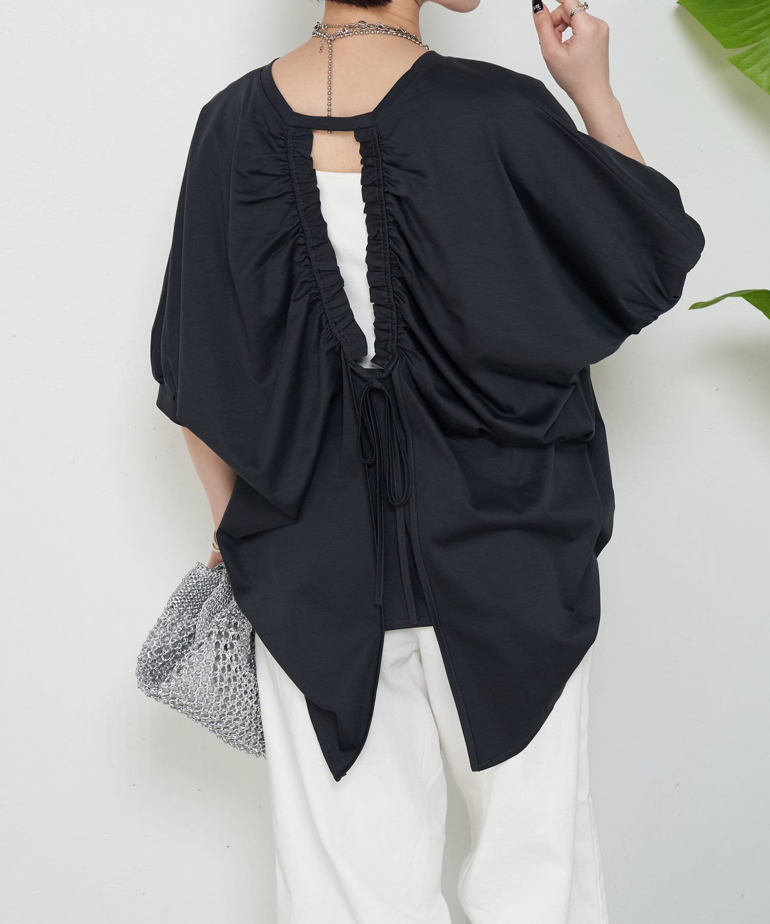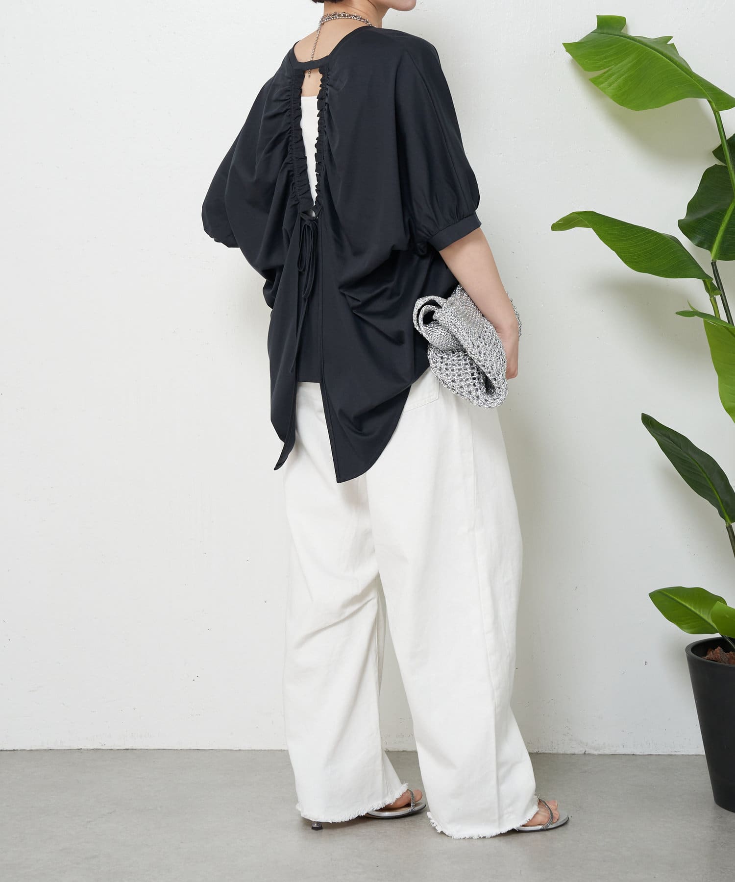 ・フロントはシンプルで着回しやすく、どんなボトムスとも相性抜群ながらバックの抜け感がポイントに。