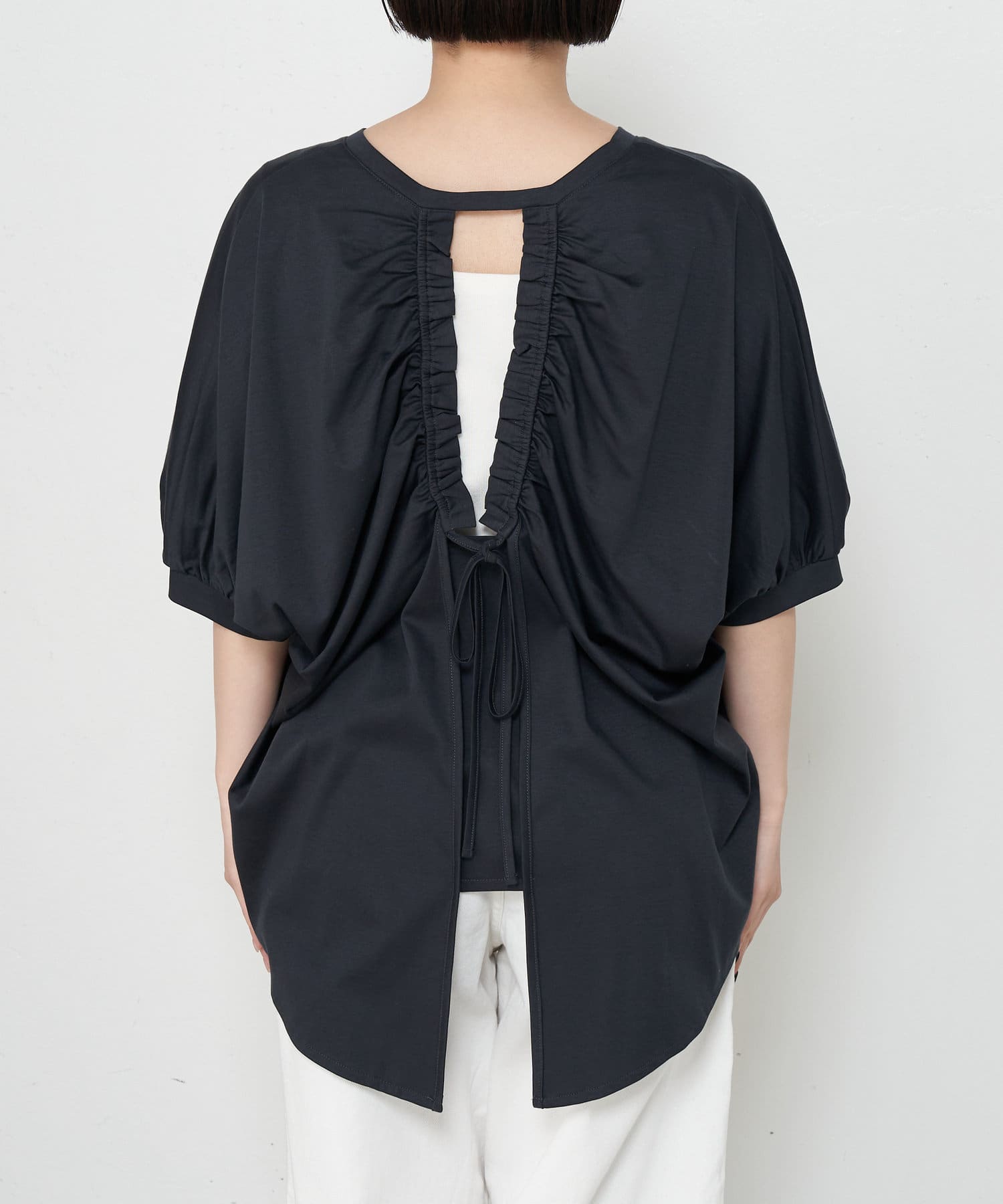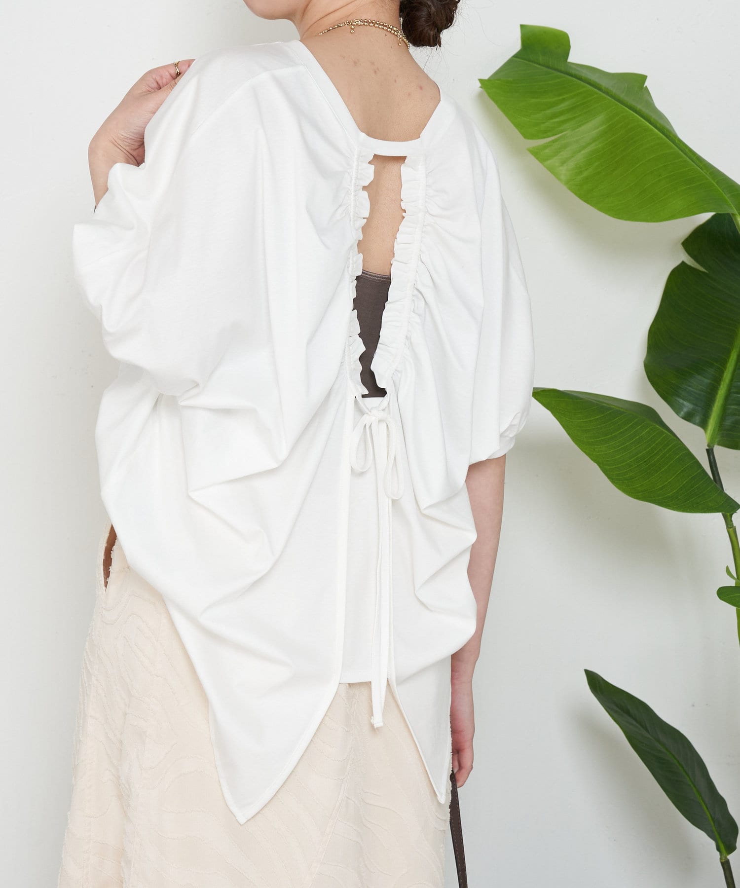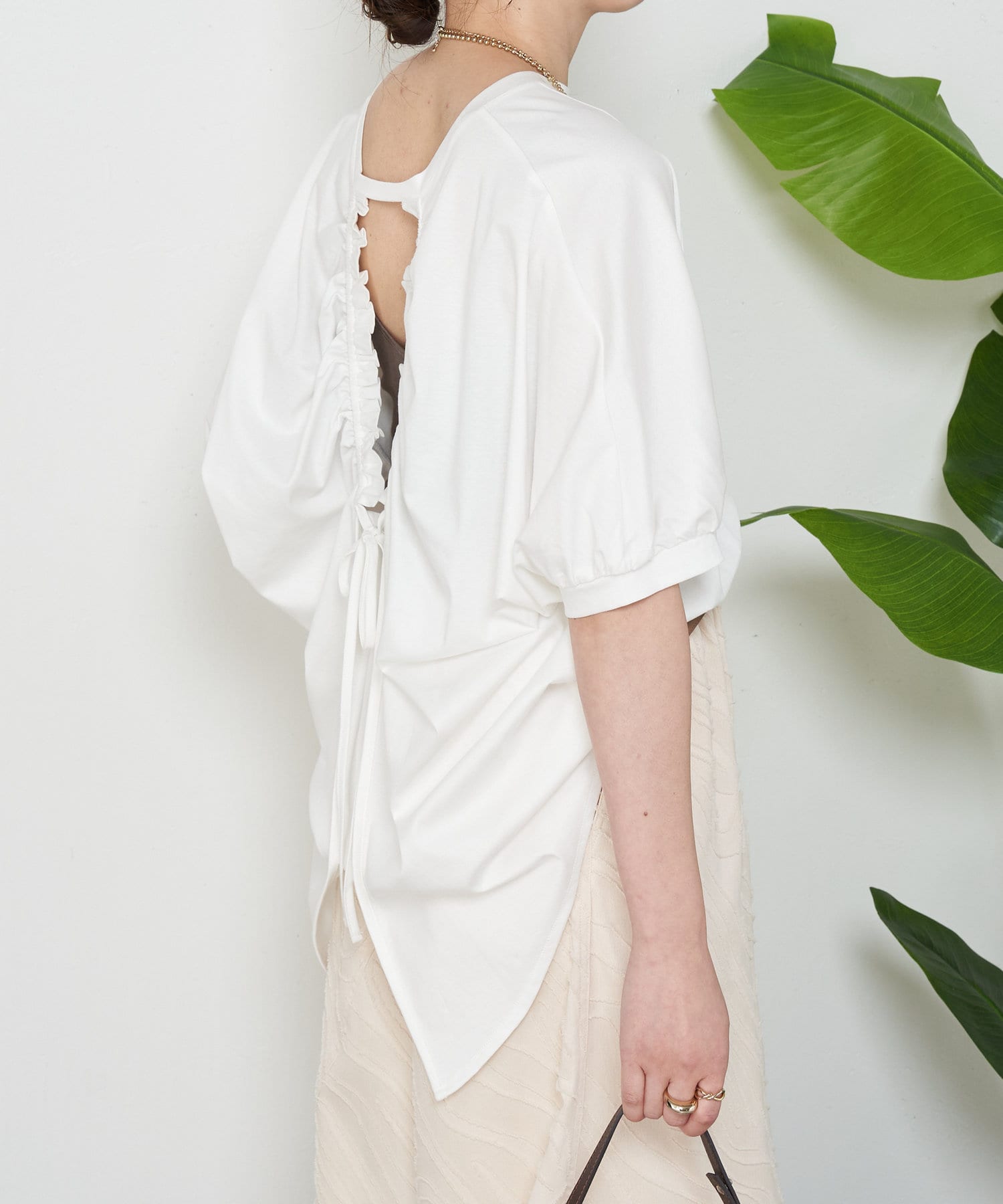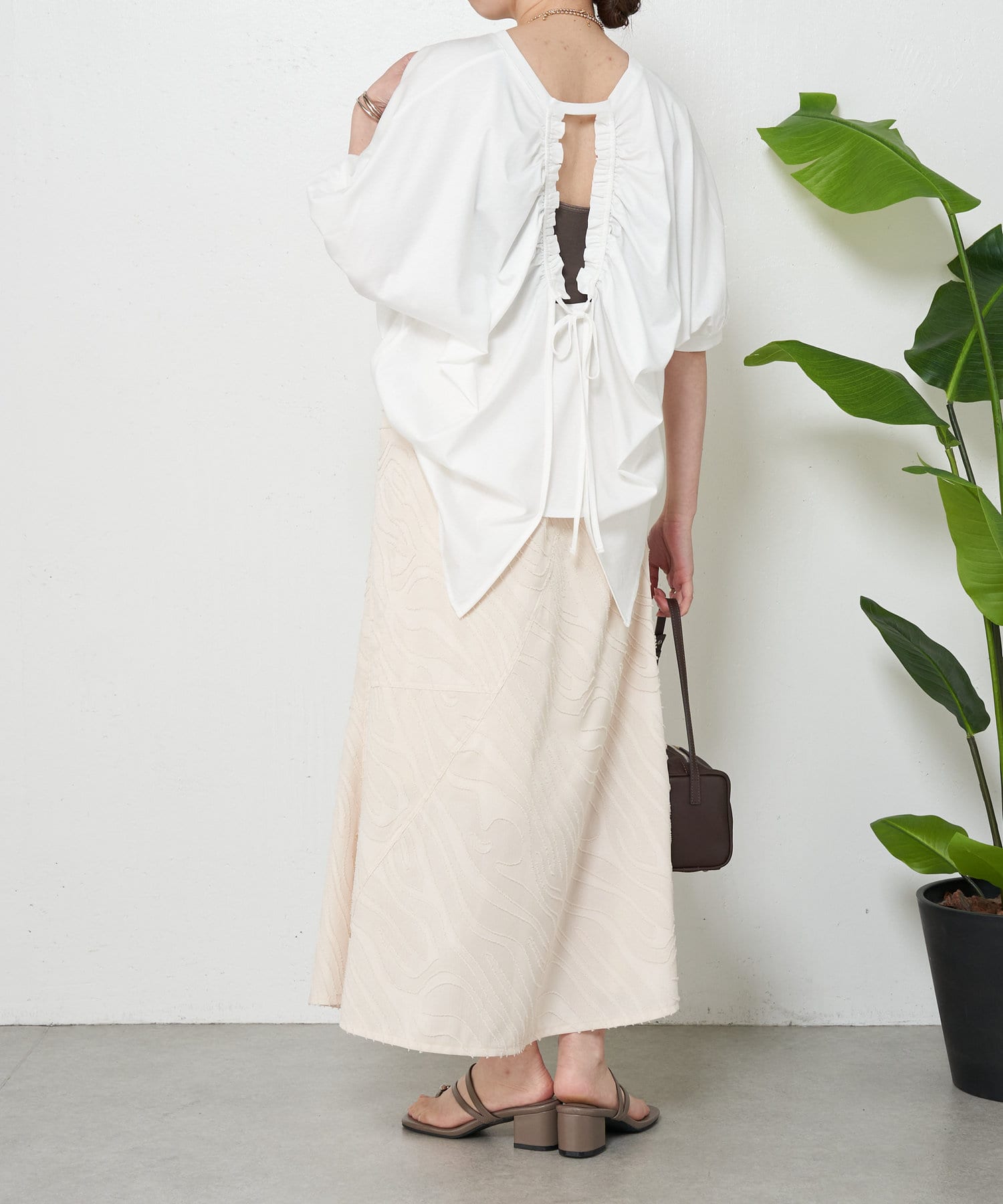 ・フロントはシンプルで着回しやすく、どんなボトムスとも相性抜群ながらバックの抜け感がポイントに。