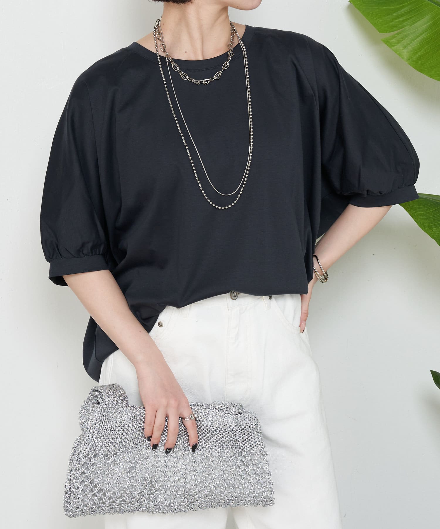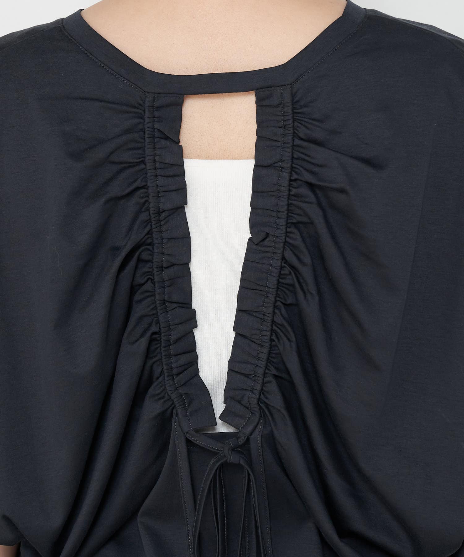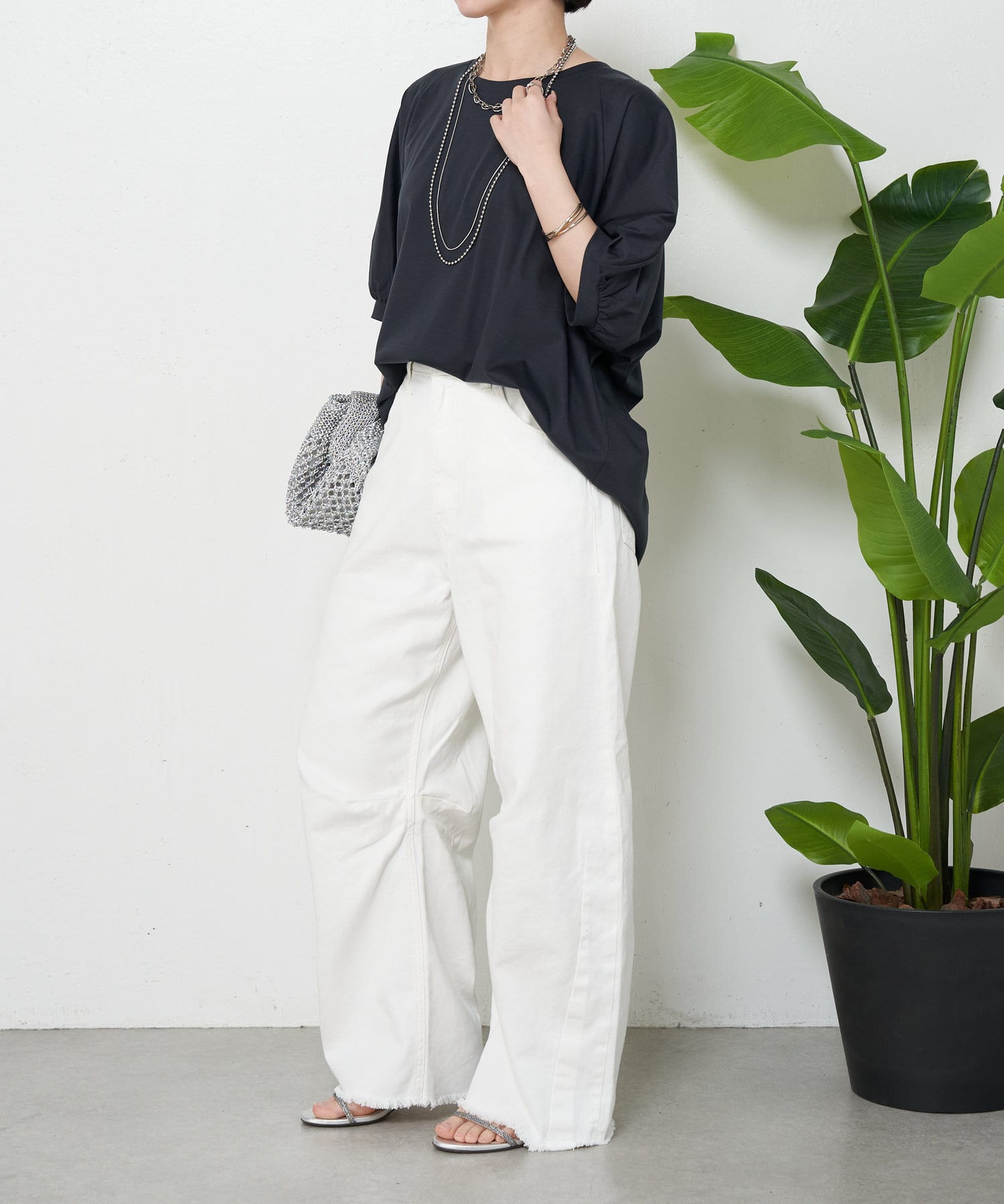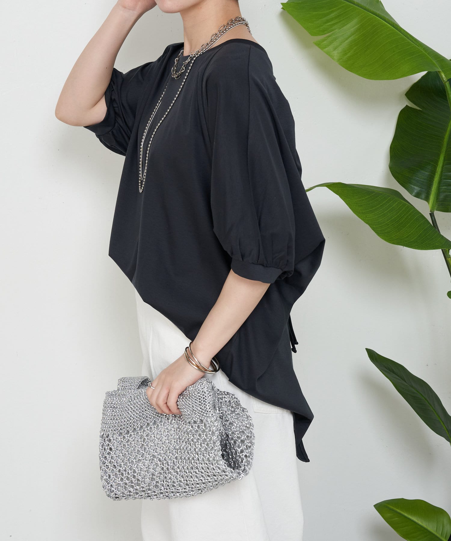 ・フロントはシンプルで着回しやすく、どんなボトムスとも相性抜群ながらバックの抜け感がポイントに。