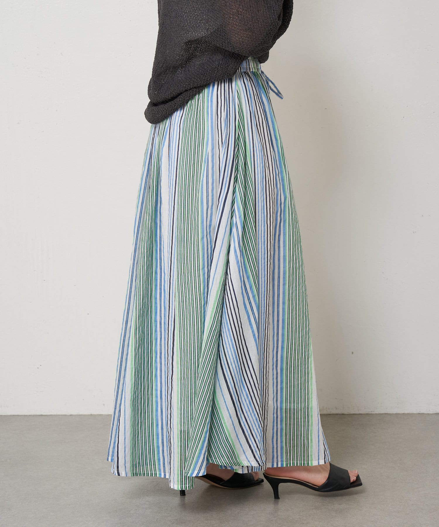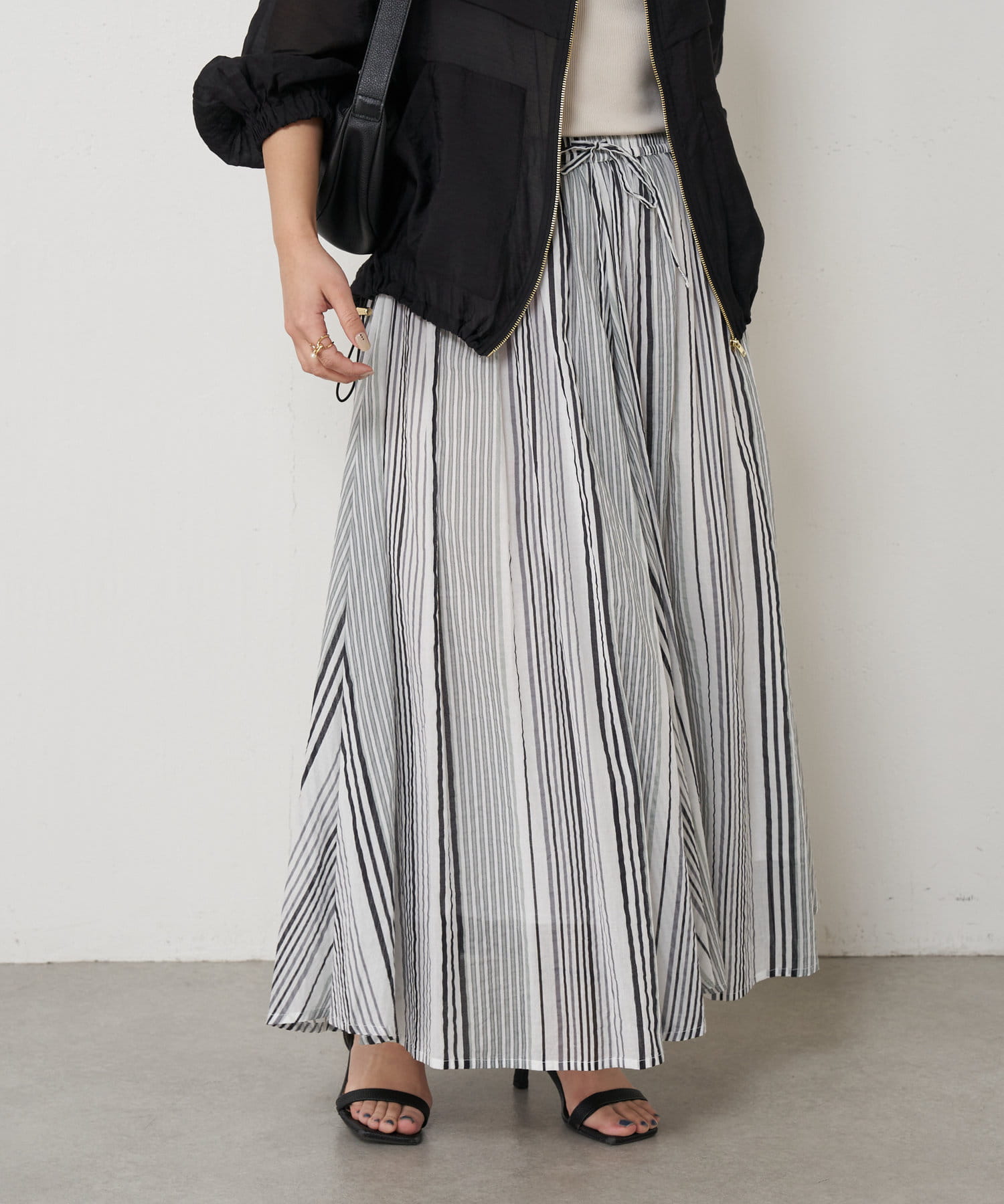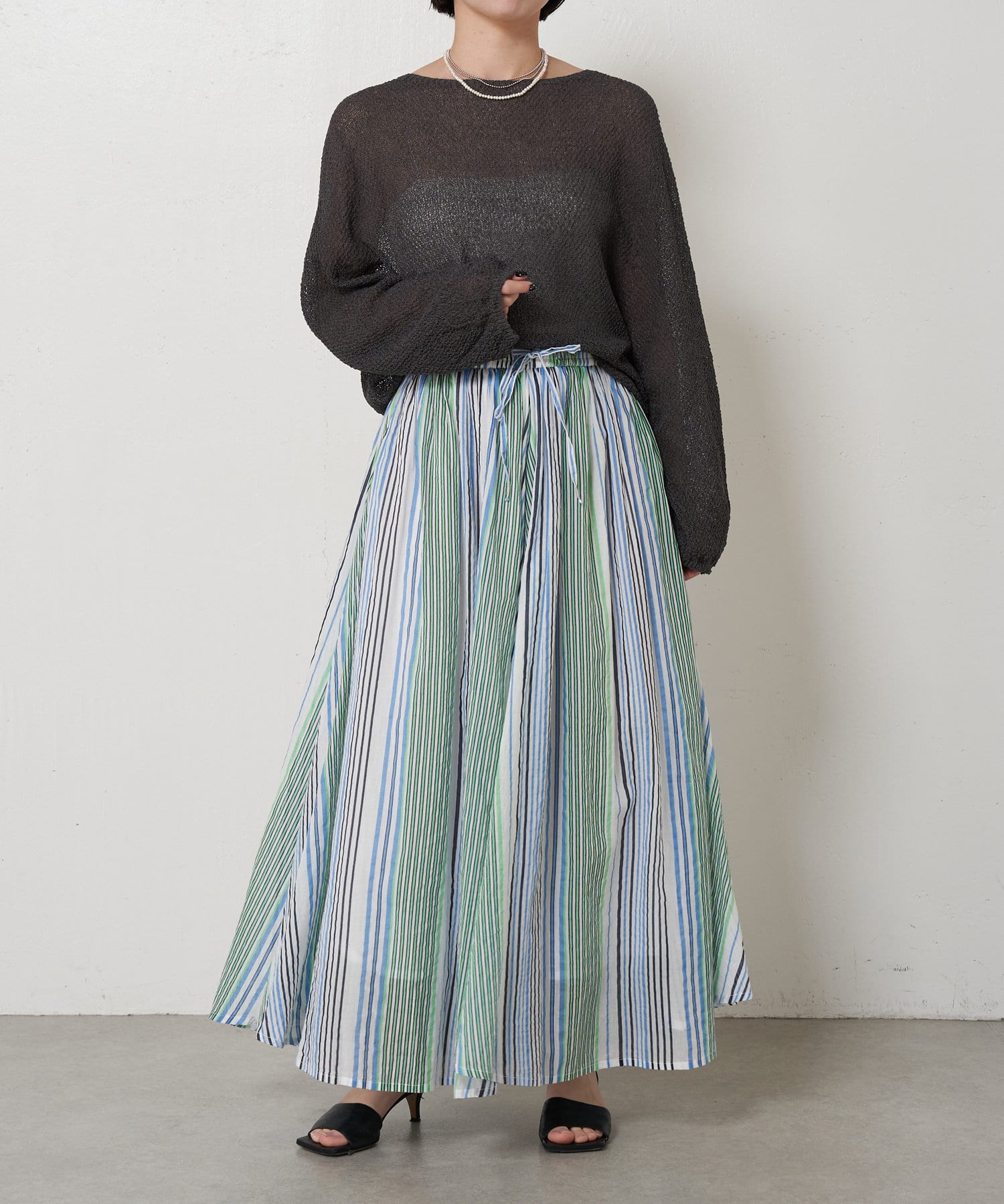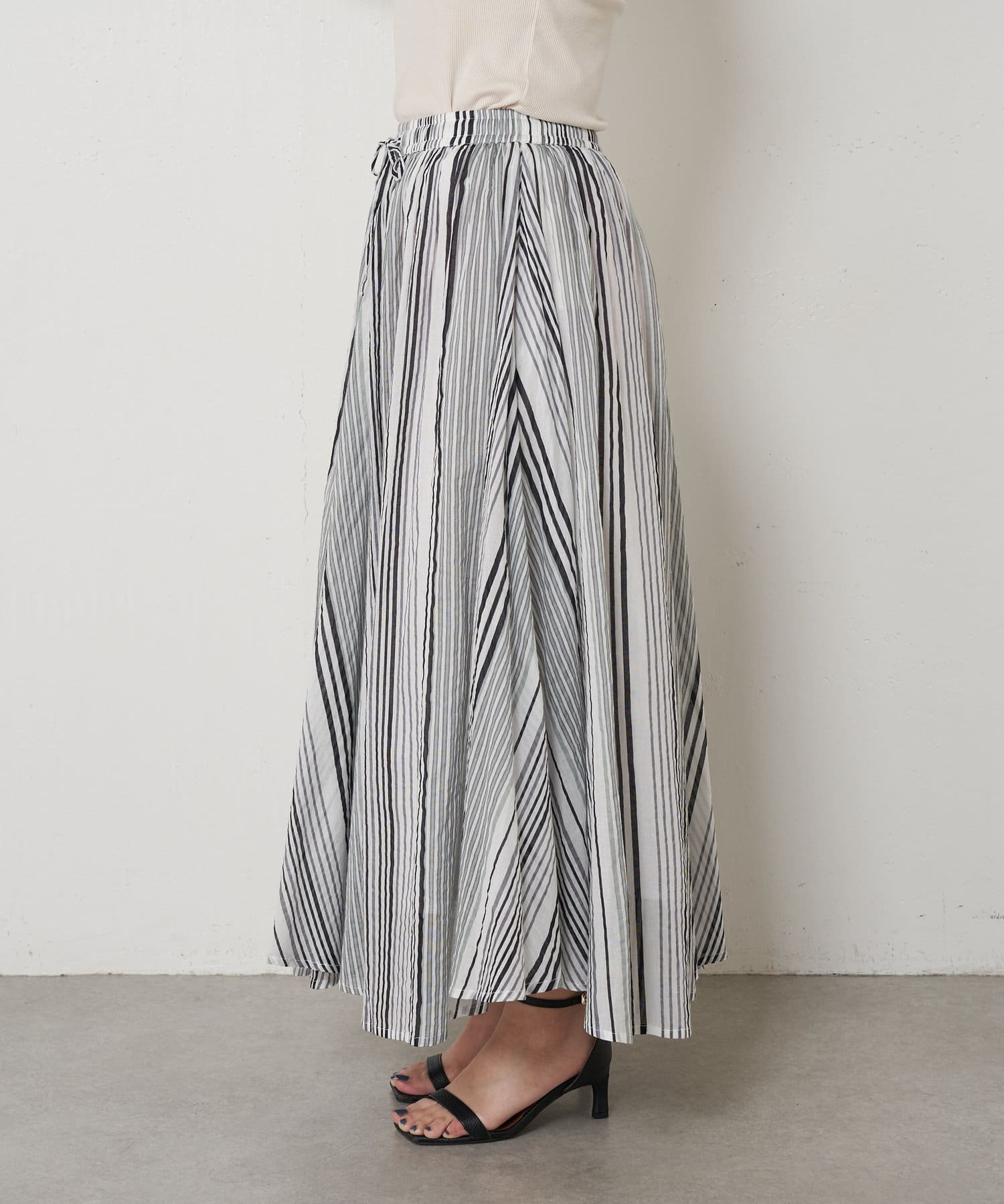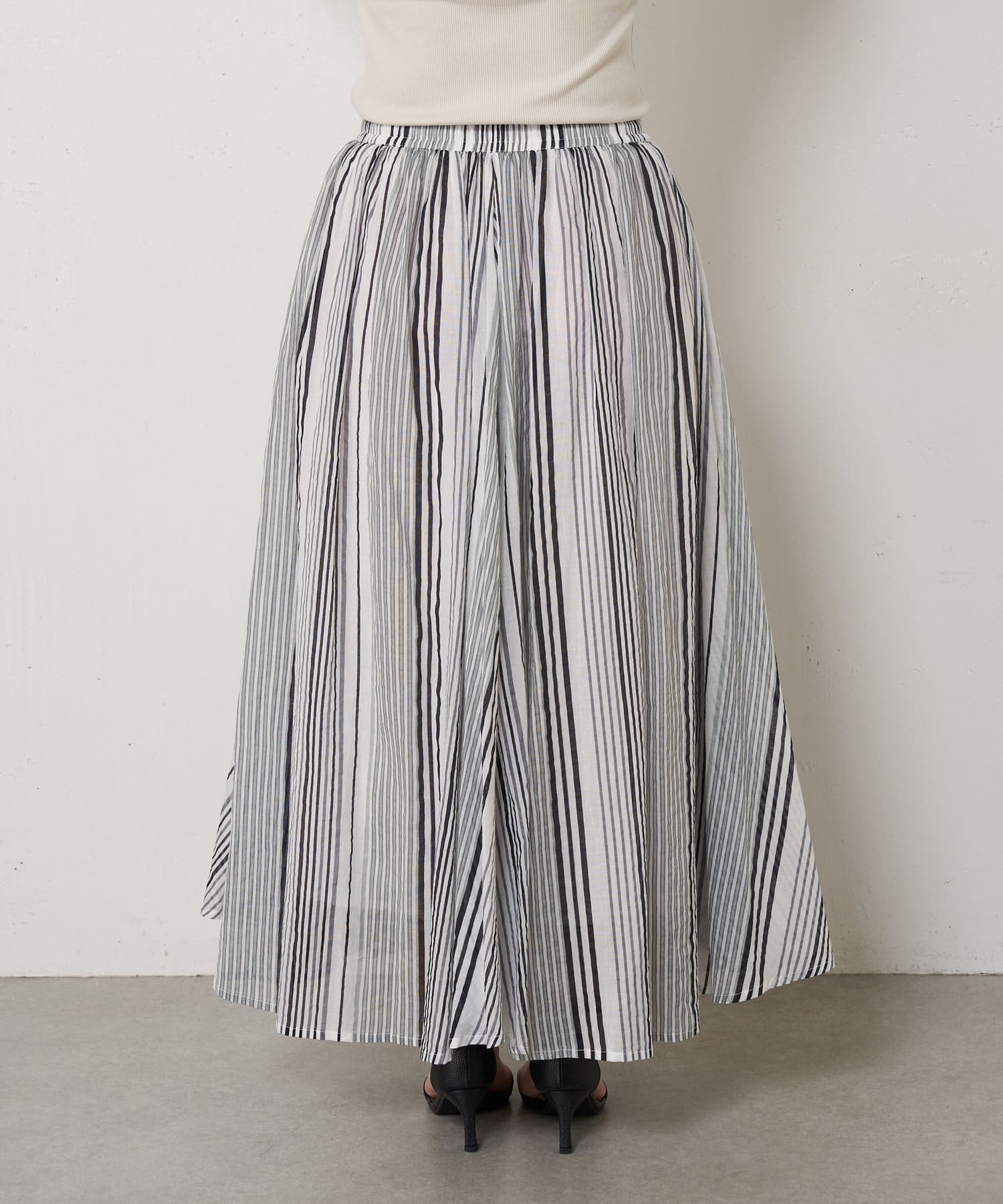 ・ふんわりとしたシルエットながら程よい広がりで、ウエストゴムのロングスカート。