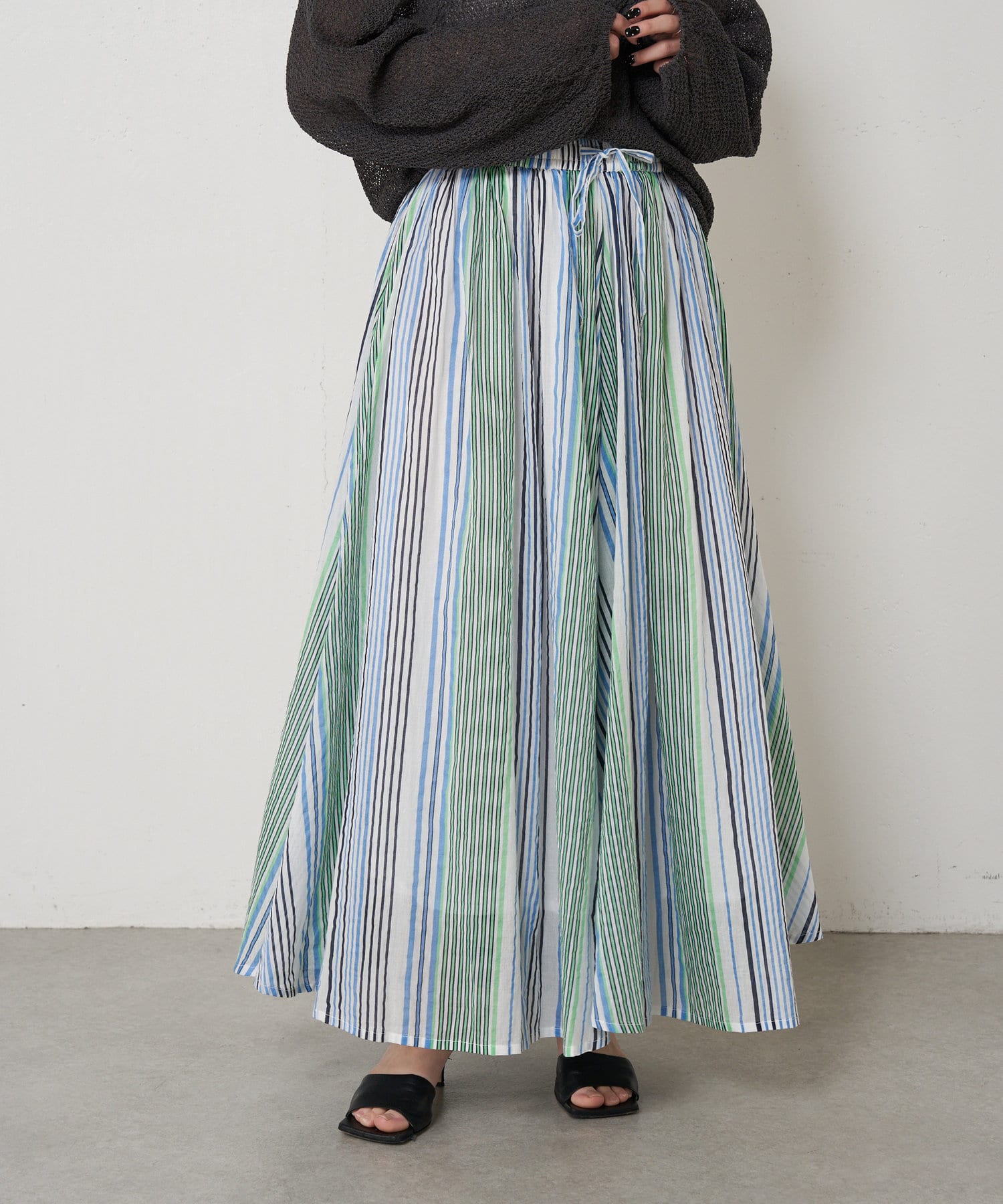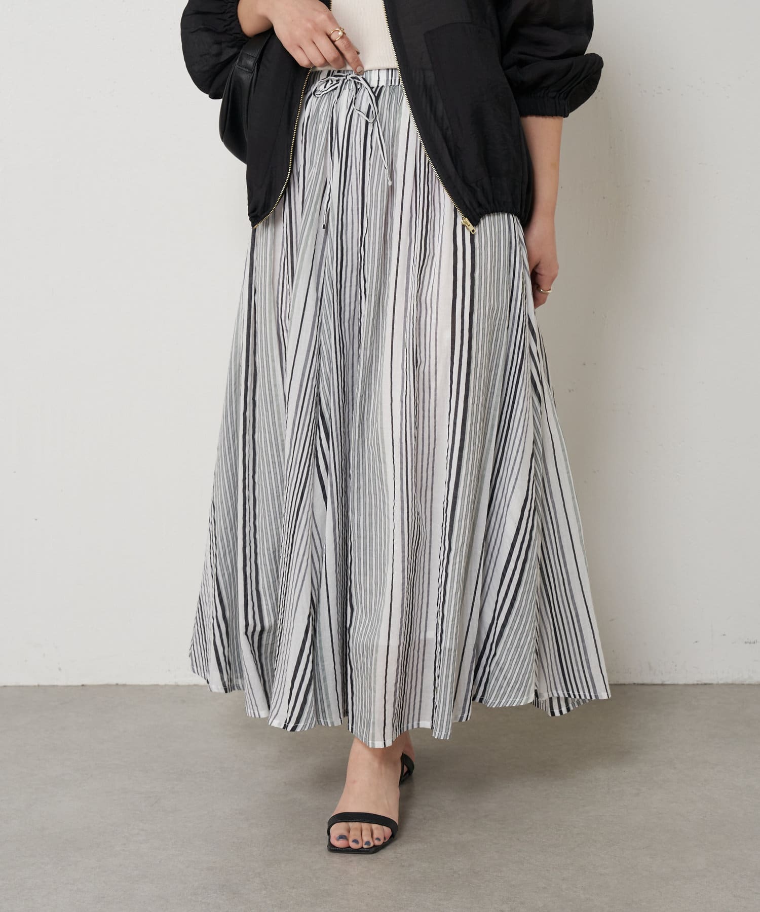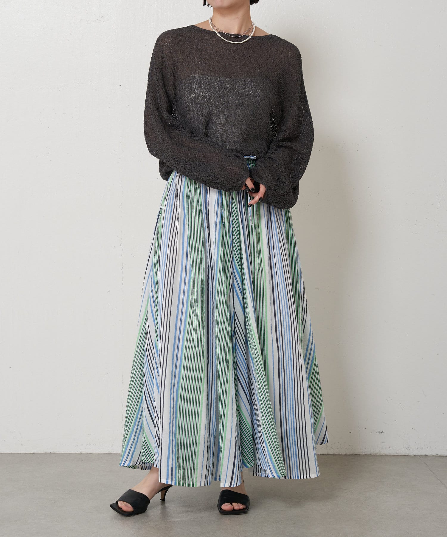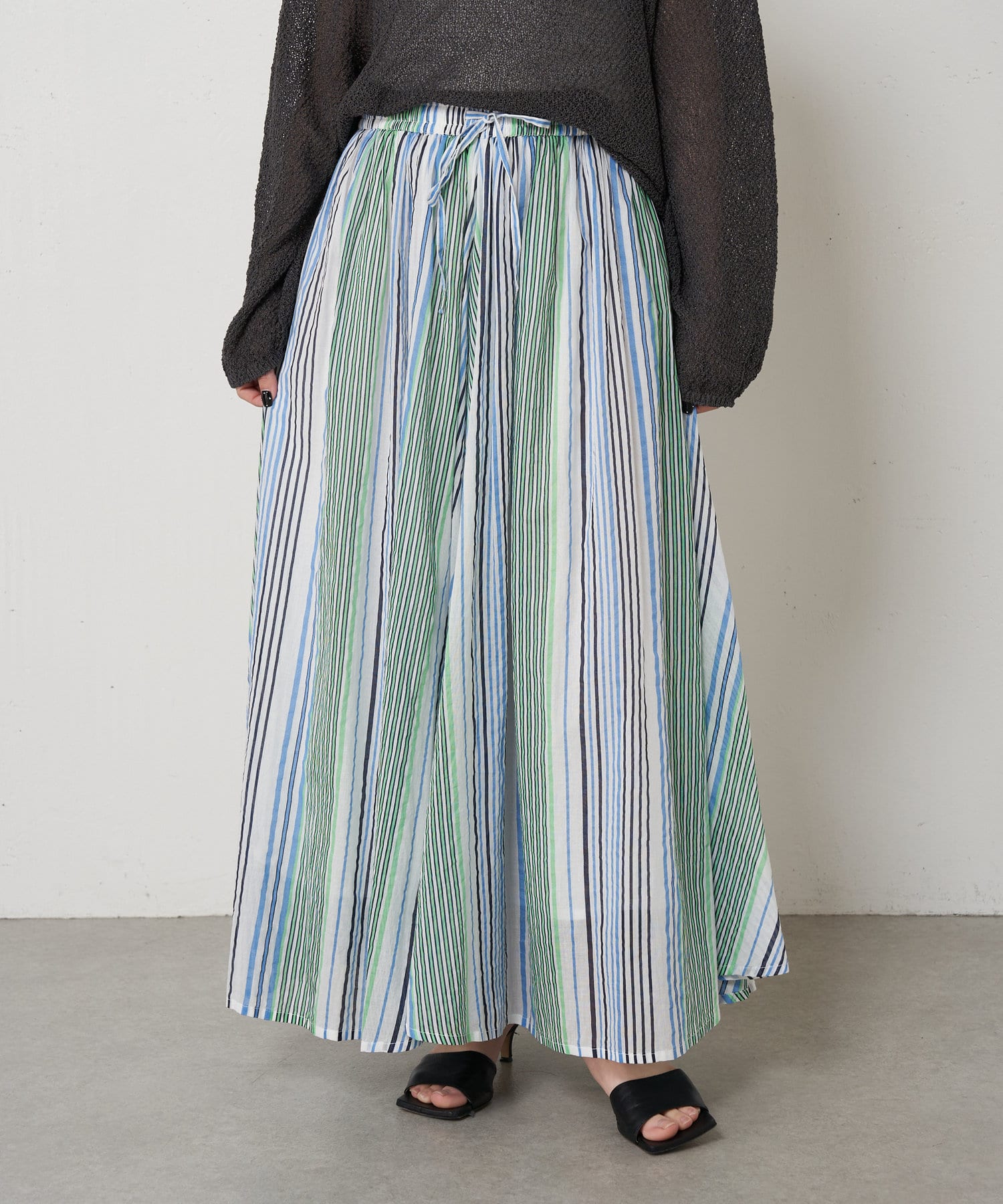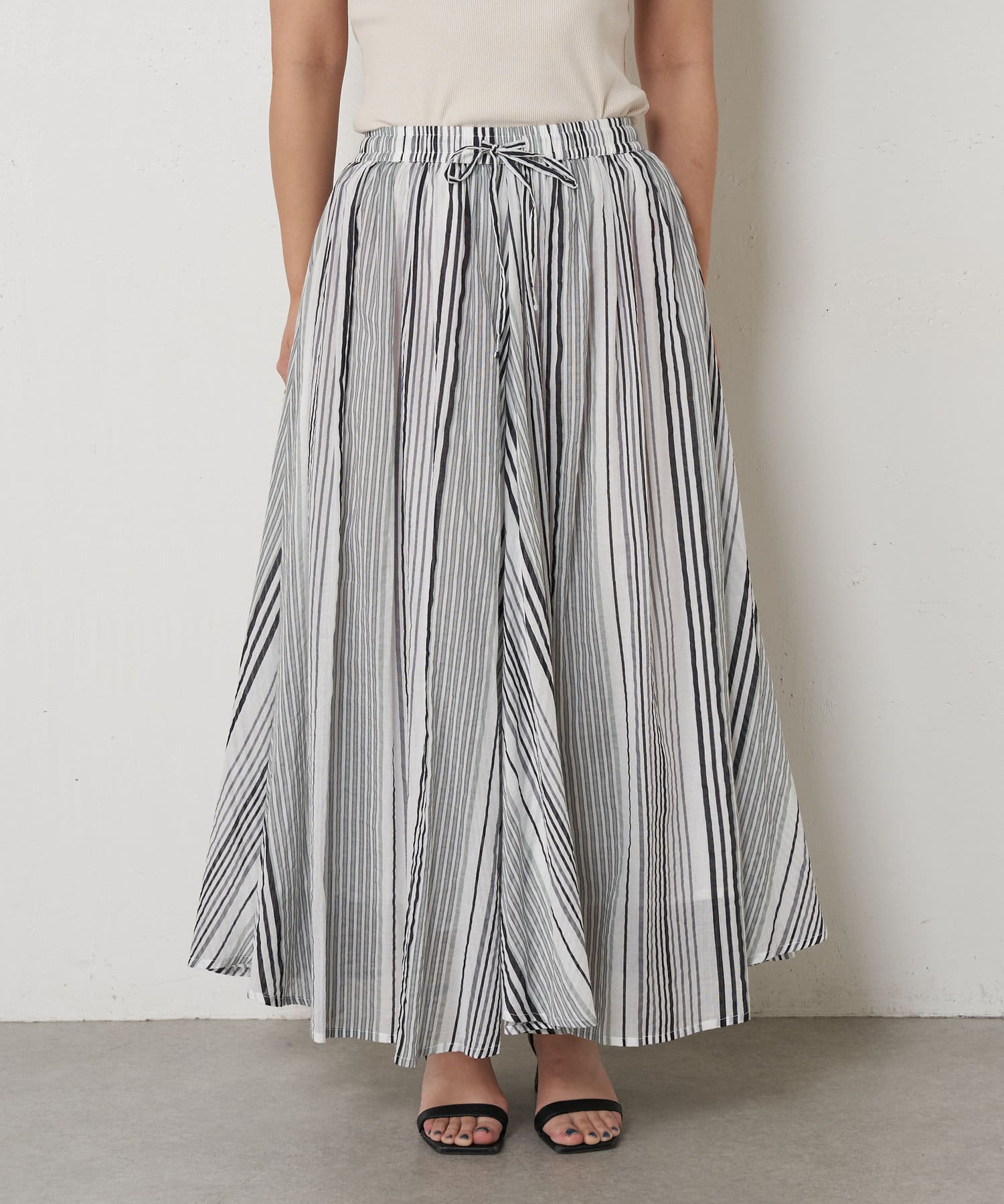 ・ふんわりとしたシルエットながら程よい広がりで、ウエストゴムのロングスカート。
