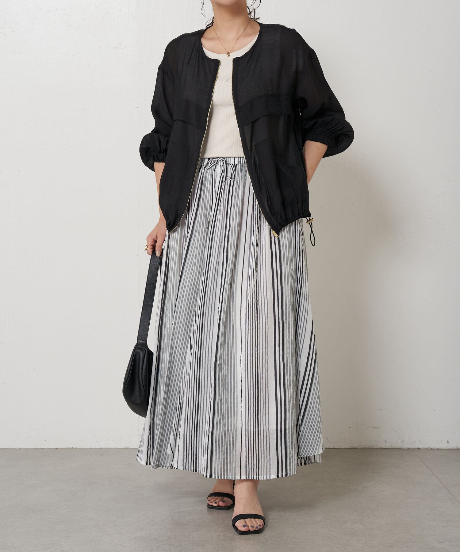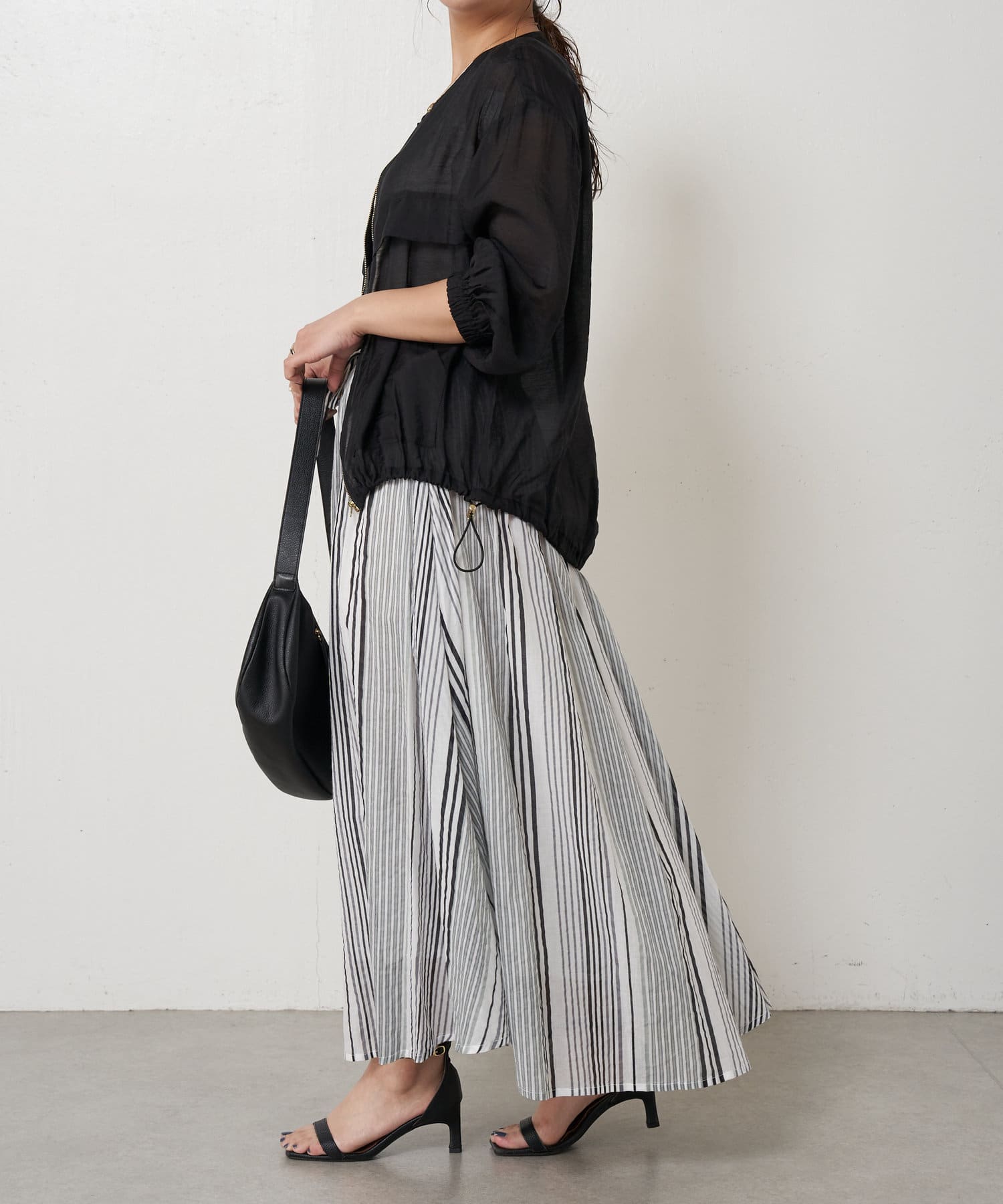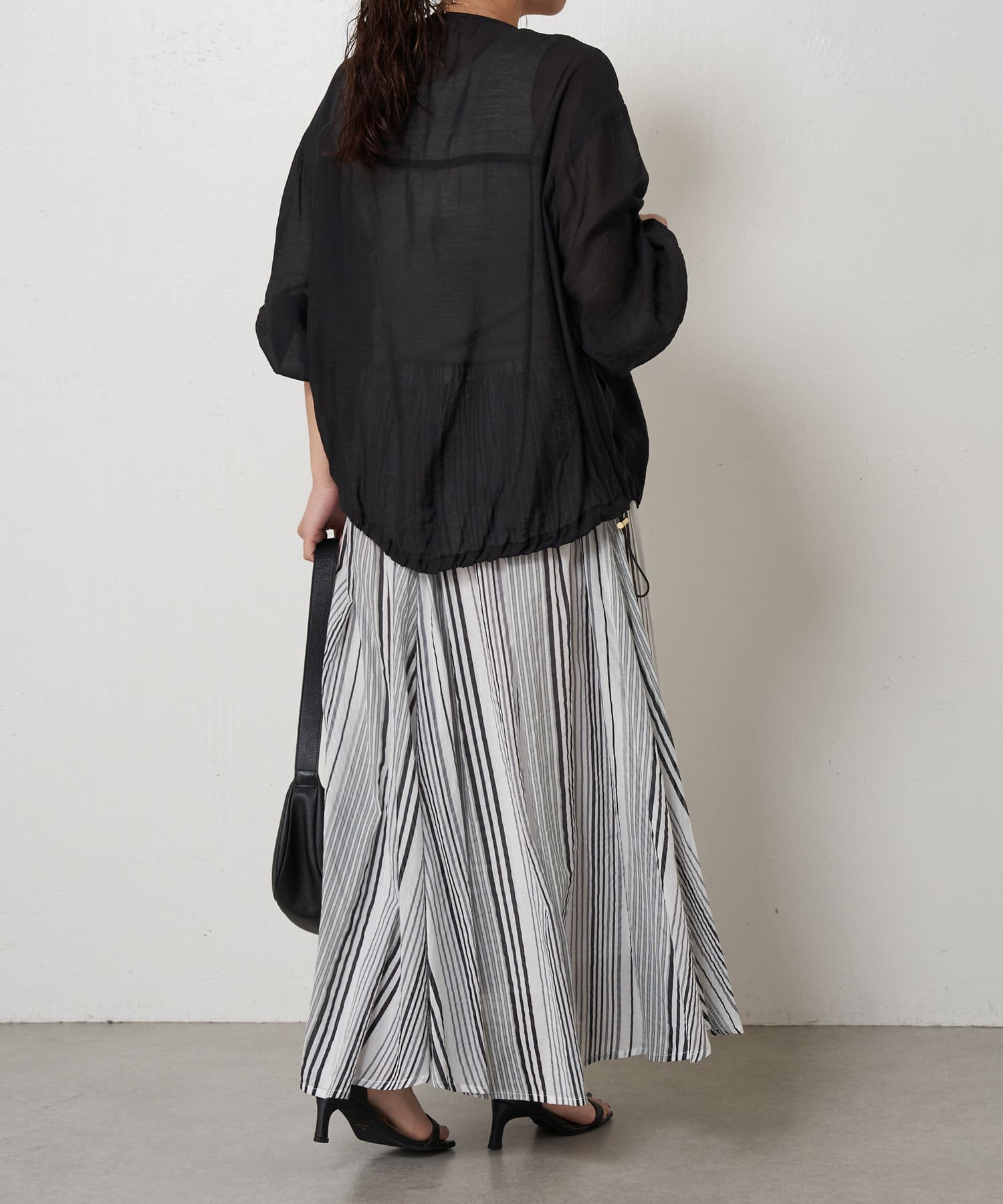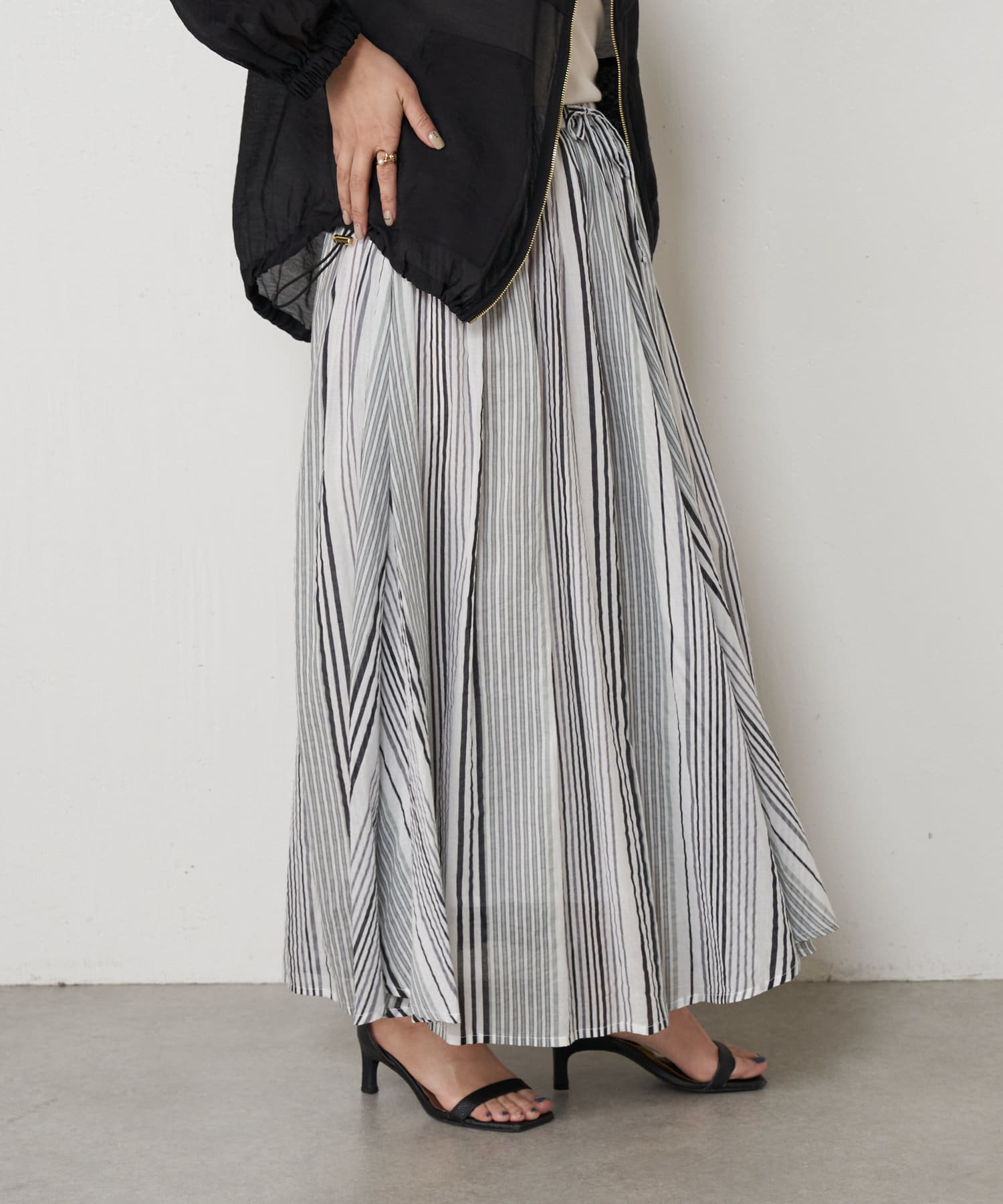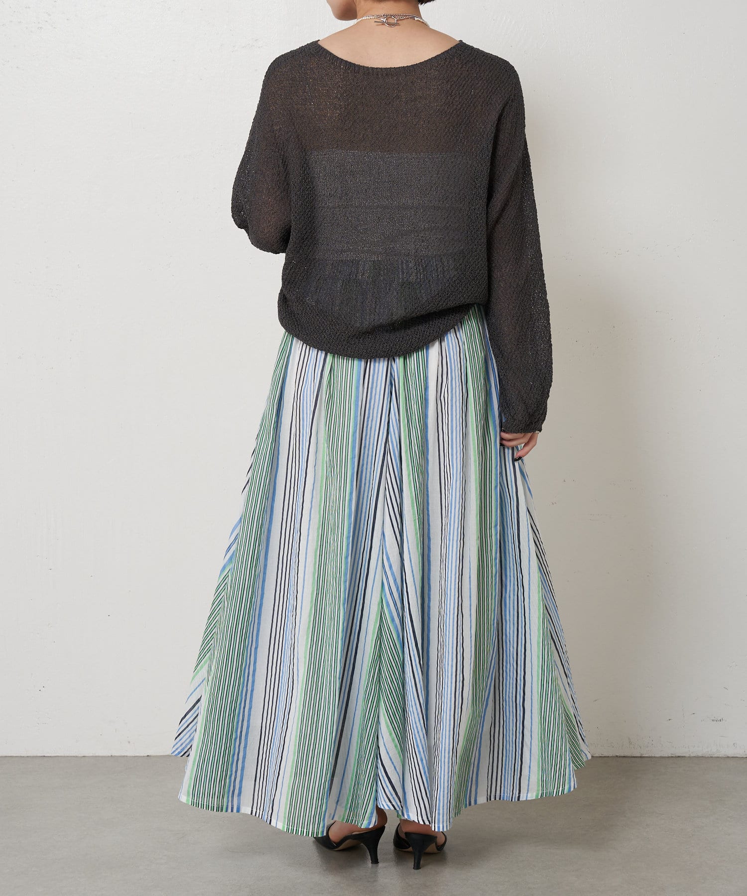 ・ふんわりとしたシルエットながら程よい広がりで、ウエストゴムのロングスカート。