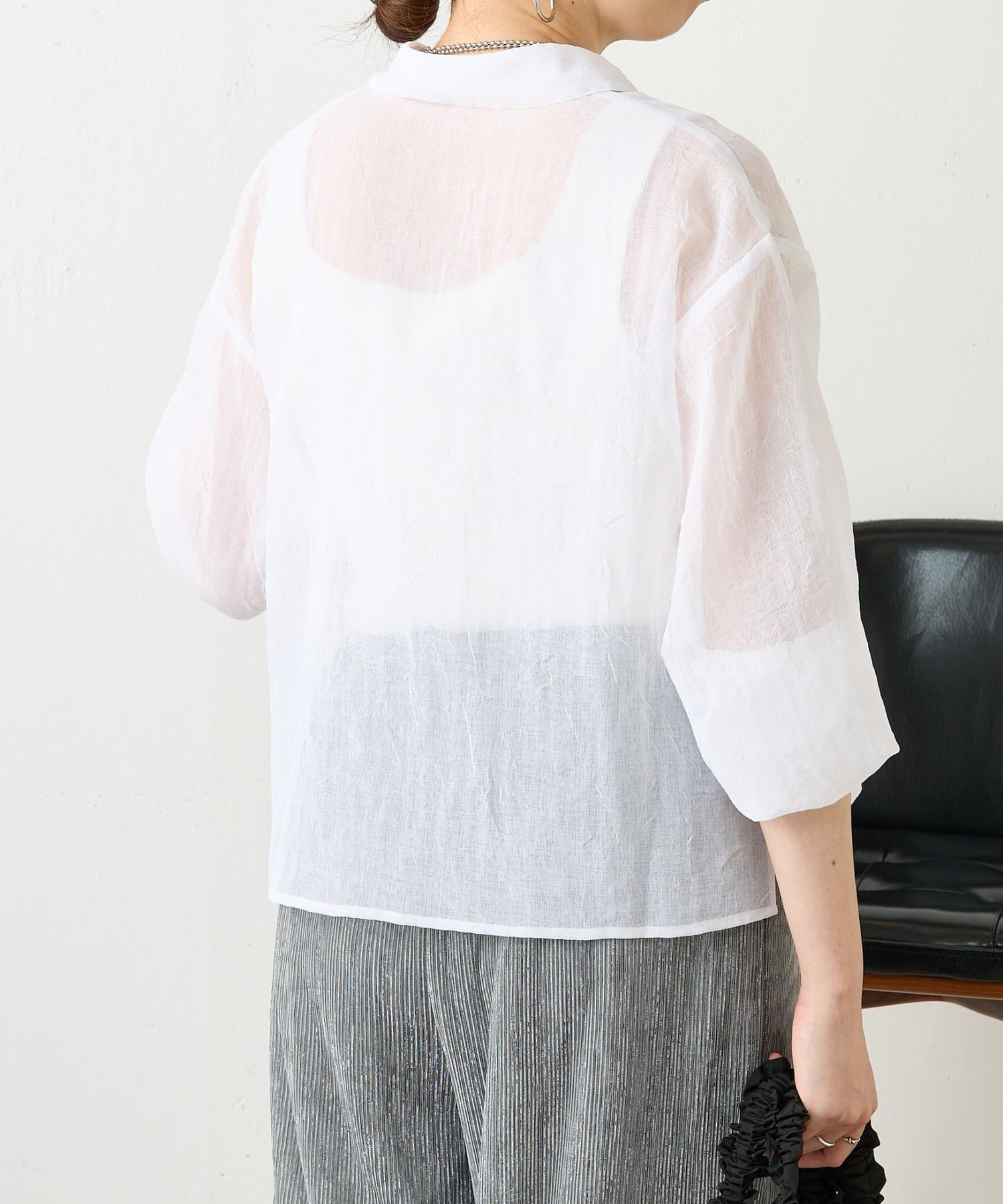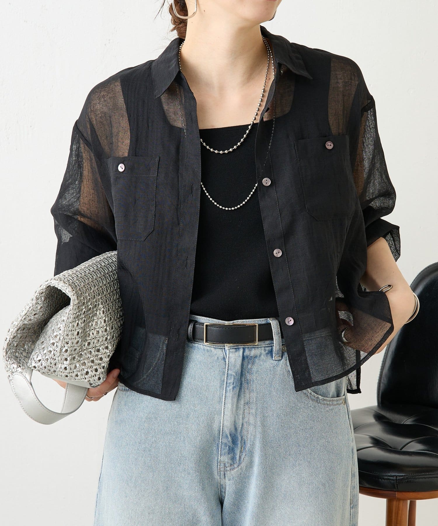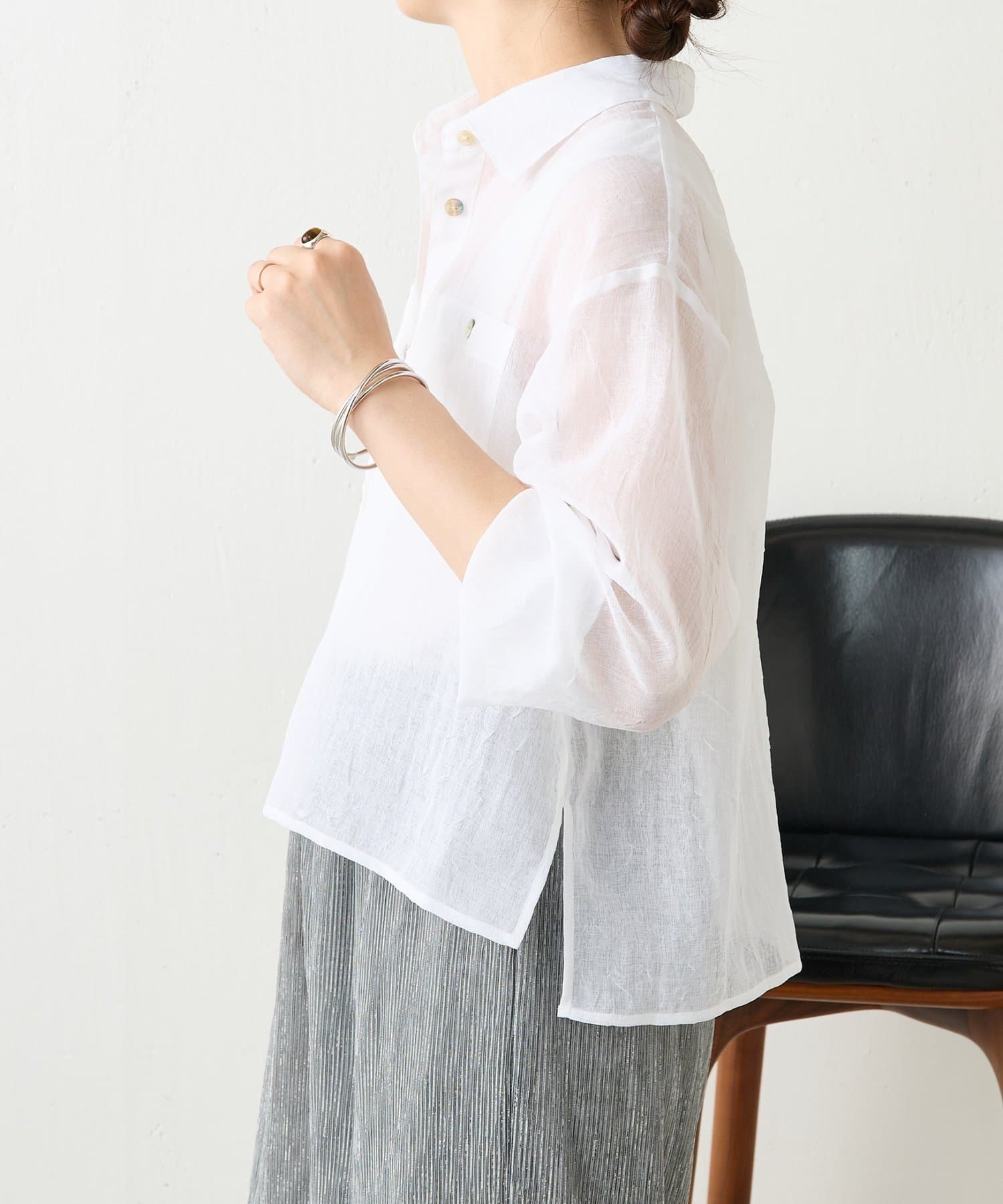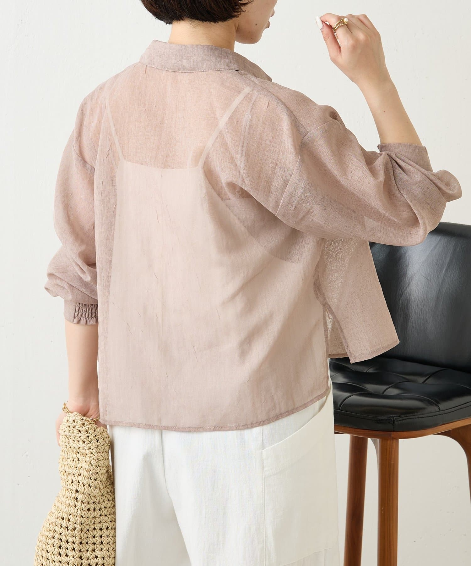 ・程よく透け感のある軽やかな素材が、涼しげで上品な印象を与えるシアーシャツ。