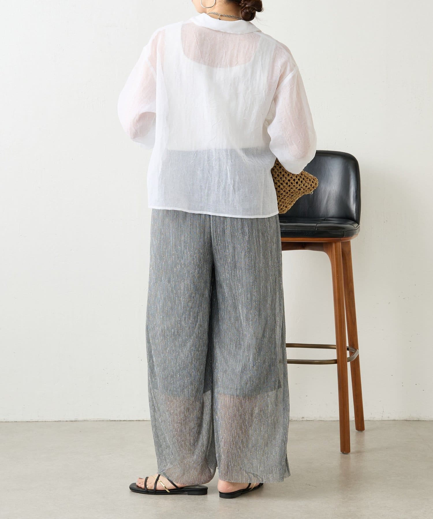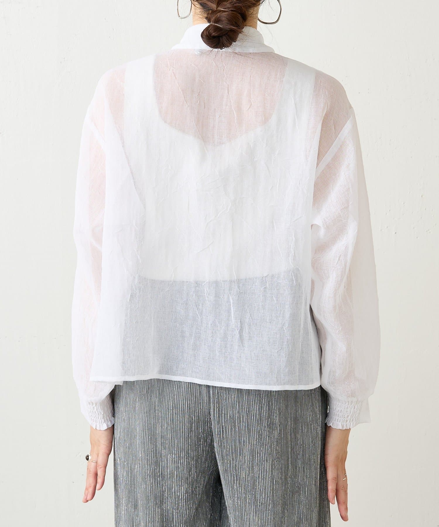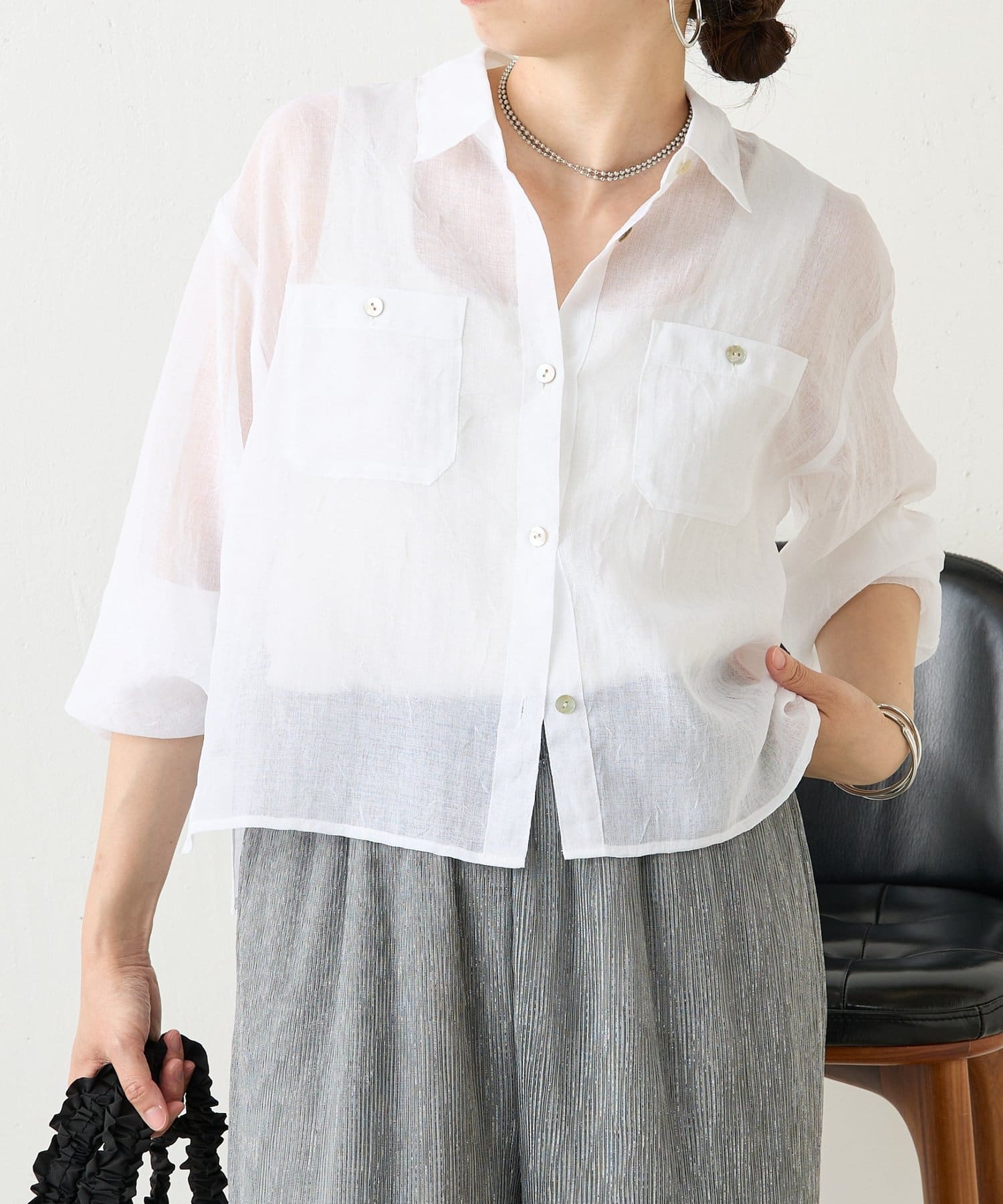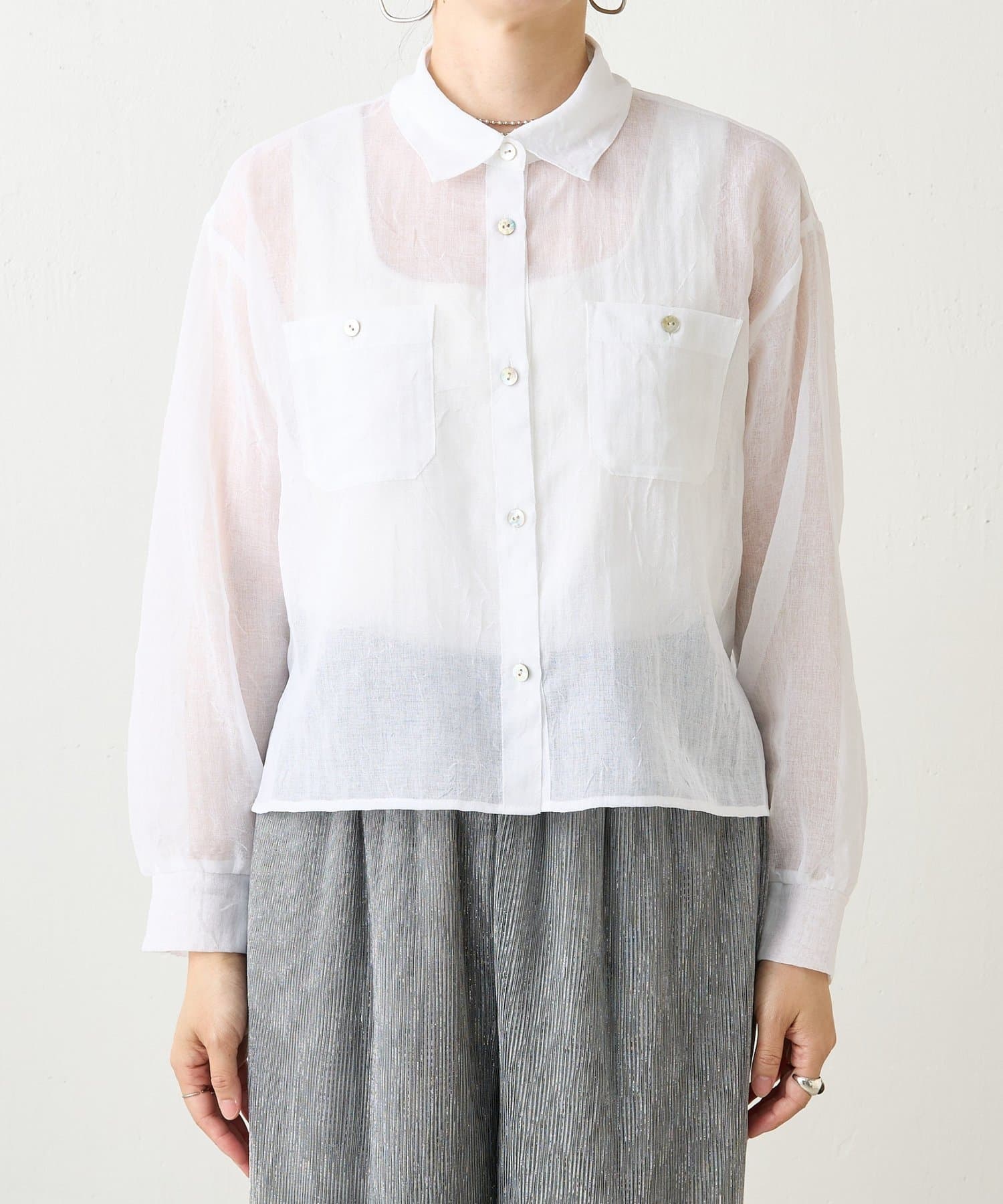 ・程よく透け感のある軽やかな素材が、涼しげで上品な印象を与えるシアーシャツ。