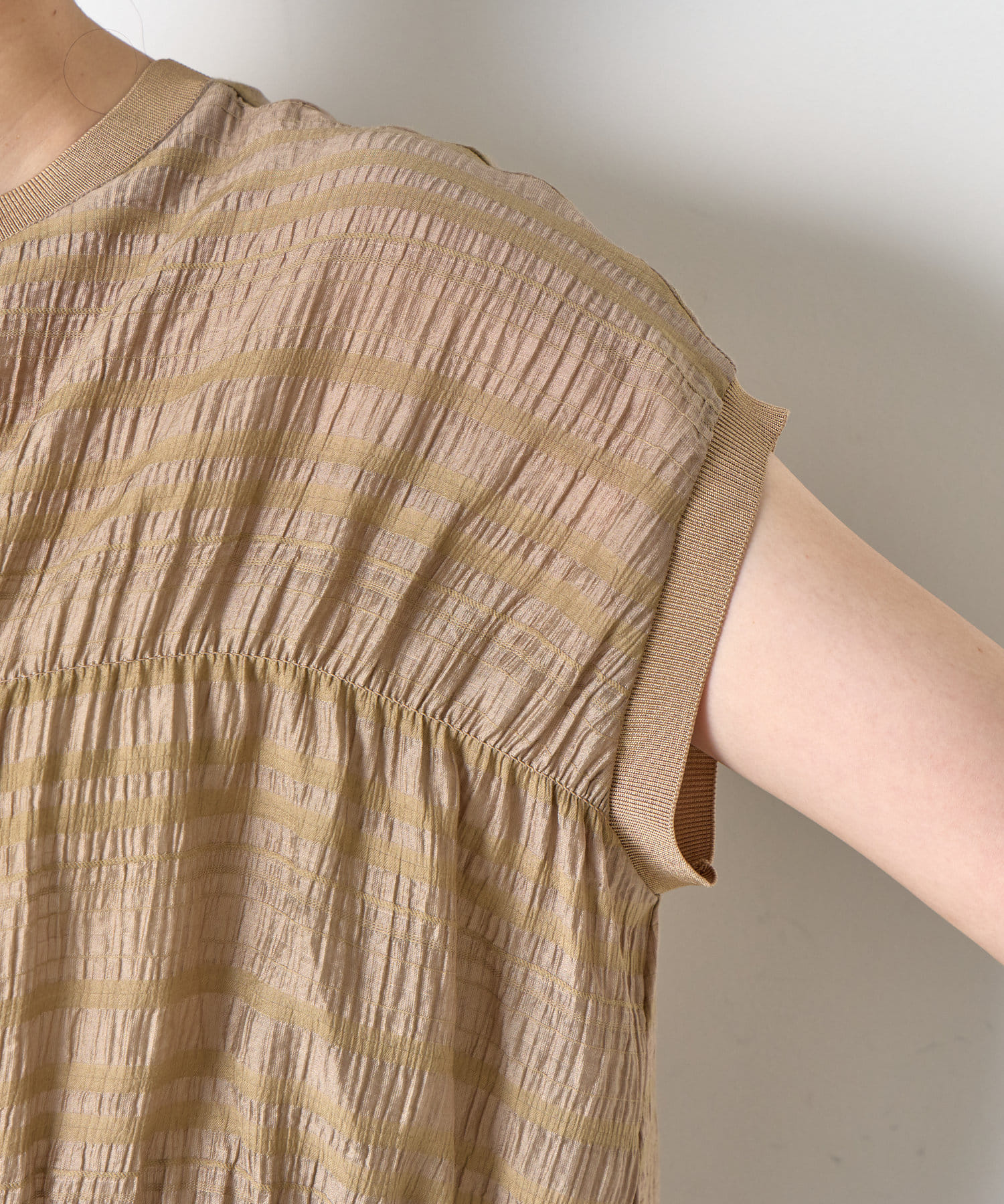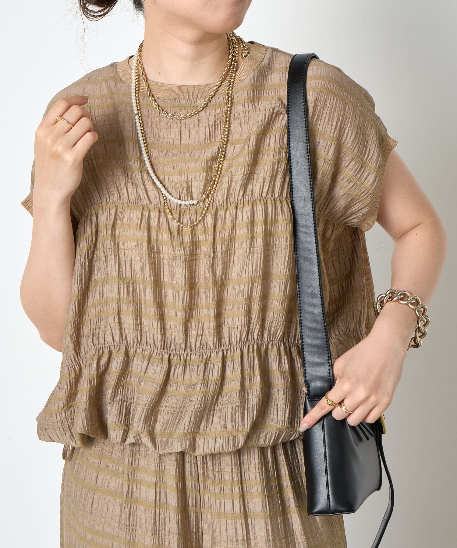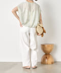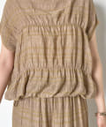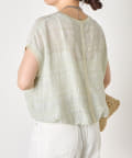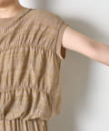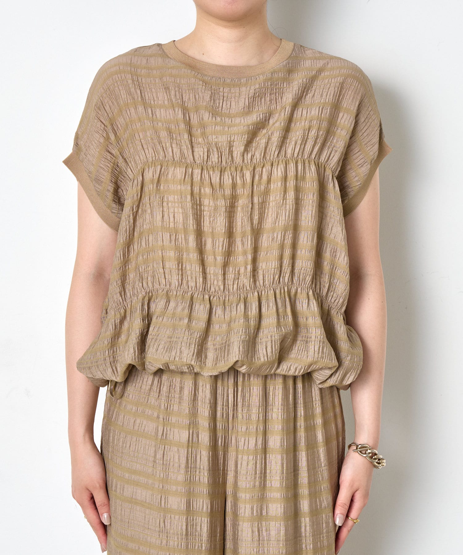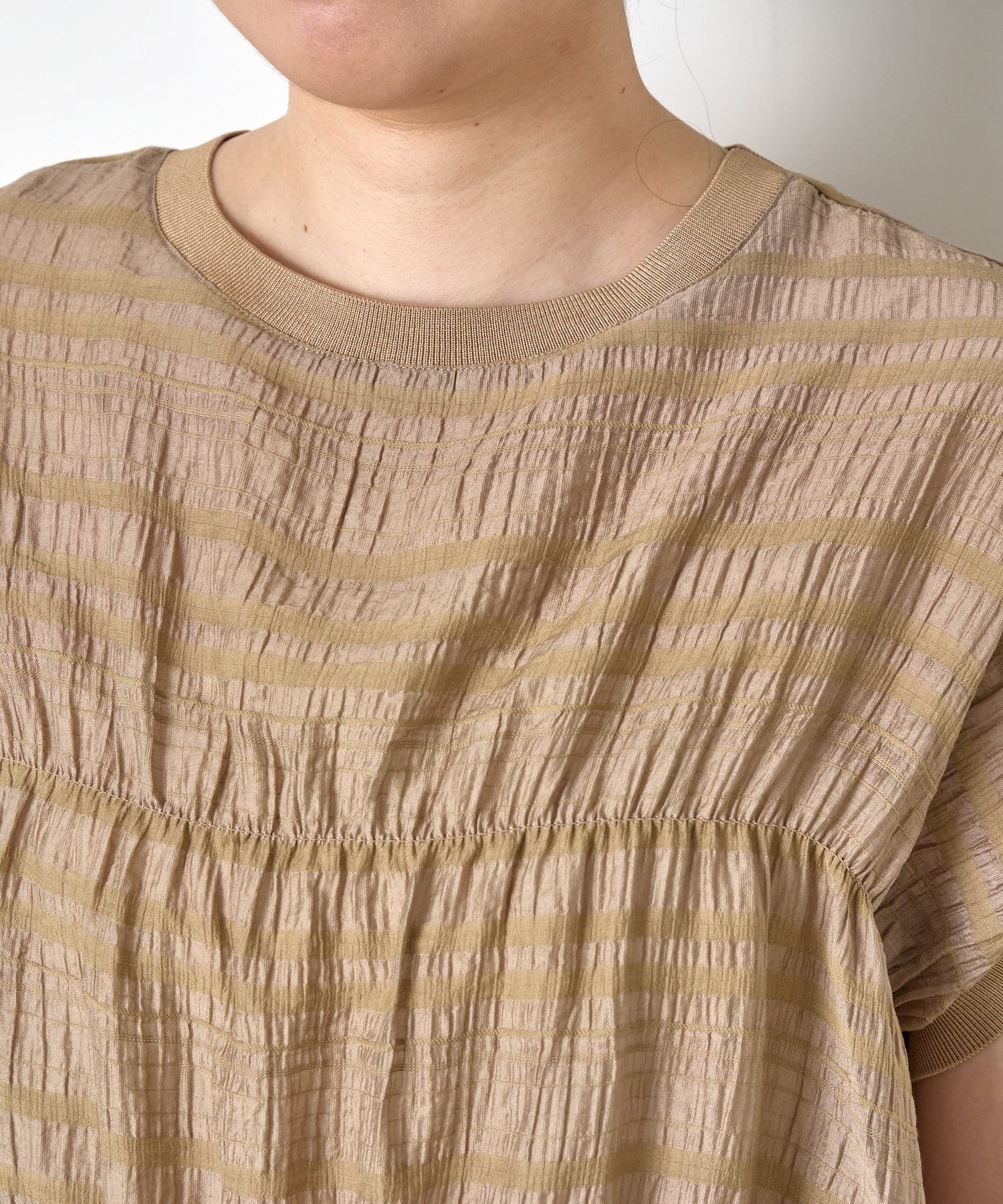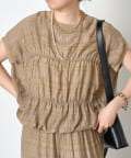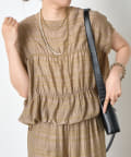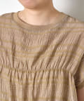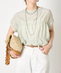 ・ランダムなシャーリングギャザーが魅力。女性らしい印象に仕上げてくれるフレンチスリーブブラウス。