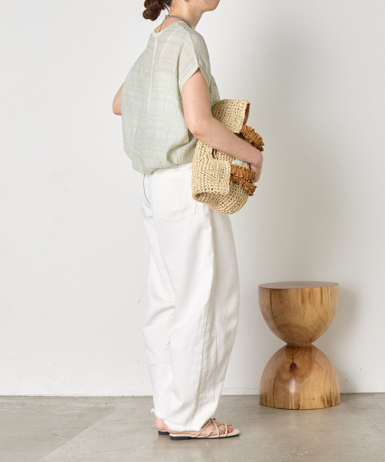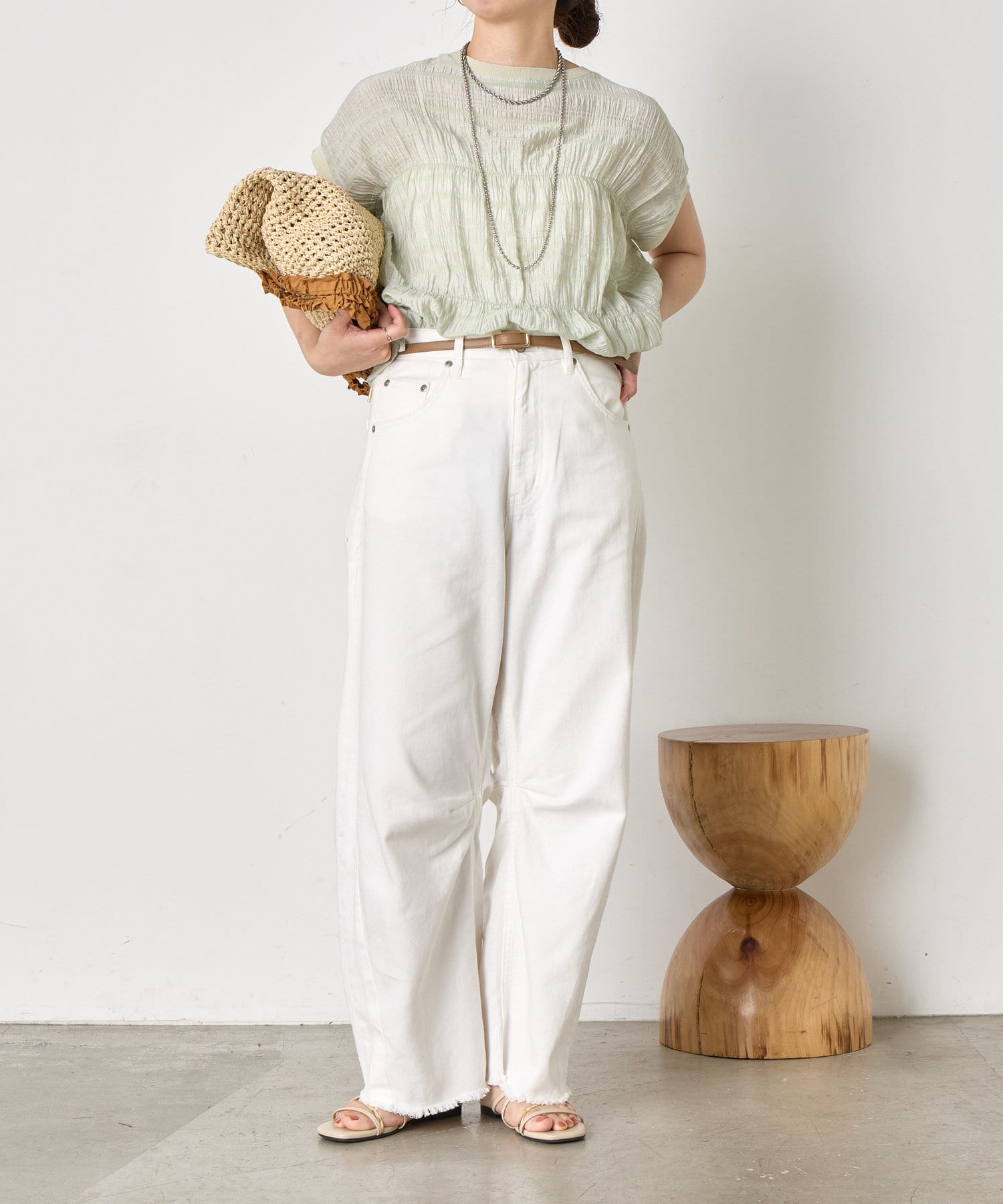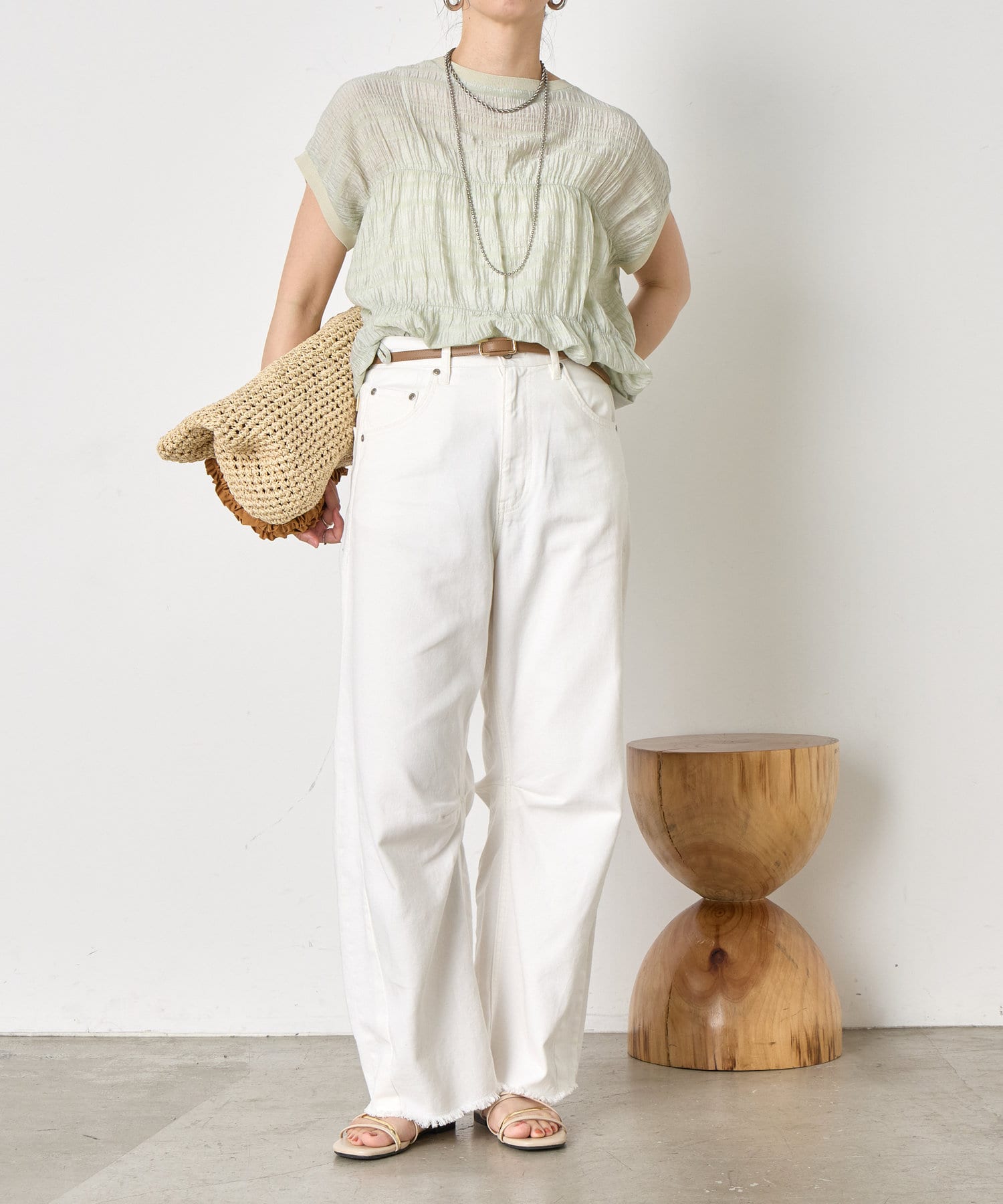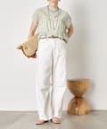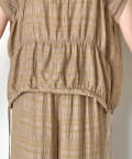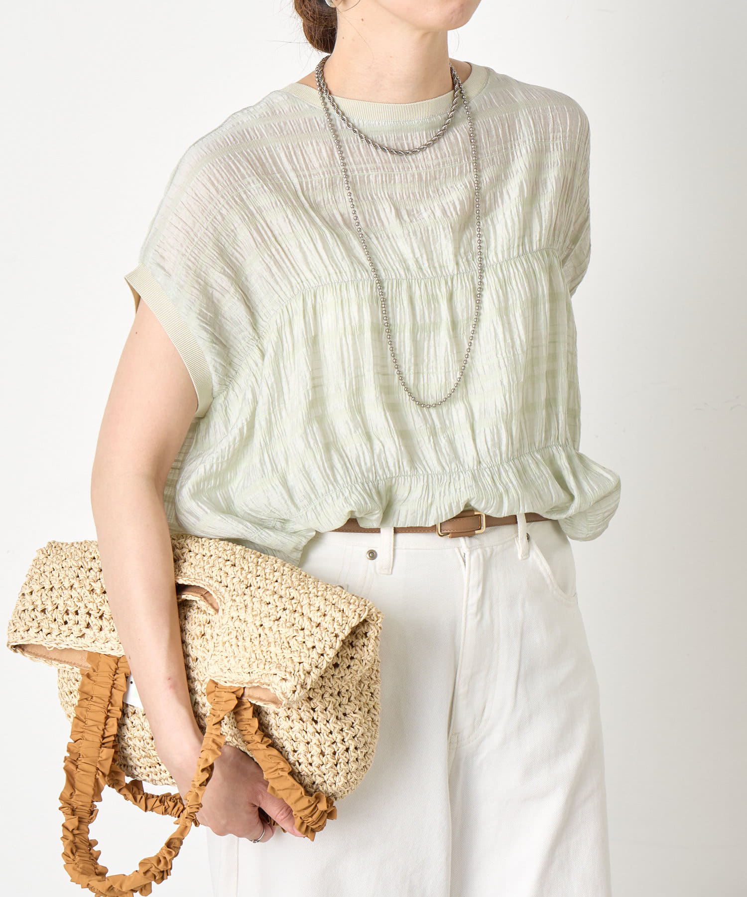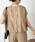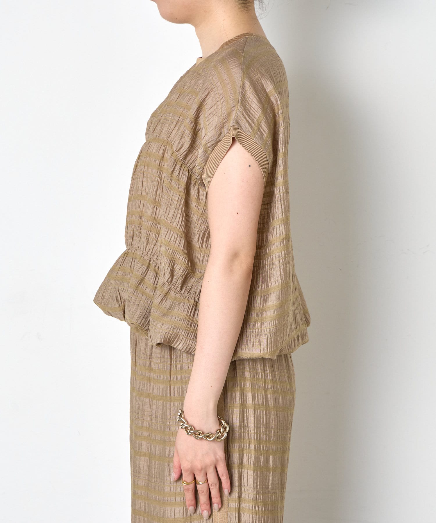 ・ランダムなシャーリングギャザーが魅力。女性らしい印象に仕上げてくれるフレンチスリーブブラウス。