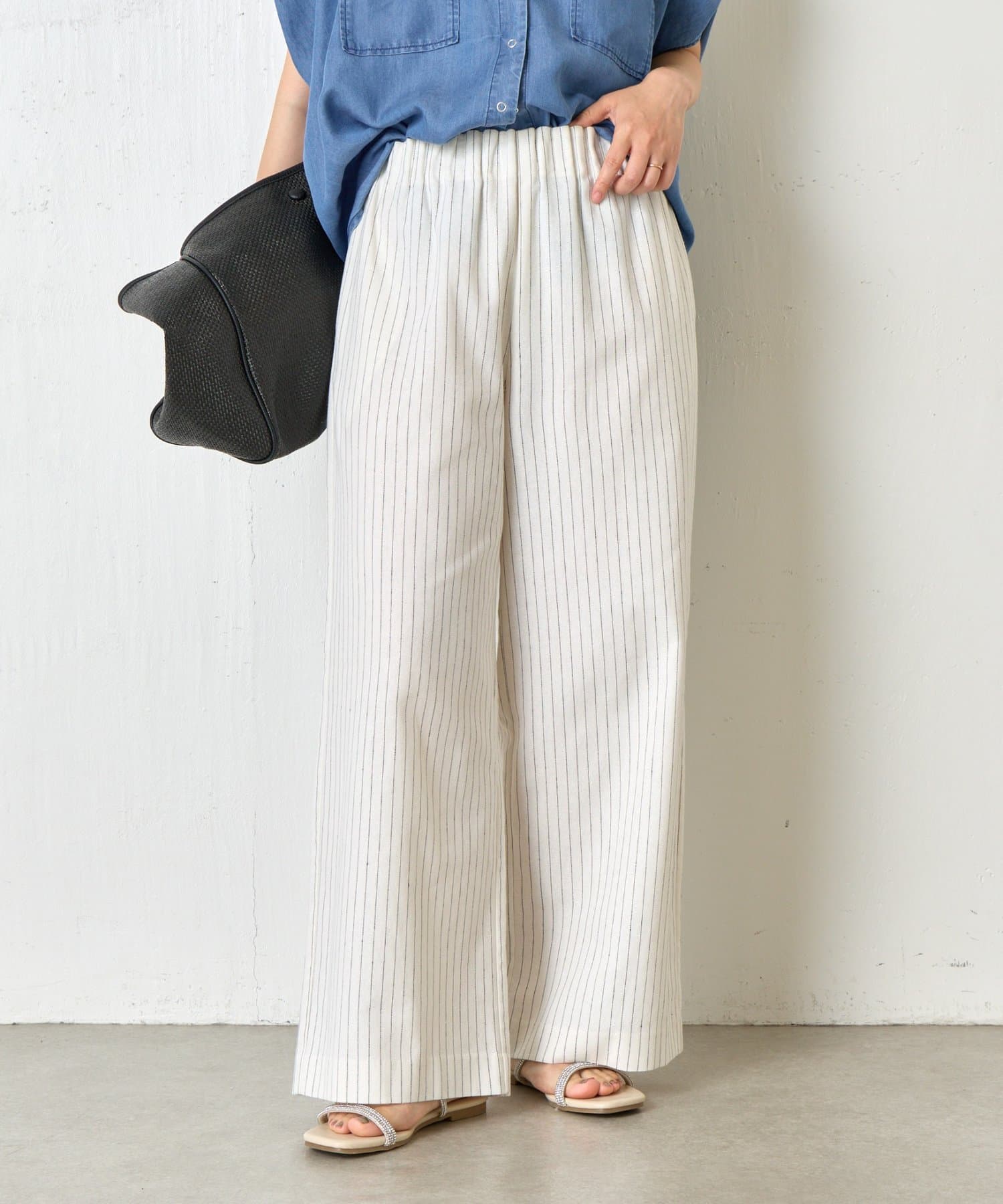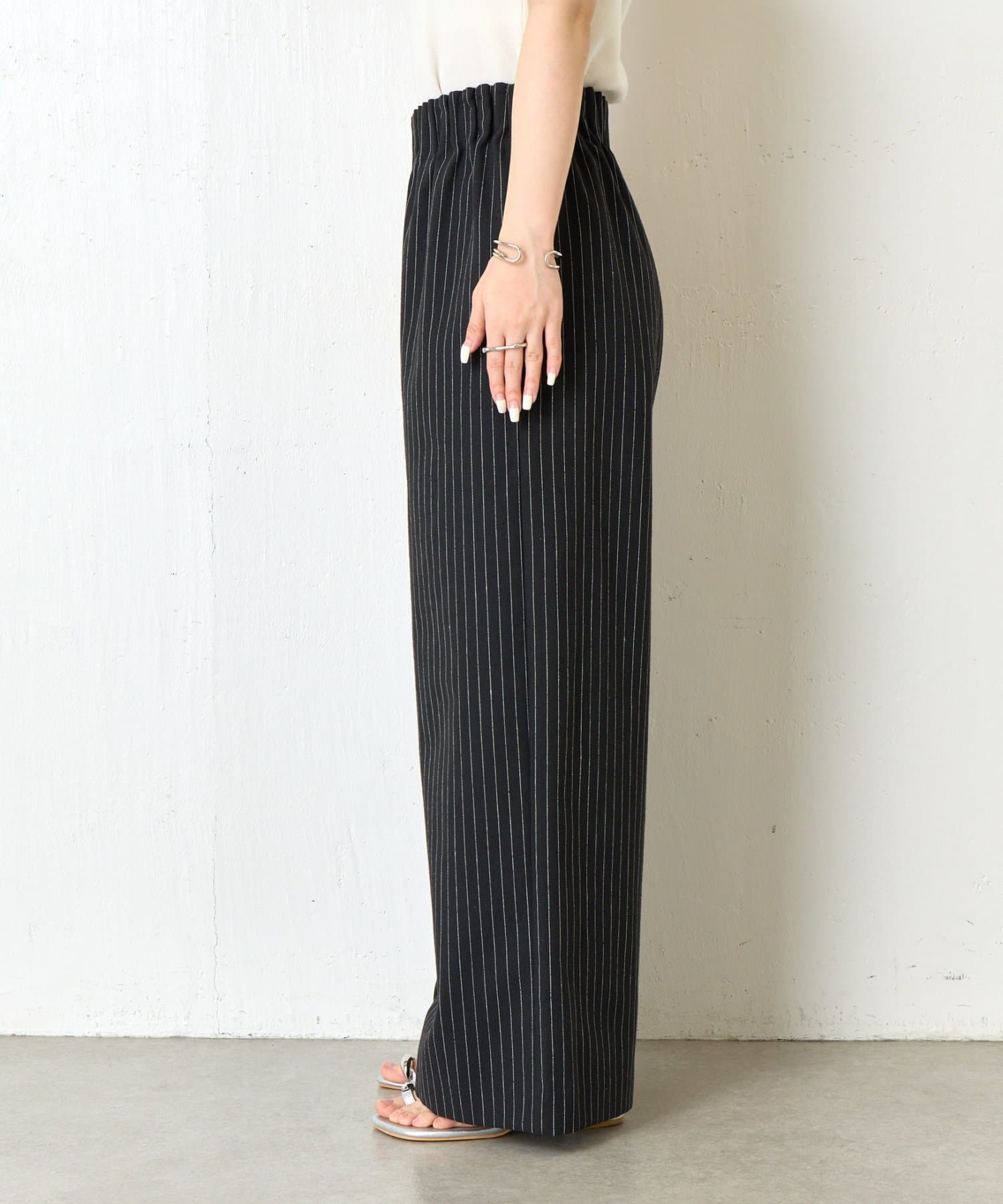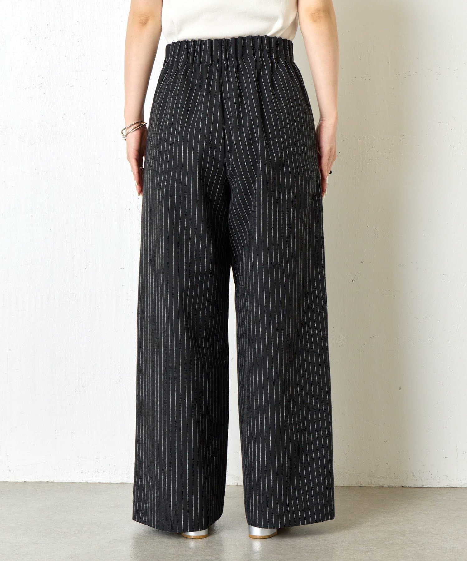 カジュアルになりすぎないバランスが整ったデザインのストライプ柄ワイドパンツ