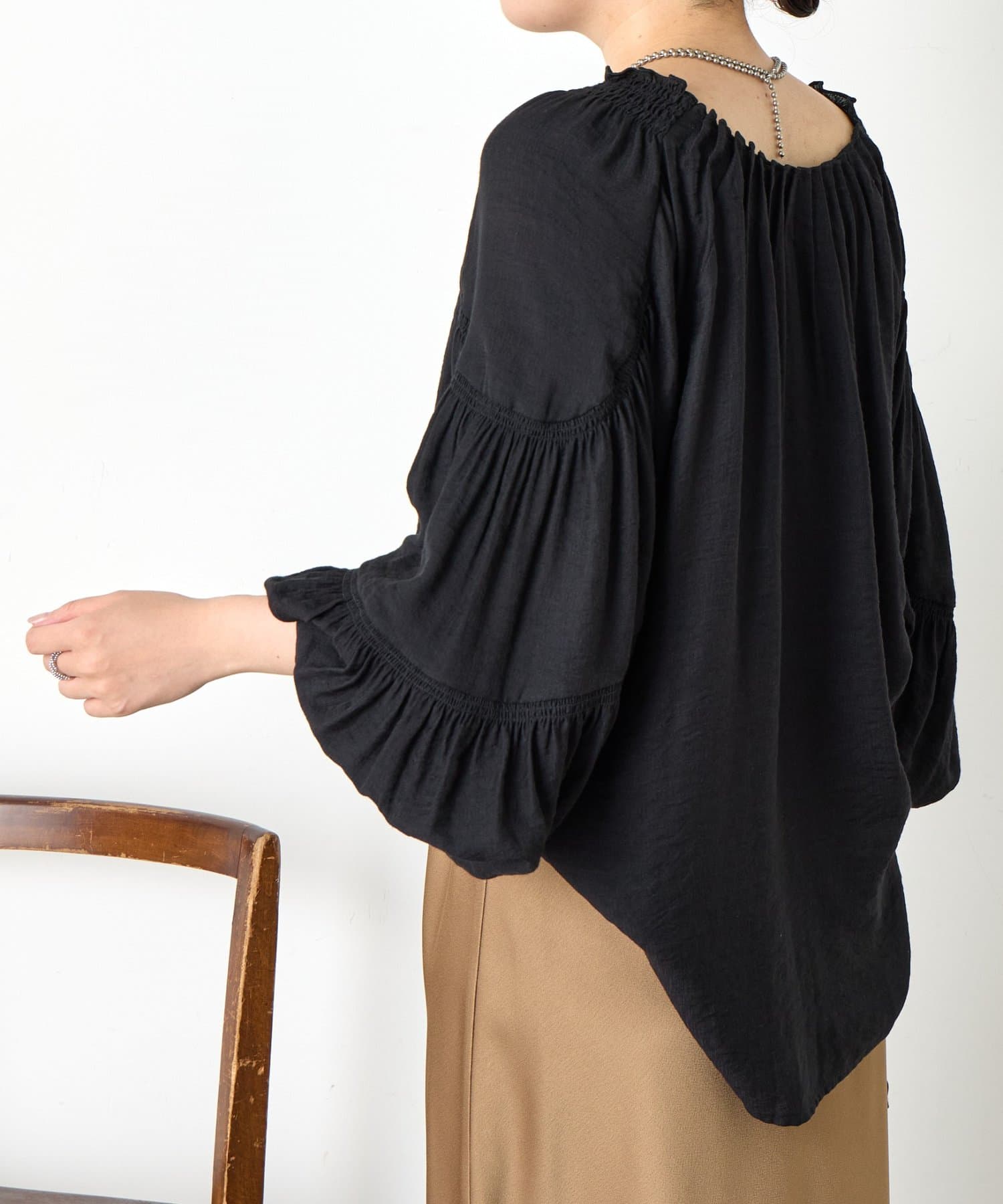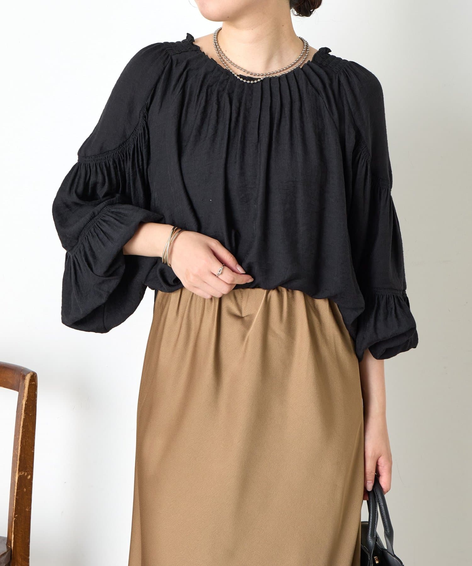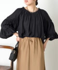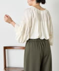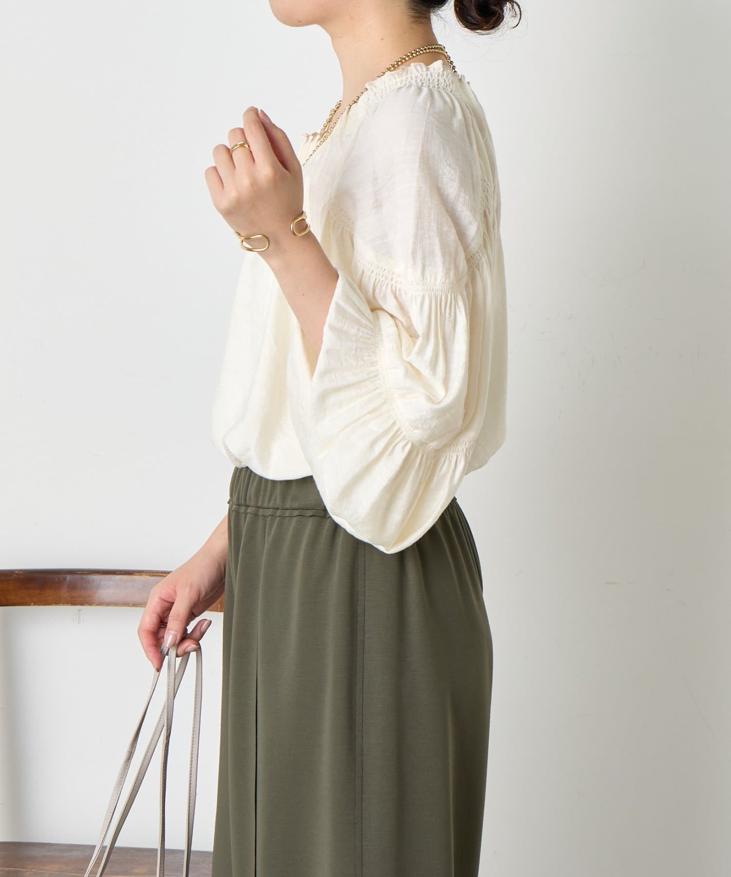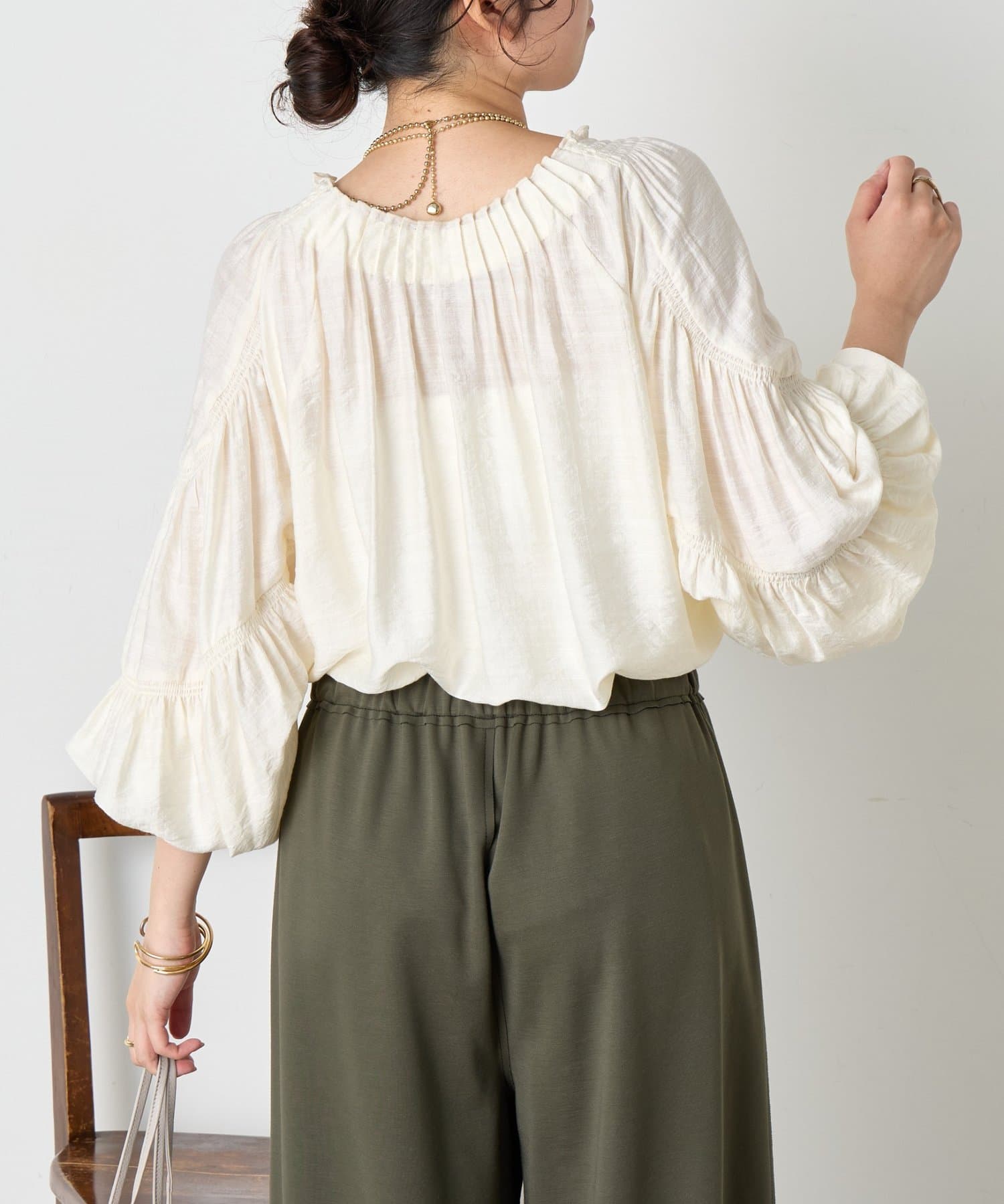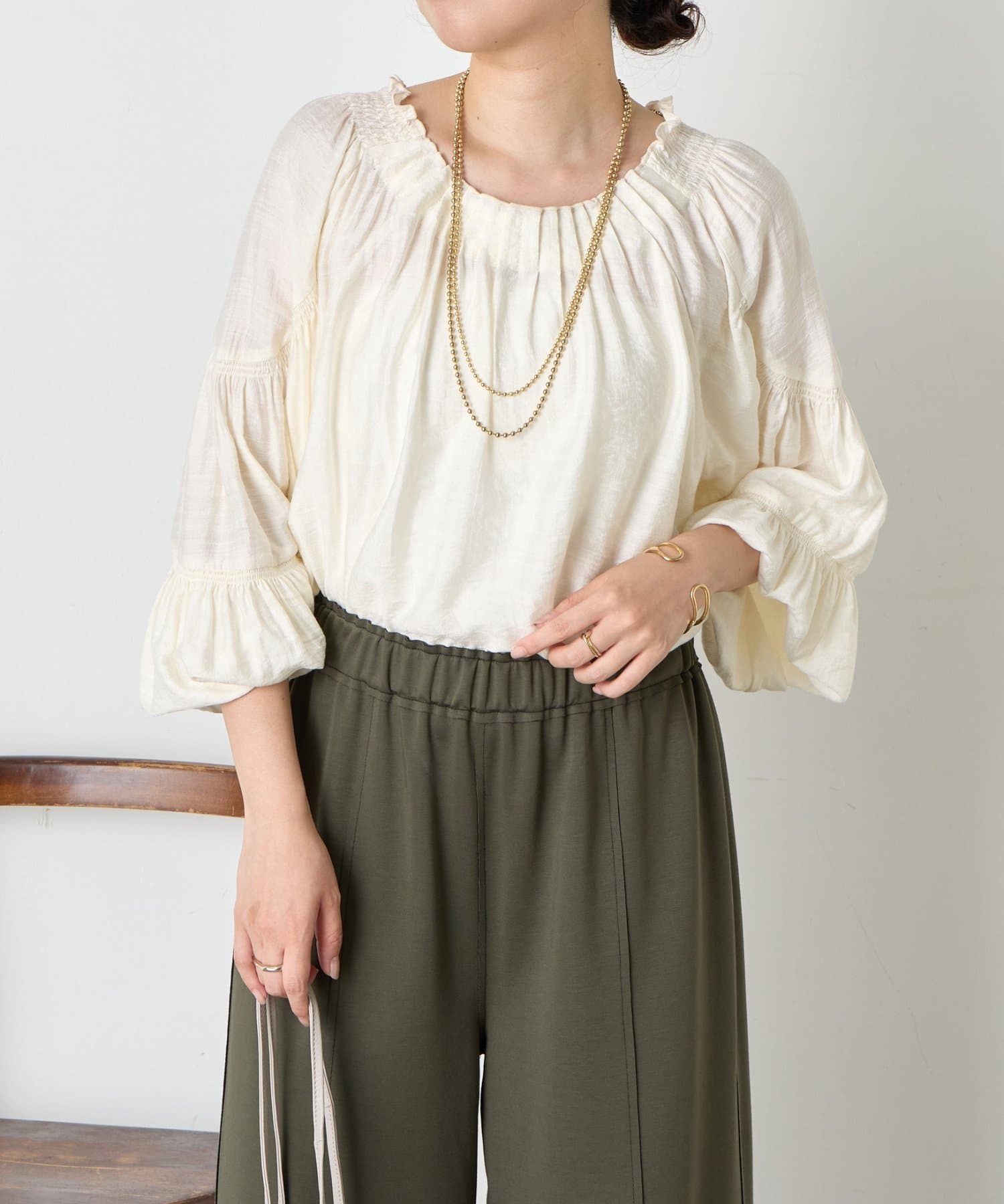 ・軽やかな素材感と、ギャザーでふんわり広がるスリーブが魅力の一枚。