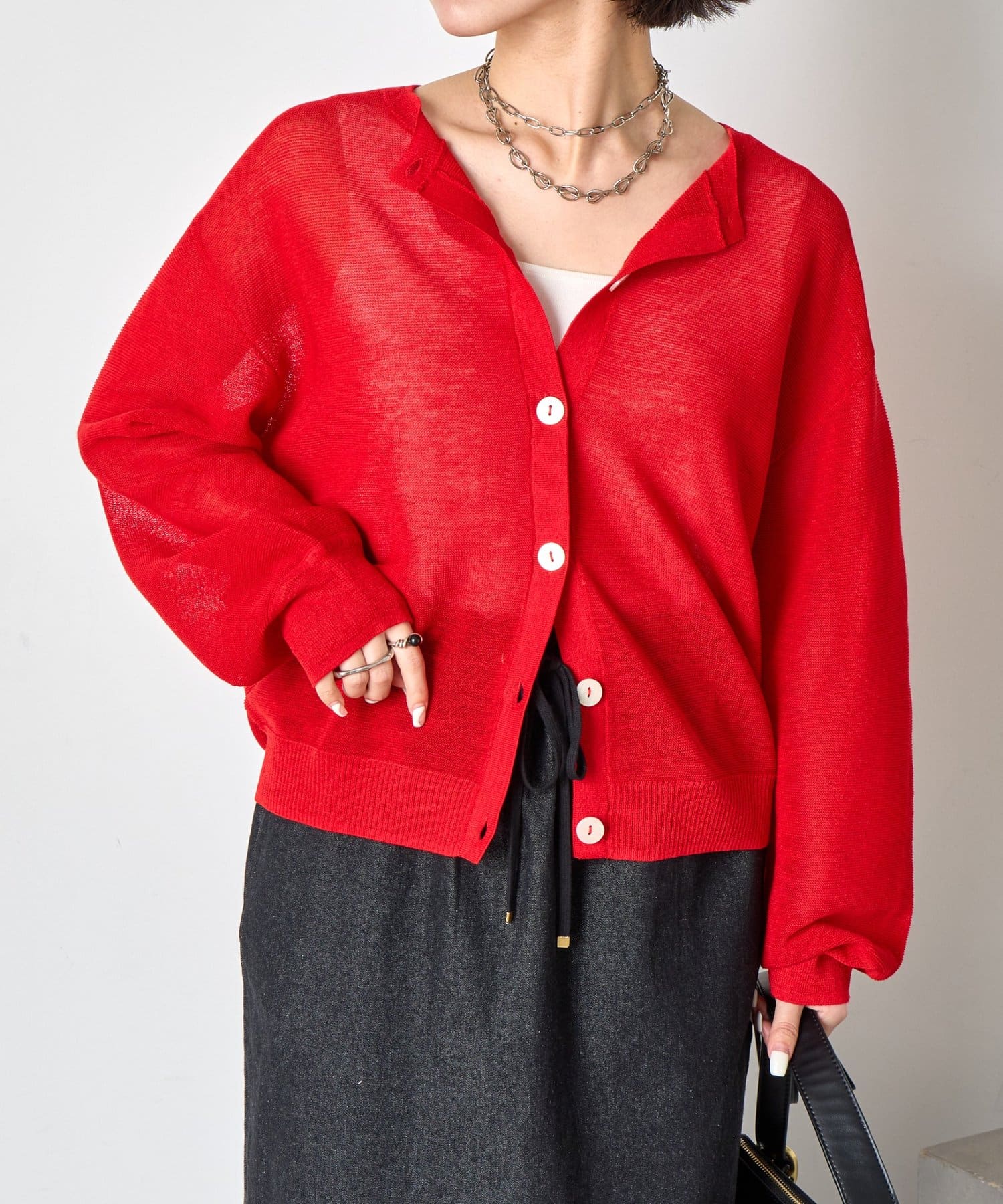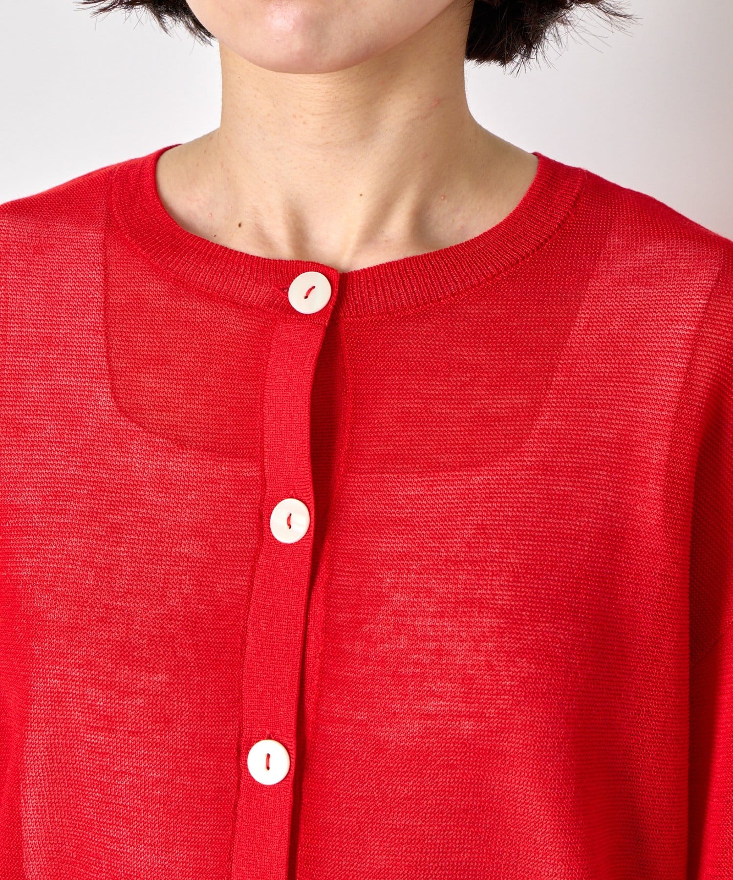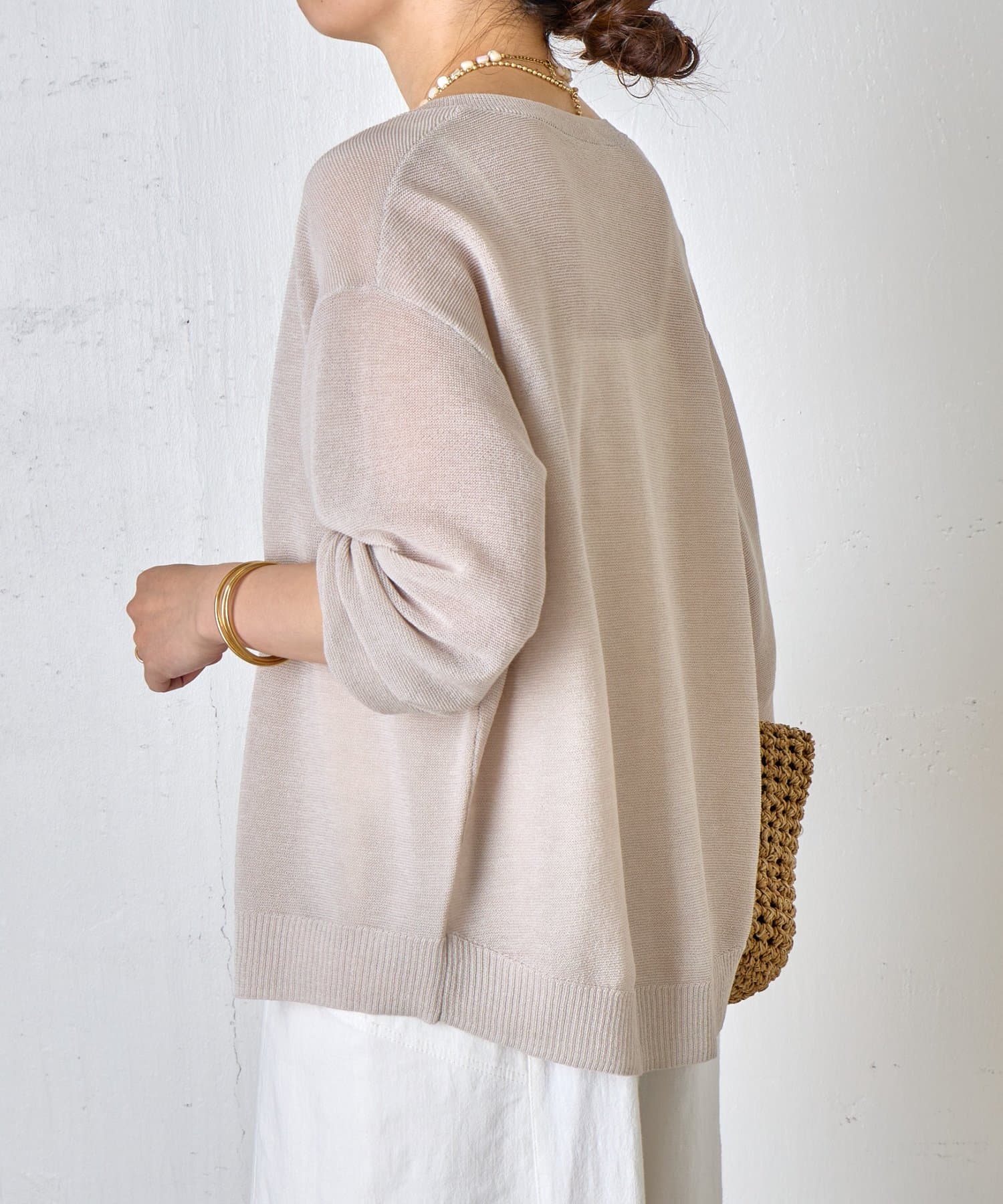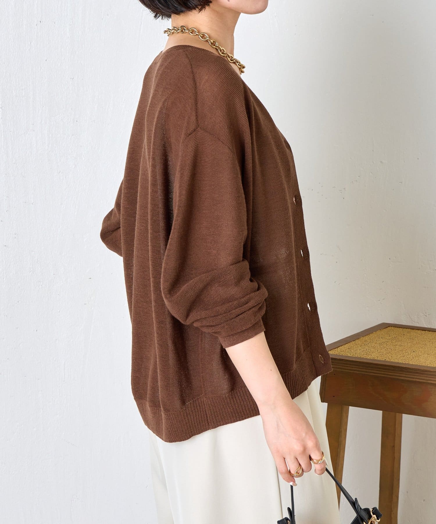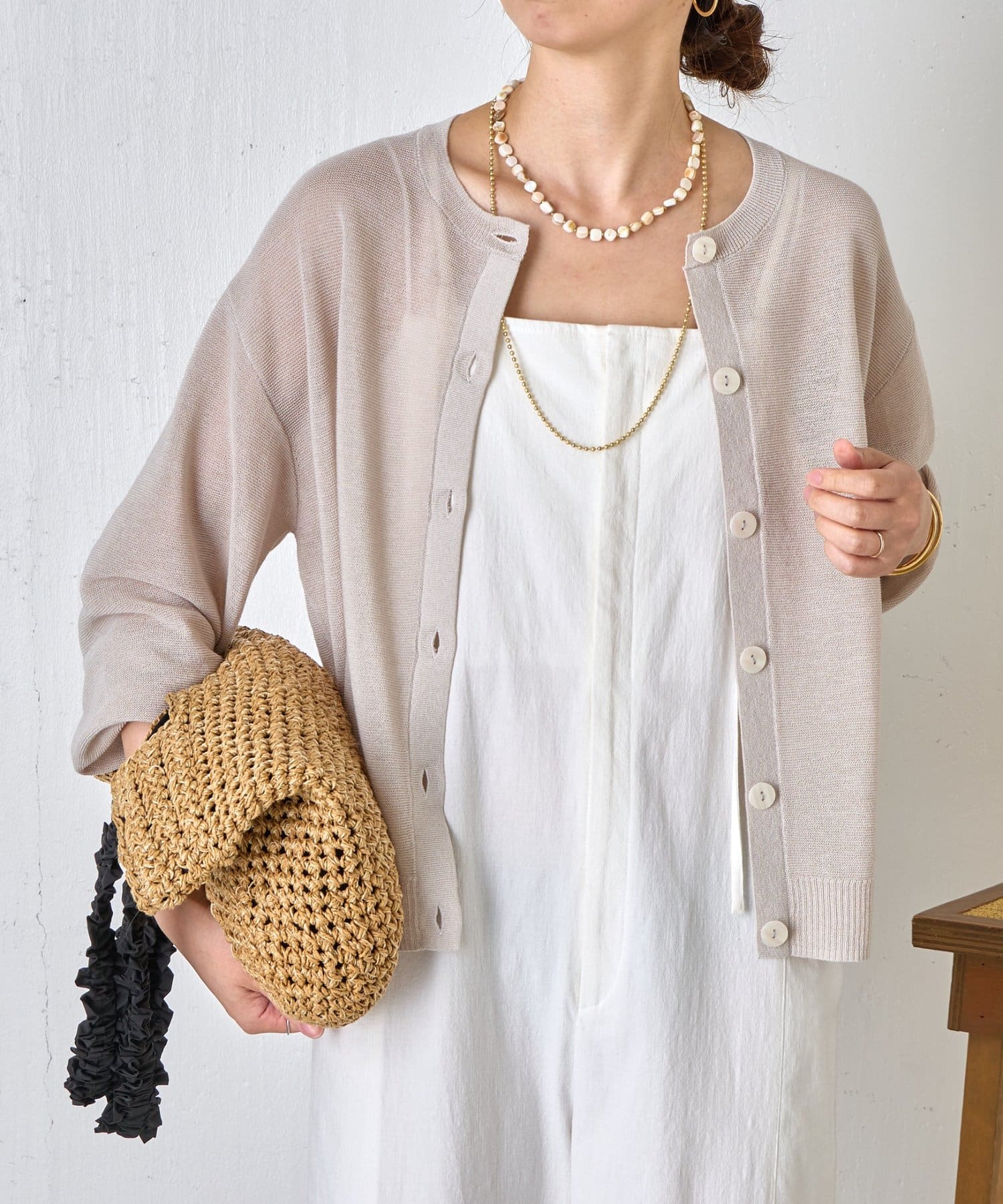 ・軽やかで涼しげな印象に編み上げたややゆったりサイズのシアーカーディガン。