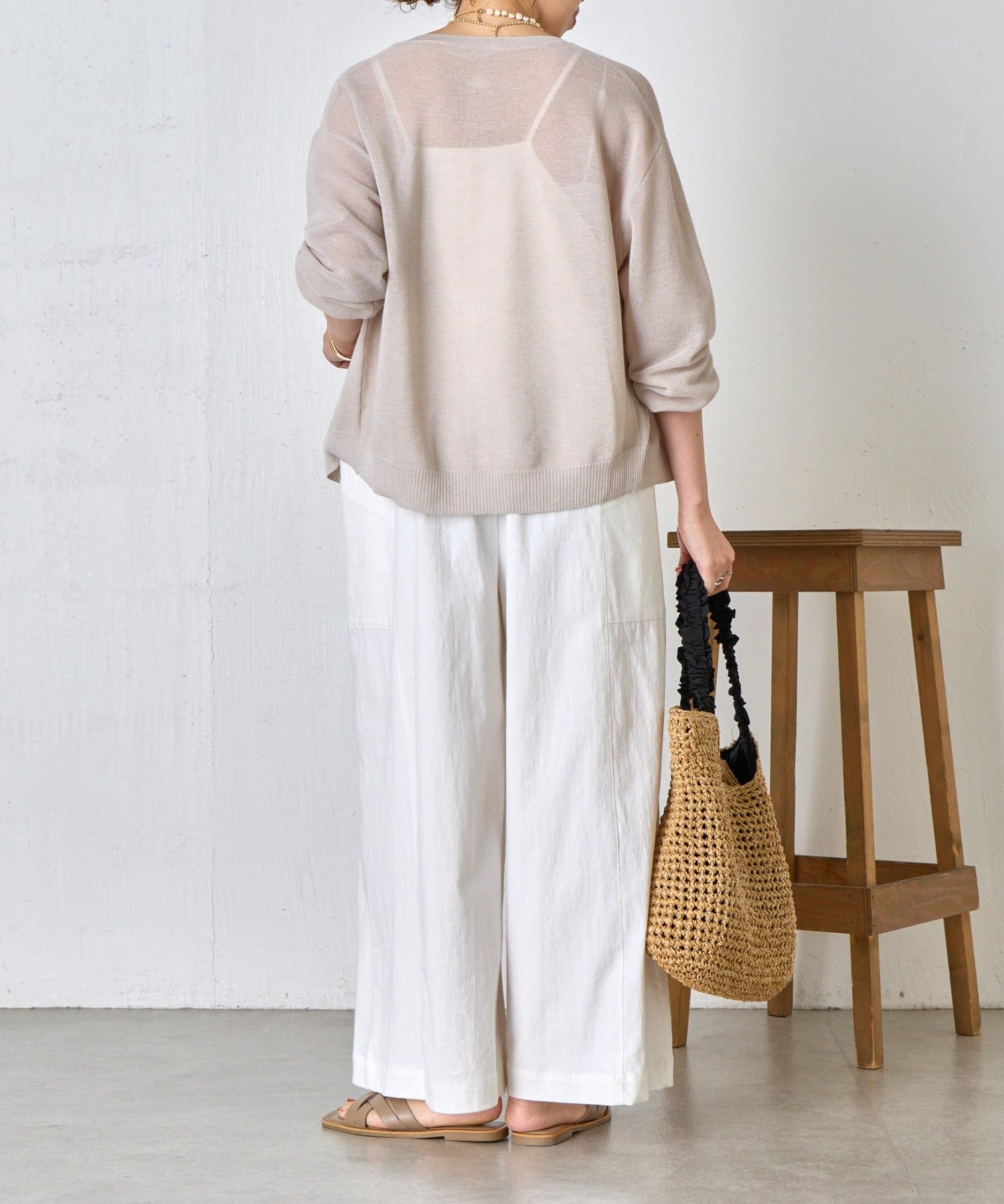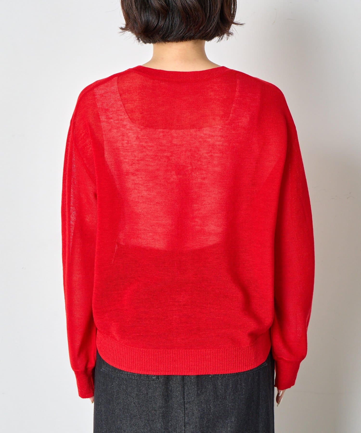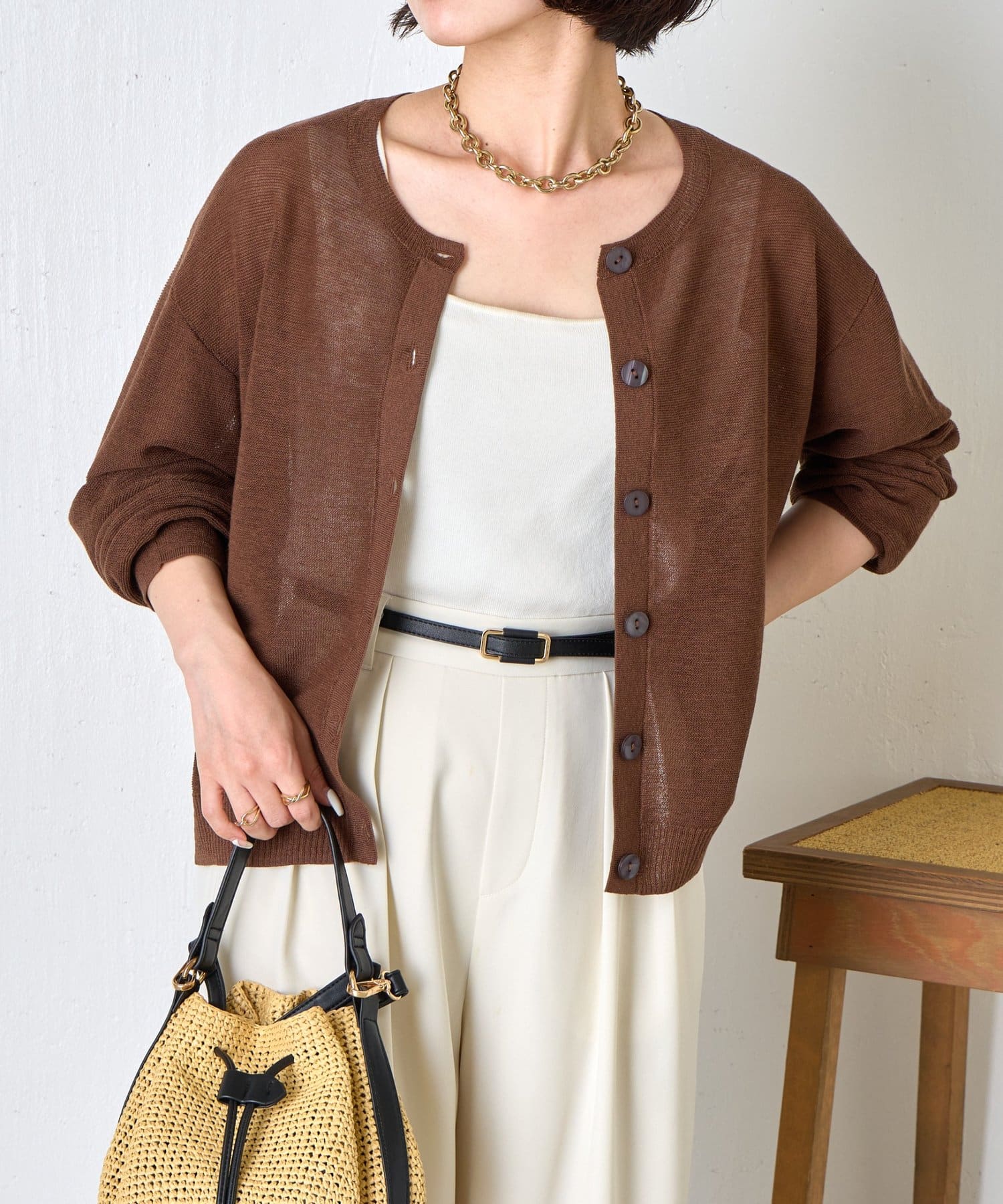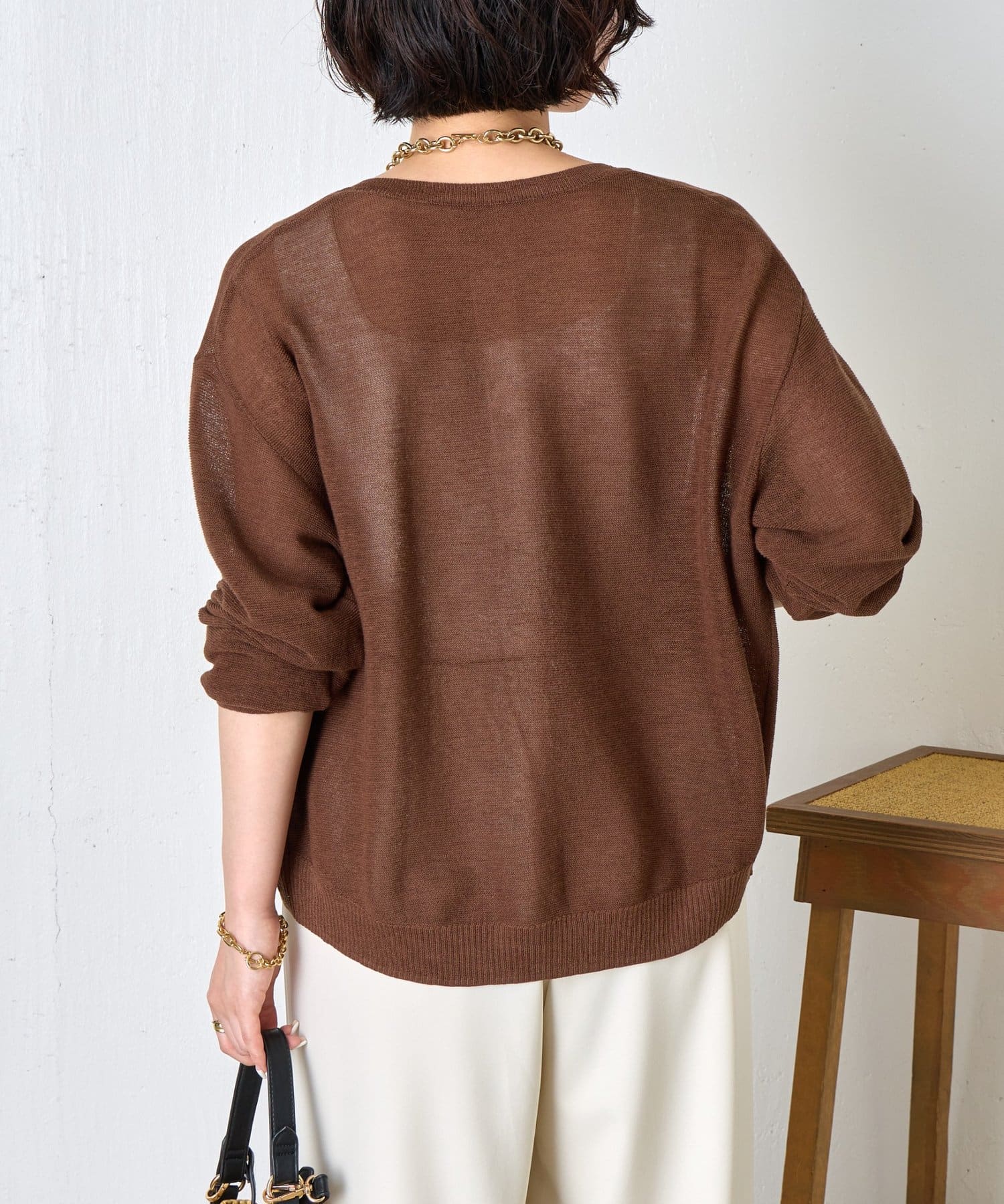 ・軽やかで涼しげな印象に編み上げたややゆったりサイズのシアーカーディガン。