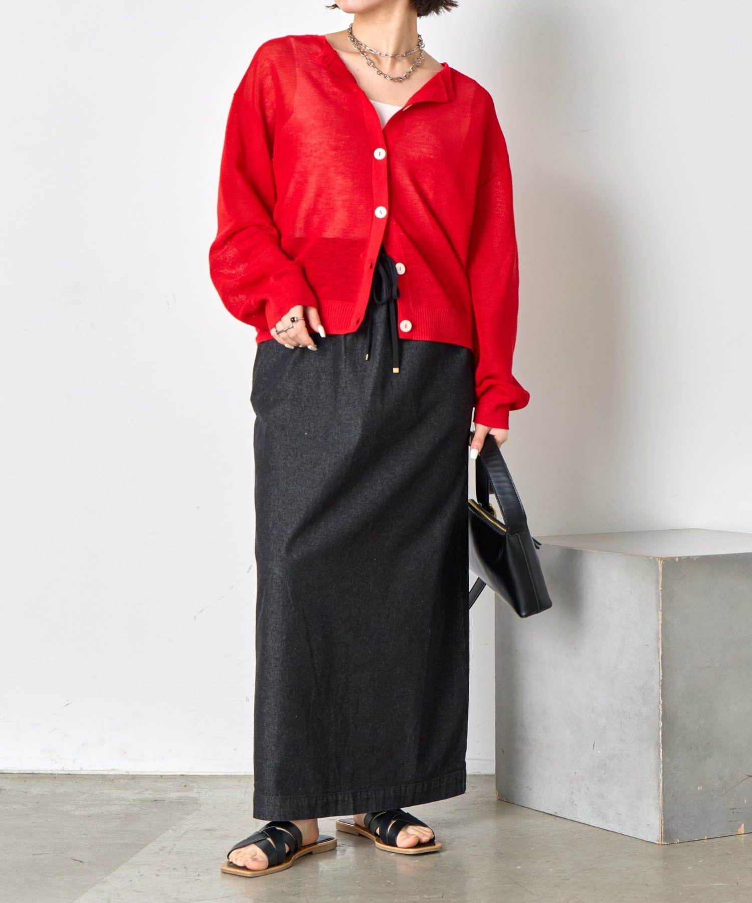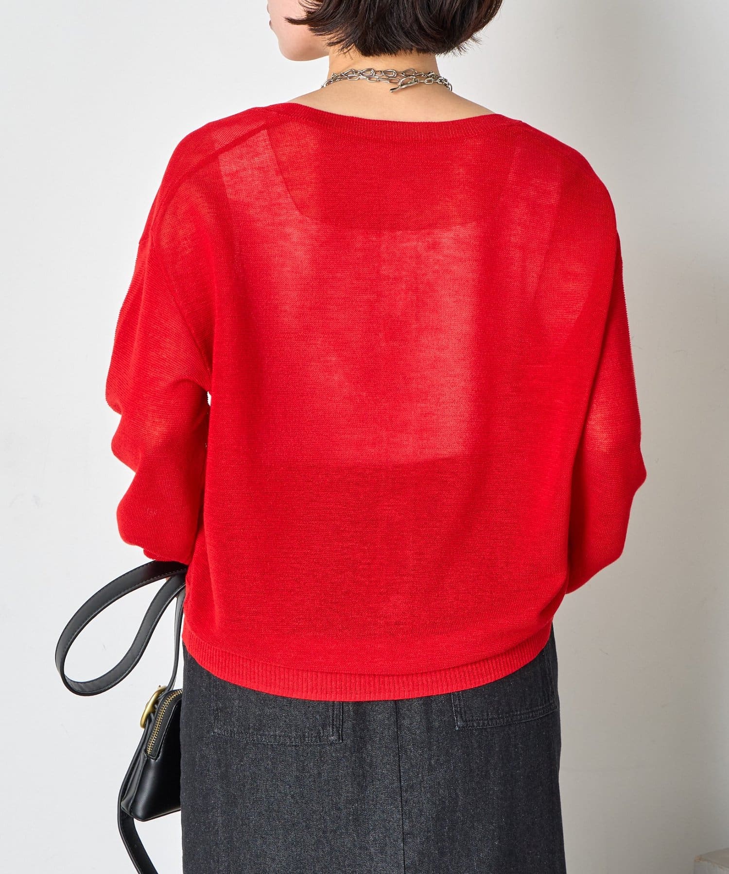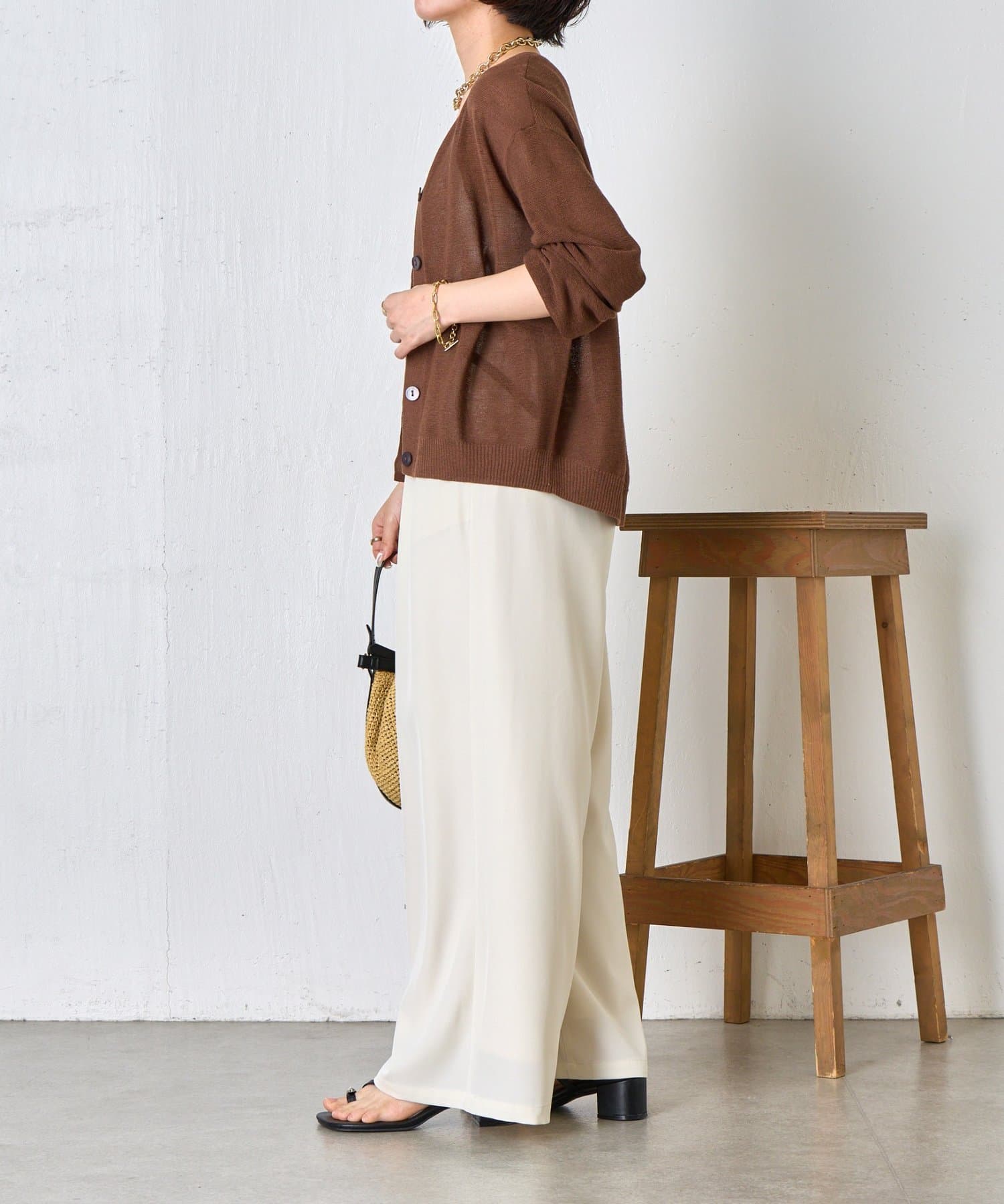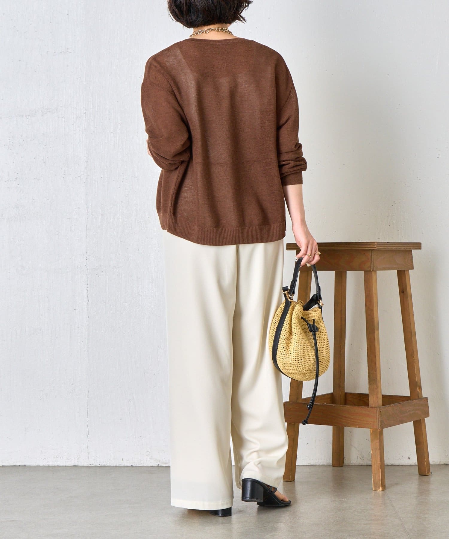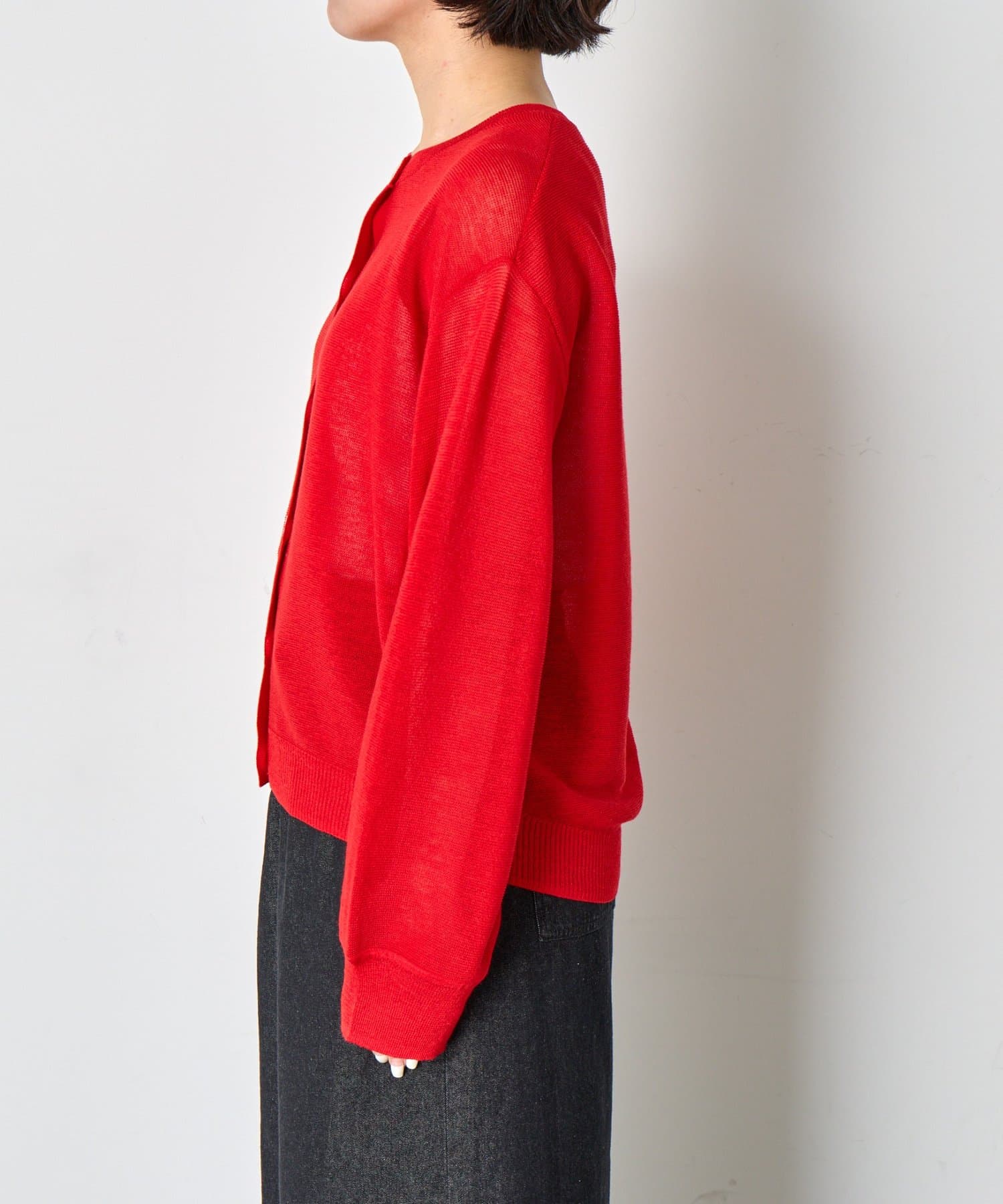 ・軽やかで涼しげな印象に編み上げたややゆったりサイズのシアーカーディガン。
