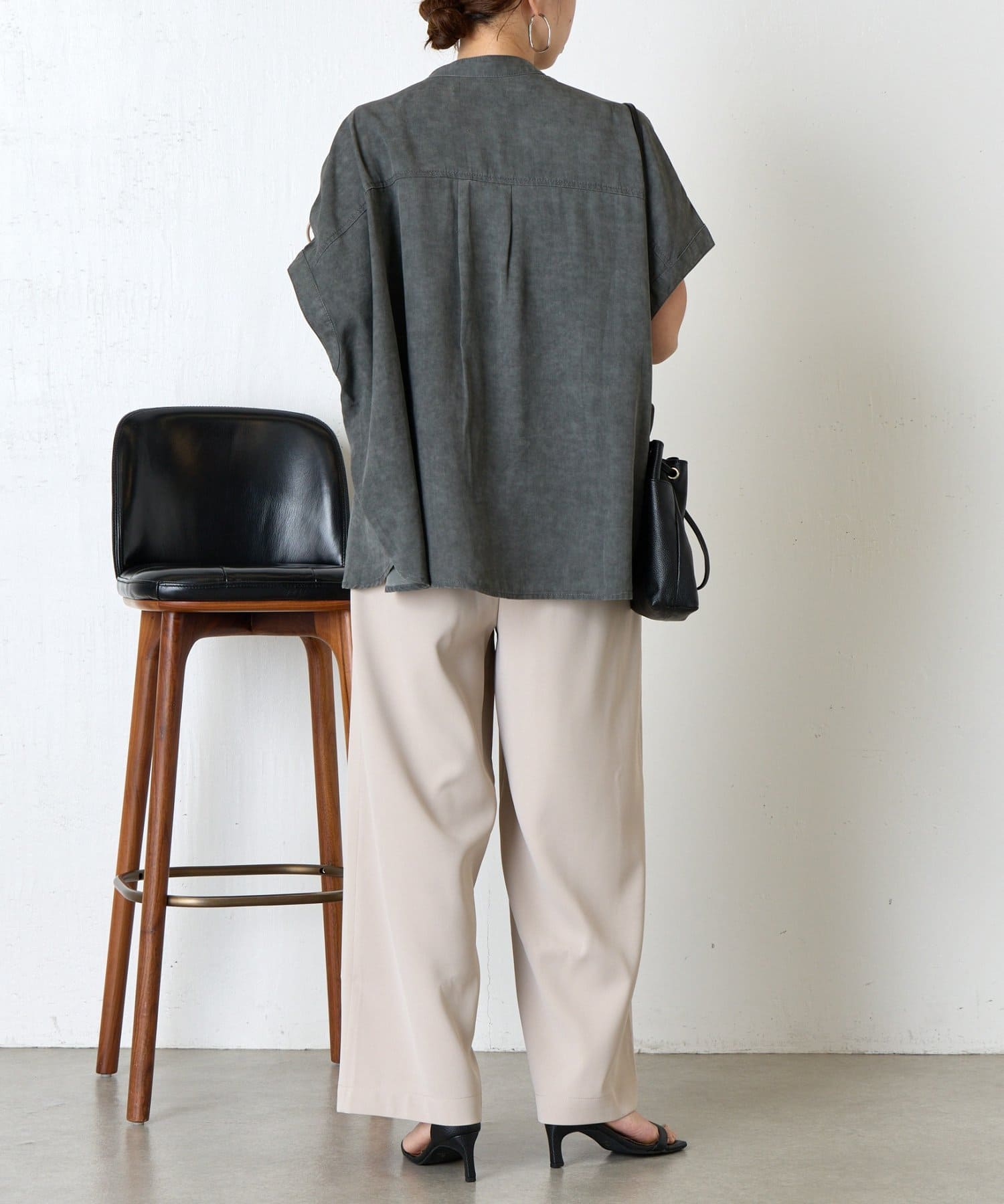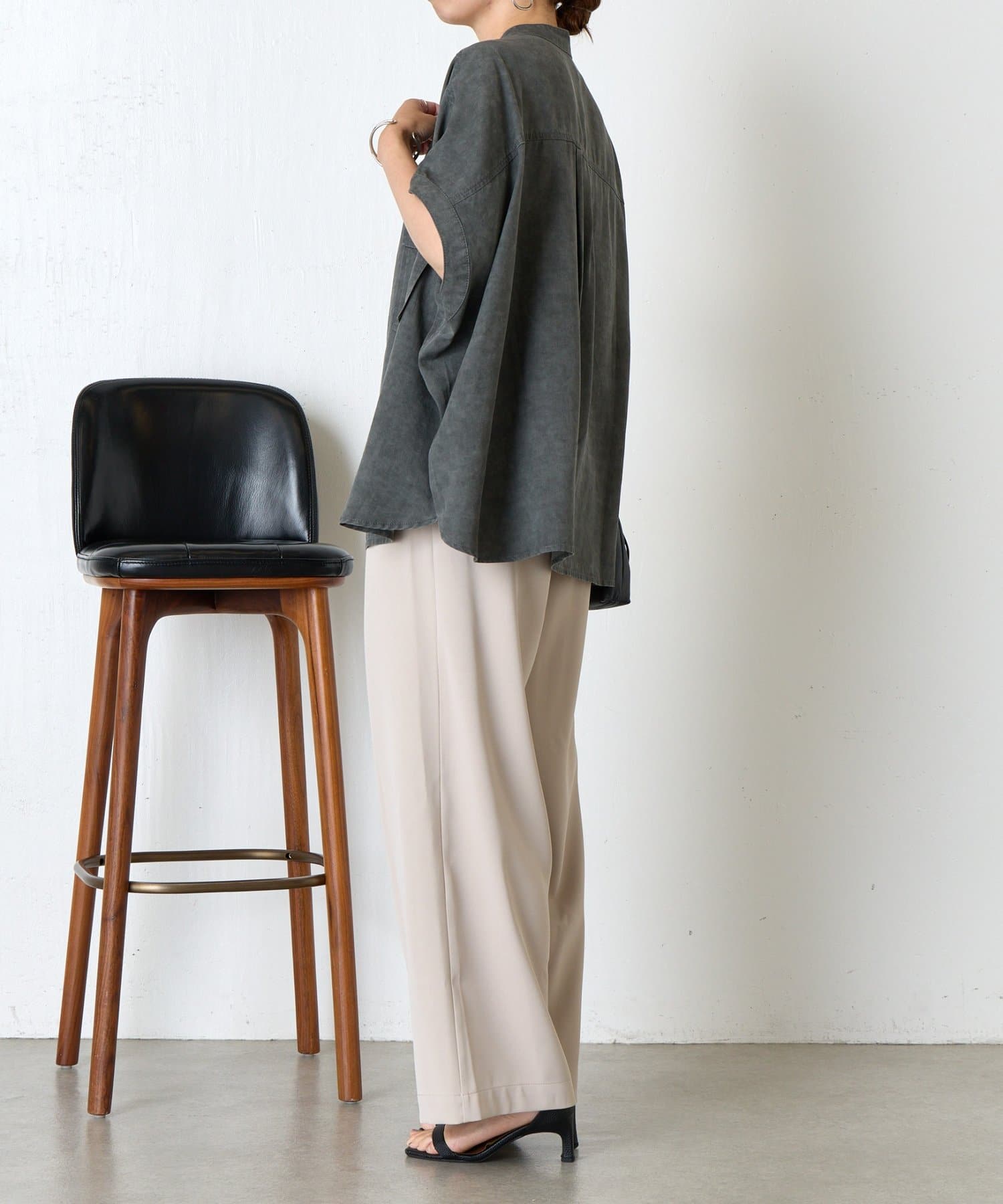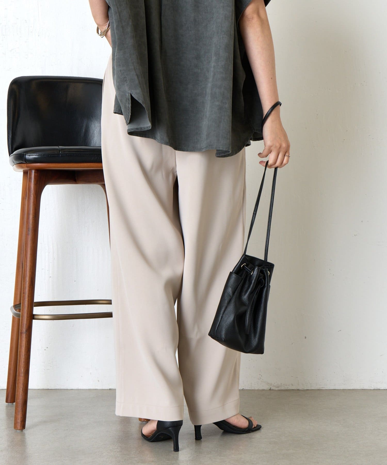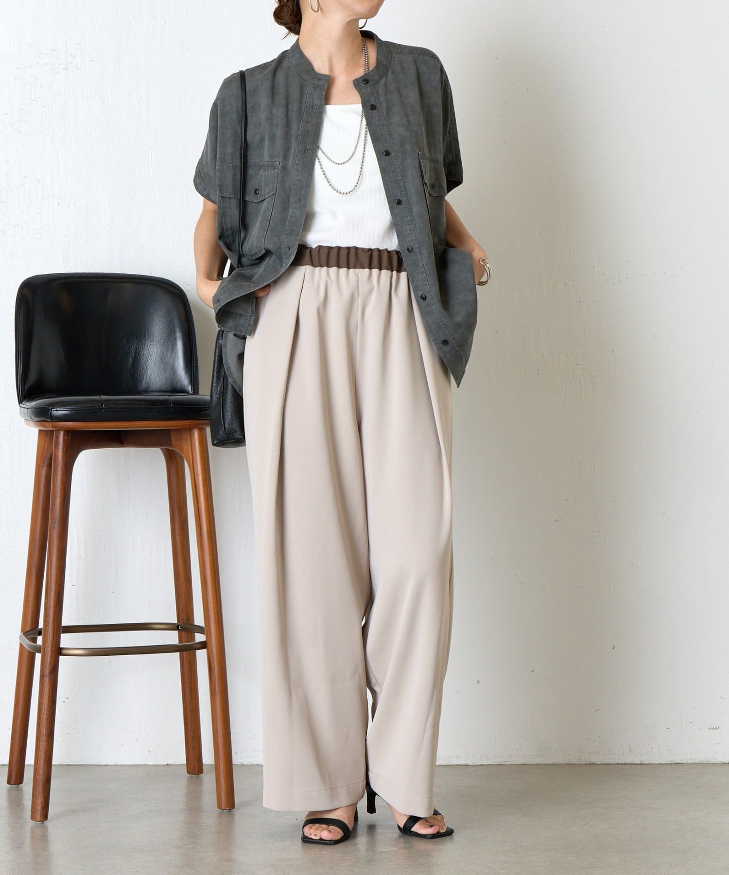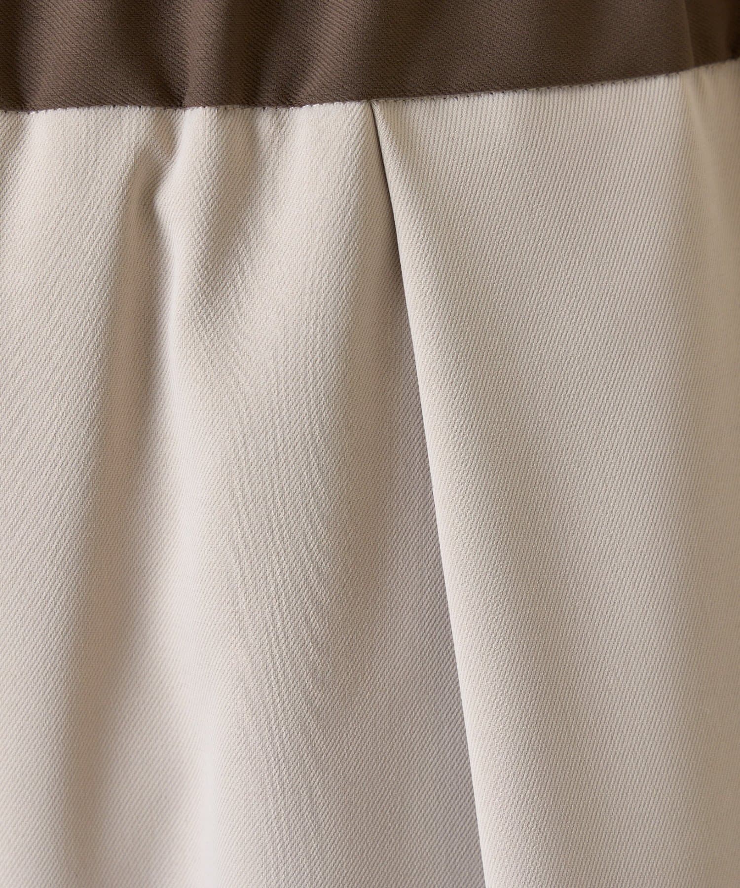 ・脚のラインを拾わないタックデザインとウエスト配色が腰位置を高く見せて美脚見えがかないます。