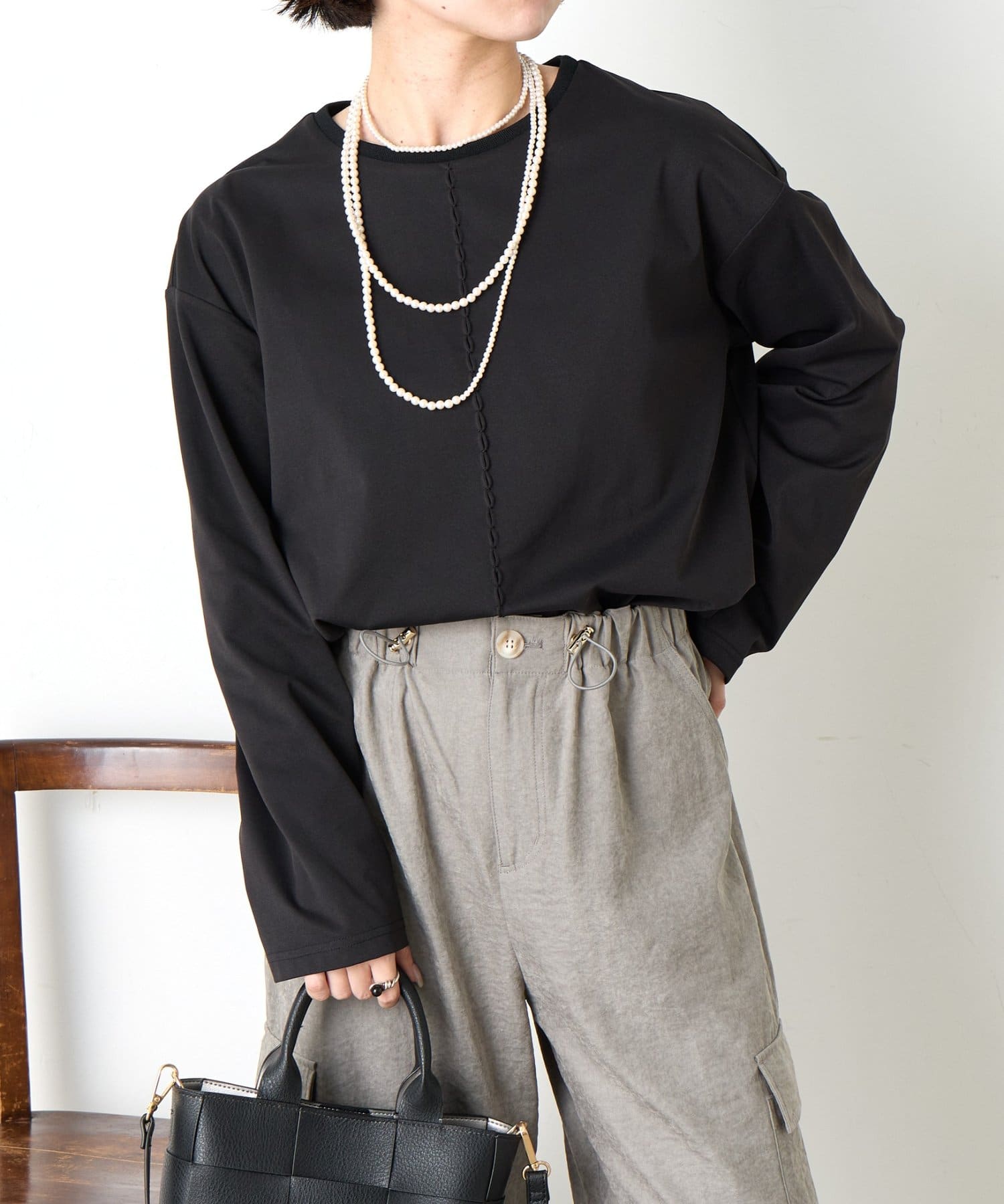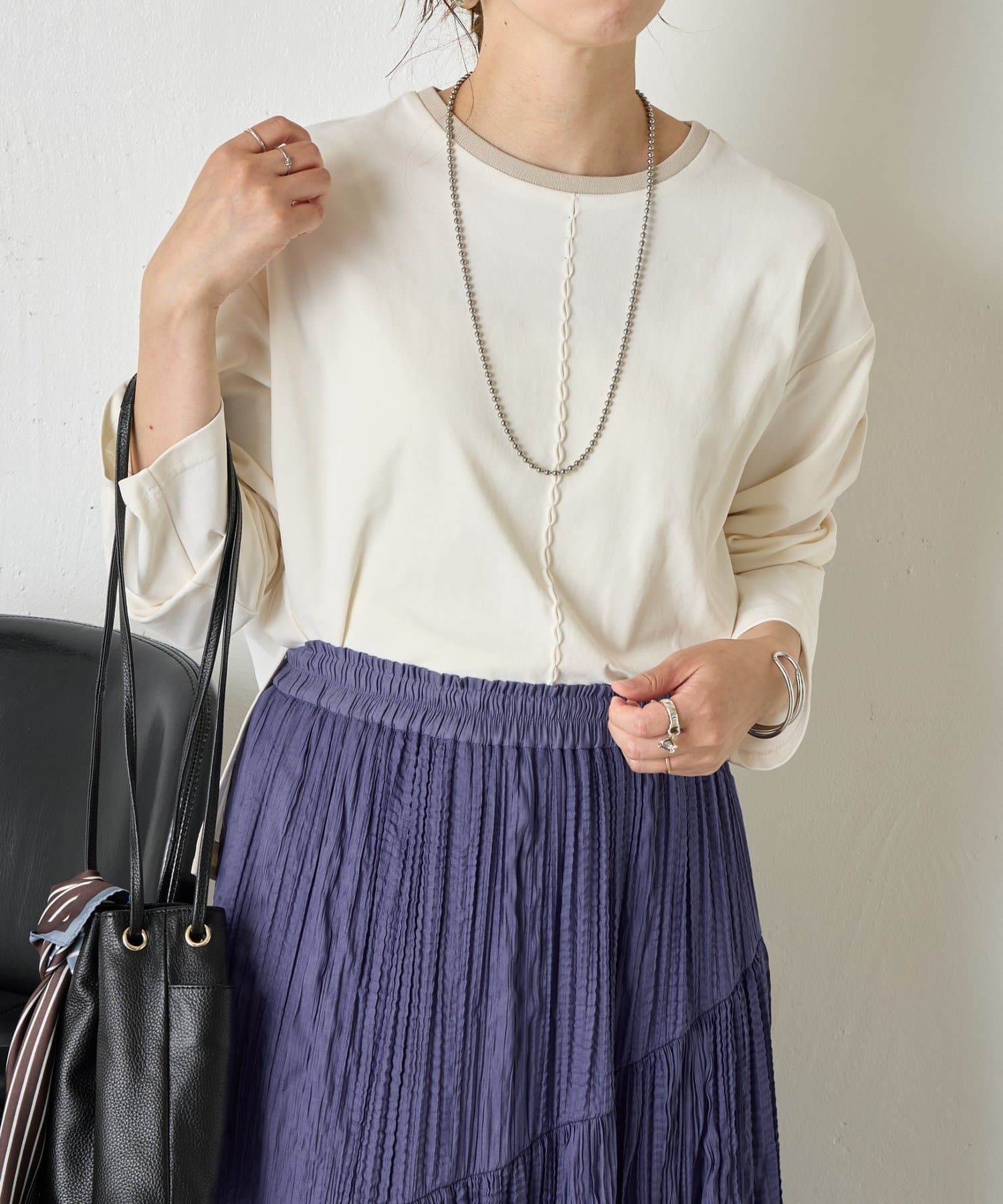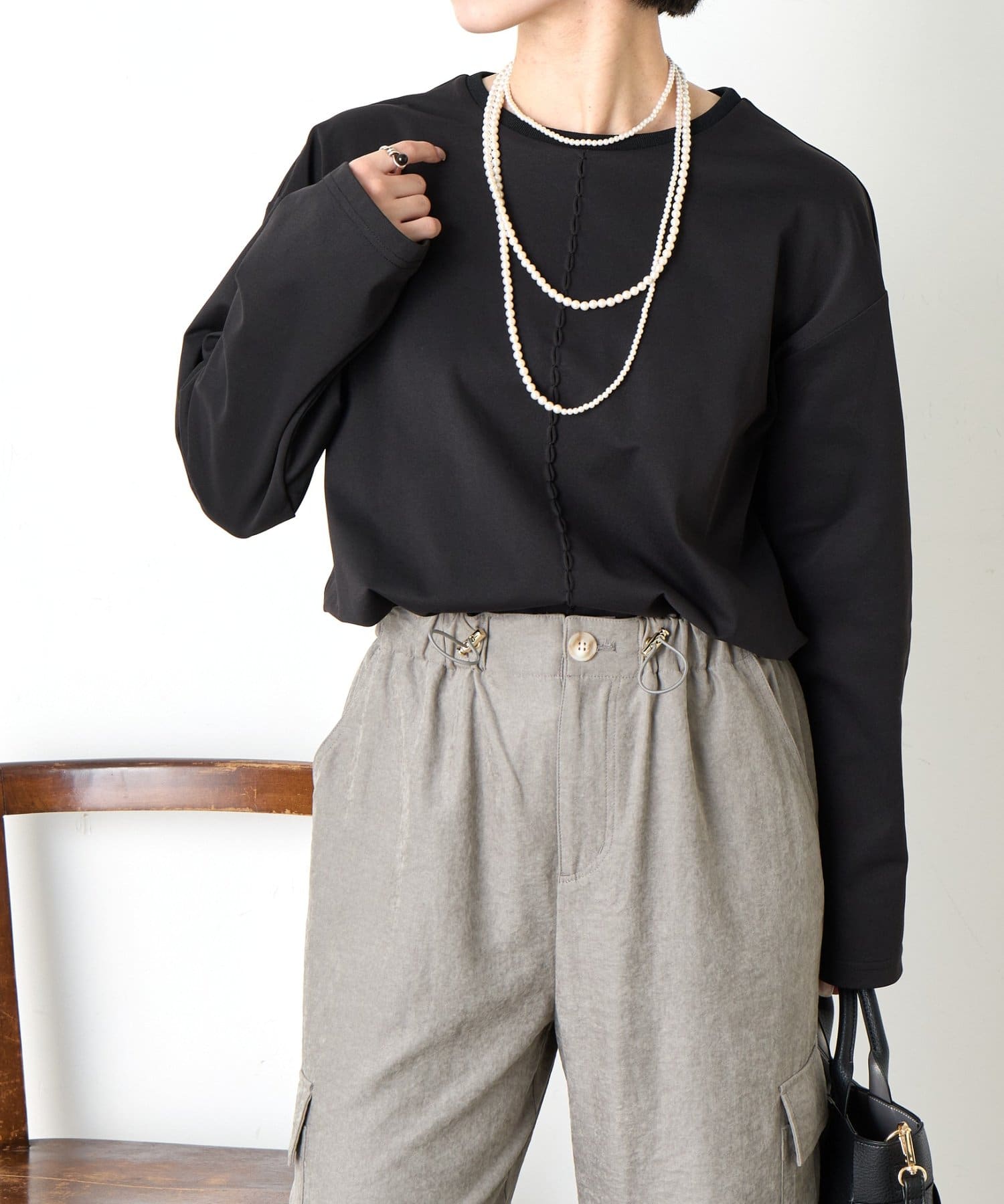 ・襟リブがカジュアルな印象をプラスし、センターラインにはさりげないピンタックのデザインを施したカットソー。