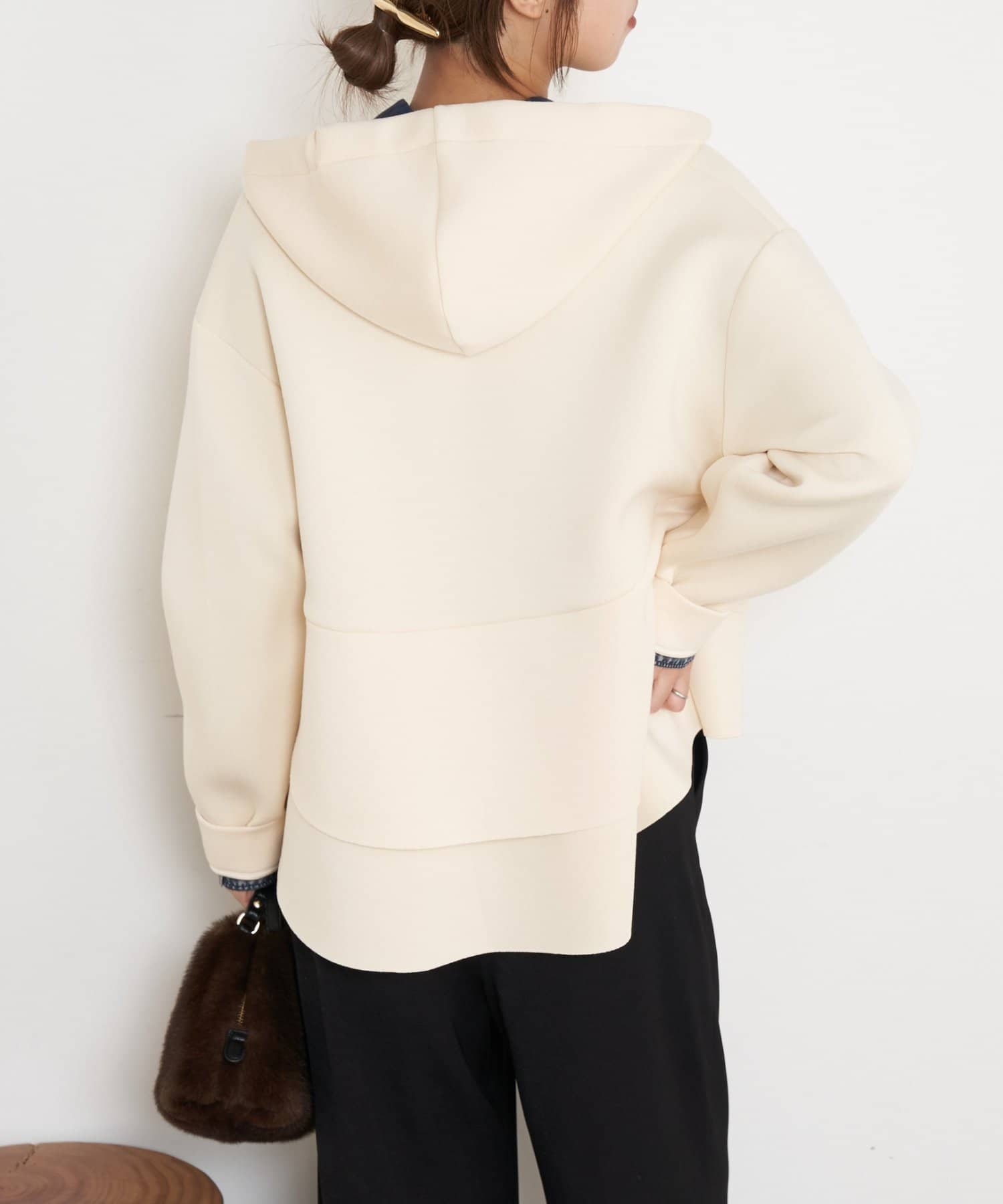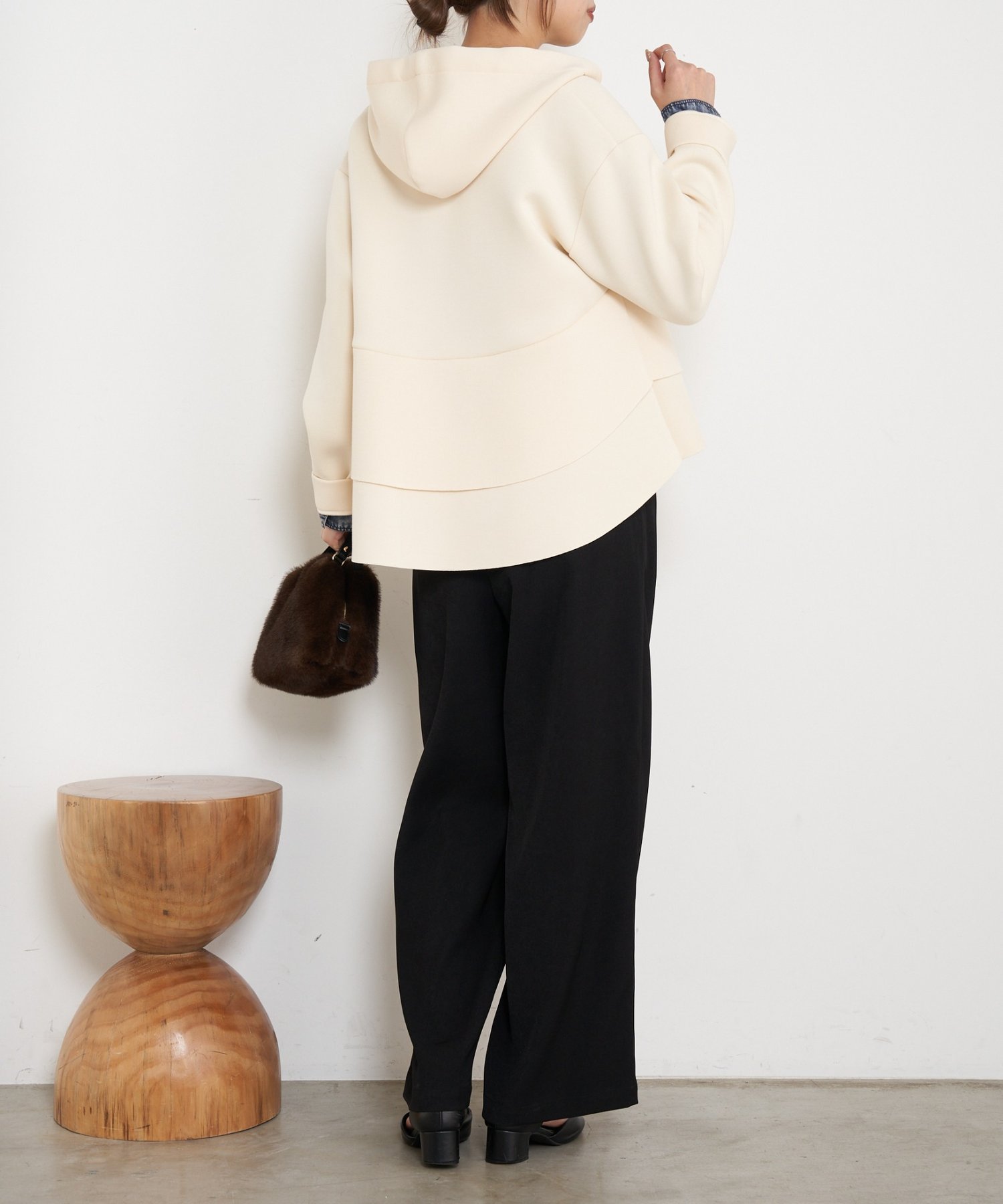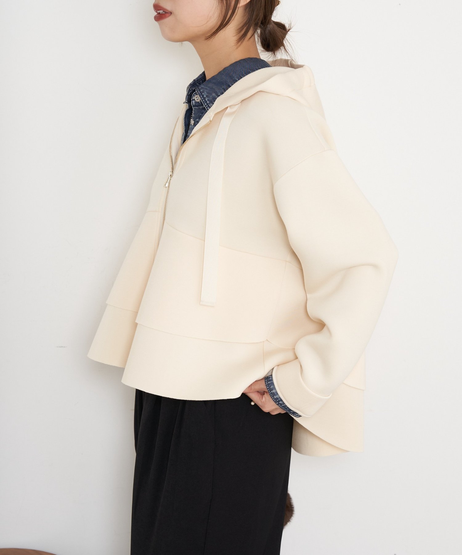 ・ウエストからふんわりと広がる二段のフリルデザインが、女性らしい柔らかさと動きを演出してくれるフード付きパーカー。