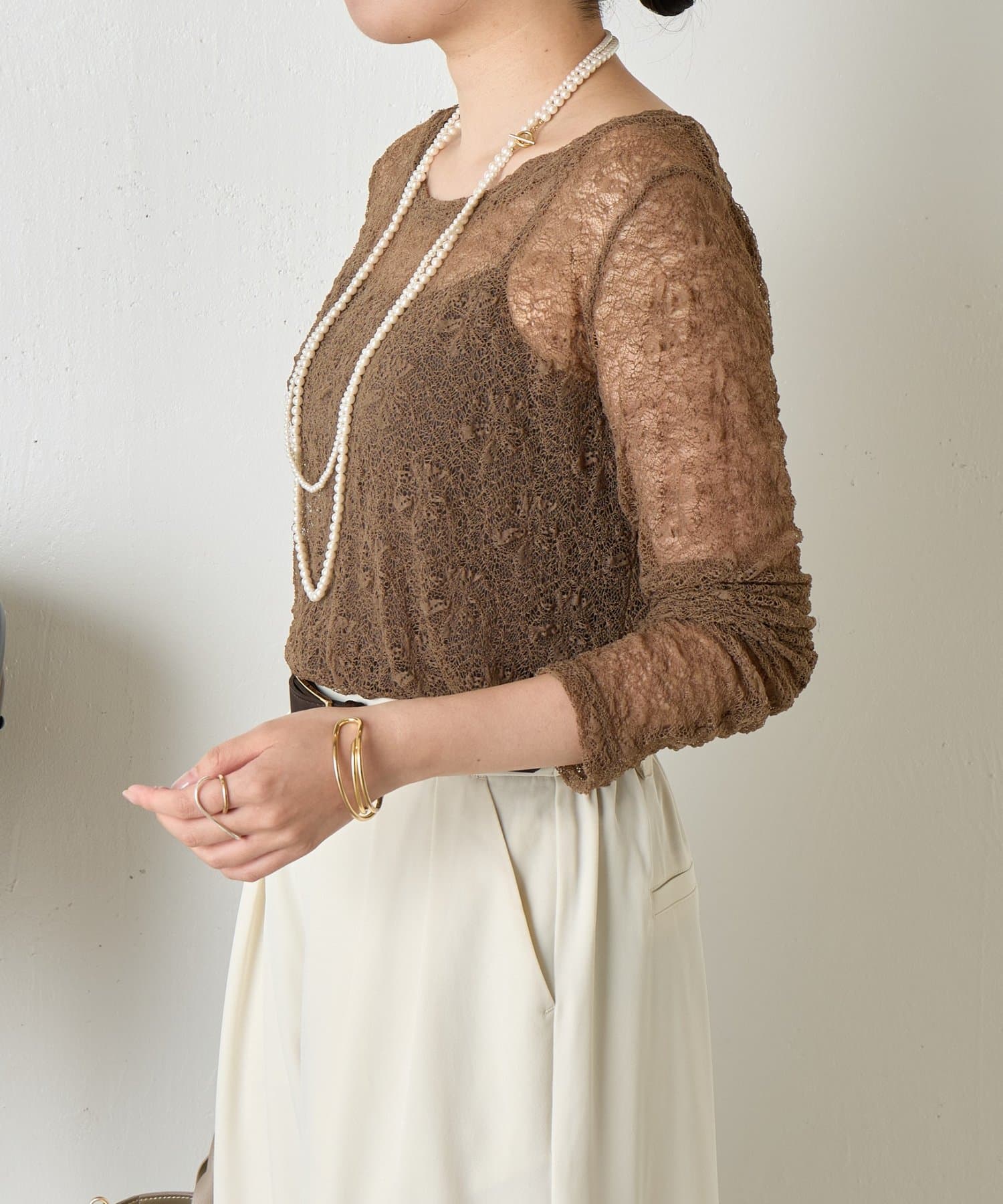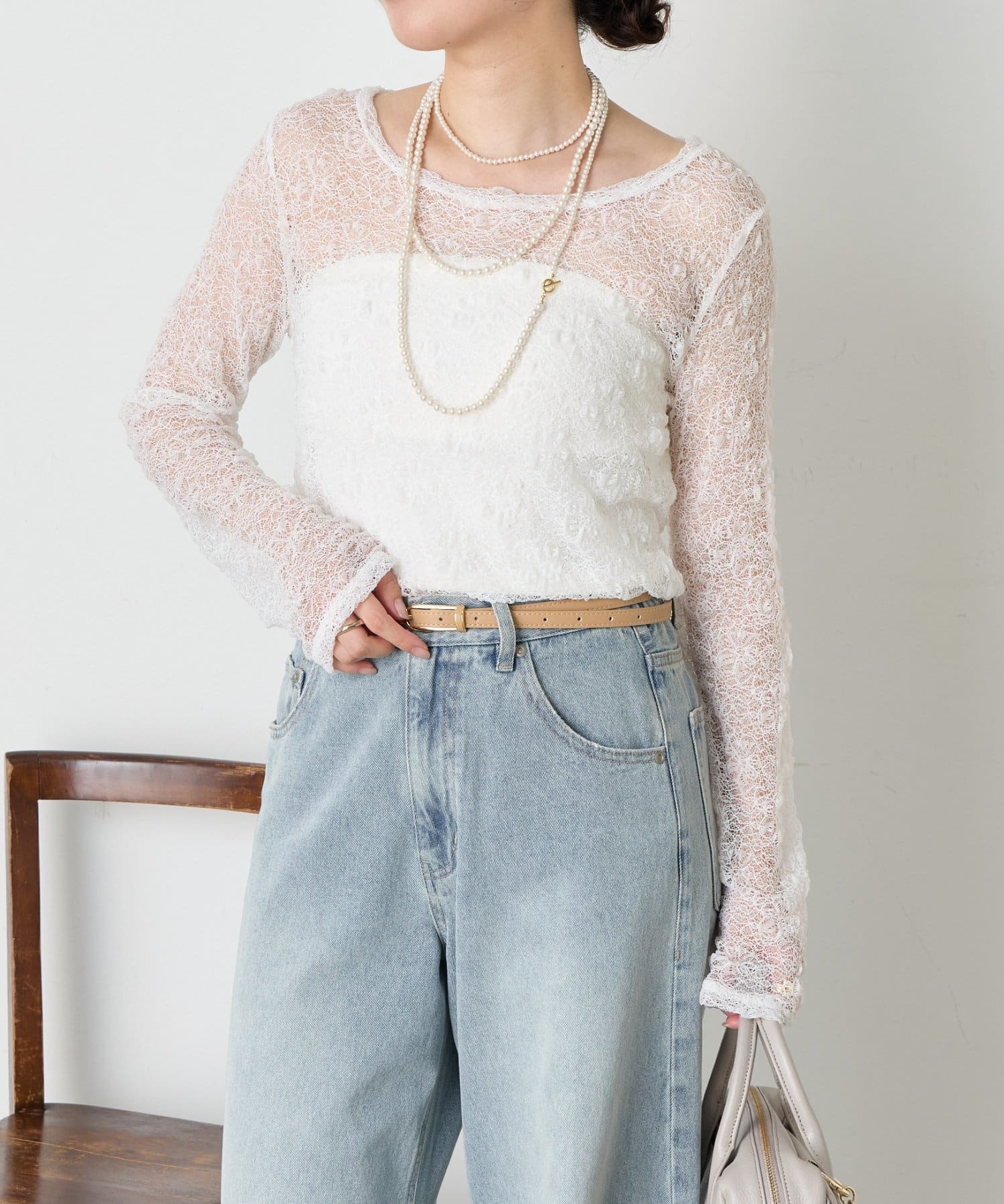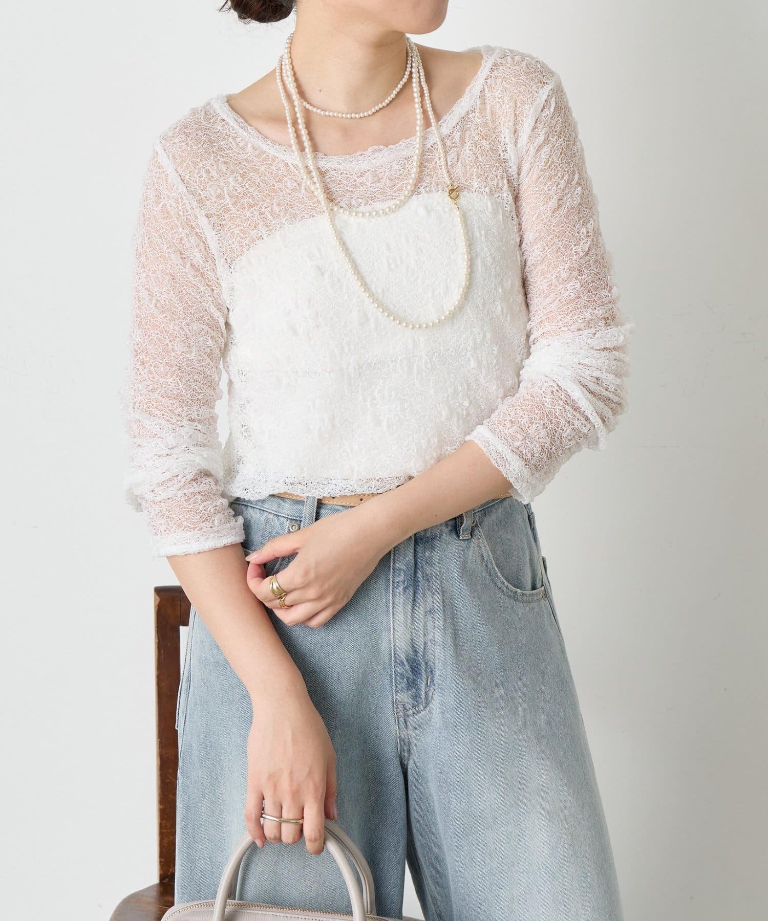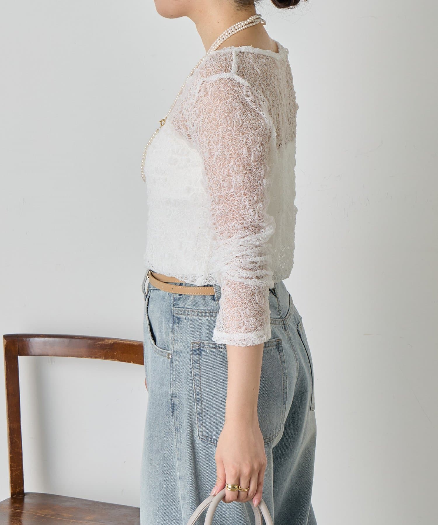 ・透け感のあるレースが、普段のコーデをワンランク上げるシアートップス。