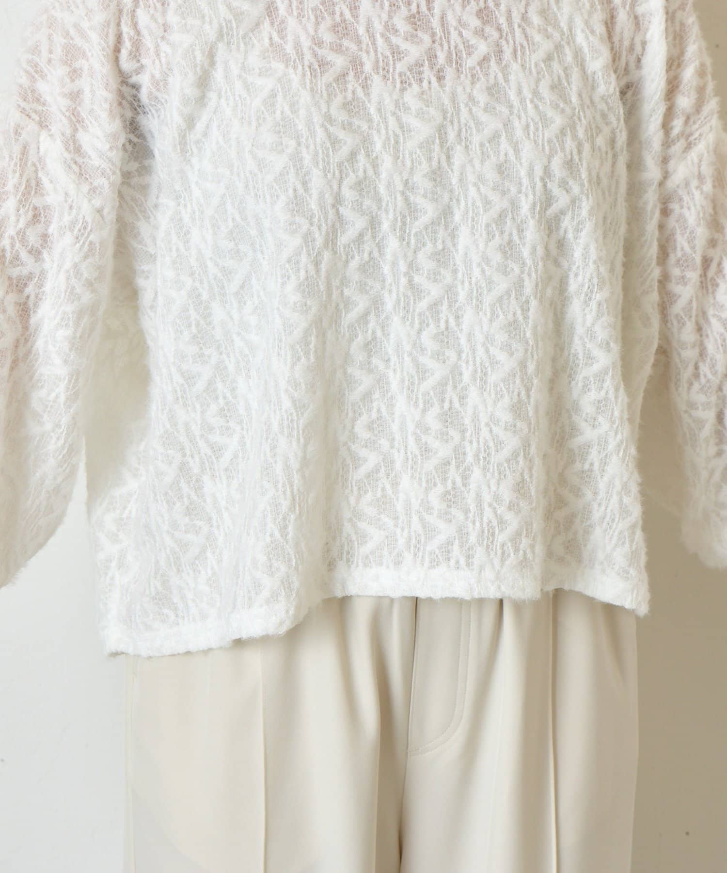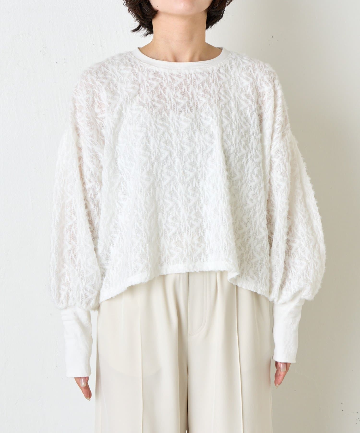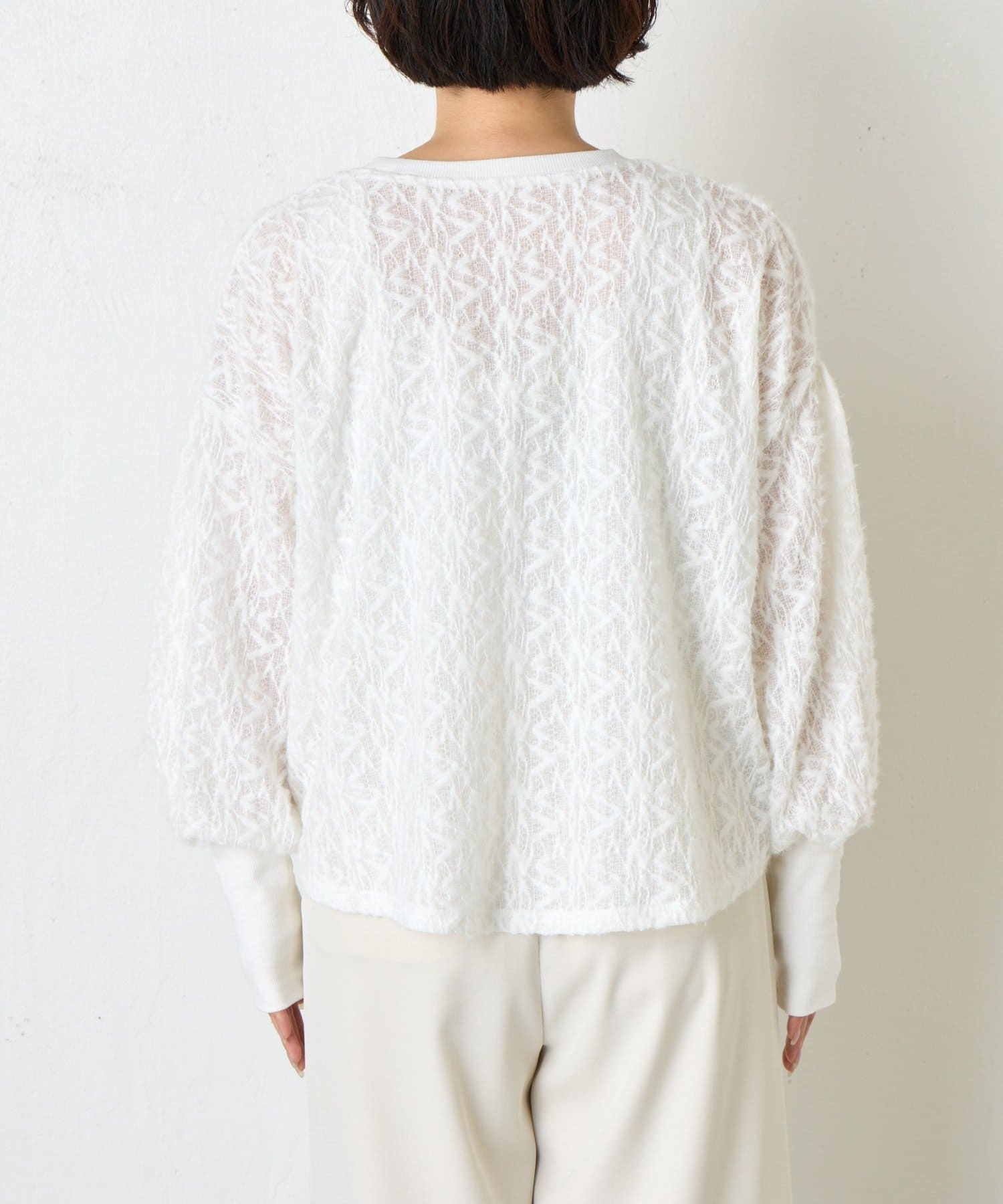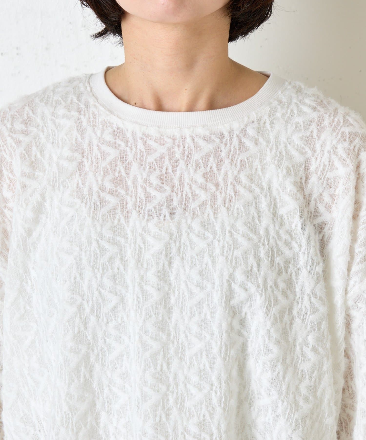 ・繊細な柄感のあるレース風の素材を使用した柔らかな雰囲気が漂う甘すぎない大人のためのプルオーバー。