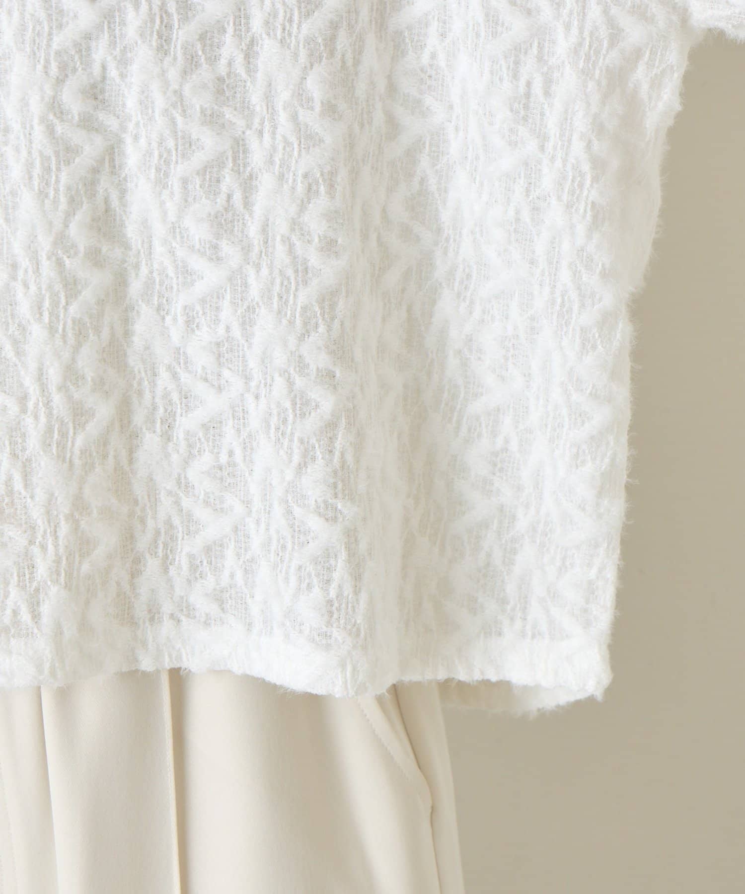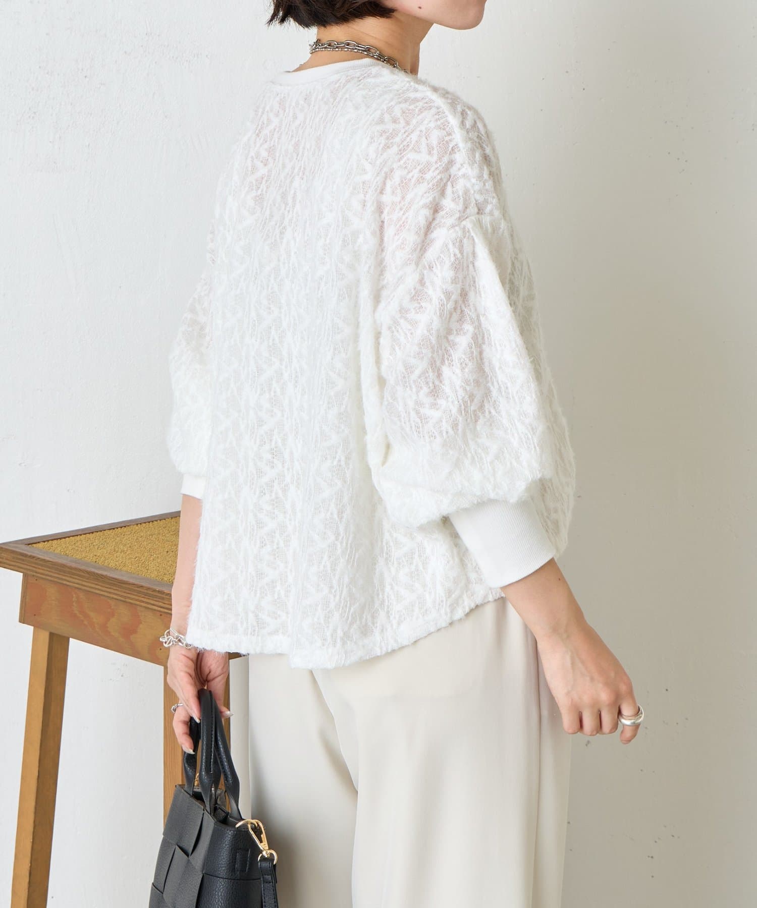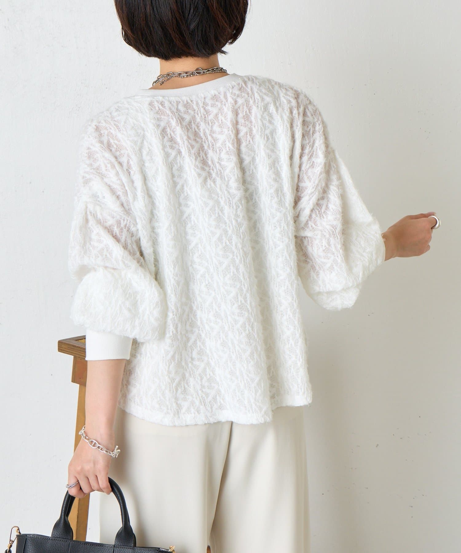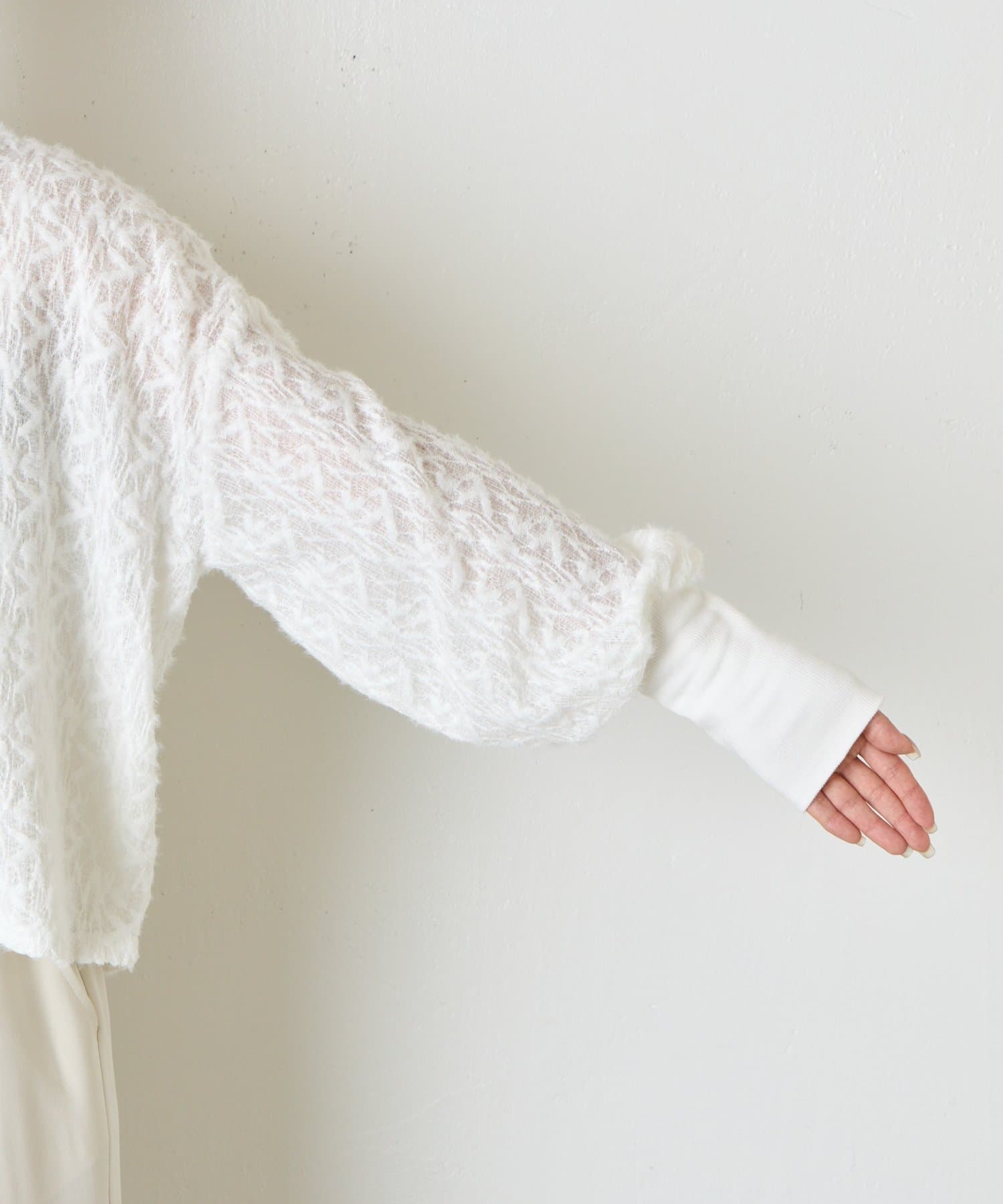 ・繊細な柄感のあるレース風の素材を使用した柔らかな雰囲気が漂う甘すぎない大人のためのプルオーバー。