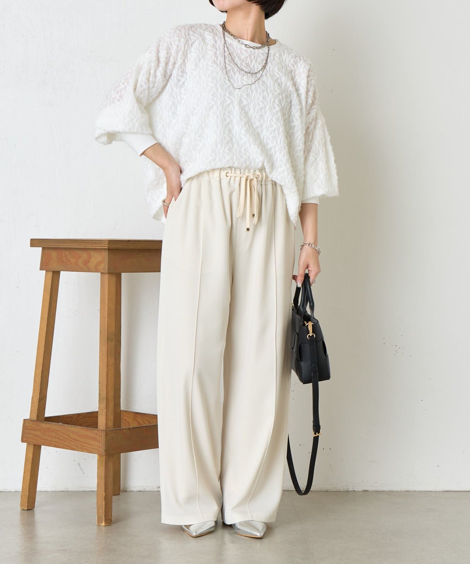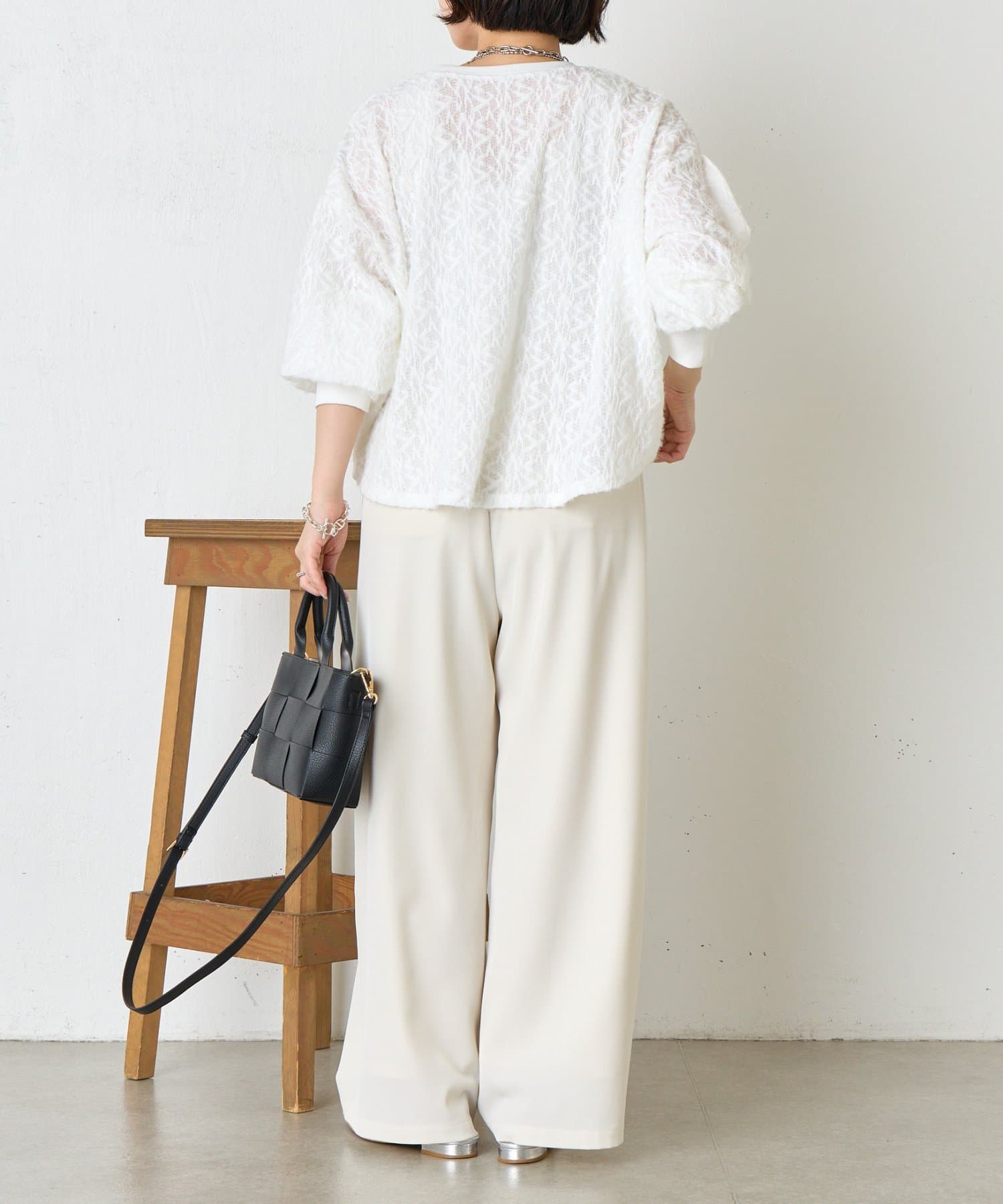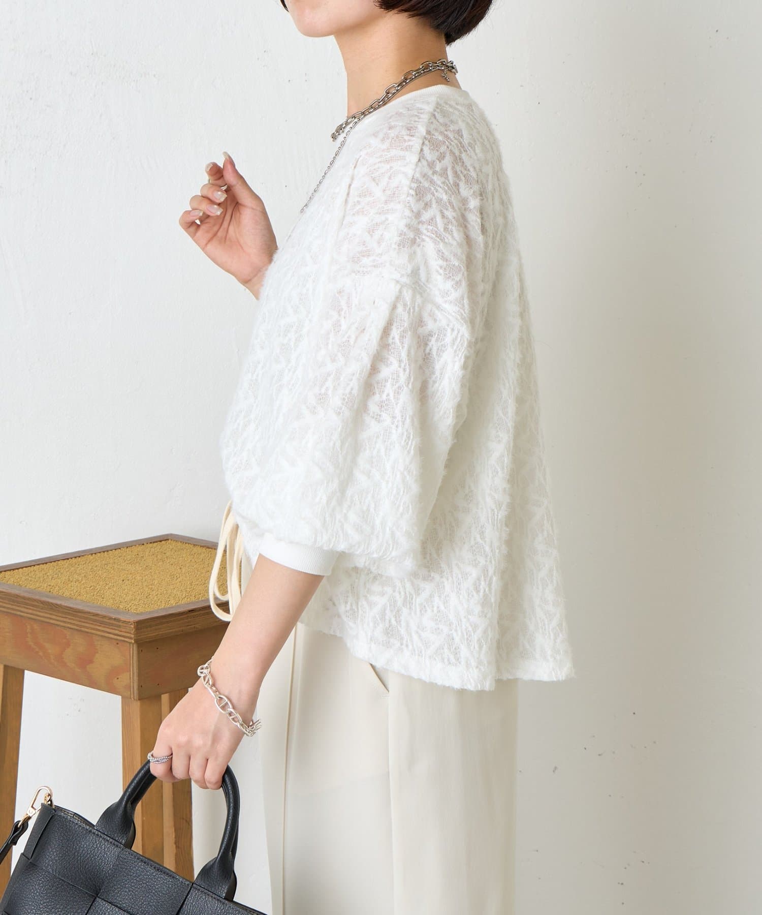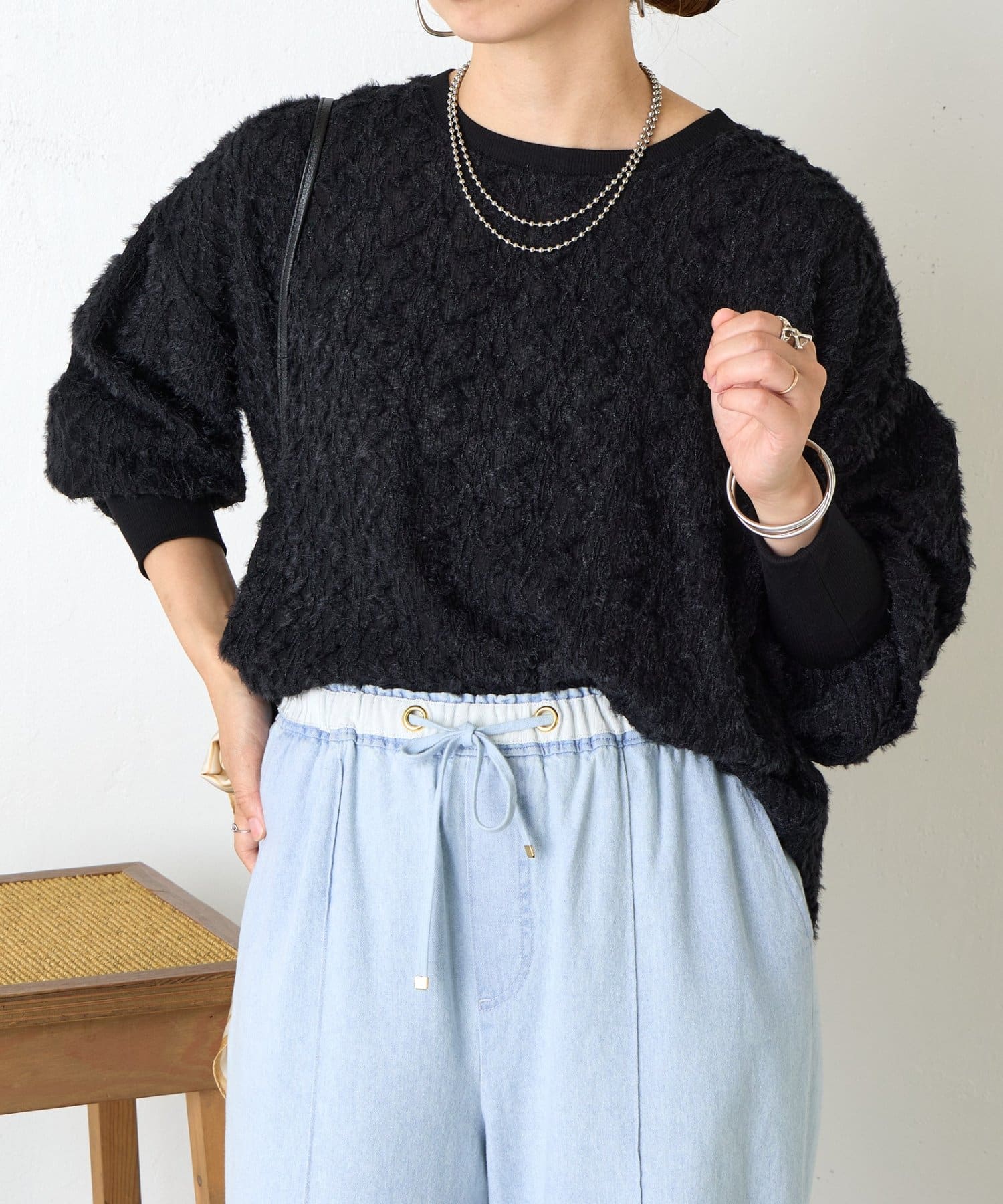 ・ふんわりとしたシルエットとドロップショルダーのバランスが絶妙で、リラックス感がありながらも女性らしい抜け感を演出。