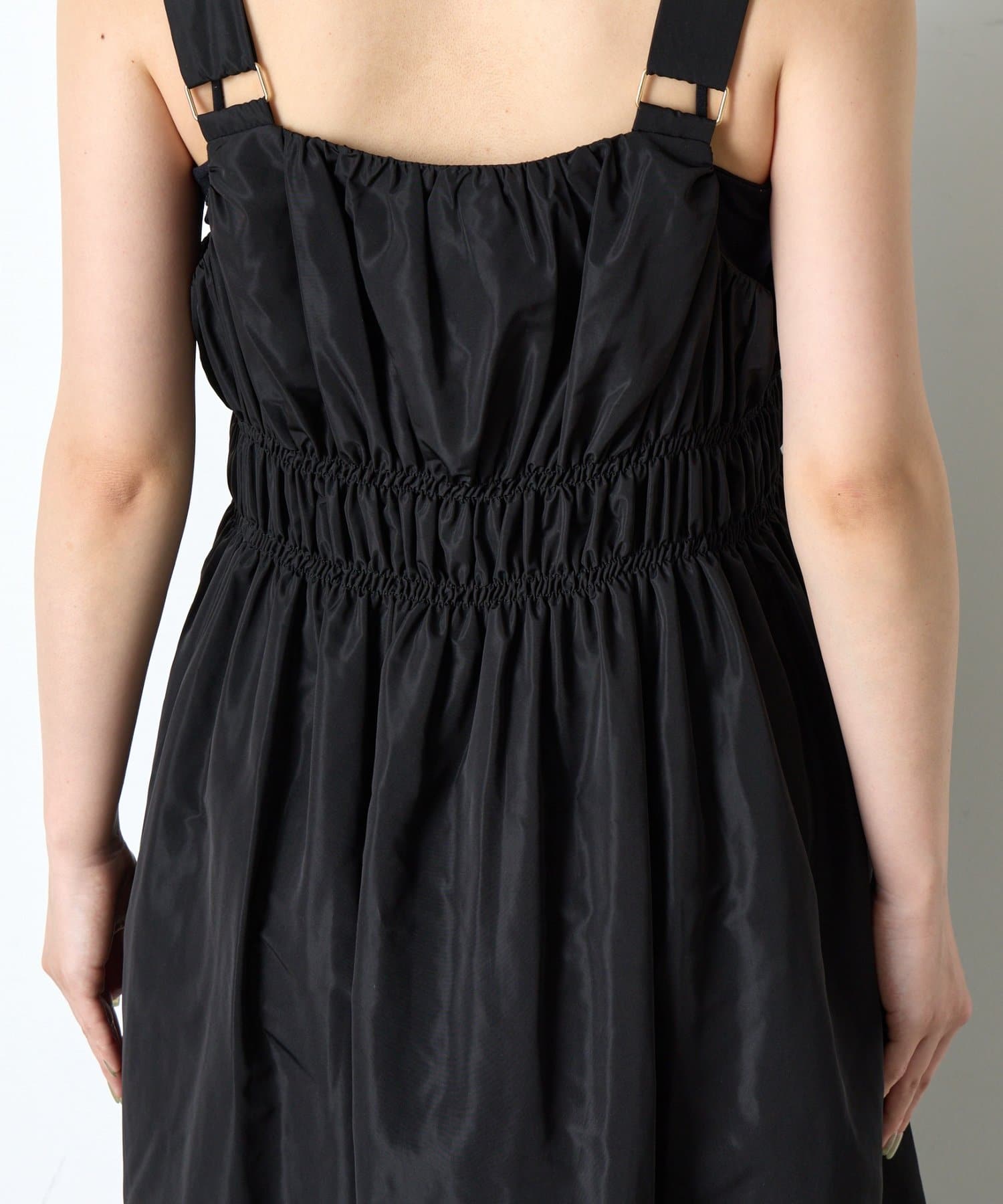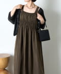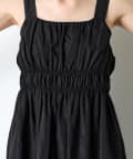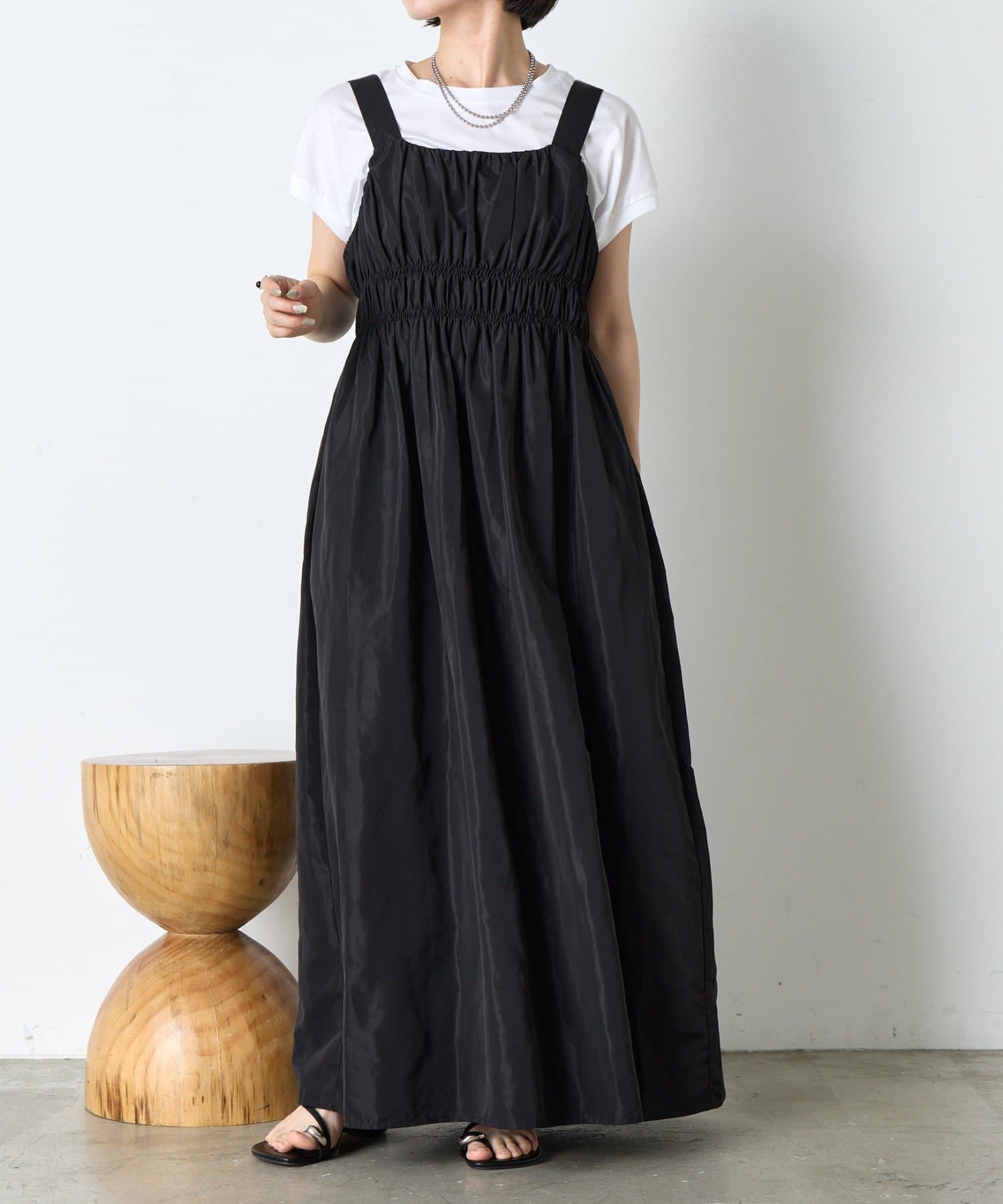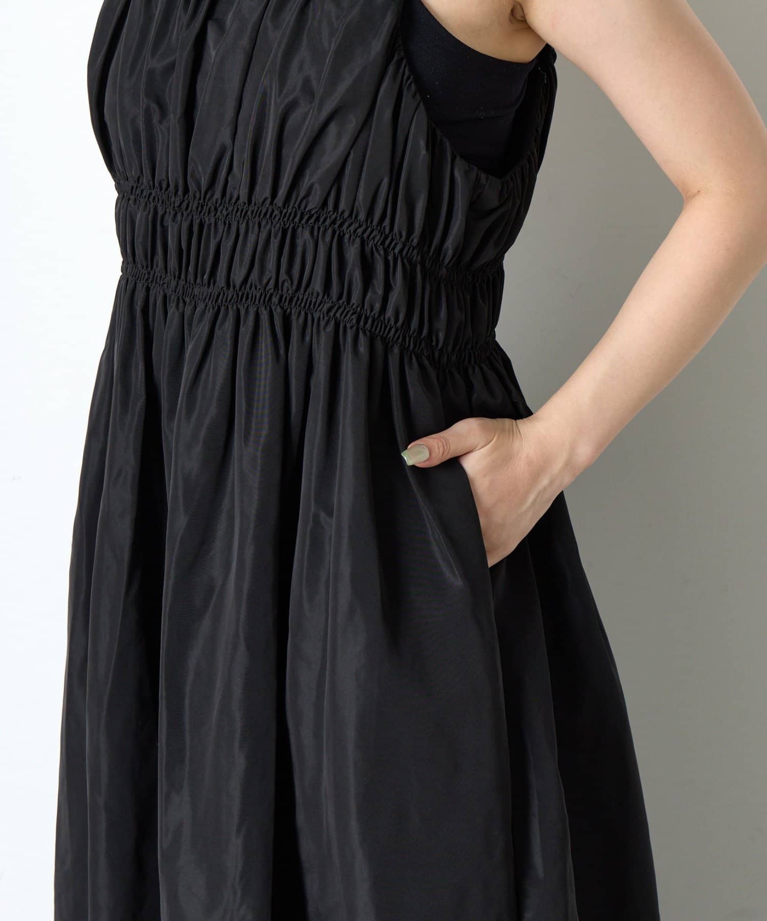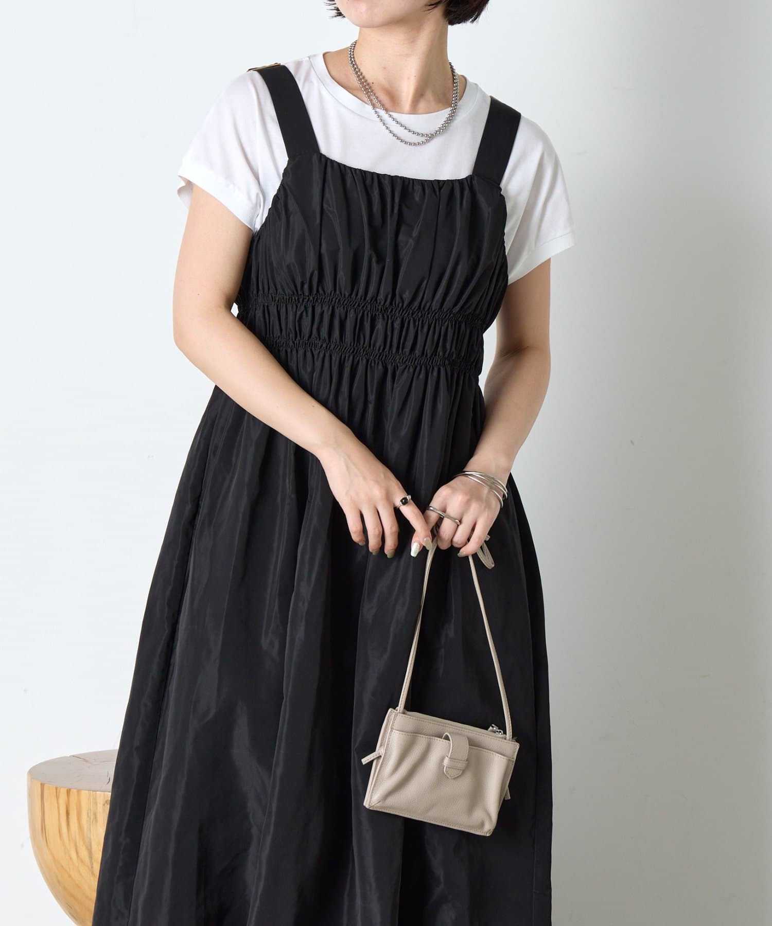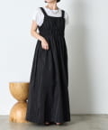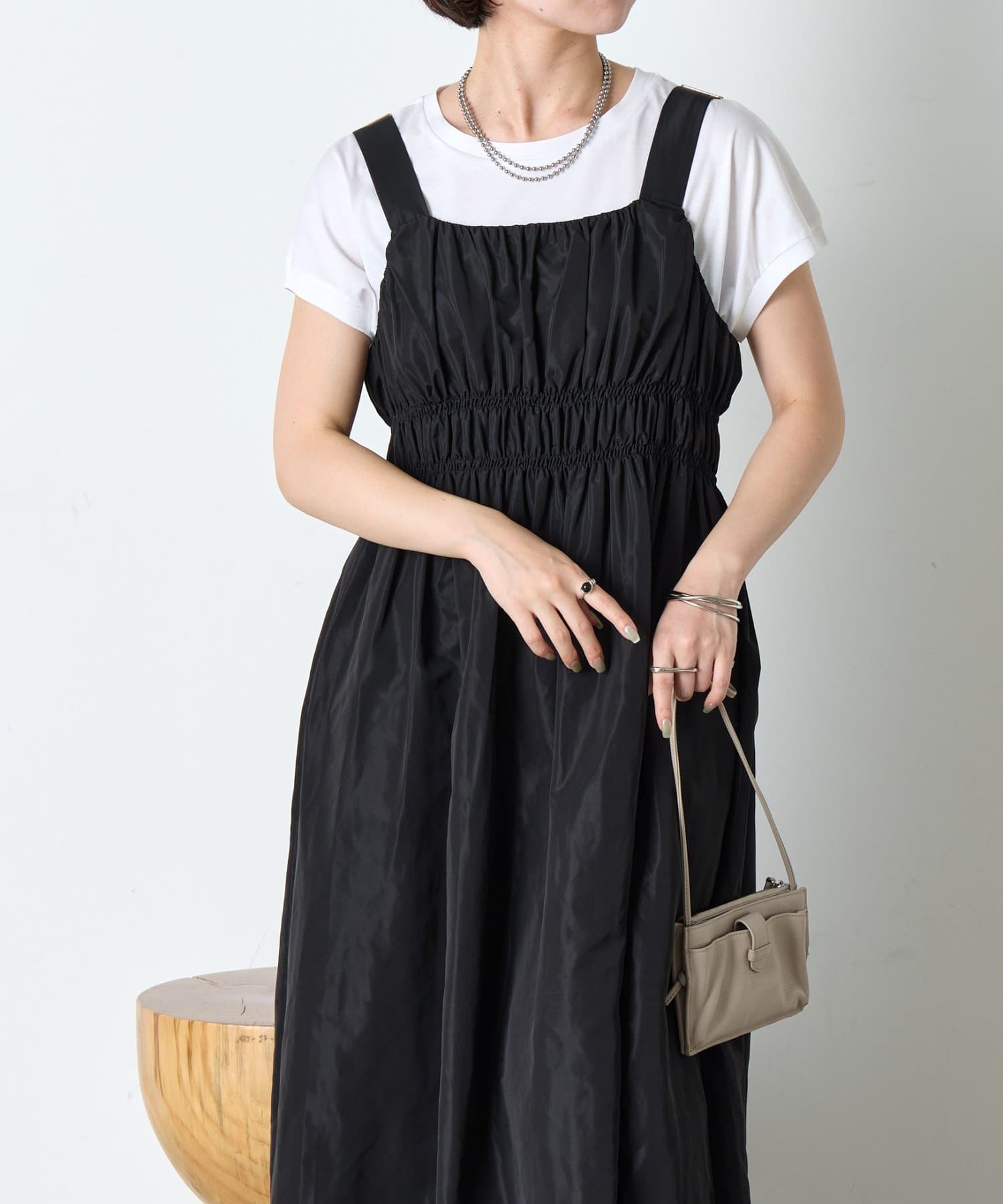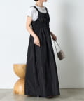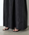 ・ウエストのシャーリングデザインが大人の甘さをプラスしたカジュアル過ぎないナイロン素材のジャンスカ。