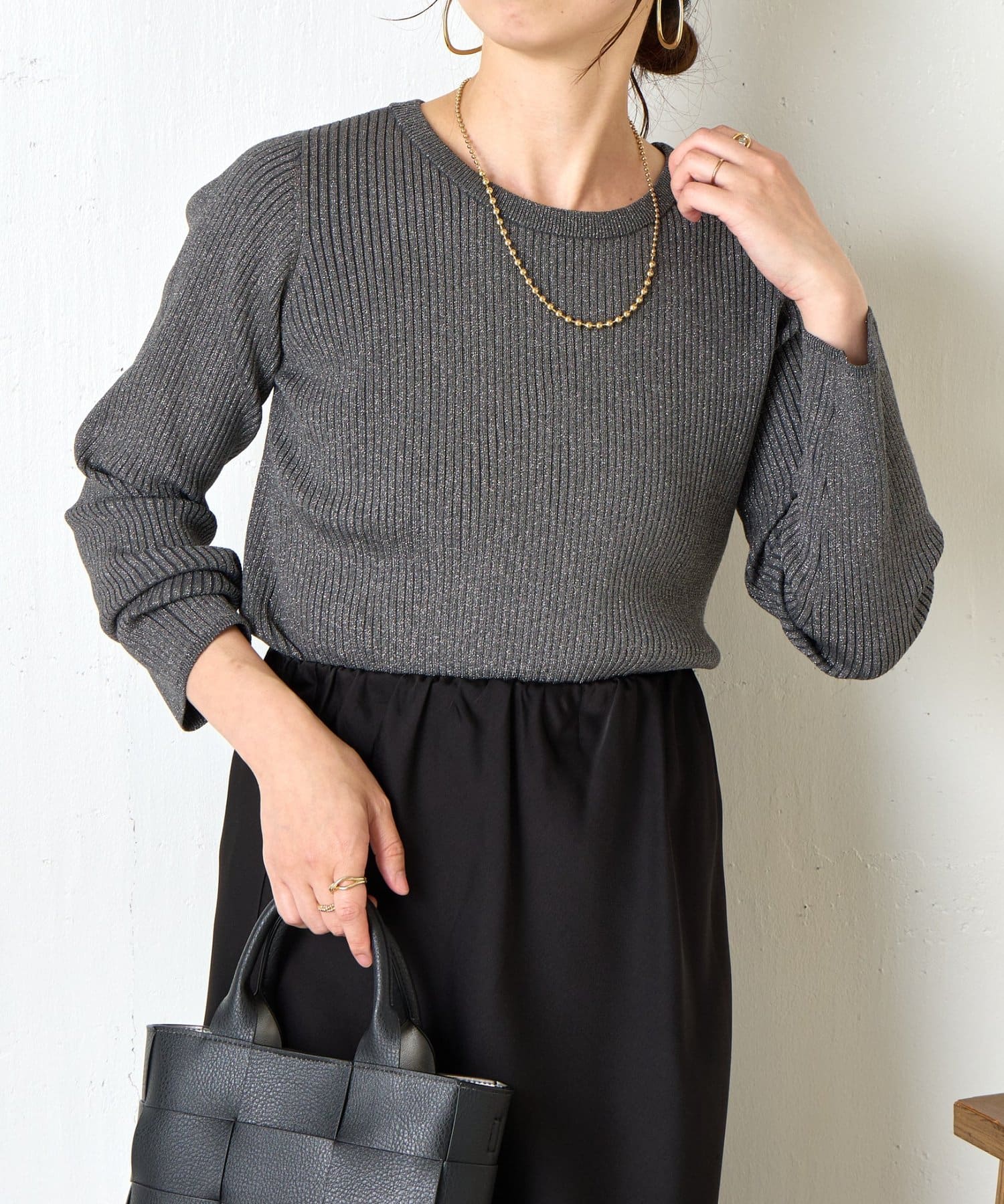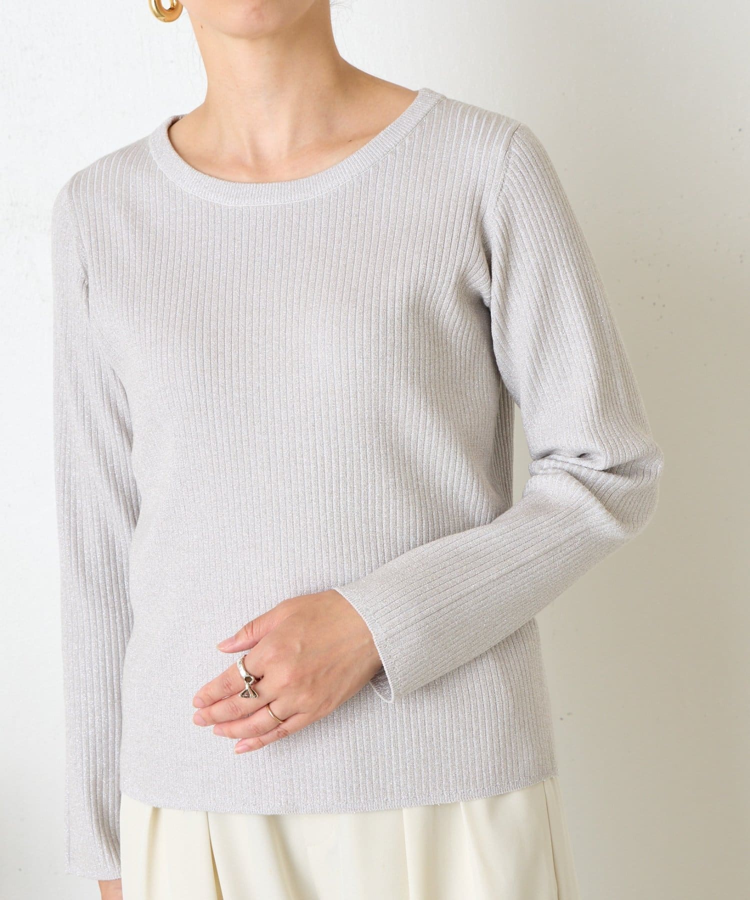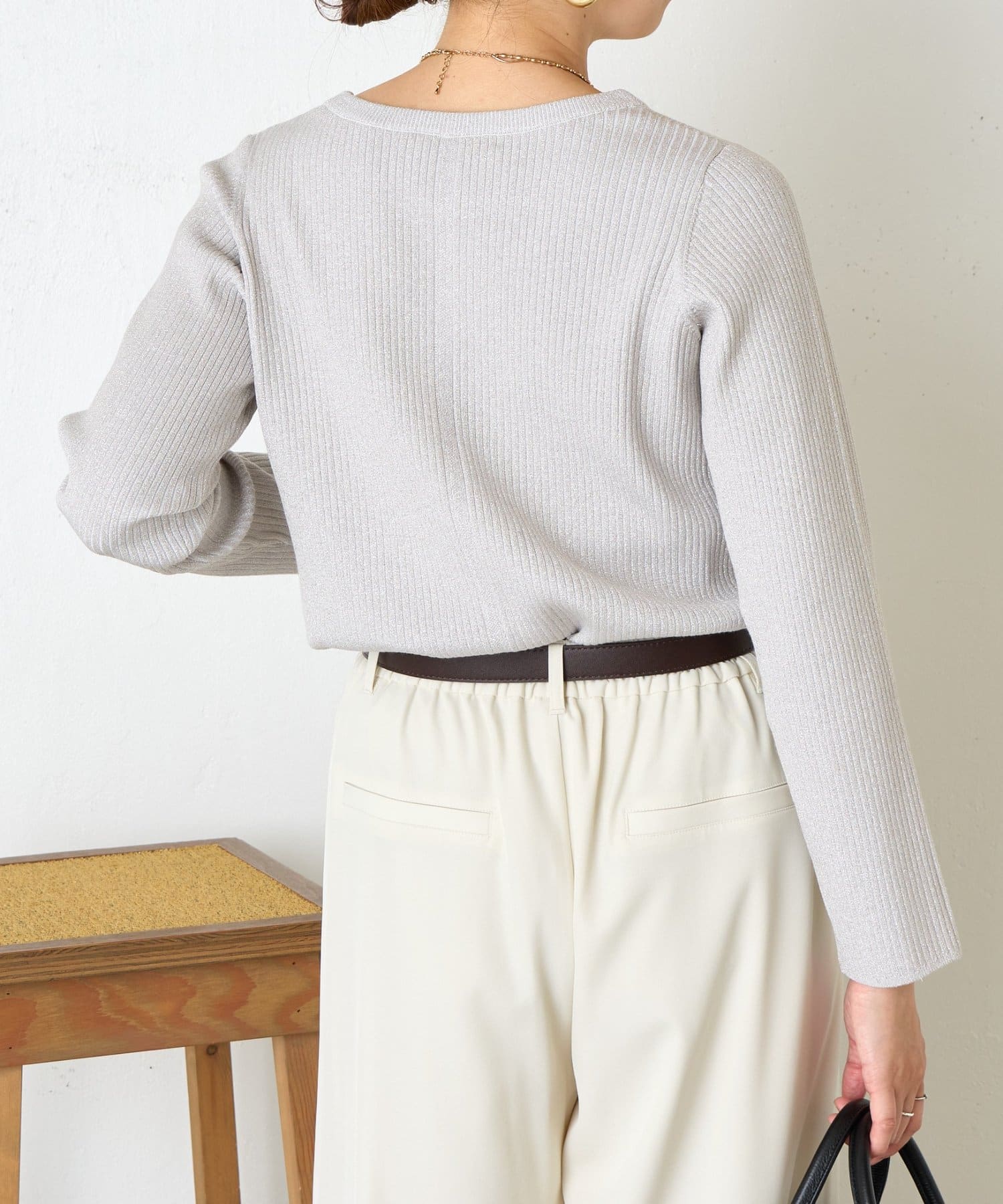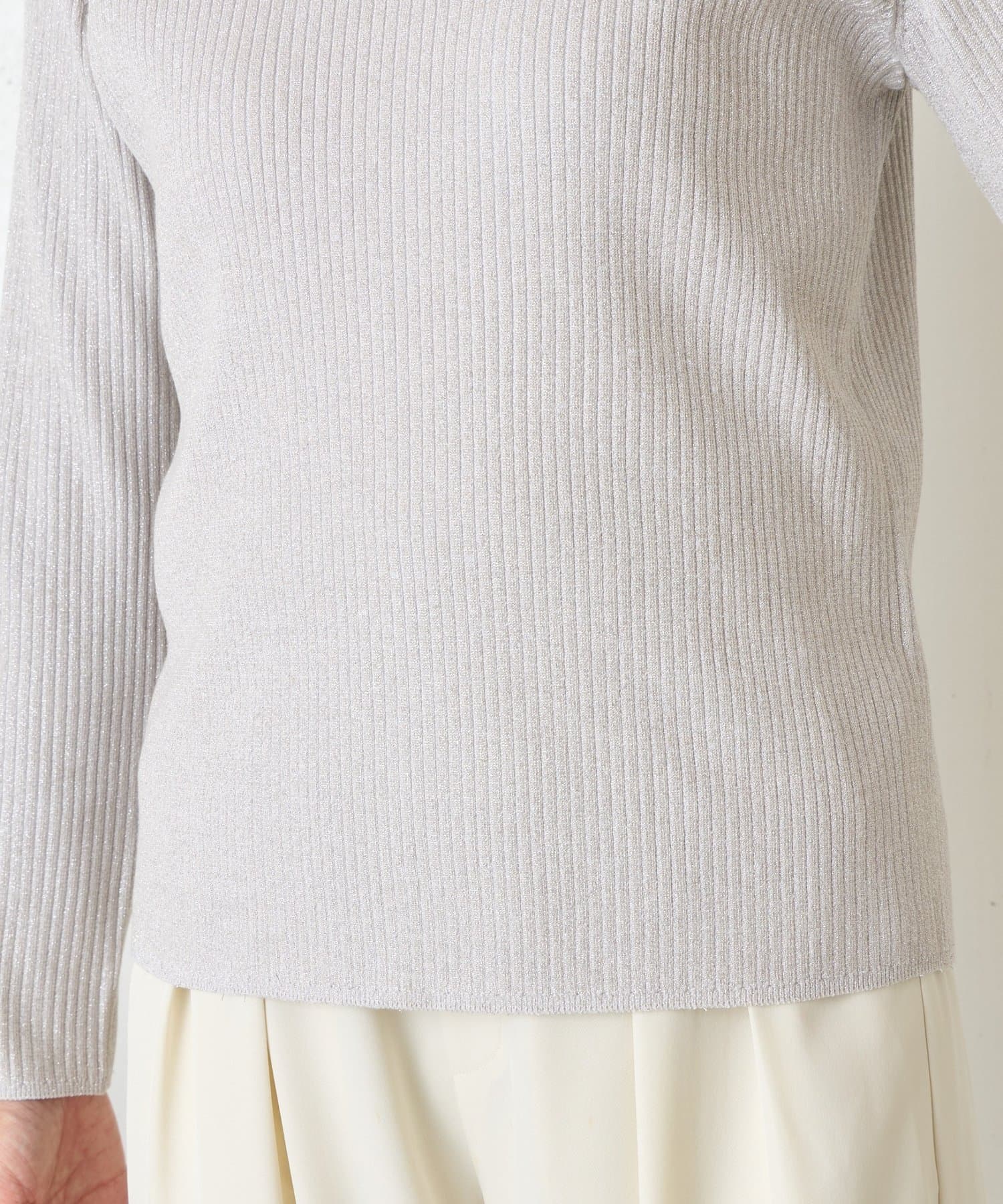 ・繊細なラメが織り込まれたストレッチのある上品なリブニットトップス。