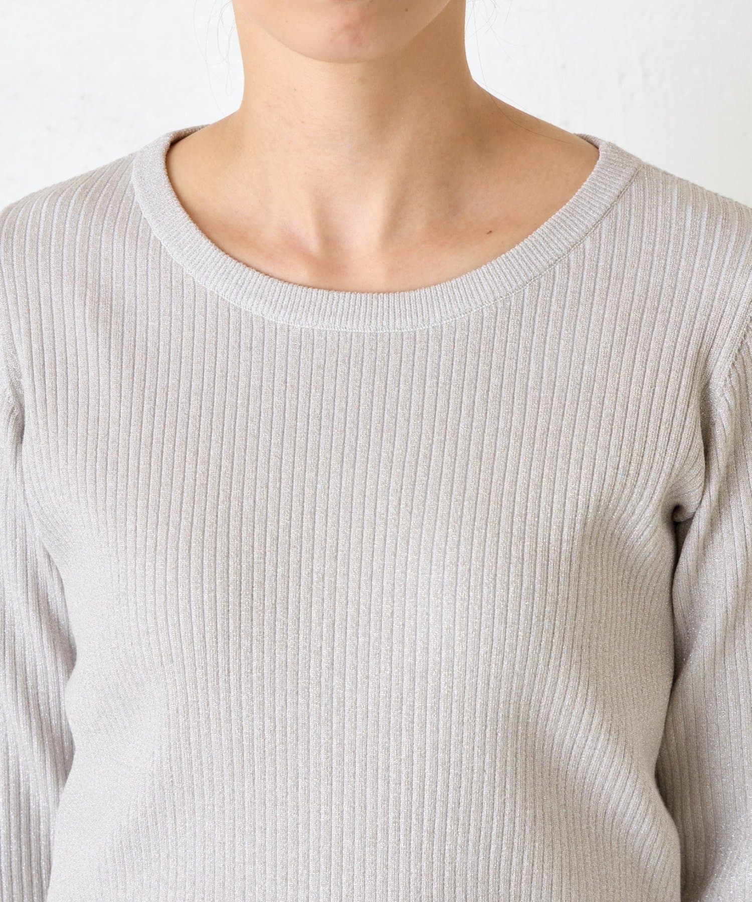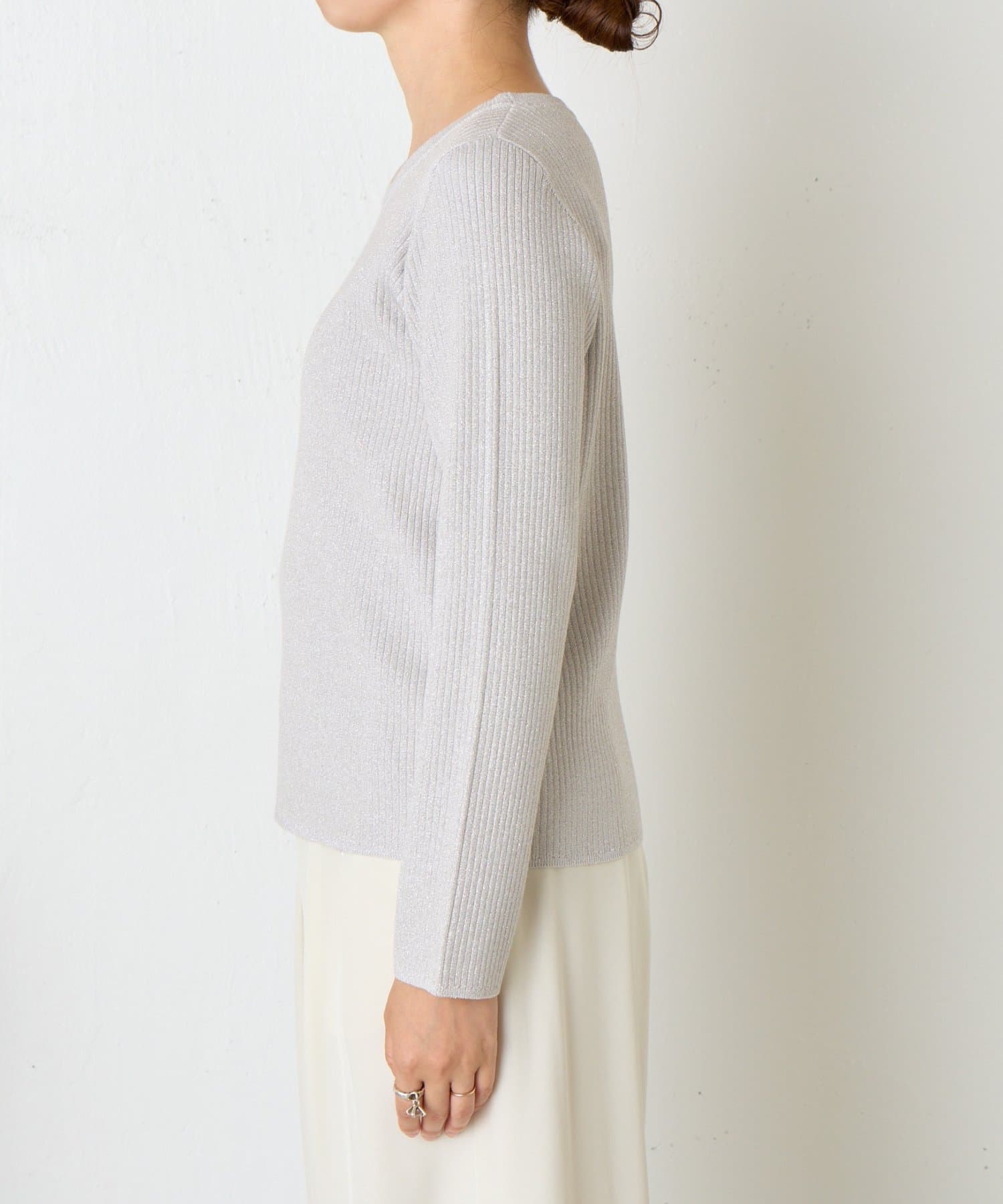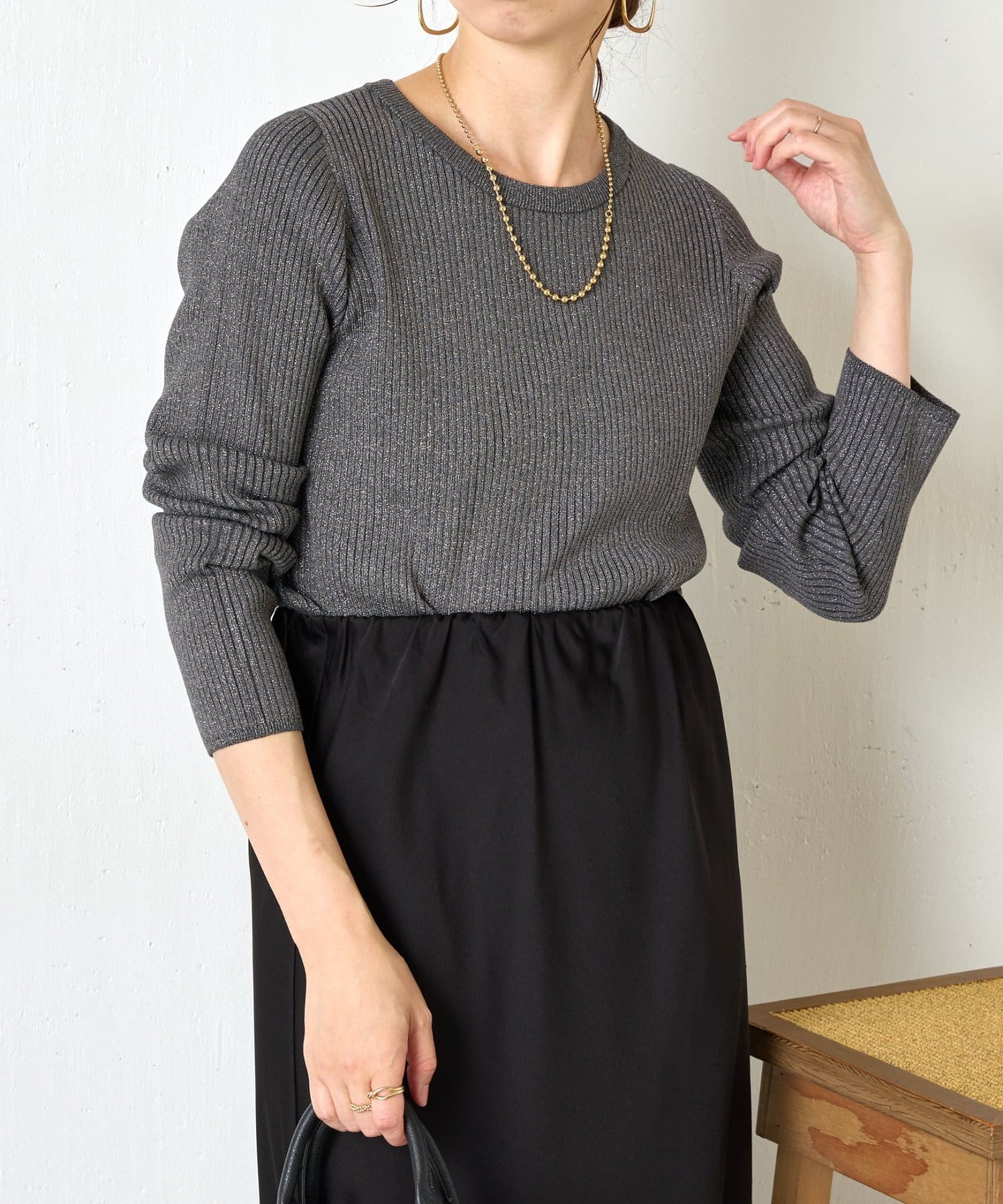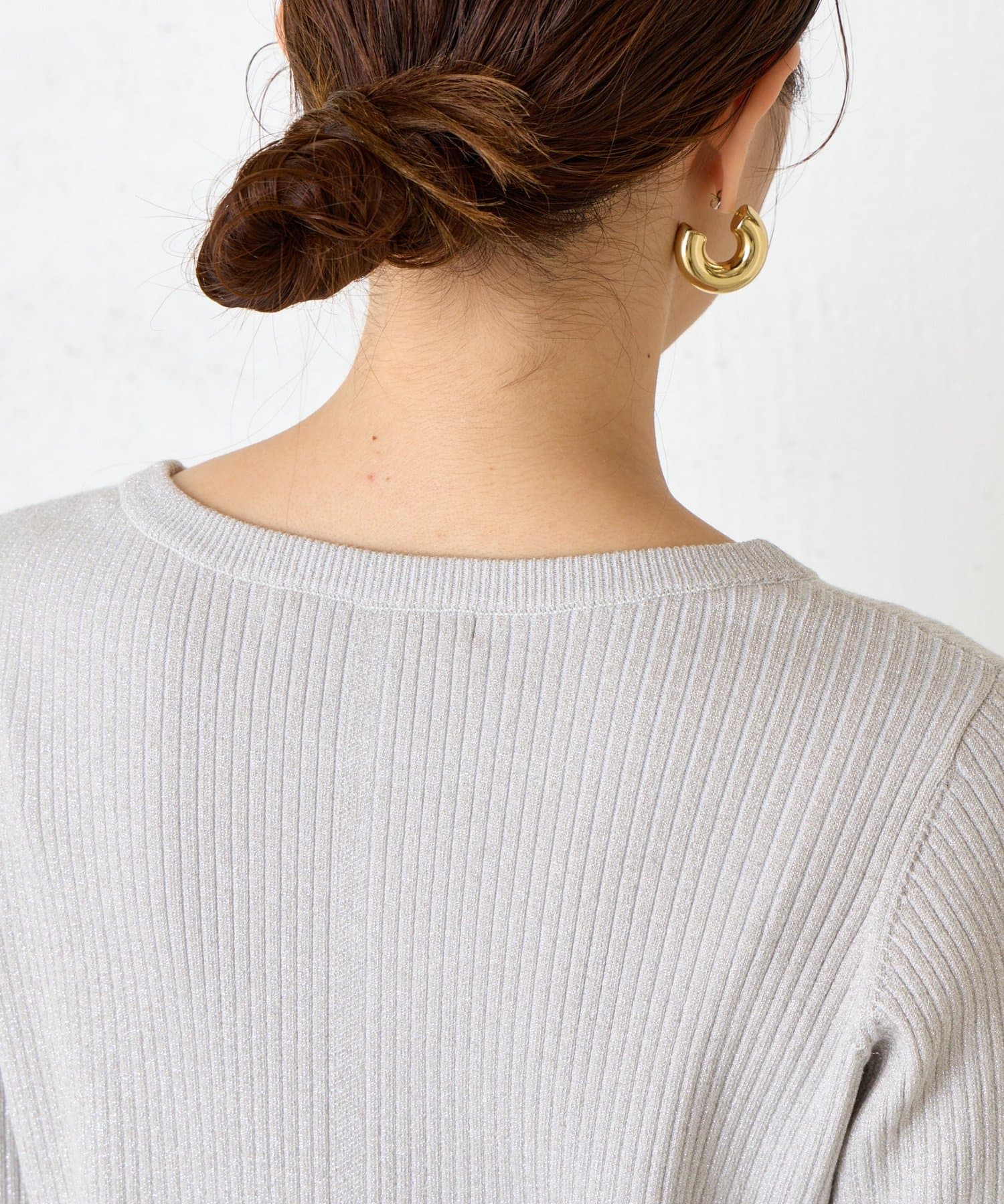・繊細なラメが織り込まれたストレッチのある上品なリブニットトップス。