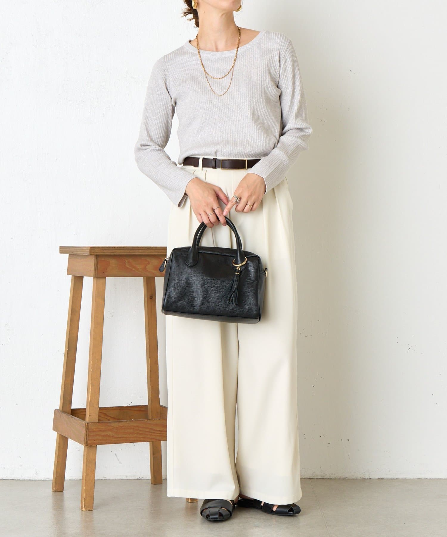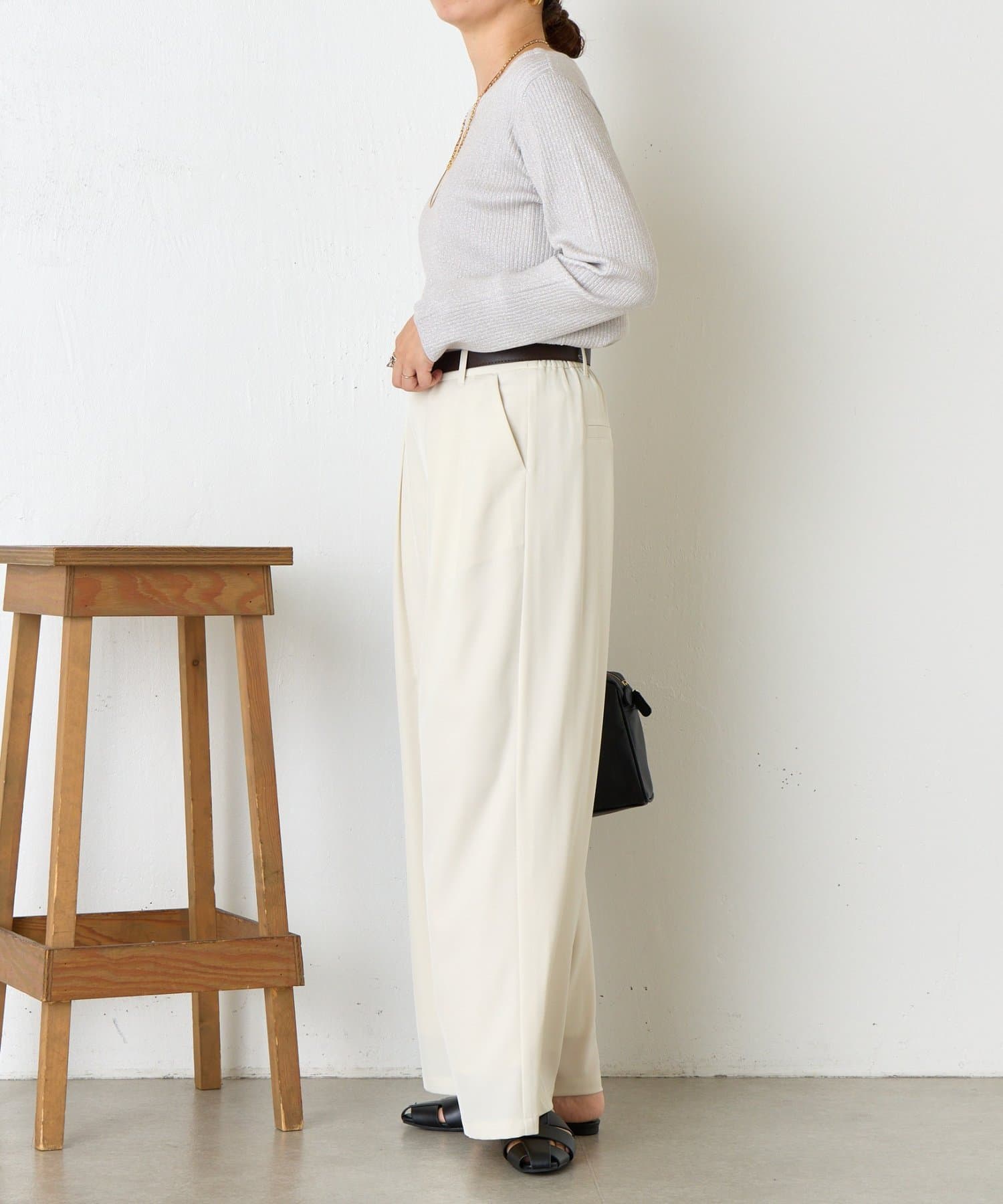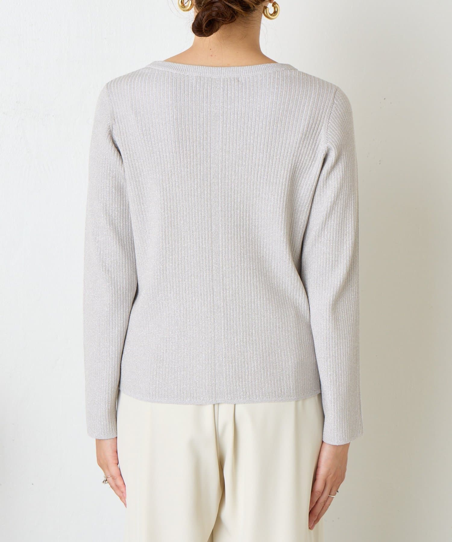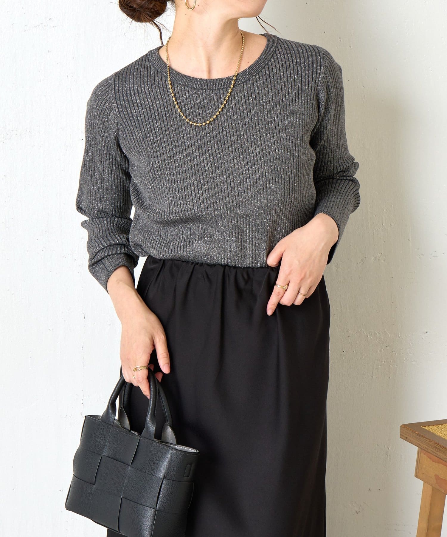 ・繊細なラメが織り込まれたストレッチのある上品なリブニットトップス。