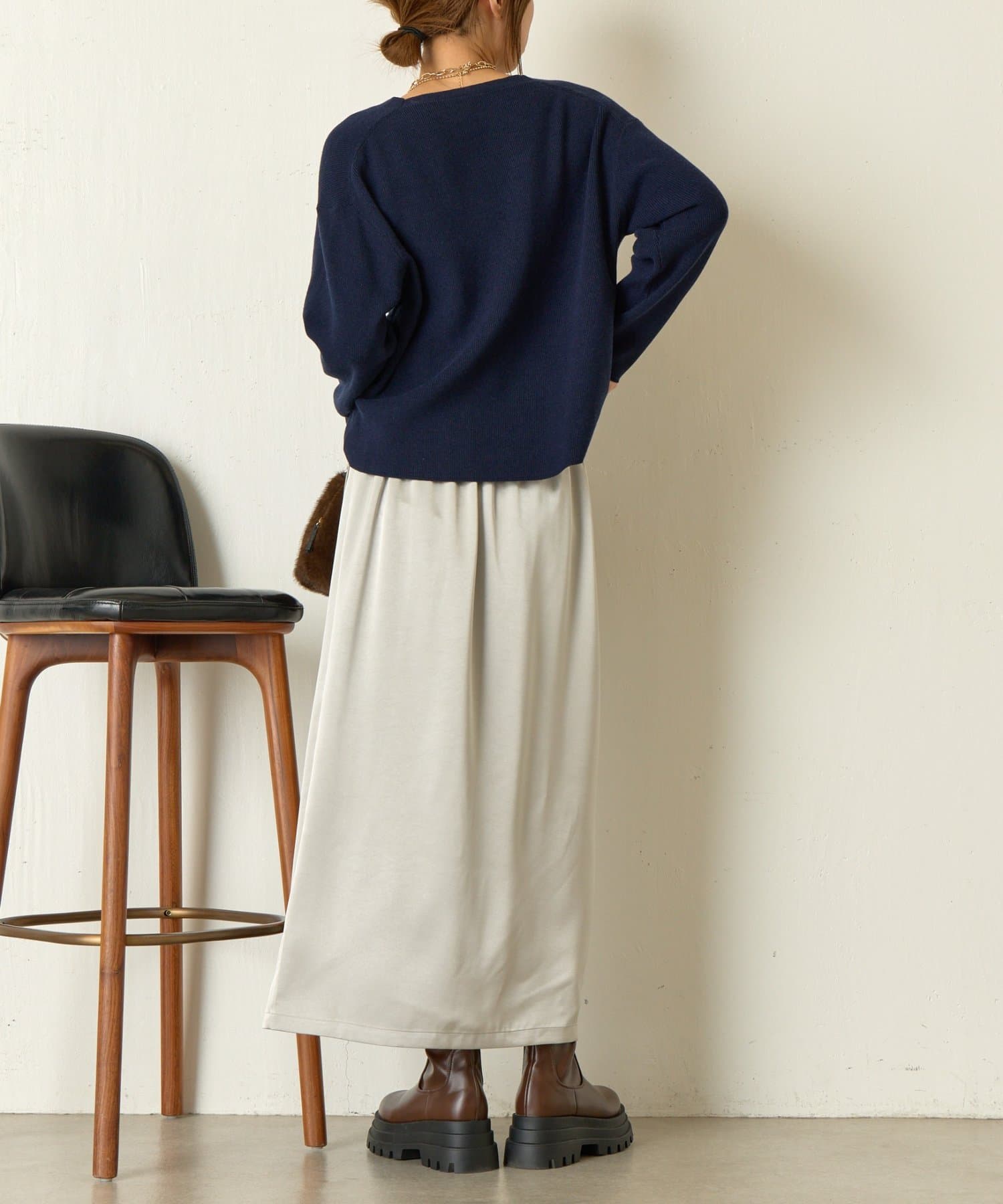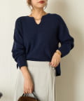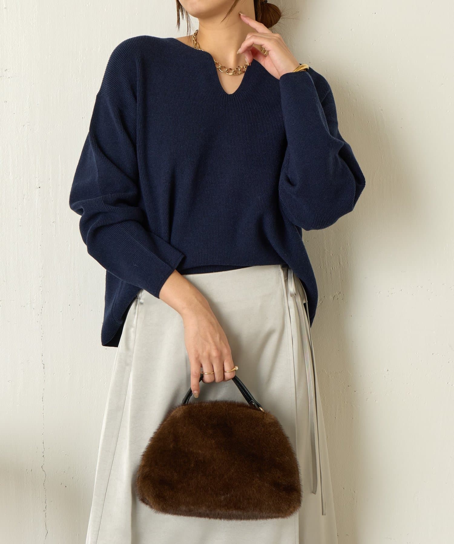 ・絶妙な厚さの生地感と、首元のキーネックデザインががすっきり見えの秘訣!