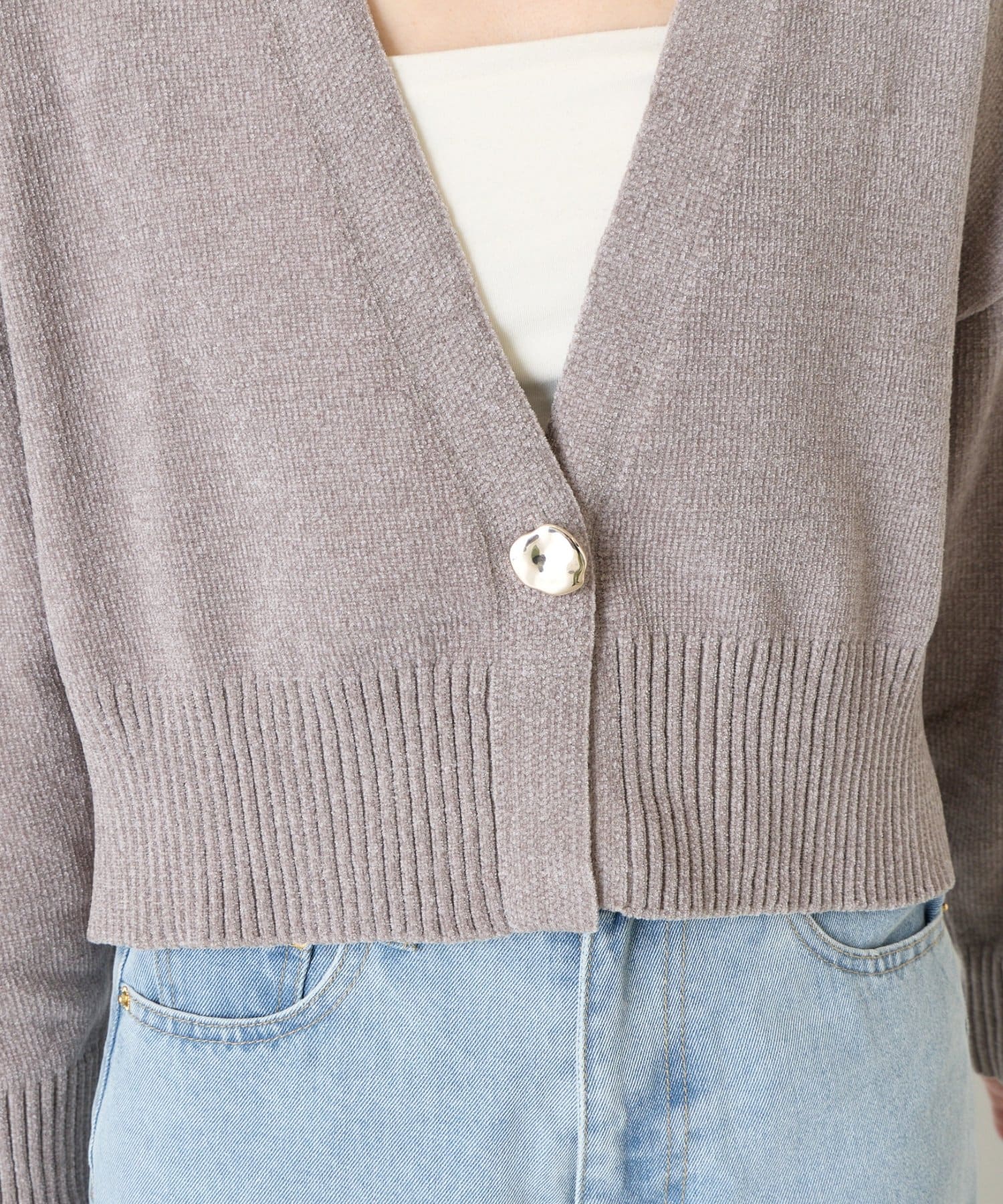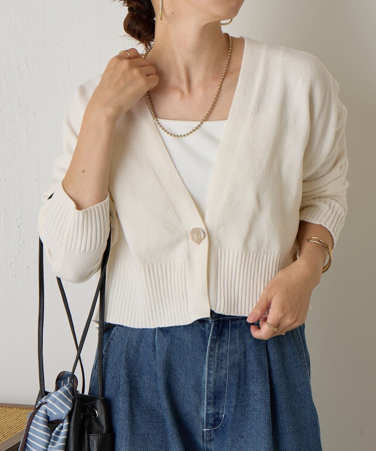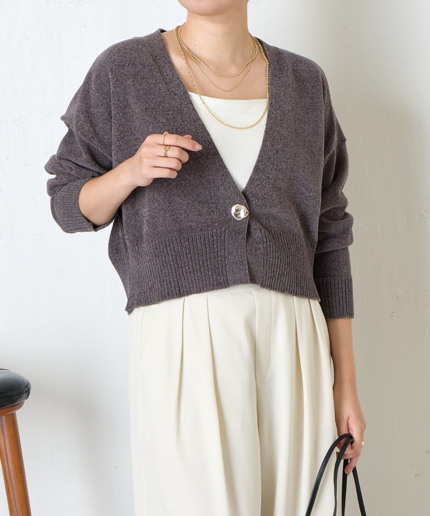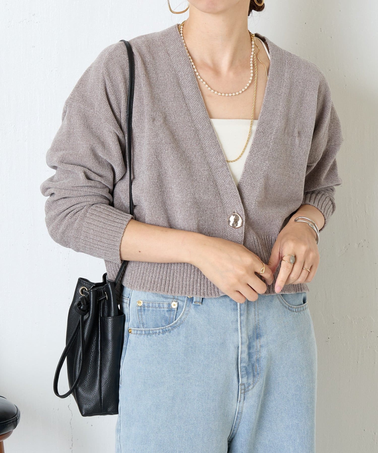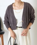 ・存在感のある大きなゴールドボタンがアクセントになったショートカーディガン。