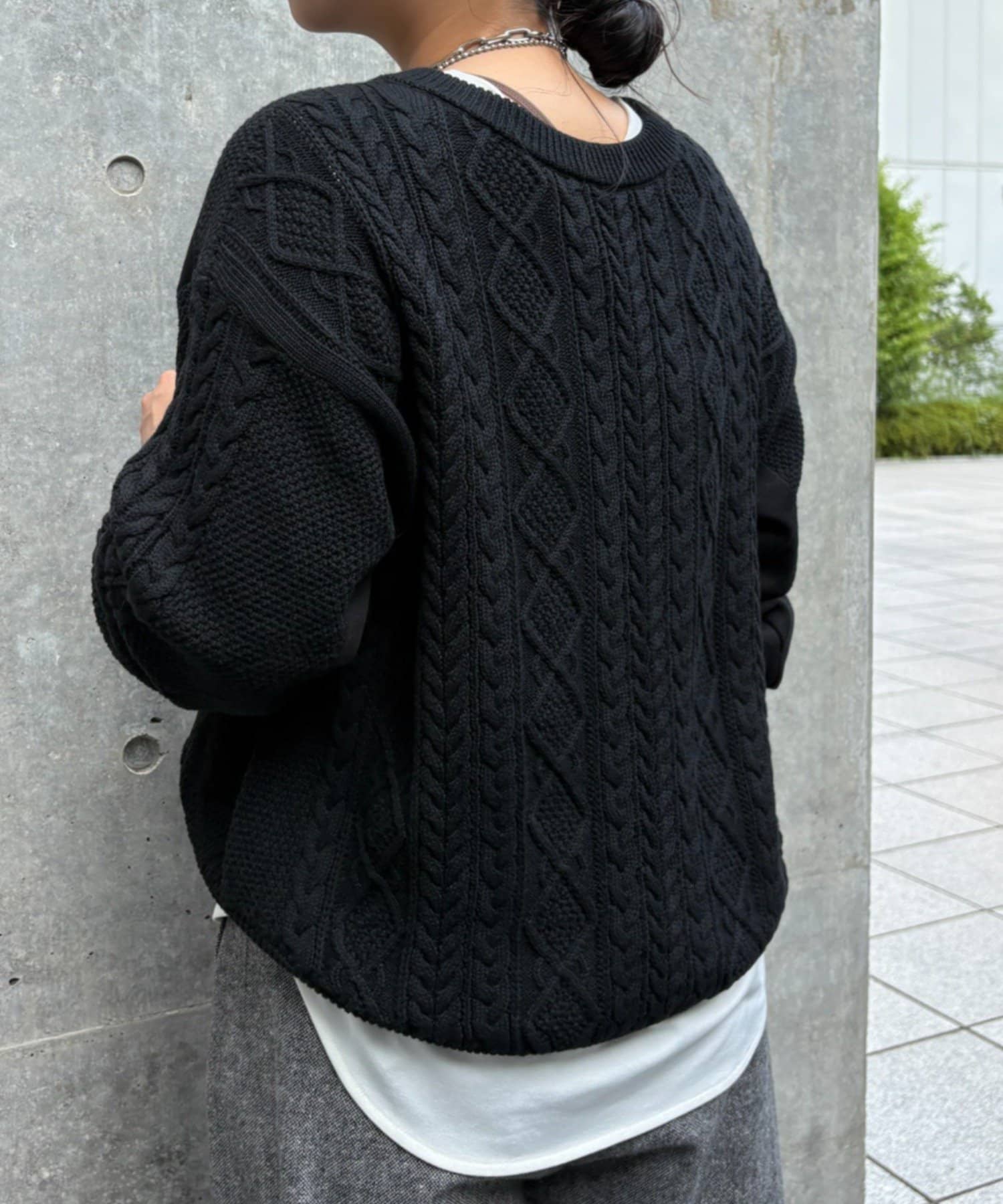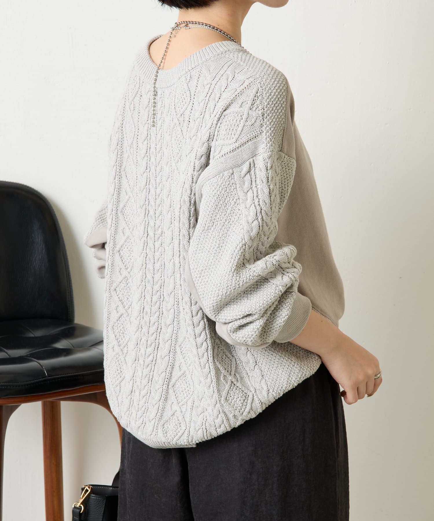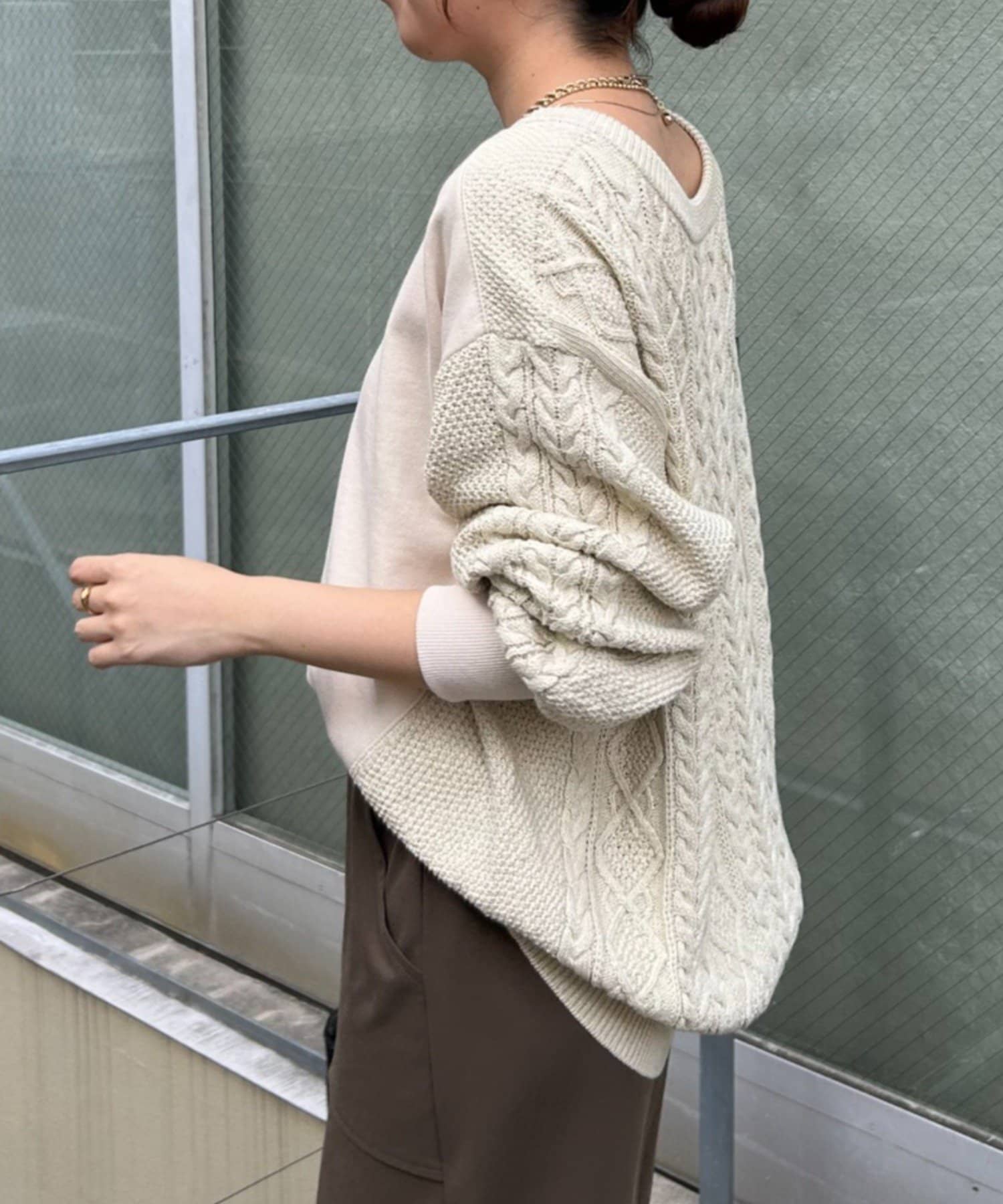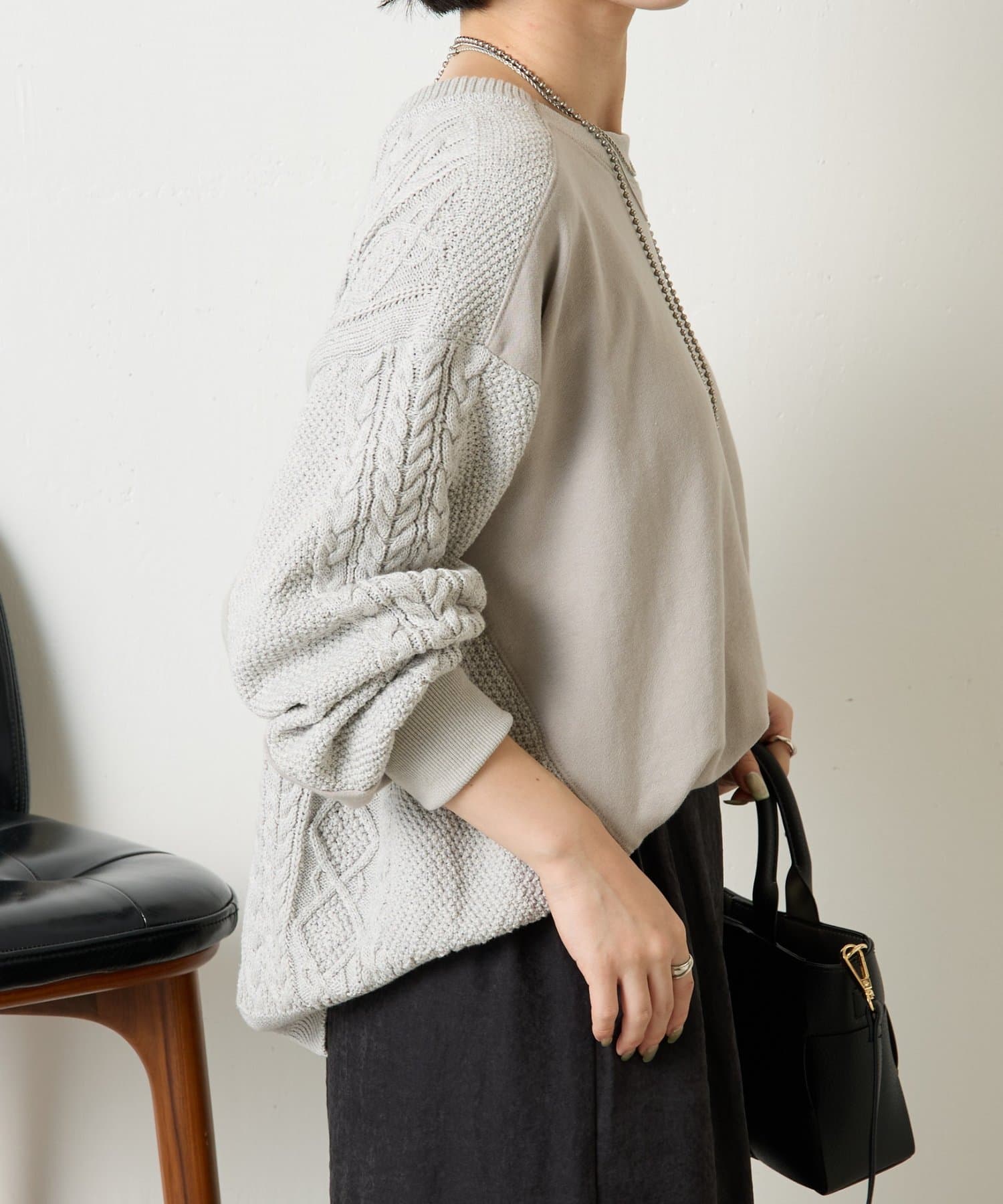 ・ケーブルニットとドッキングされた前後の大胆な切替が、他にはない一枚。