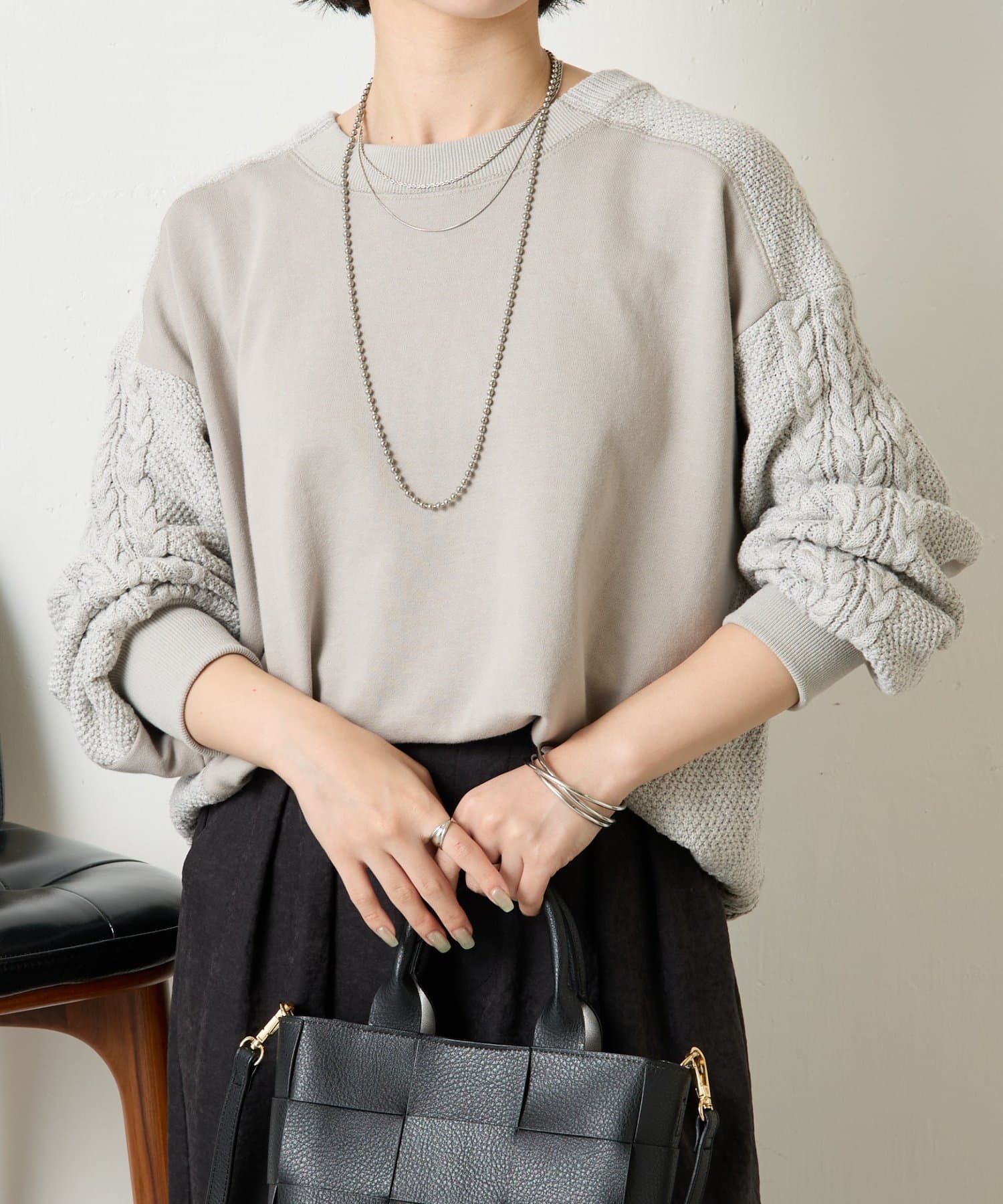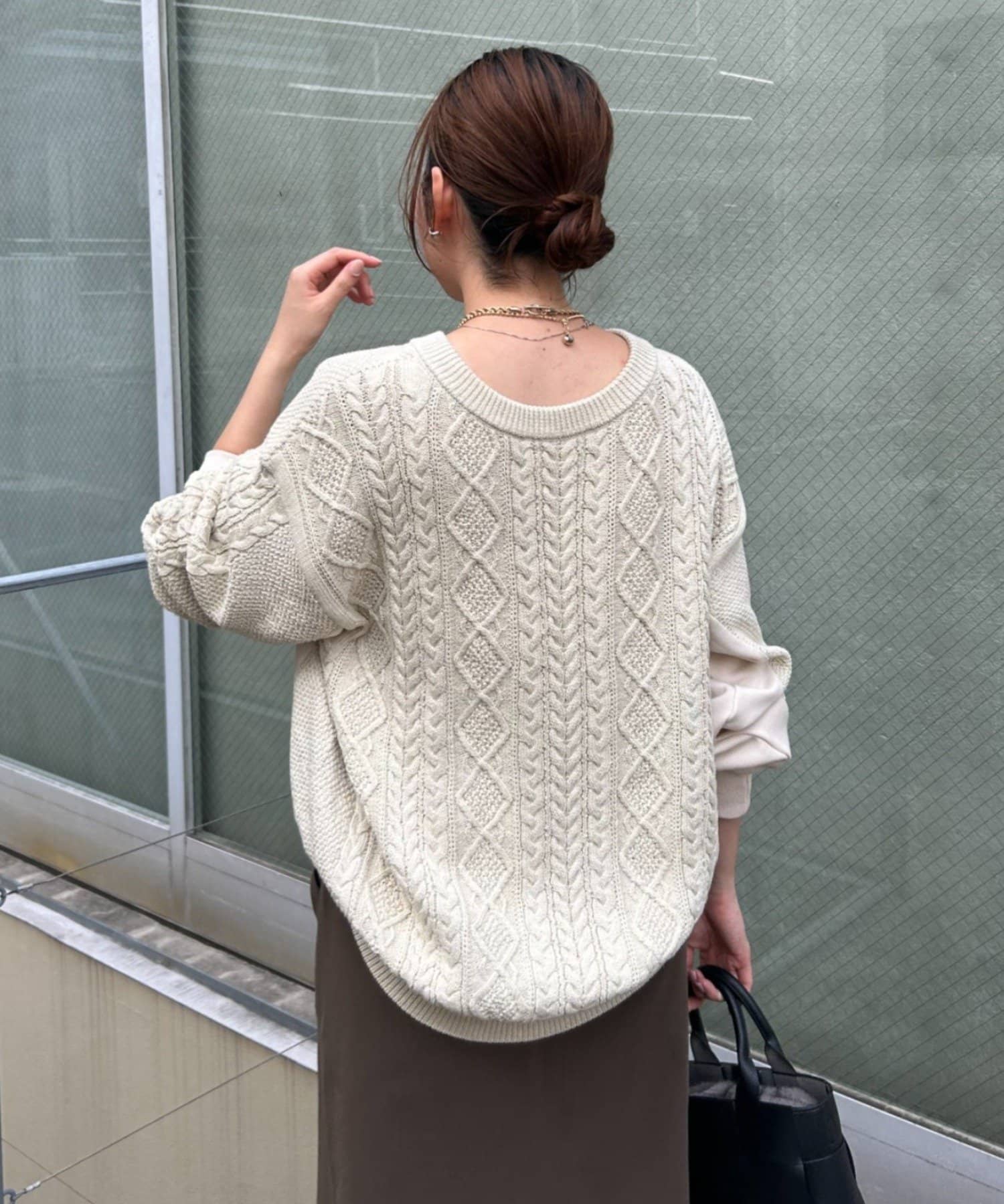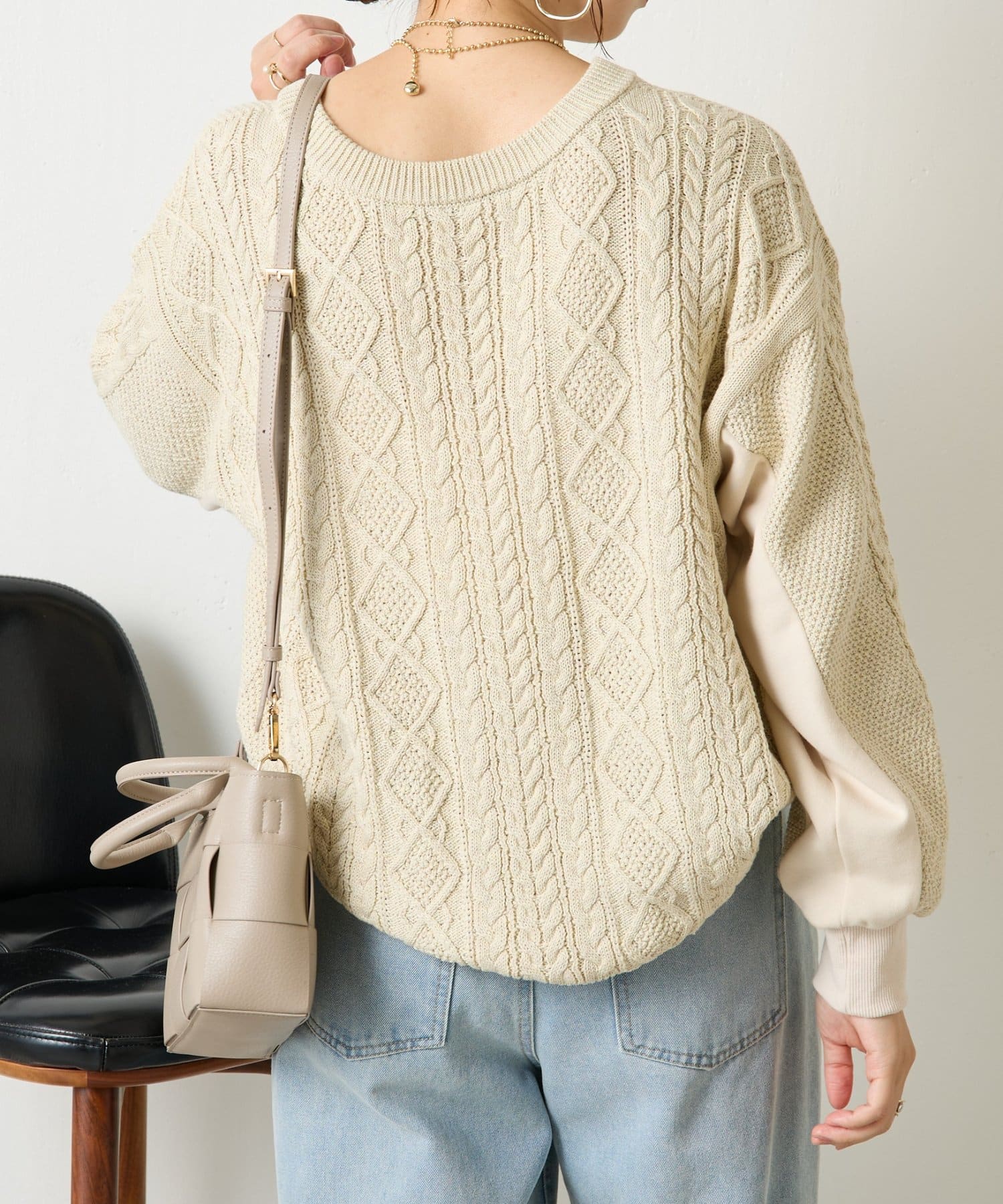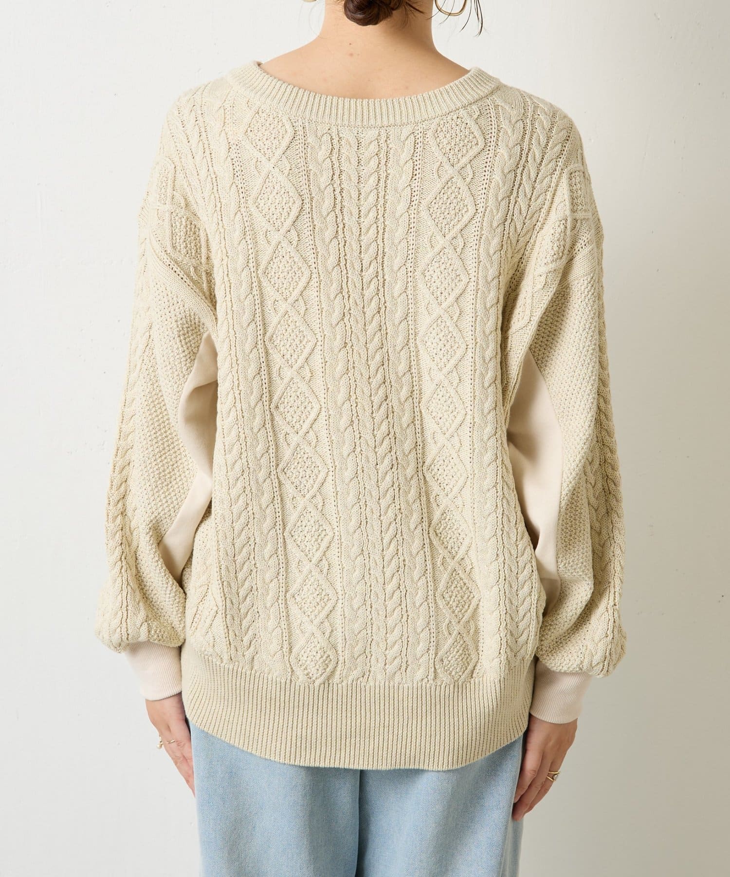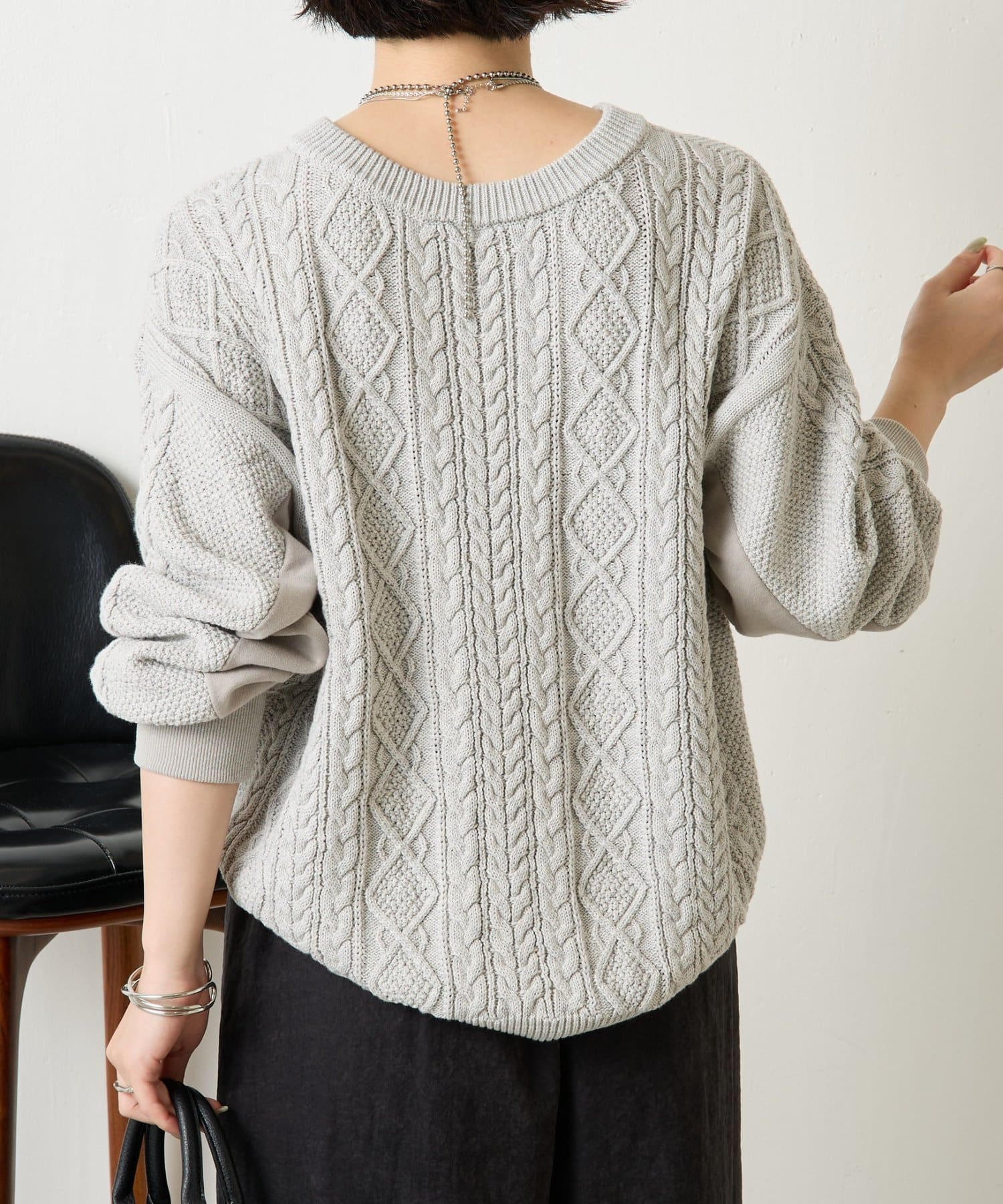 ・ケーブルニットとドッキングされた前後の大胆な切替が、他にはない一枚。