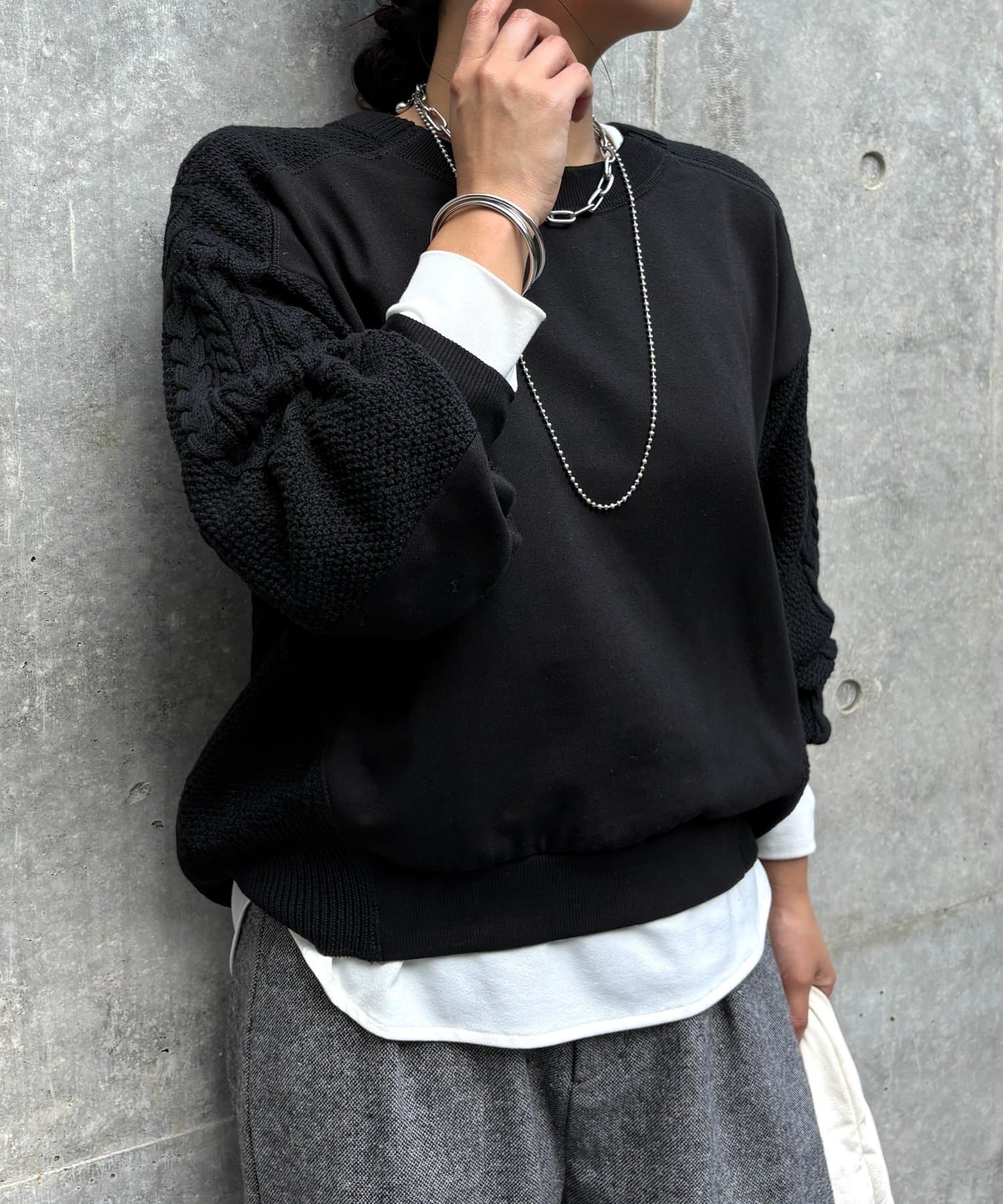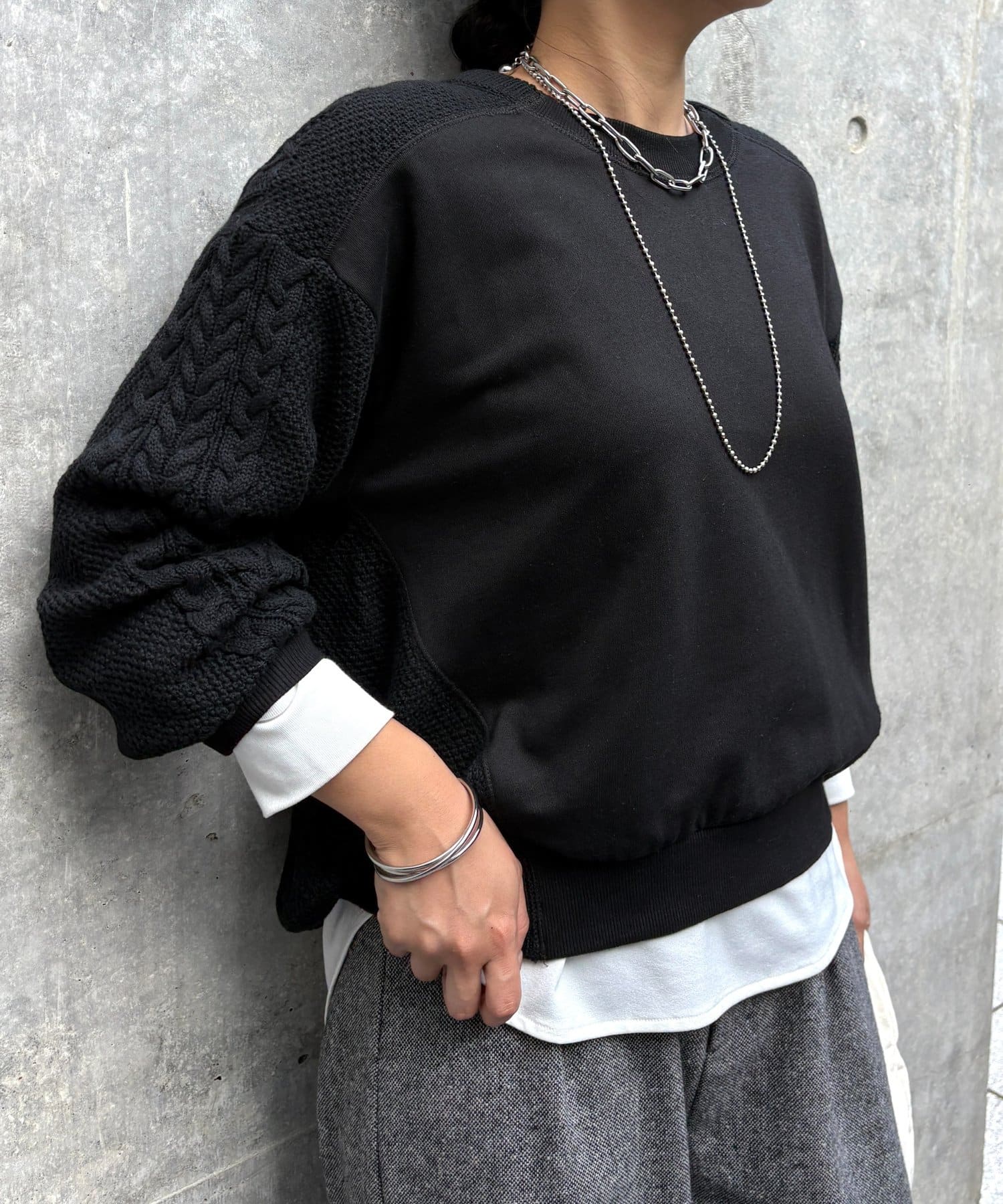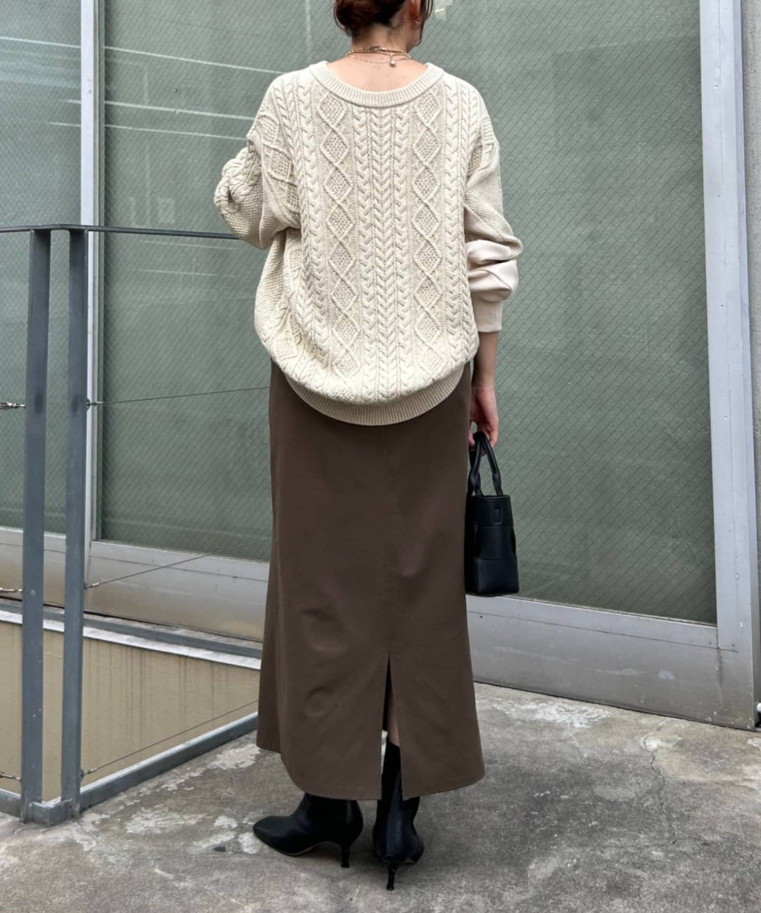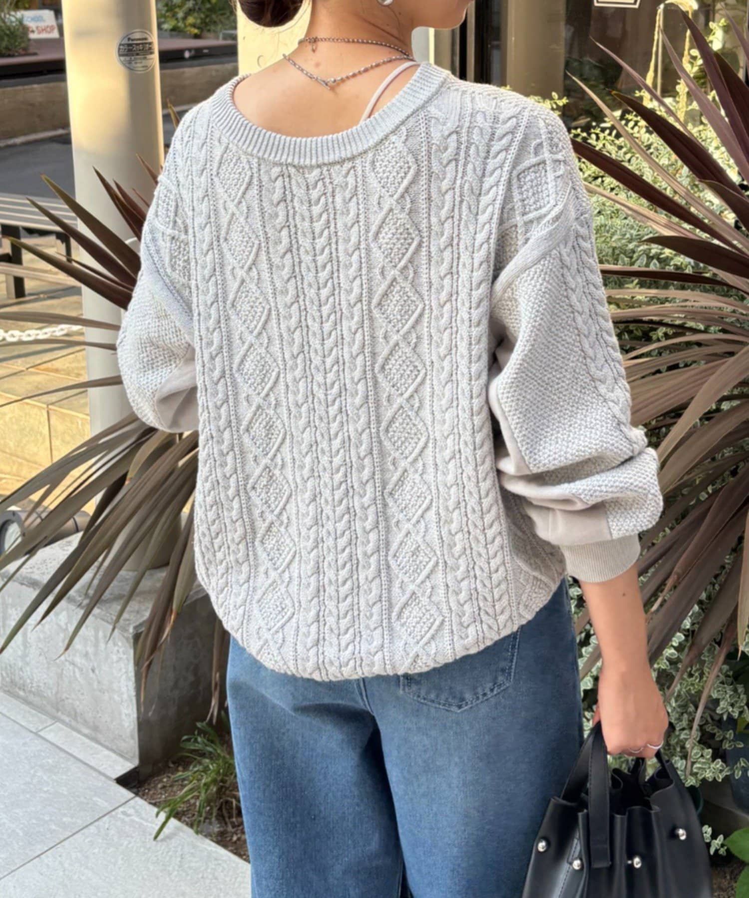 ・ケーブルニットとドッキングされた前後の大胆な切替が、他にはない一枚。