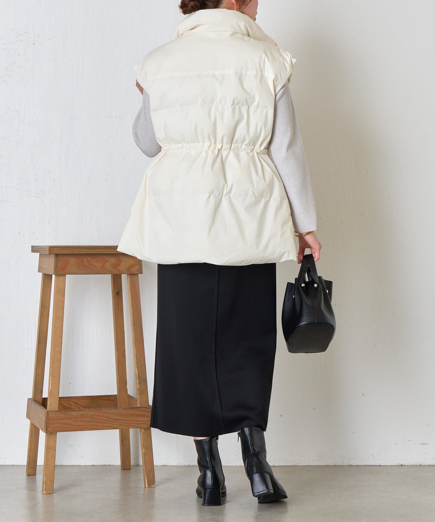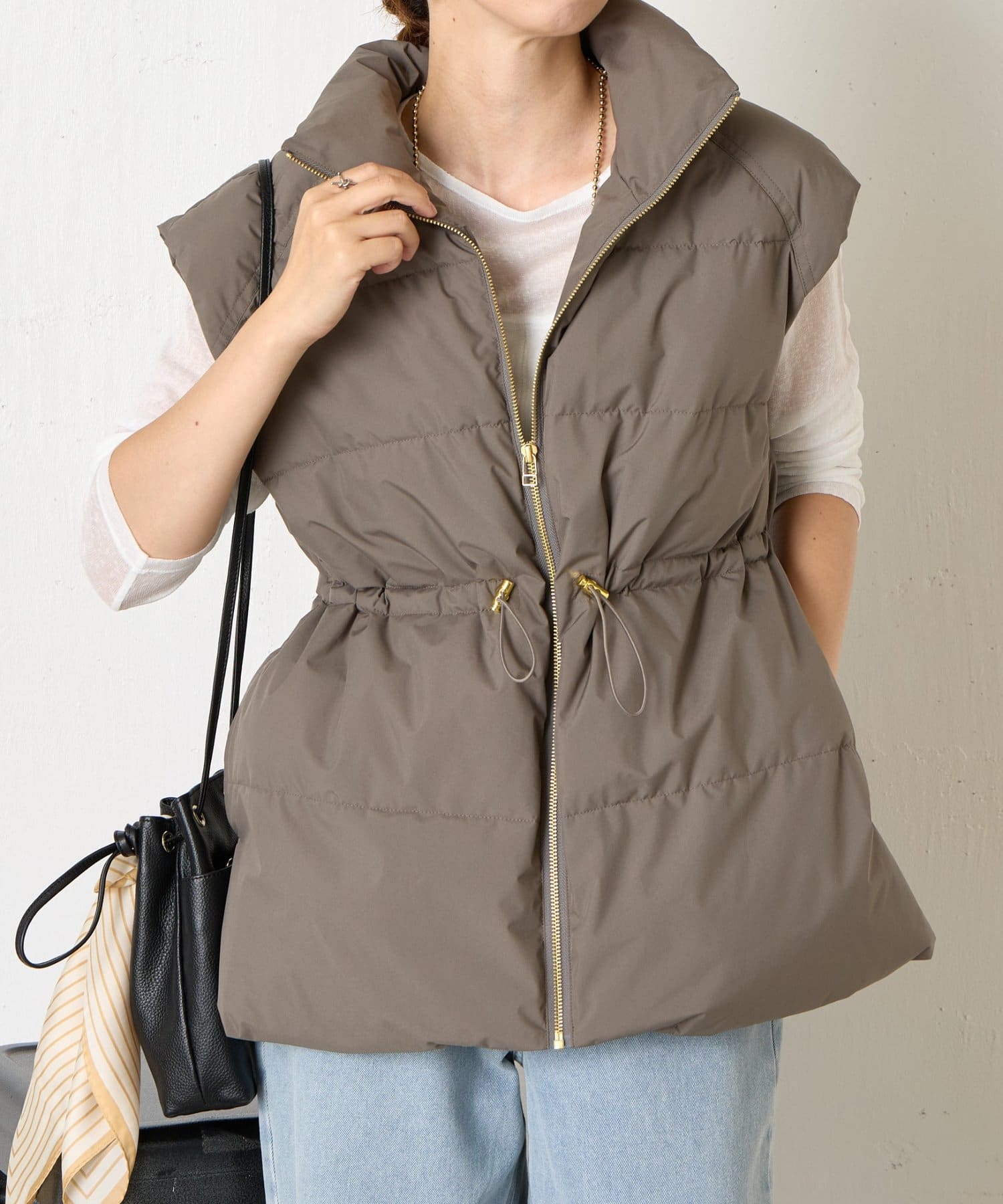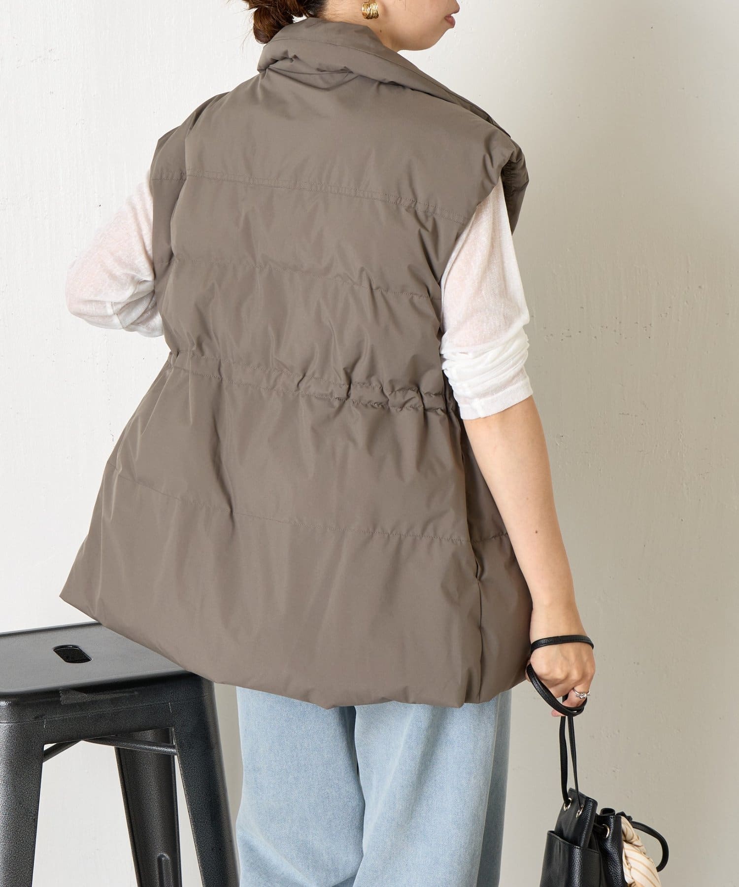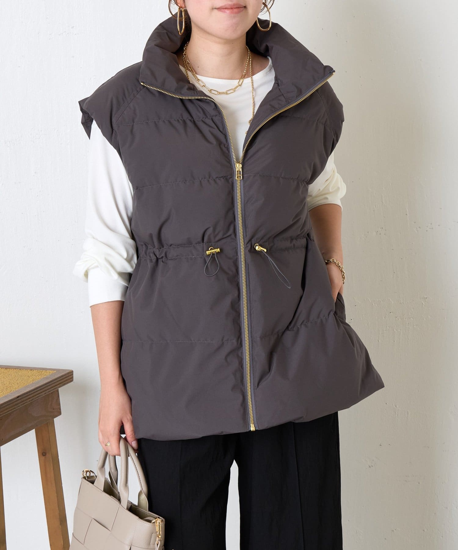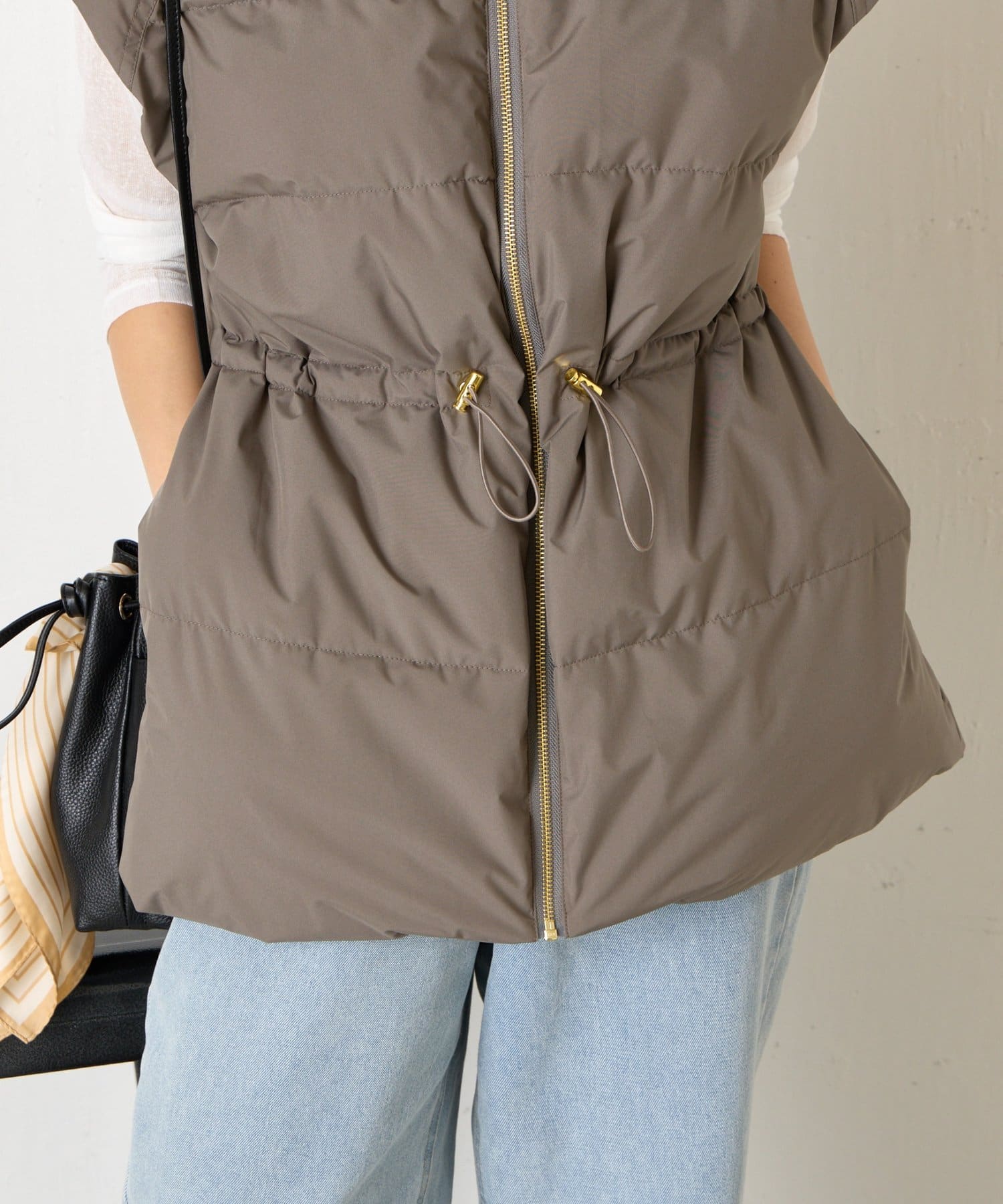 ・ウエストに施されたドロストデザインがポイントのトレンド感あふれる中綿ベスト。