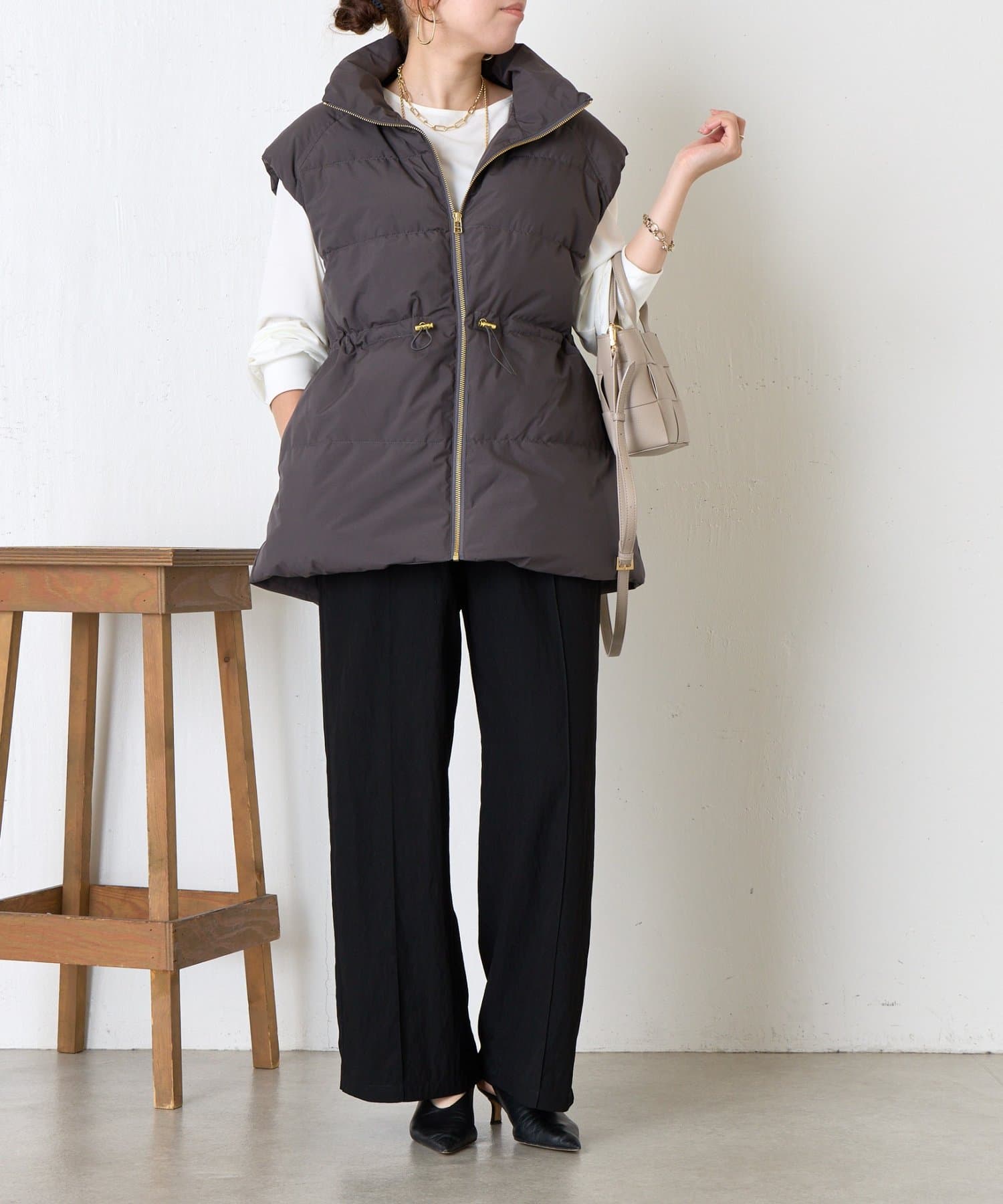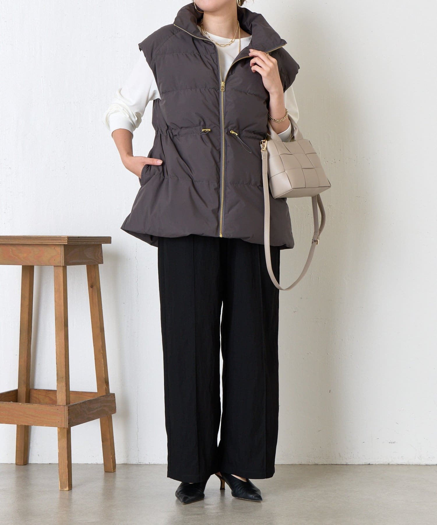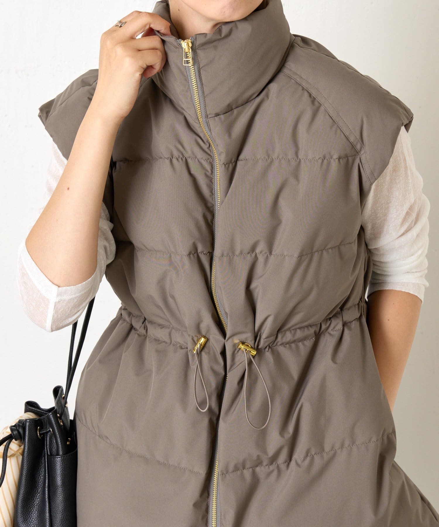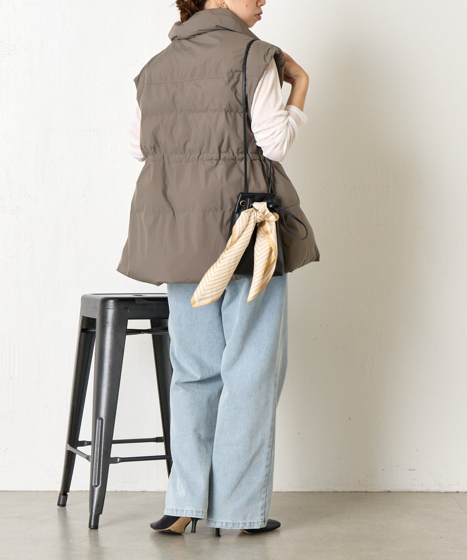 ・ウエストに施されたドロストデザインがポイントのトレンド感あふれる中綿ベスト。