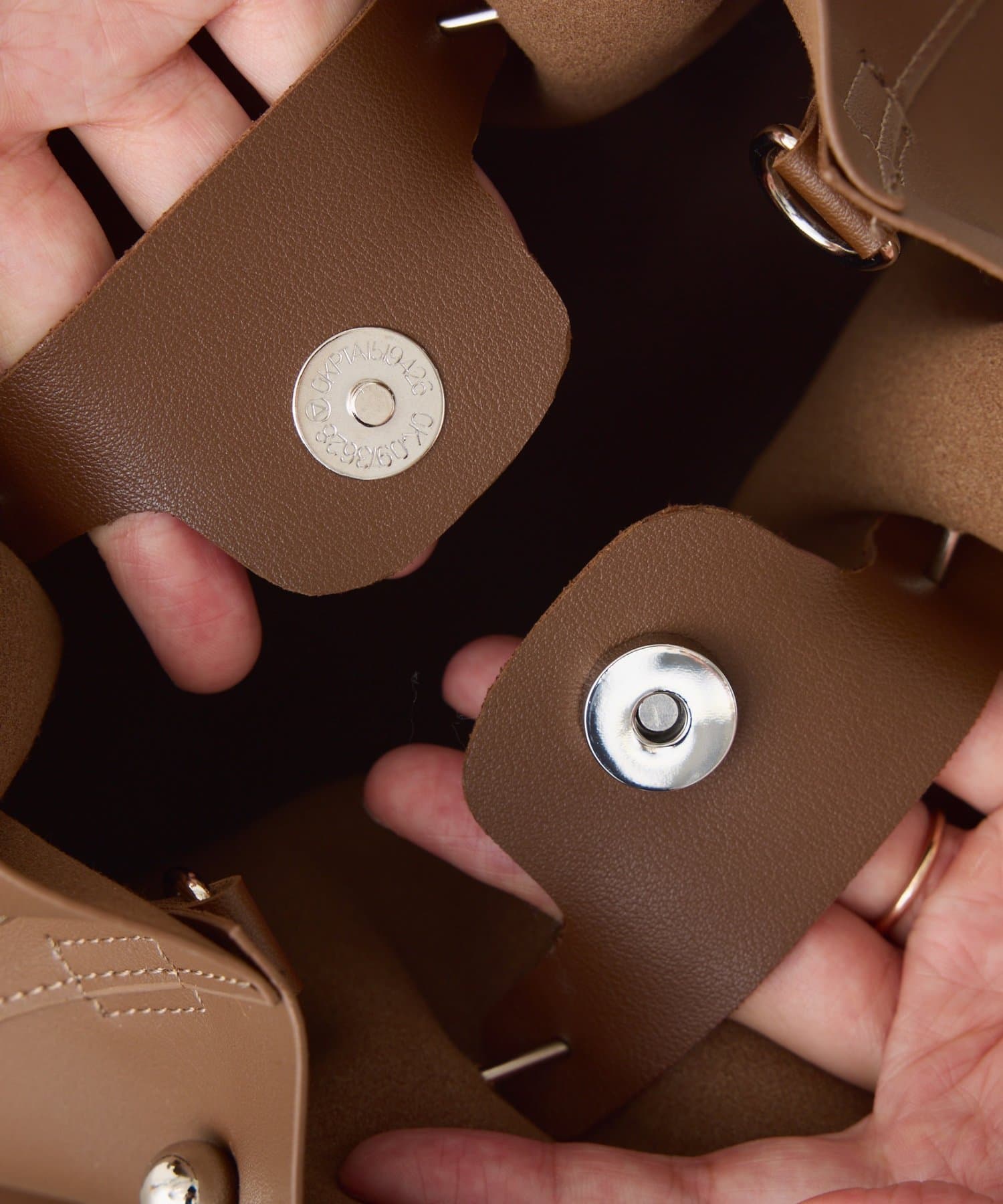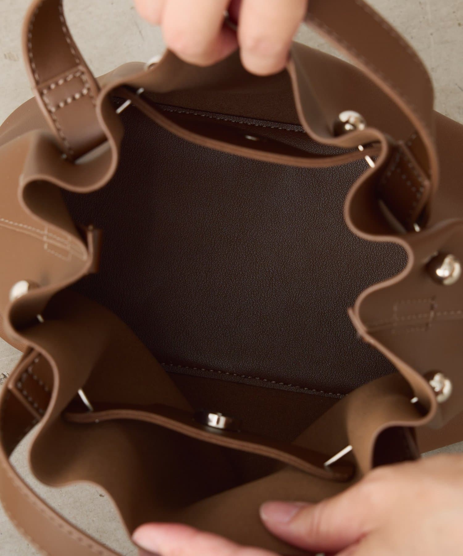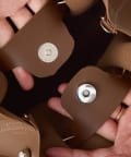 ・口元は巾着風のデザインで中身が見えにくく、内側にボタンがあるので防犯面でも安心のデザイン。