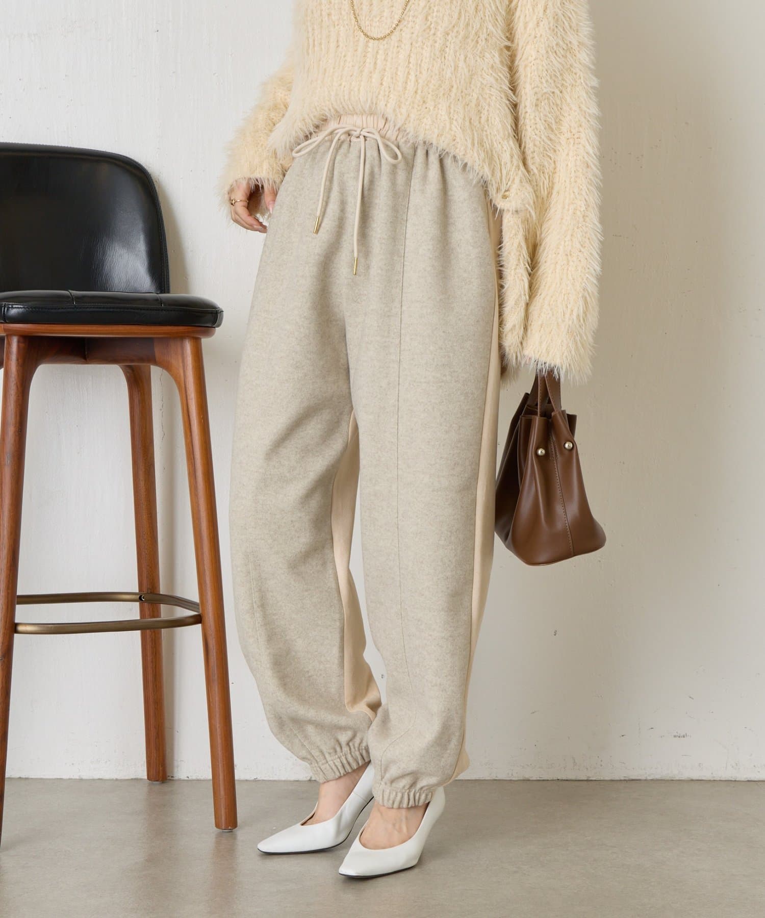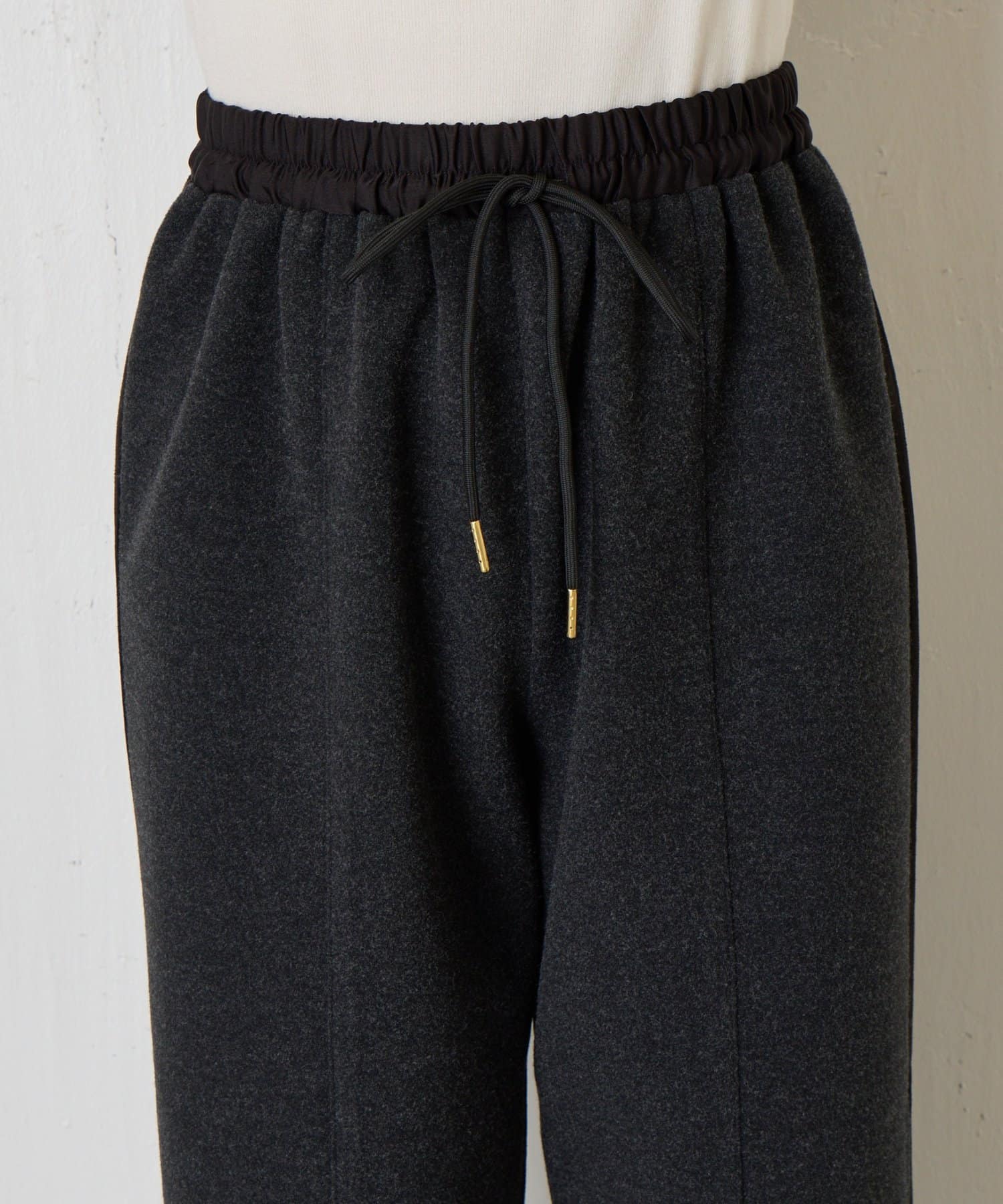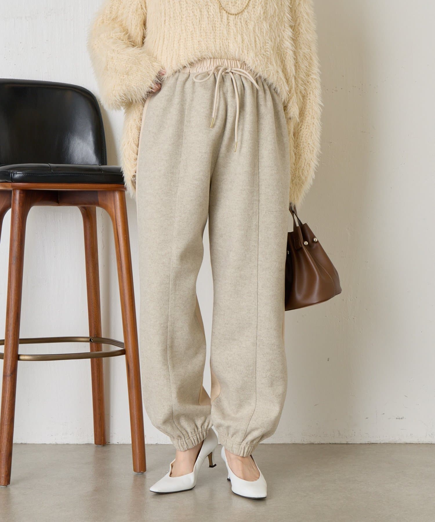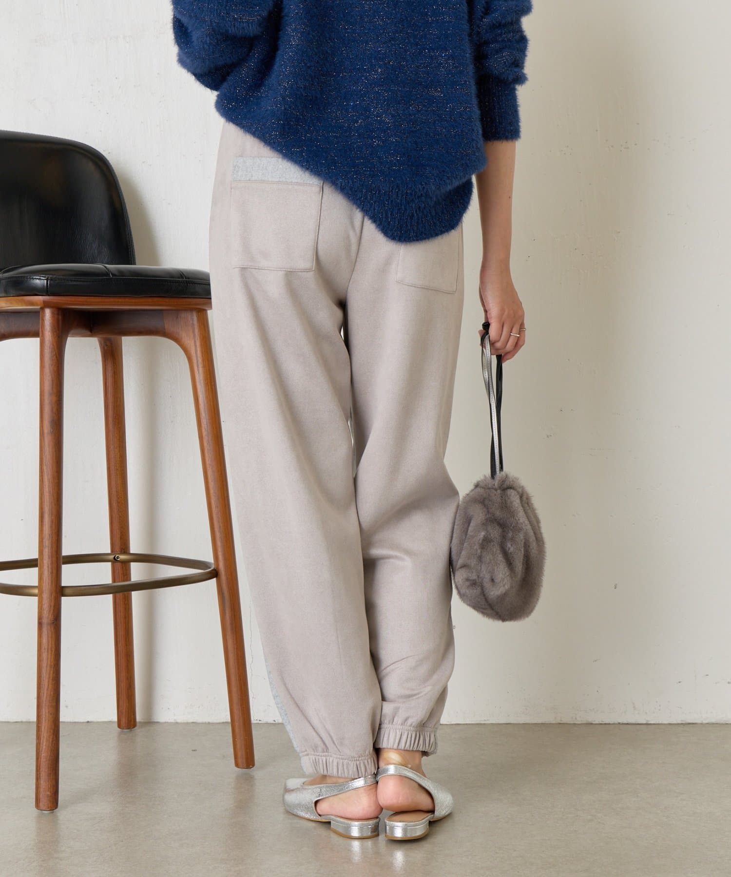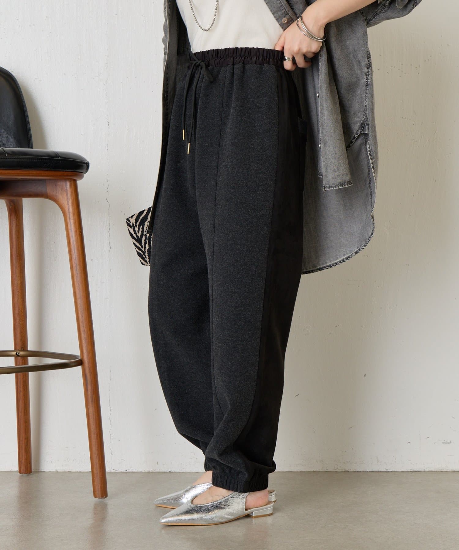 ・表地には暖かみのあるのメルトン生地を使用し、裏面には滑らかなスエード生地を使用した切替デザインのジョガーパンツ。