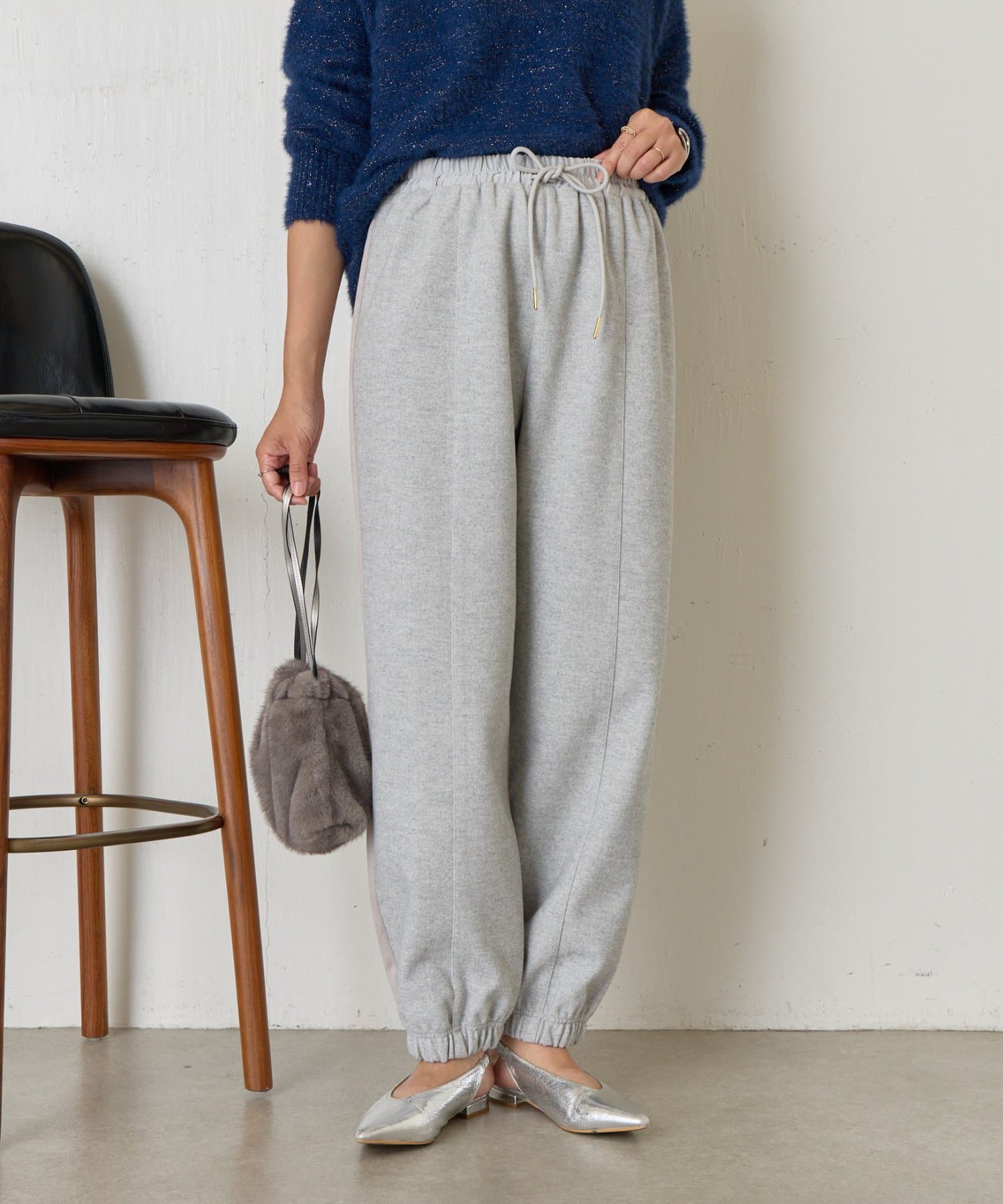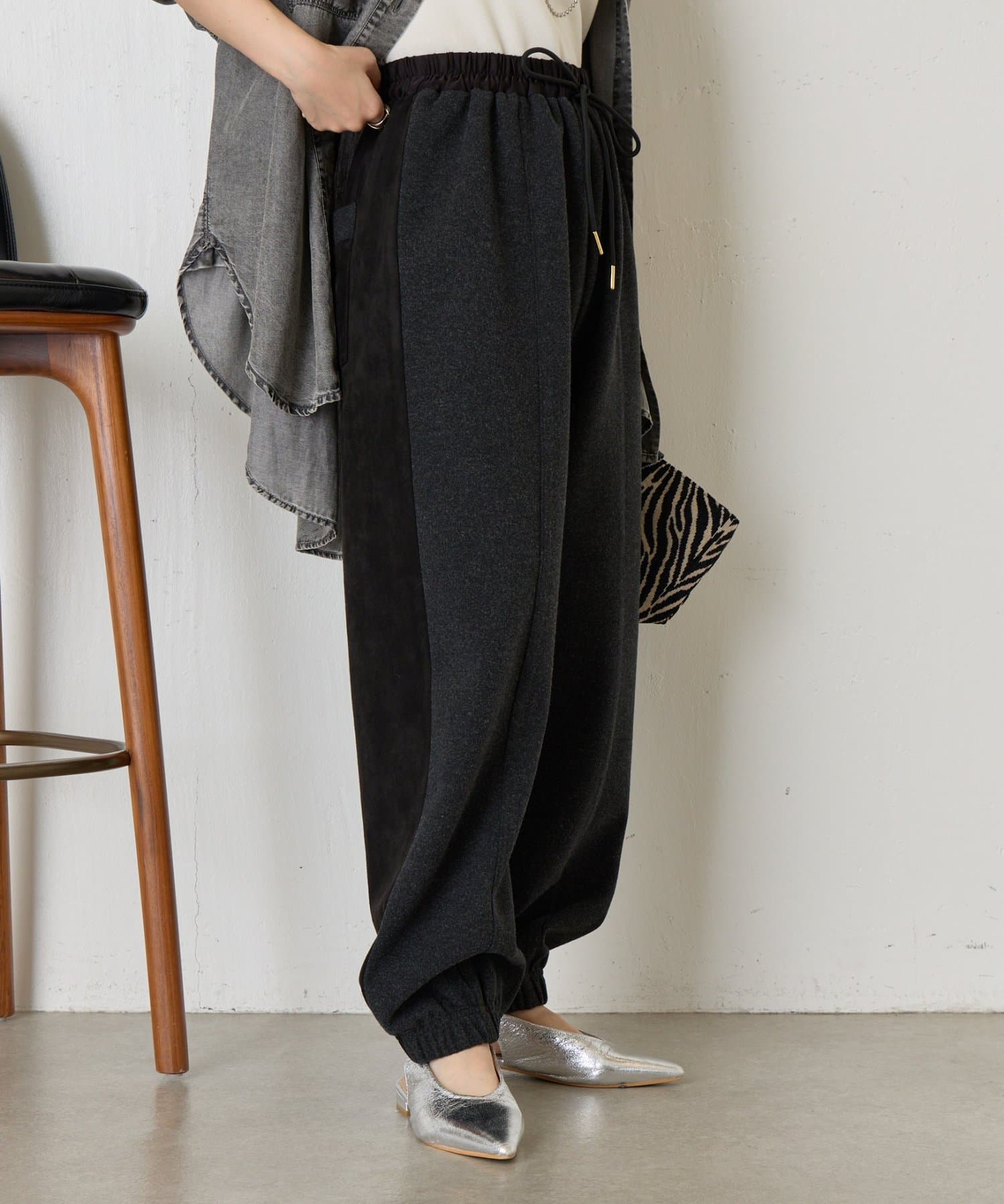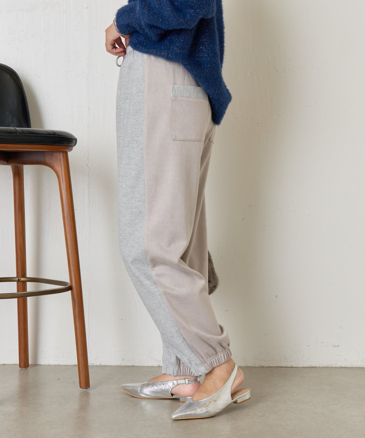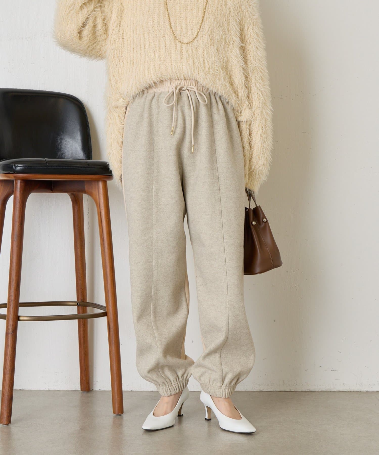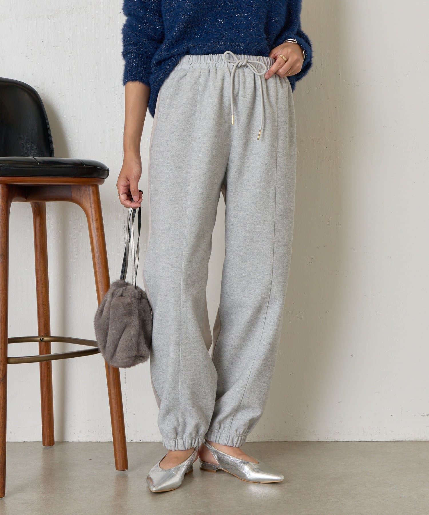 ・表地には暖かみのあるのメルトン生地を使用し、裏面には滑らかなスエード生地を使用した切替デザインのジョガーパンツ。