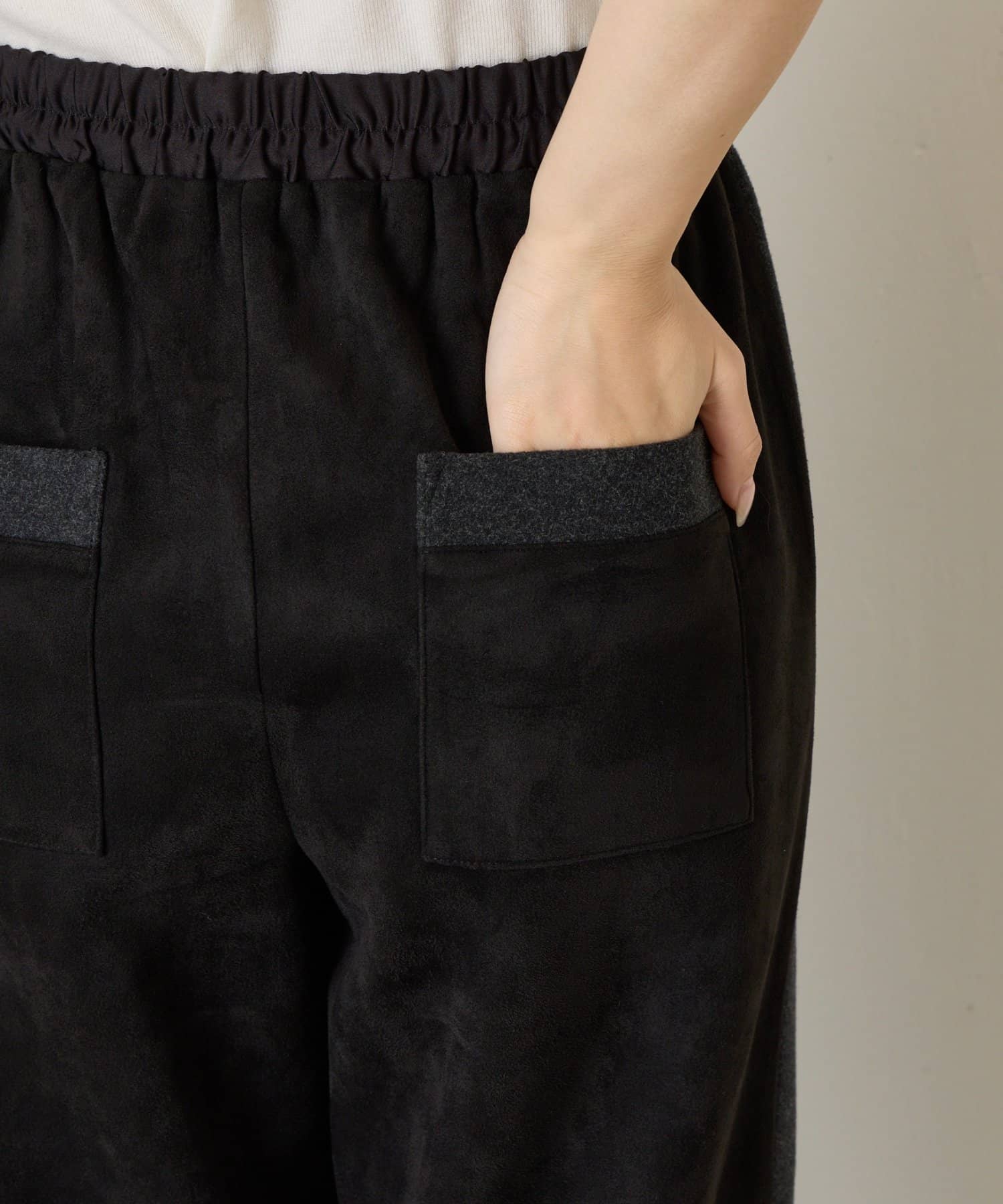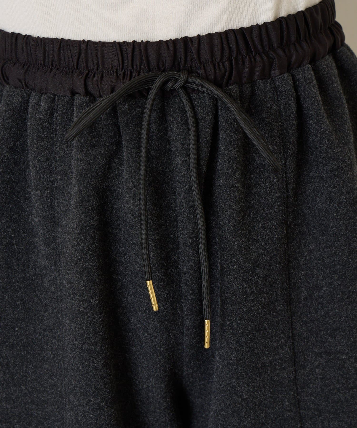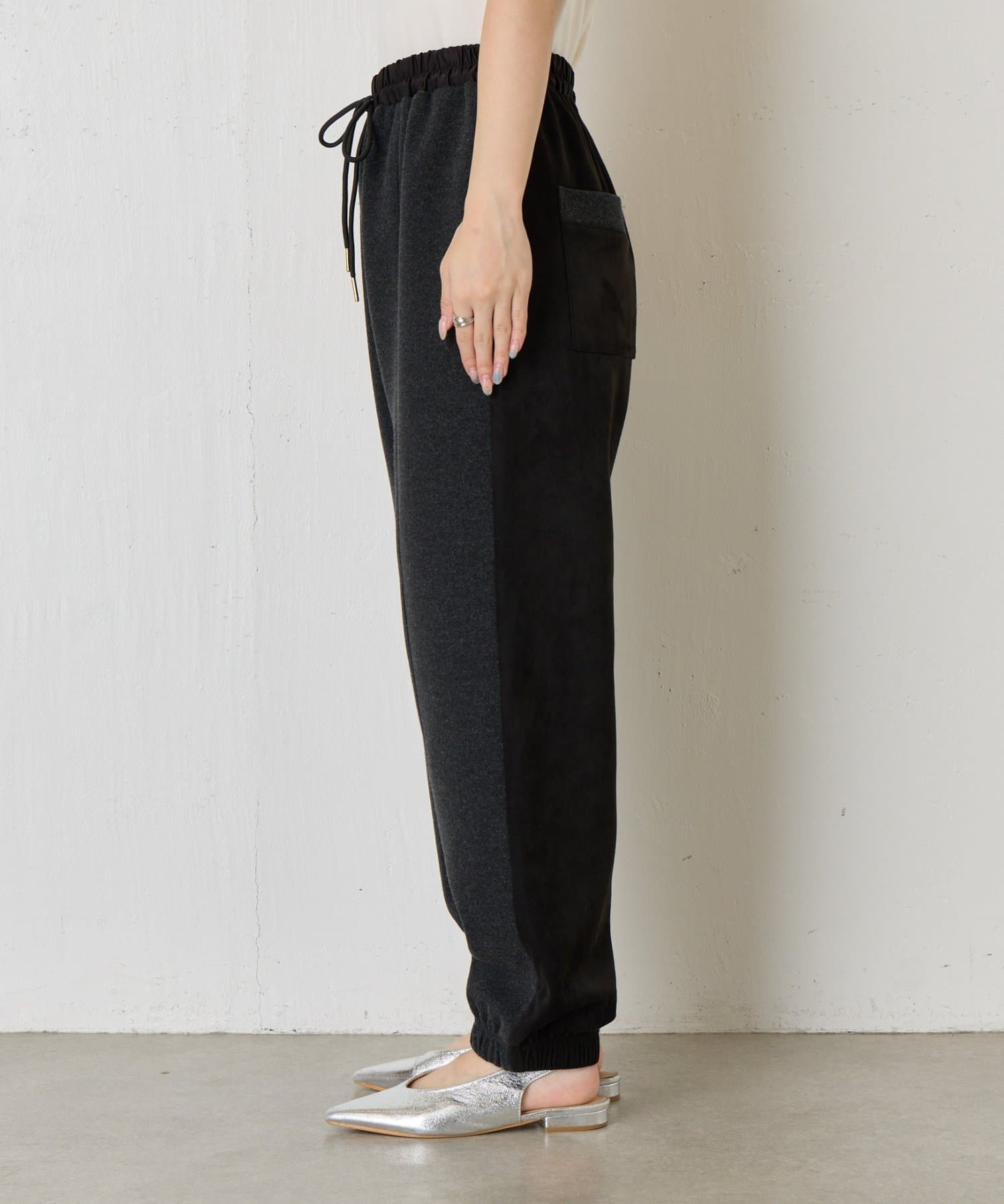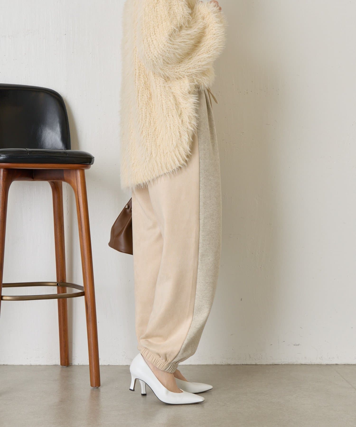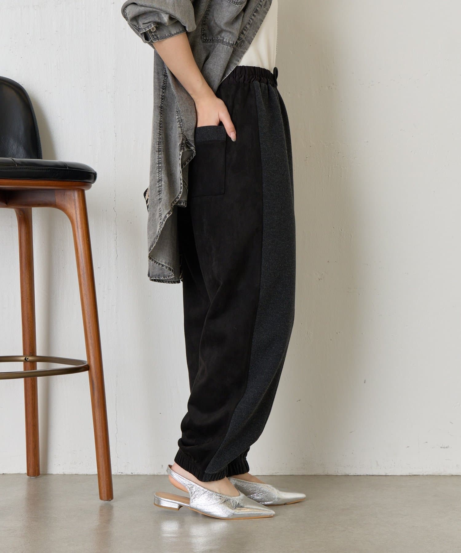 ・表地には暖かみのあるのメルトン生地を使用し、裏面には滑らかなスエード生地を使用した切替デザインのジョガーパンツ。