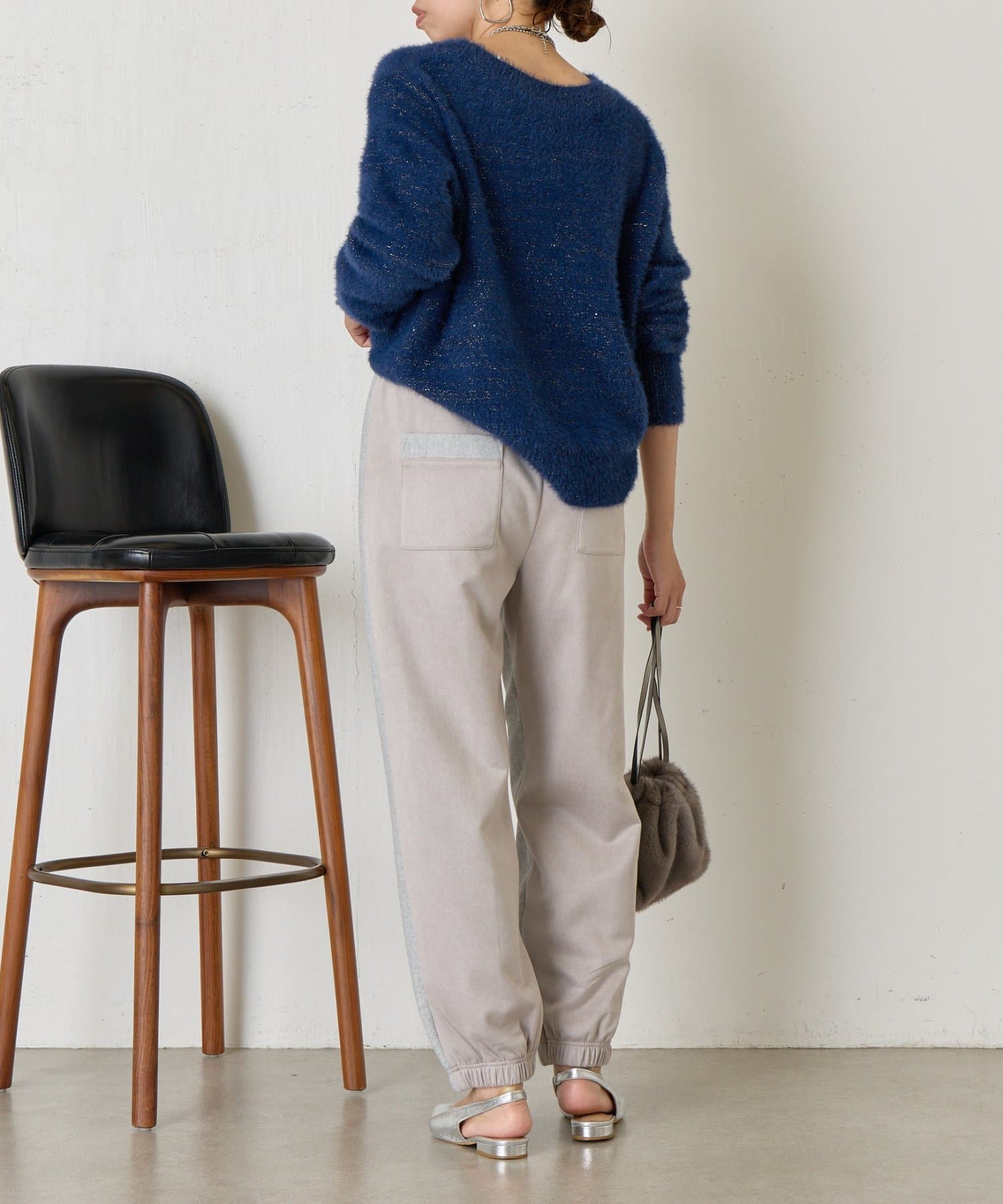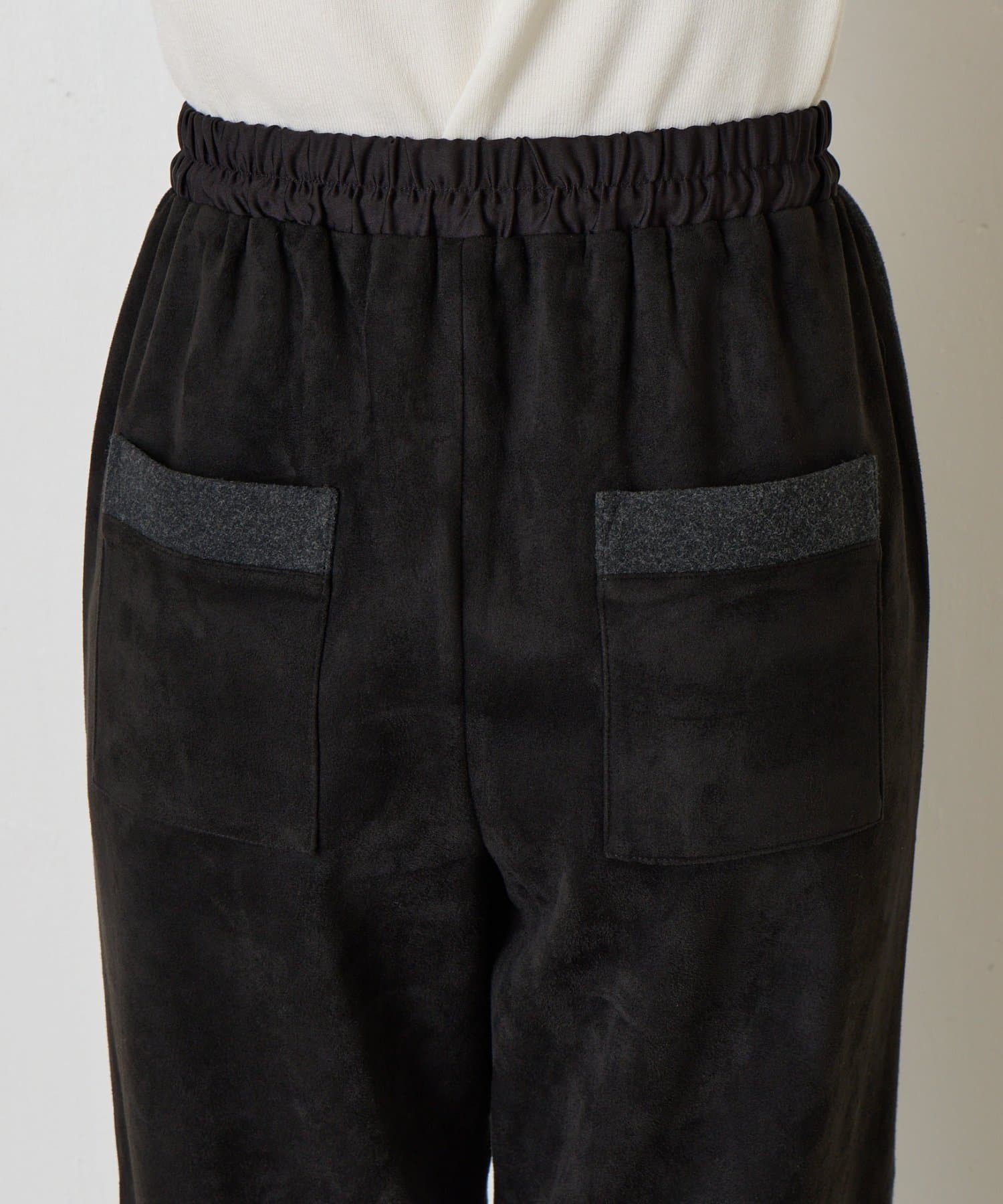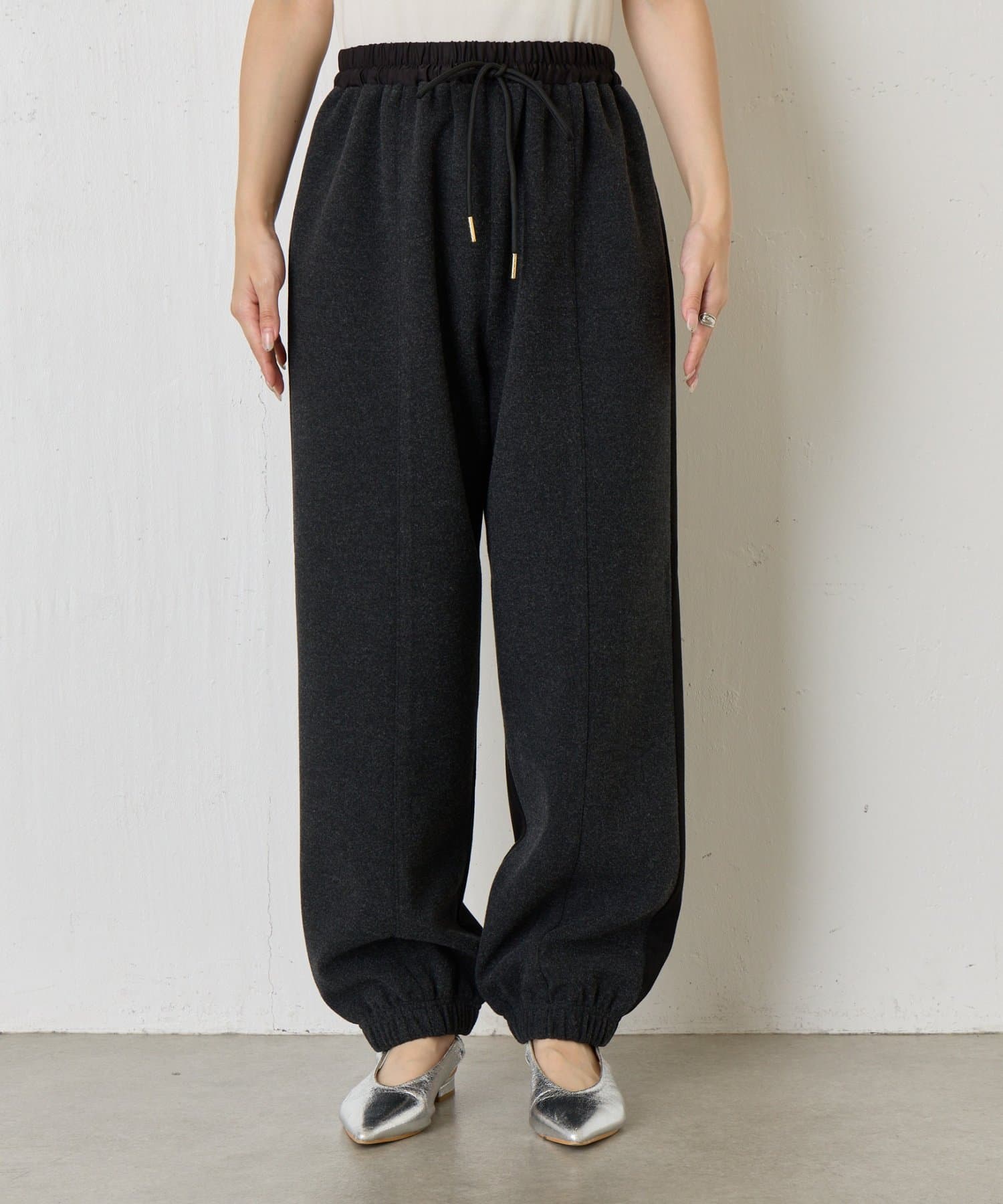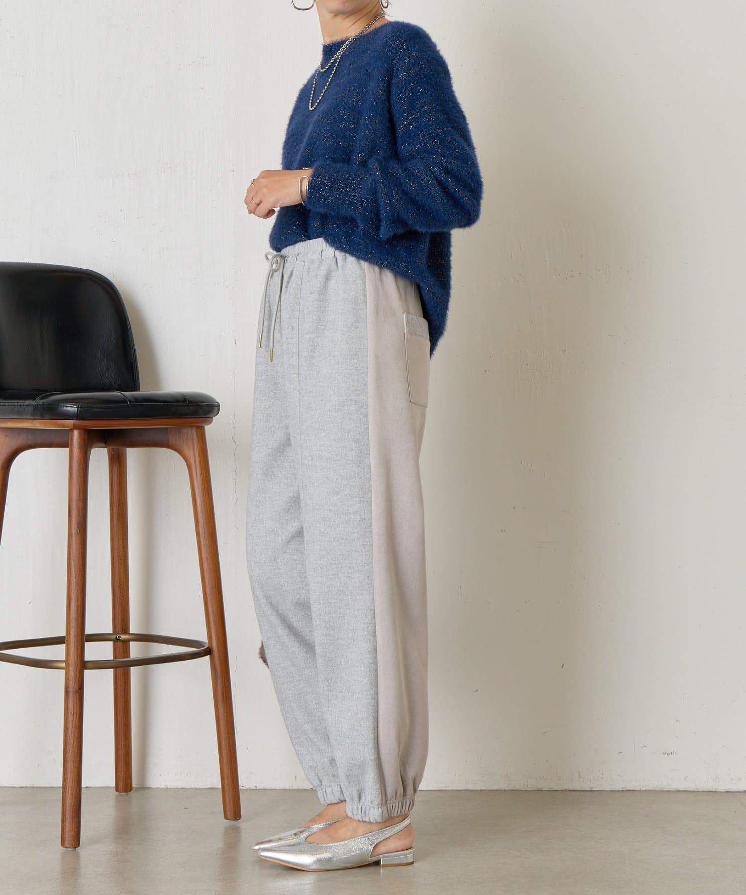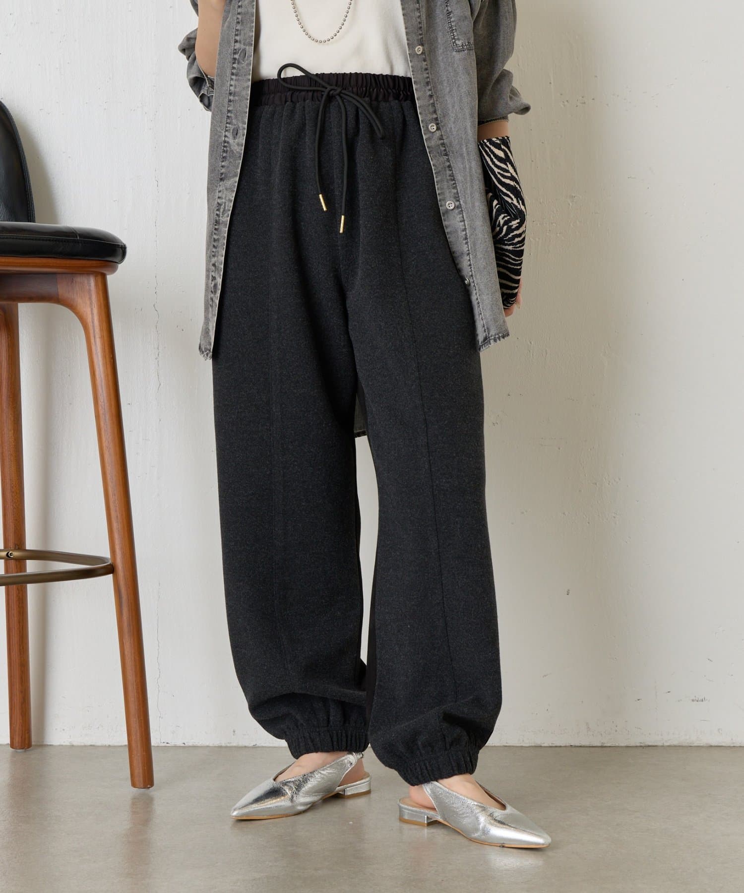 ・表地には暖かみのあるのメルトン生地を使用し、裏面には滑らかなスエード生地を使用した切替デザインのジョガーパンツ。