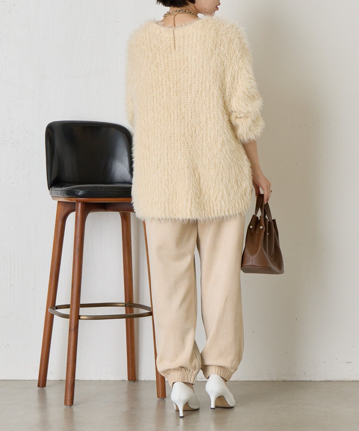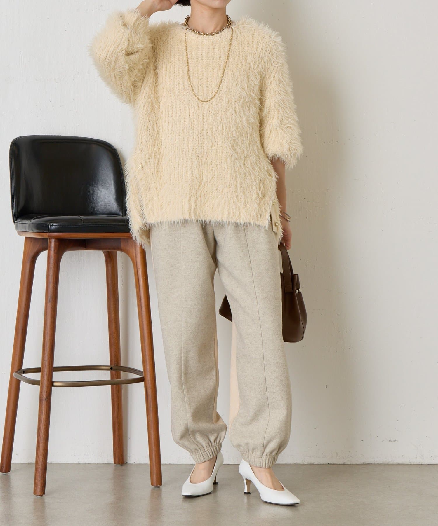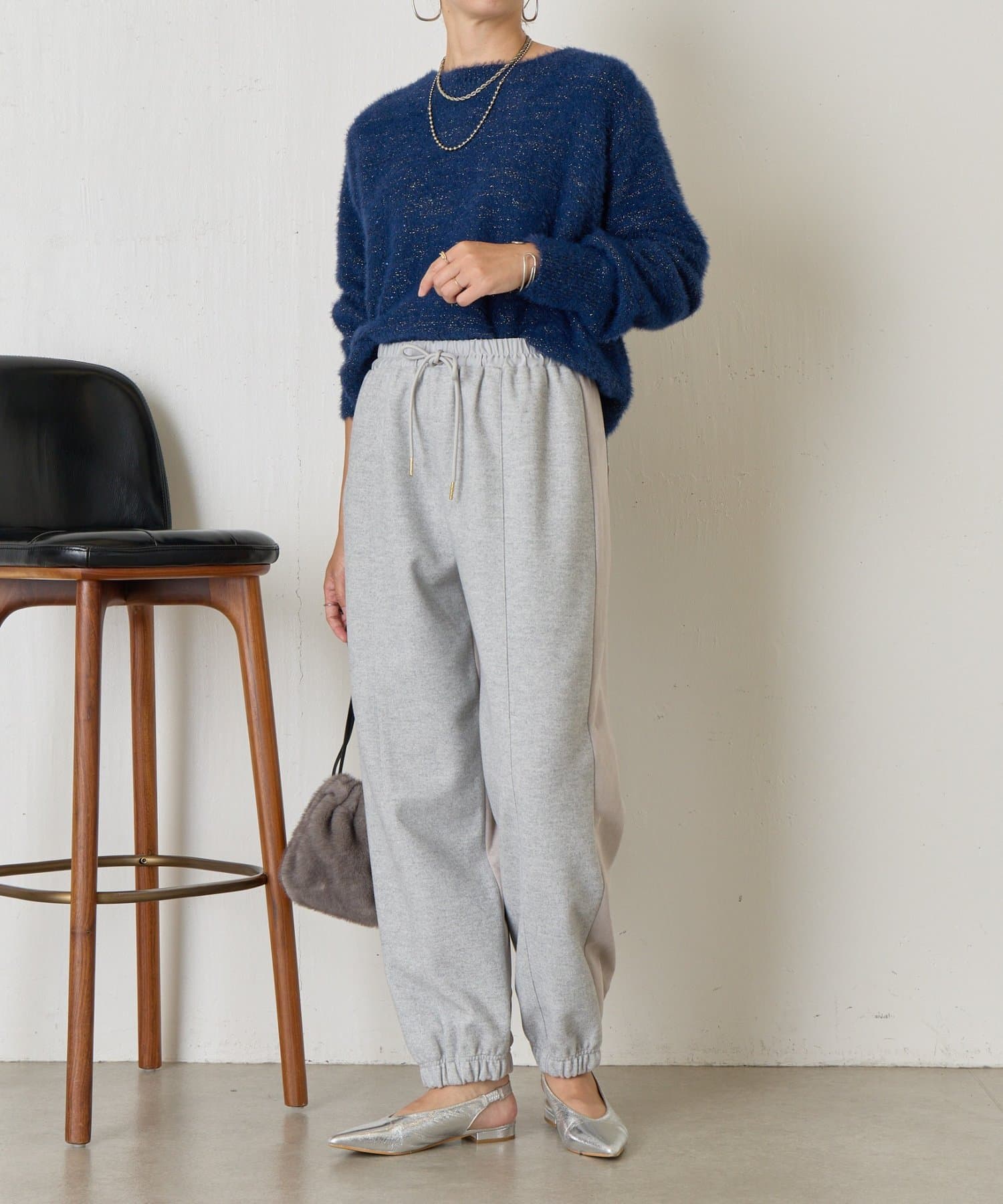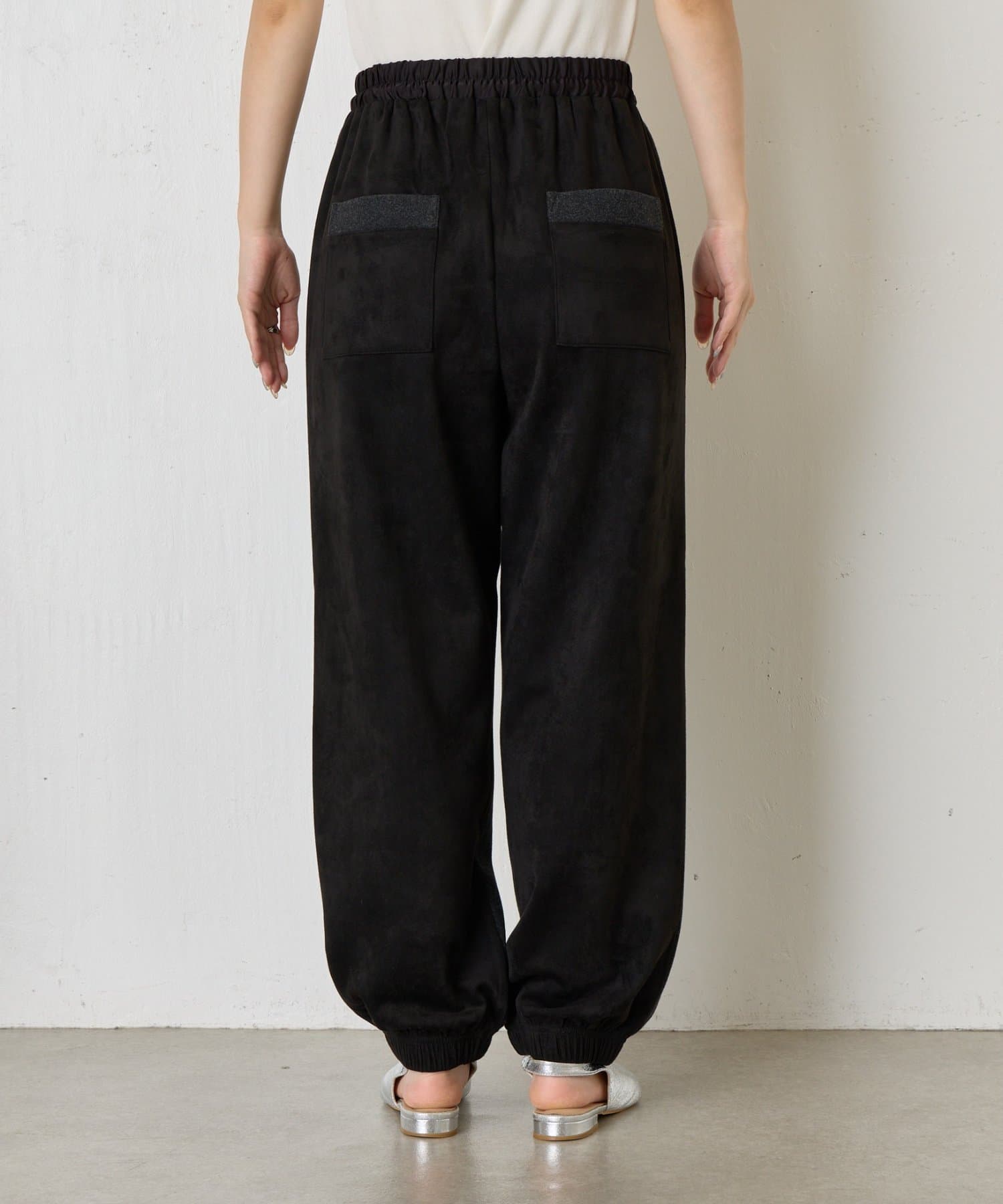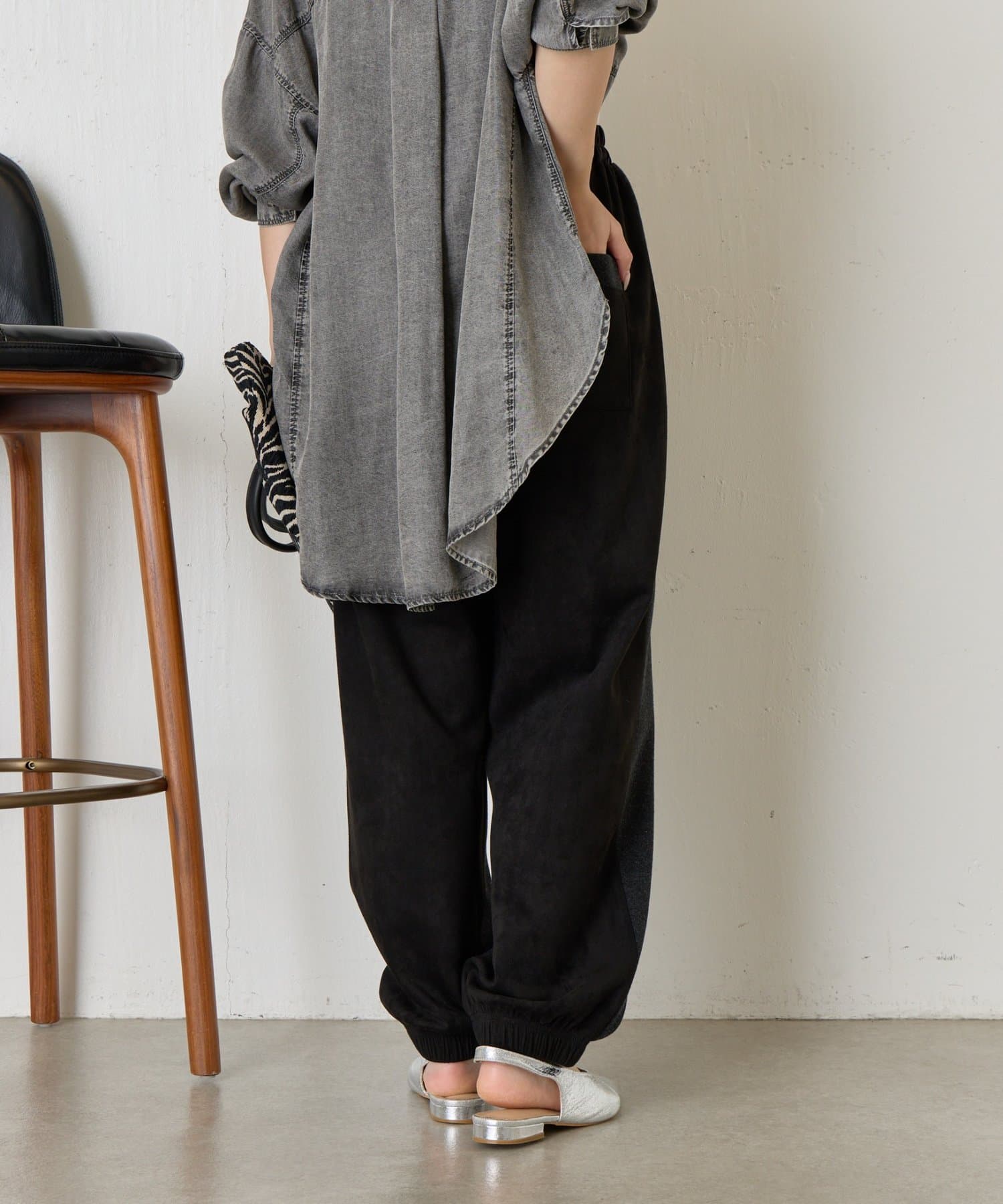 ・表地には暖かみのあるのメルトン生地を使用し、裏面には滑らかなスエード生地を使用した切替デザインのジョガーパンツ。