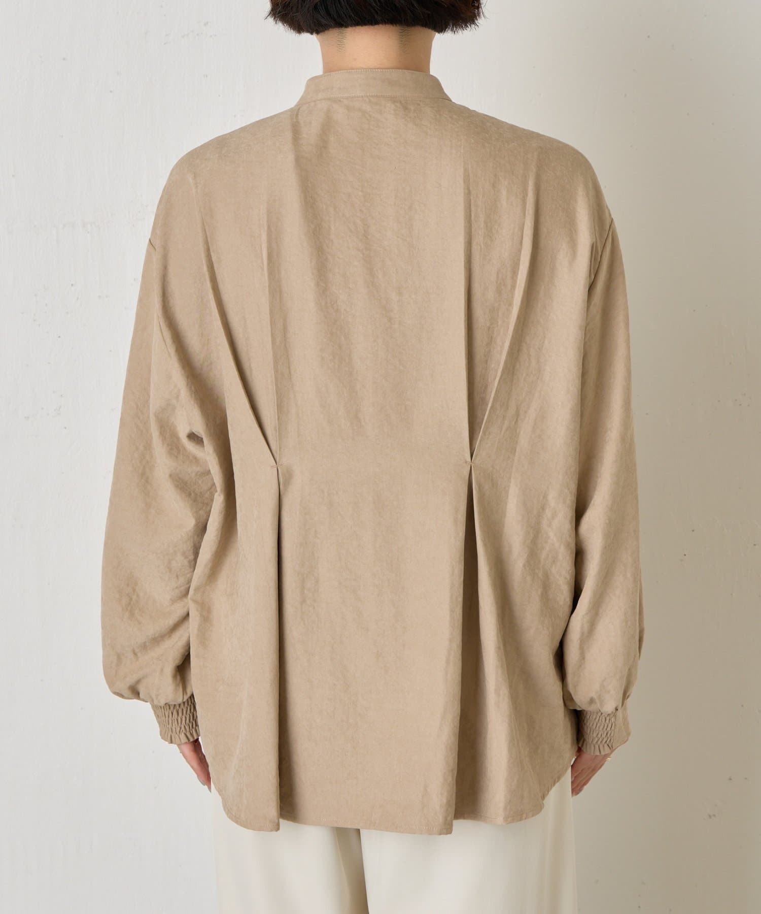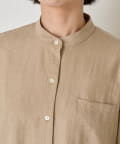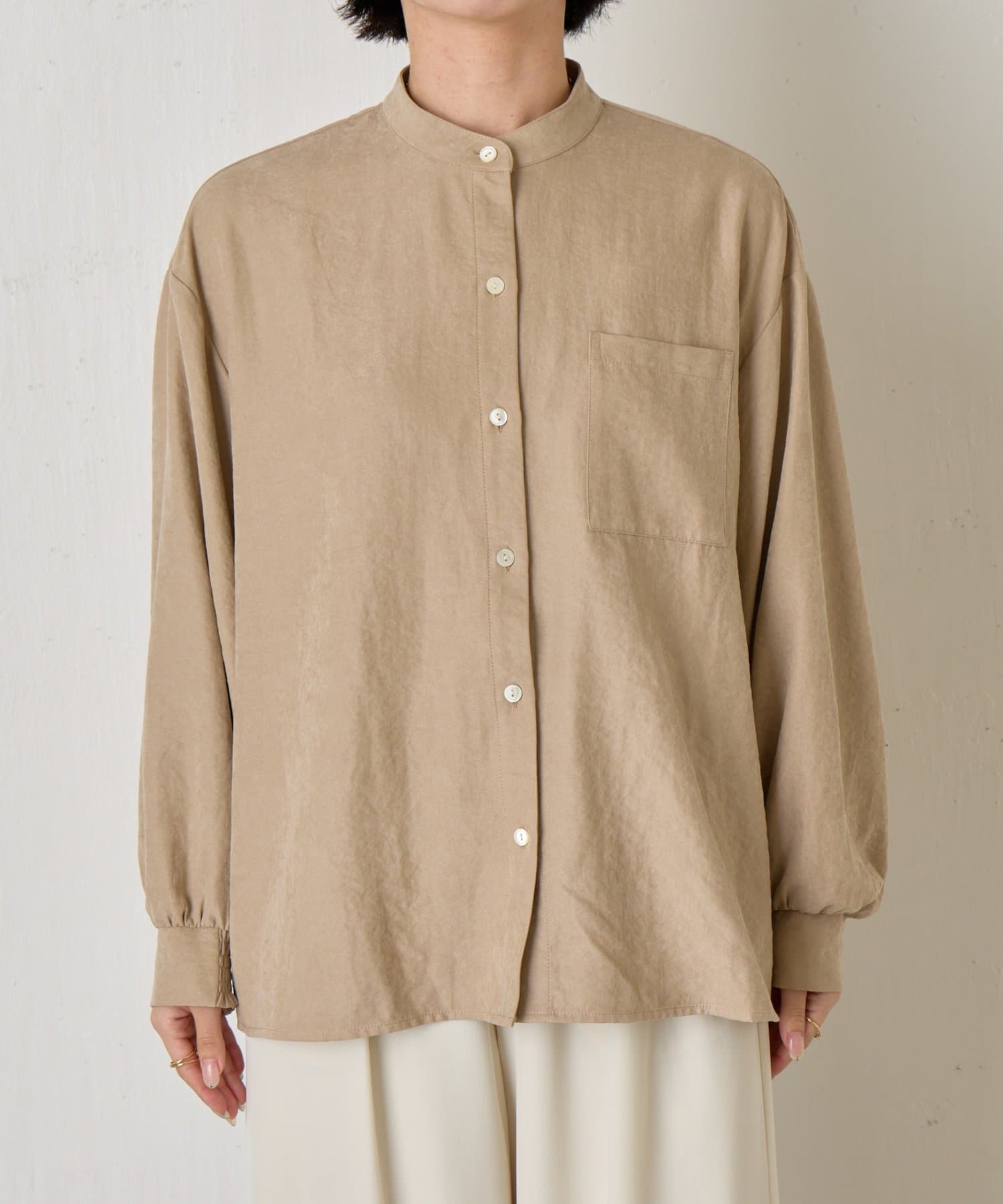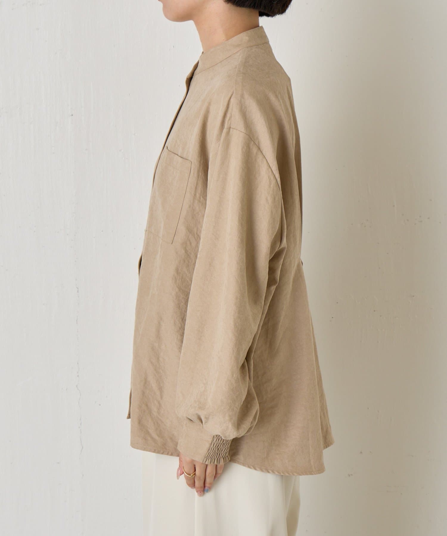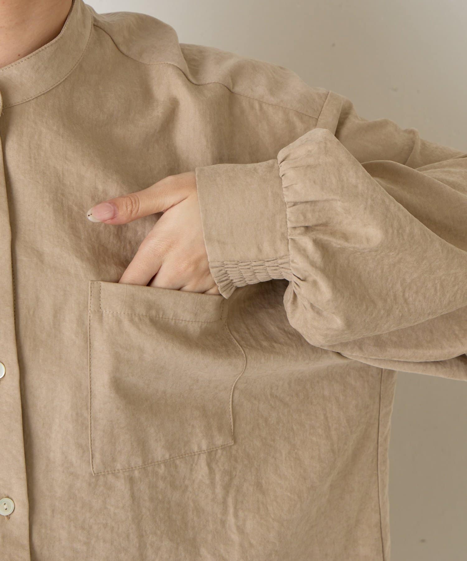 ・柔らかなスエード生地を使用し、上質な雰囲気を演出するスタンドカラーシャツ。