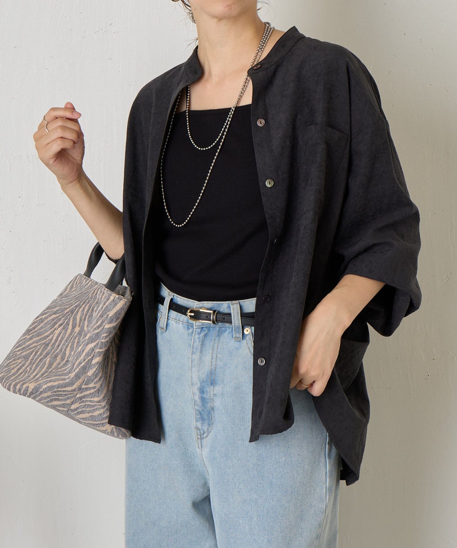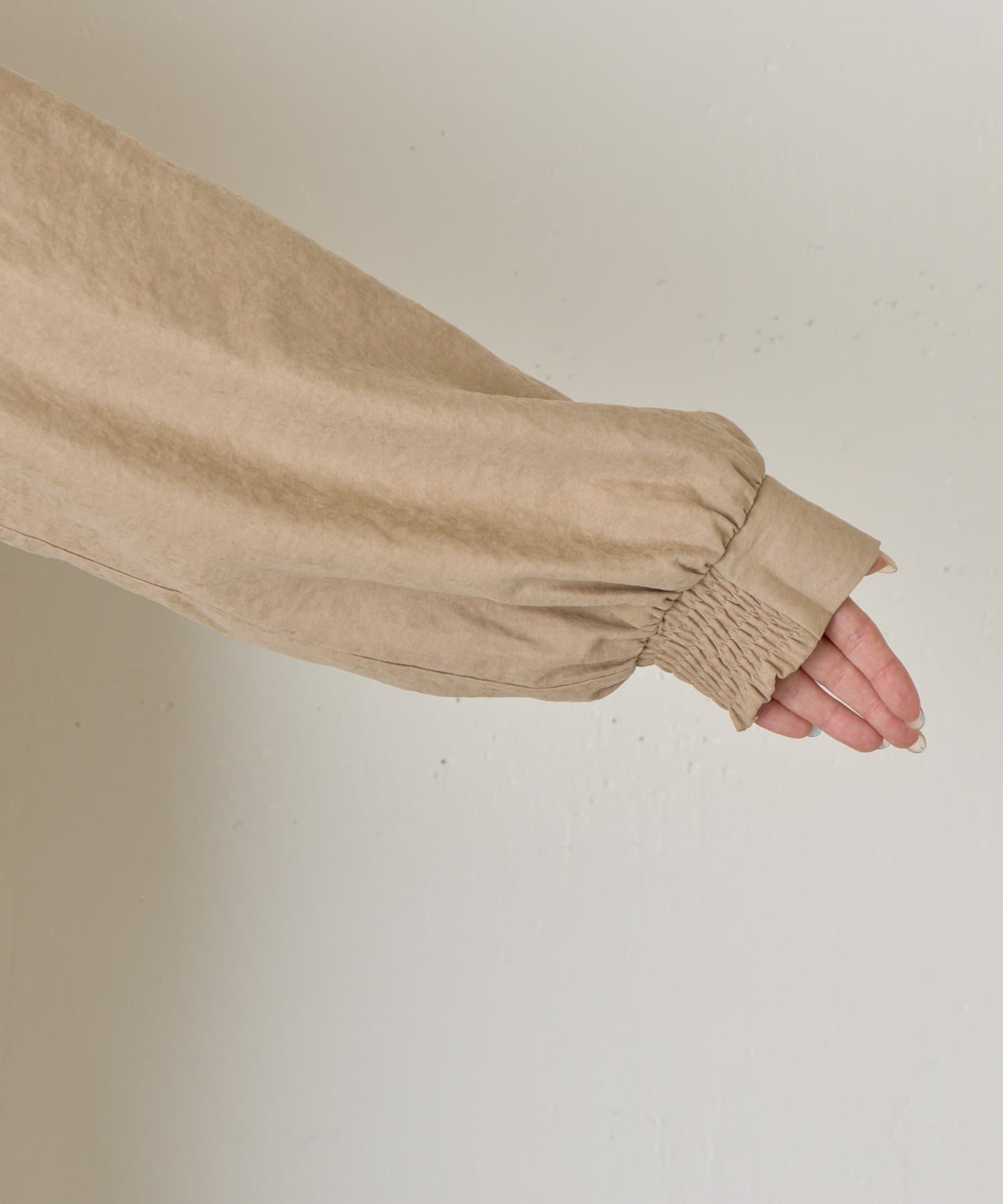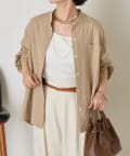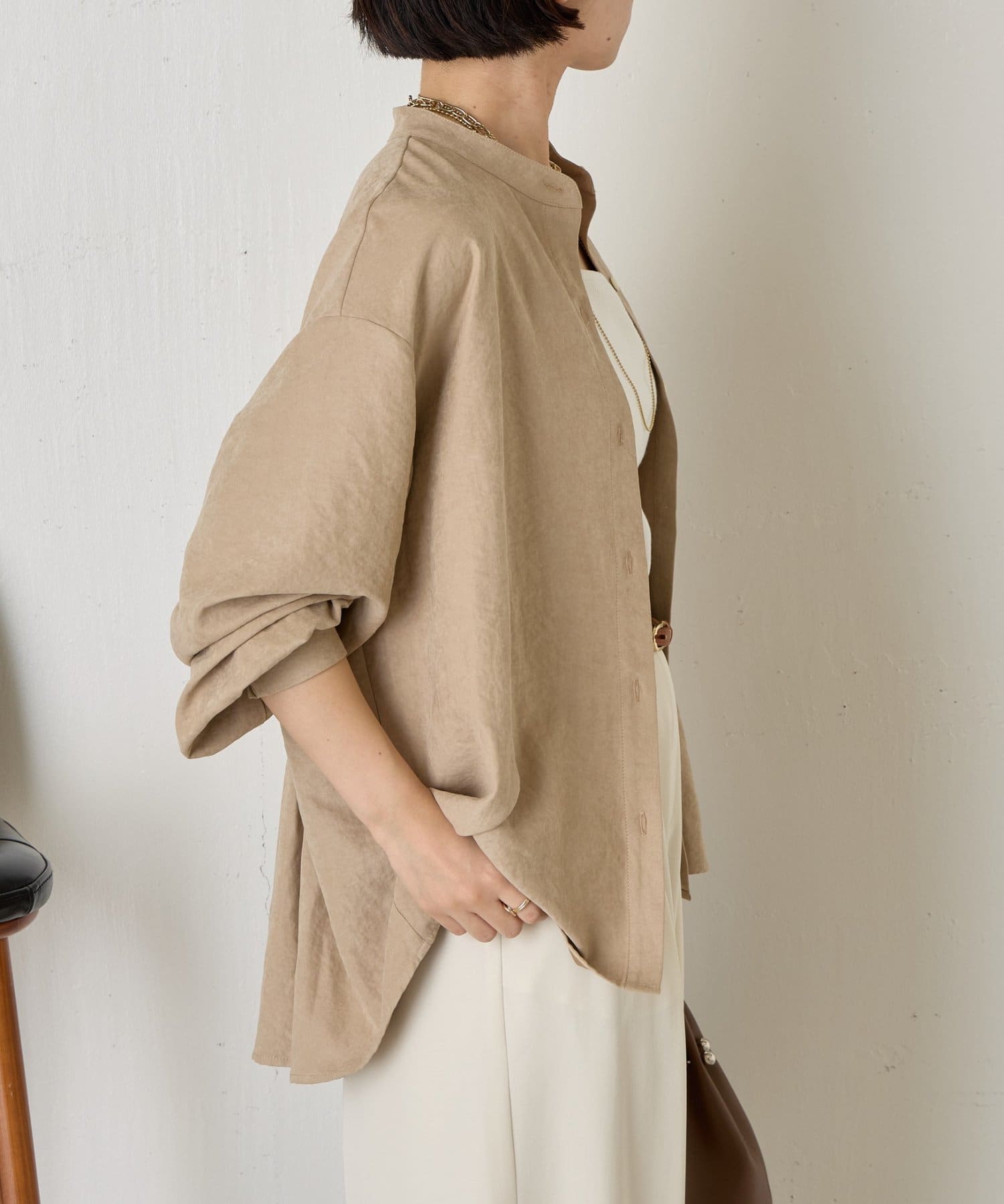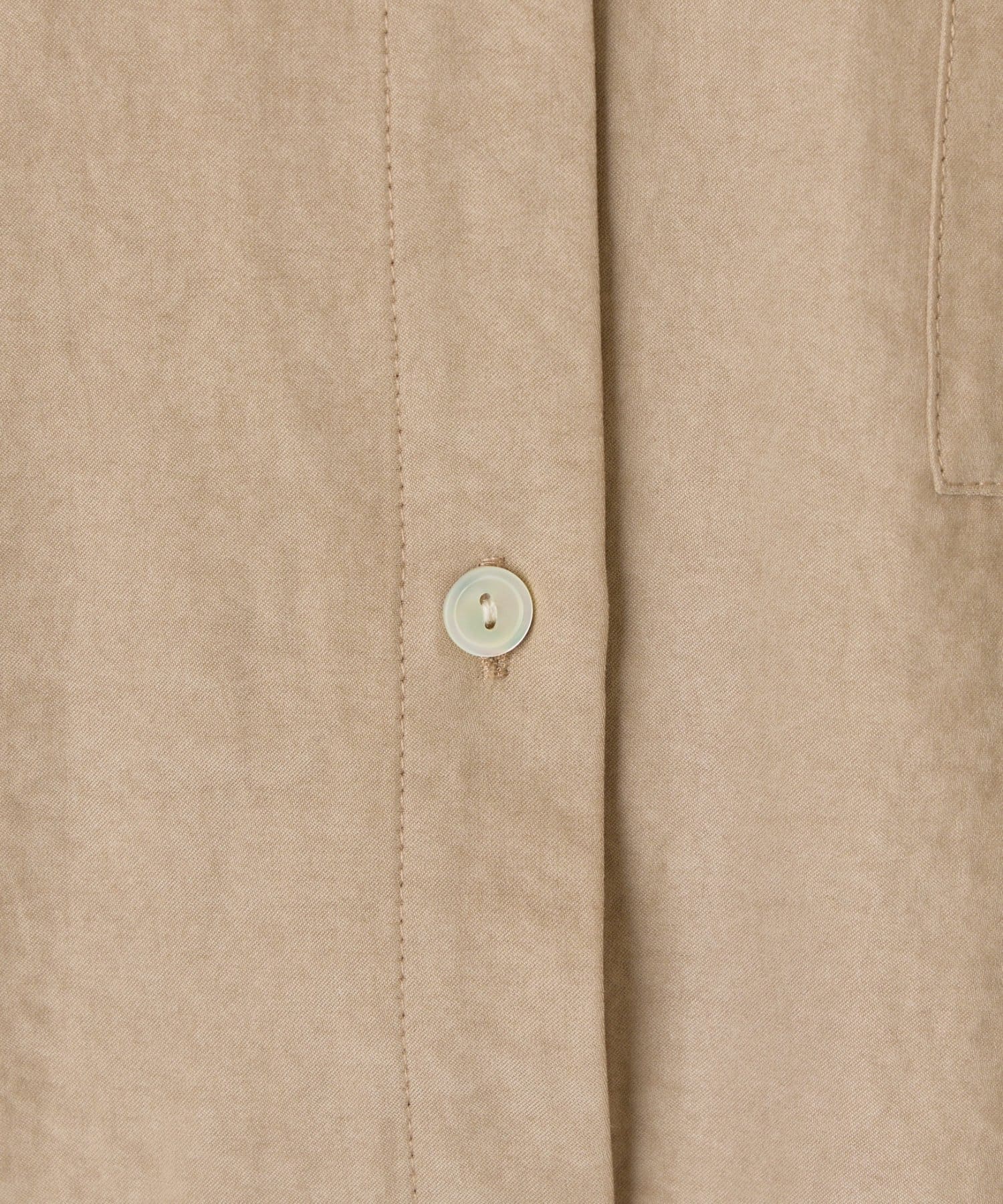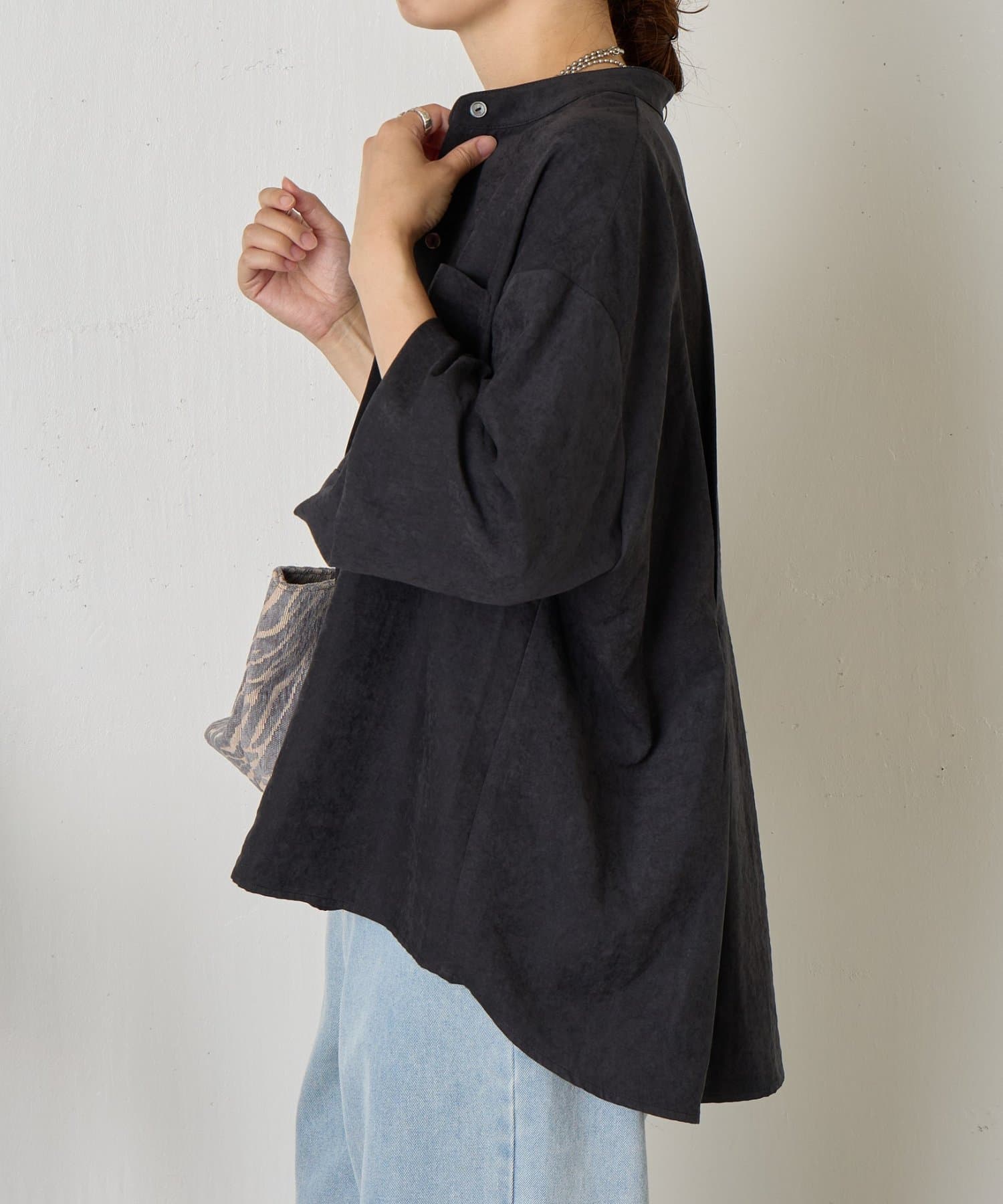 ・柔らかなスエード生地を使用し、上質な雰囲気を演出するスタンドカラーシャツ。