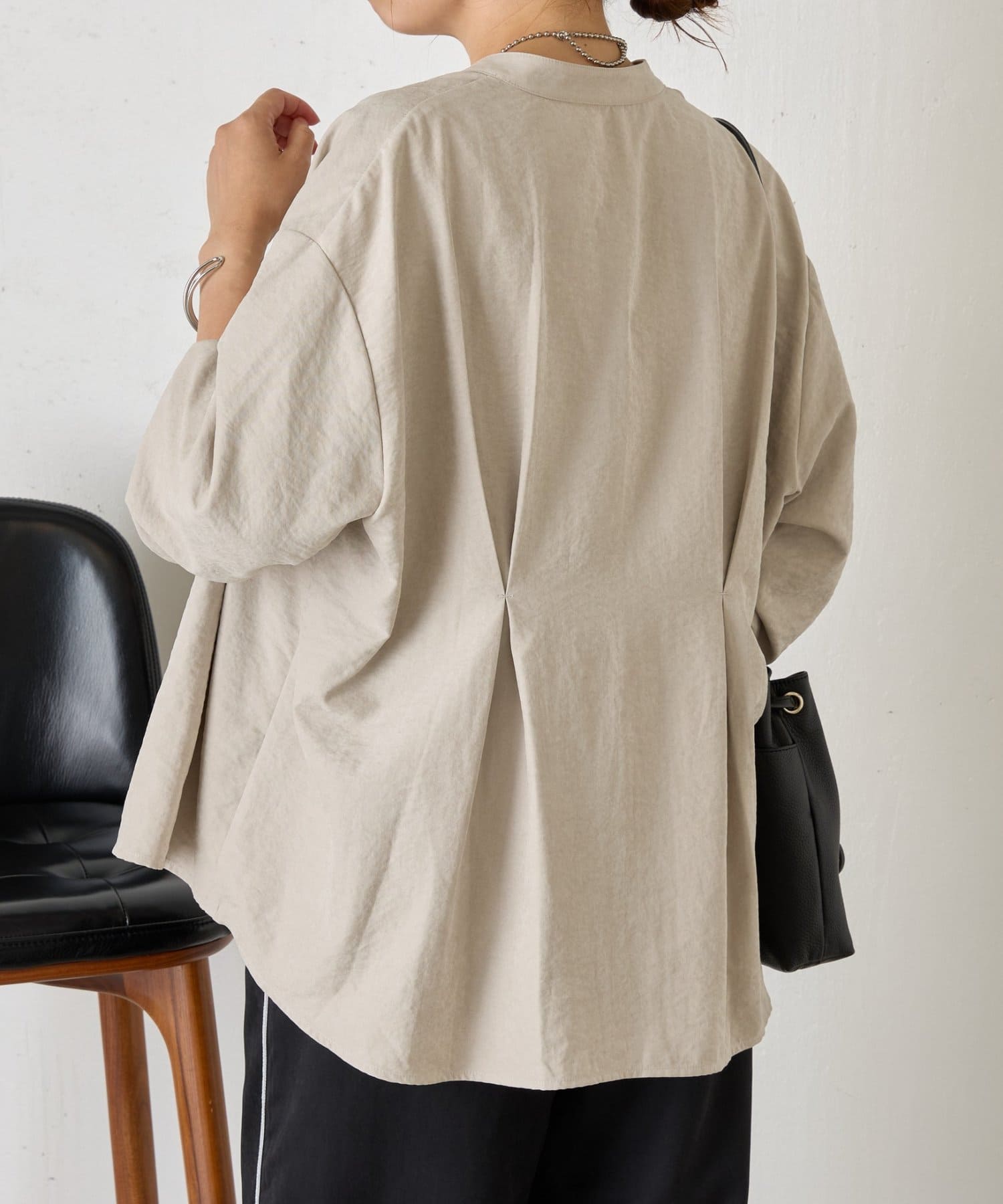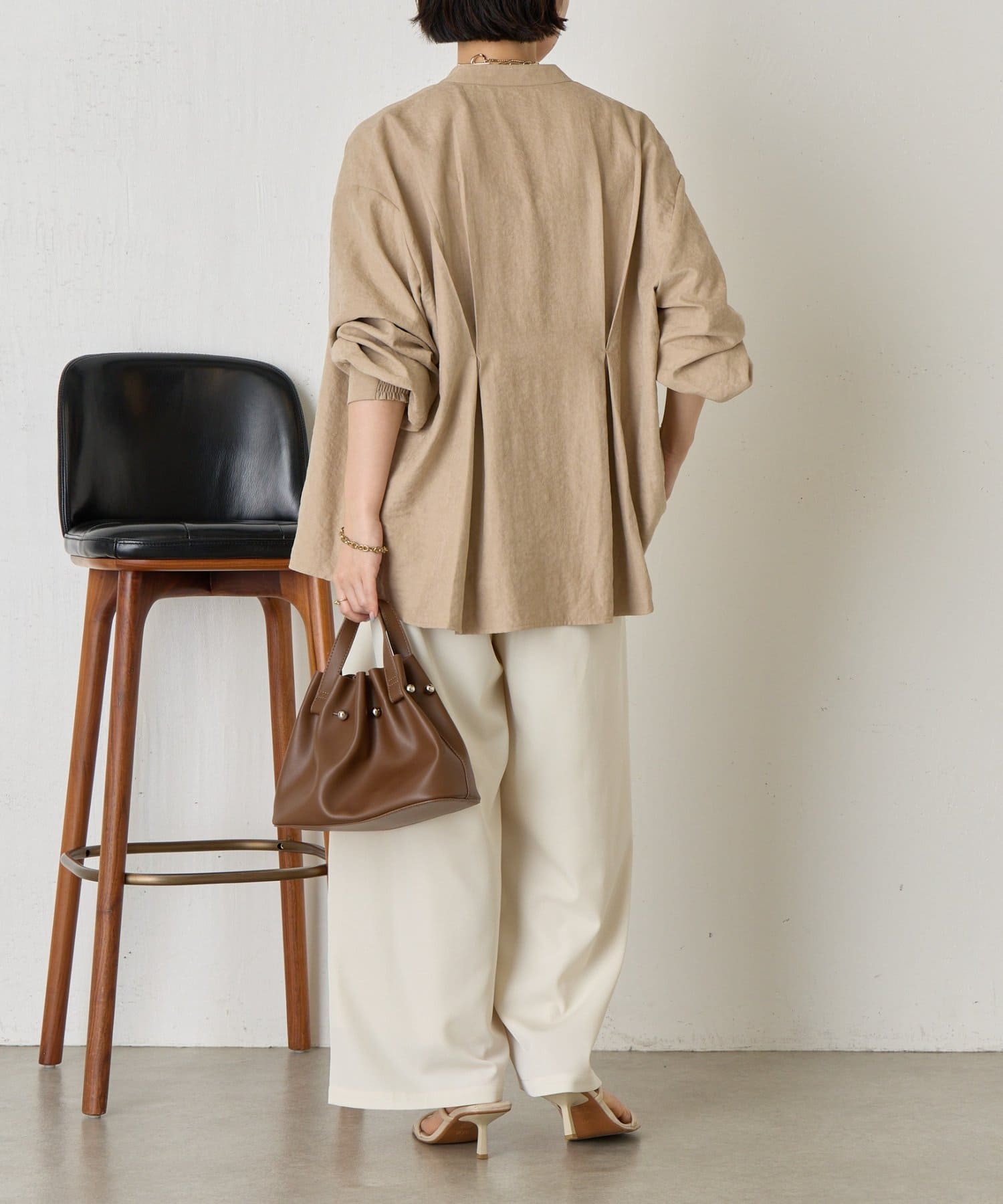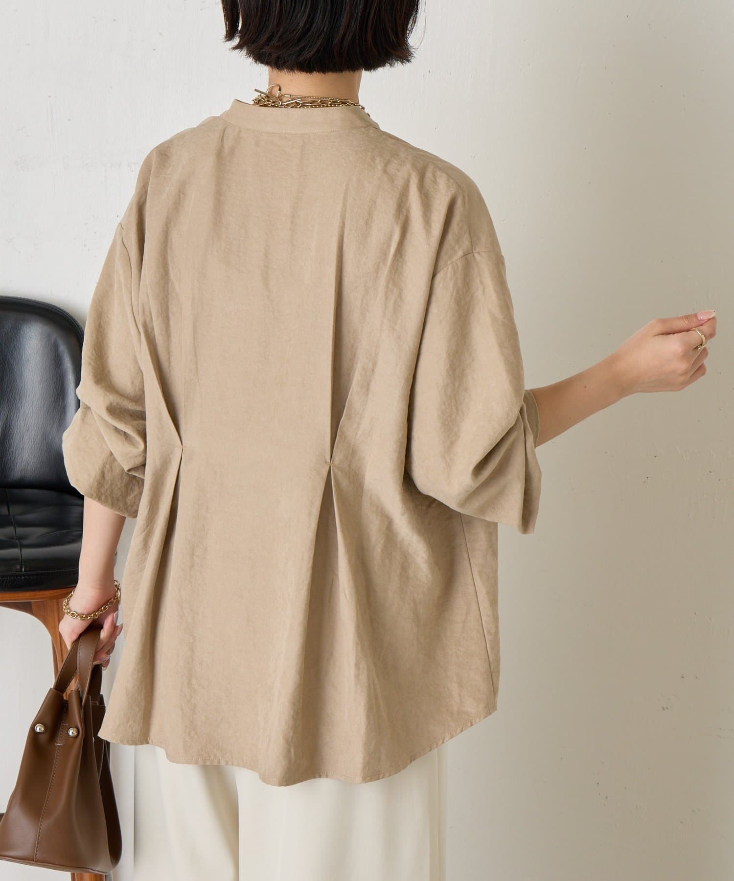 ・バックスタイルにはタックが施されており、後ろ姿にも立体感と動きをプラス。
