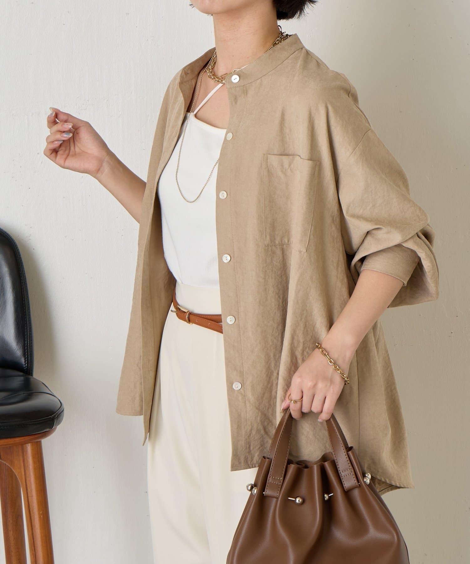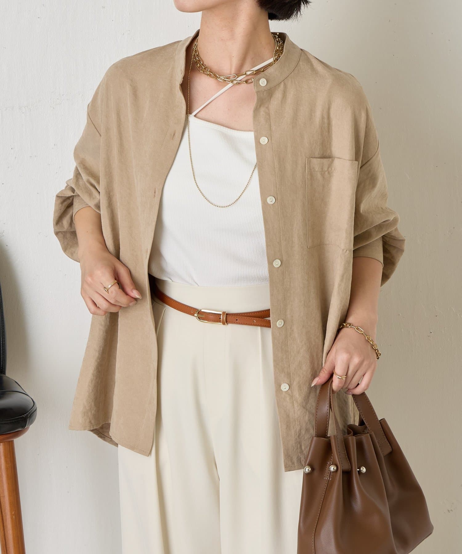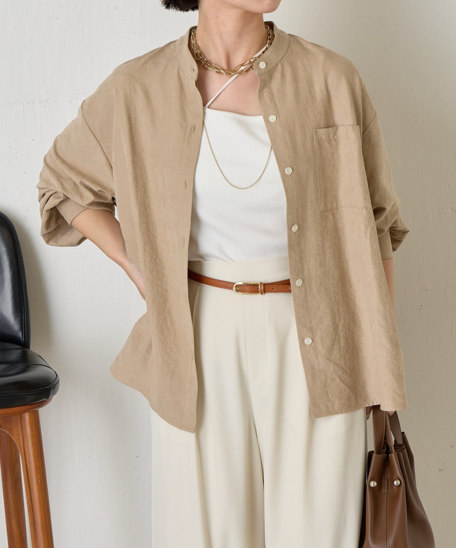 ・首元をすっきりと見せてくれるスタンドカラーは、ジャケットやカーディガンとも好相性。