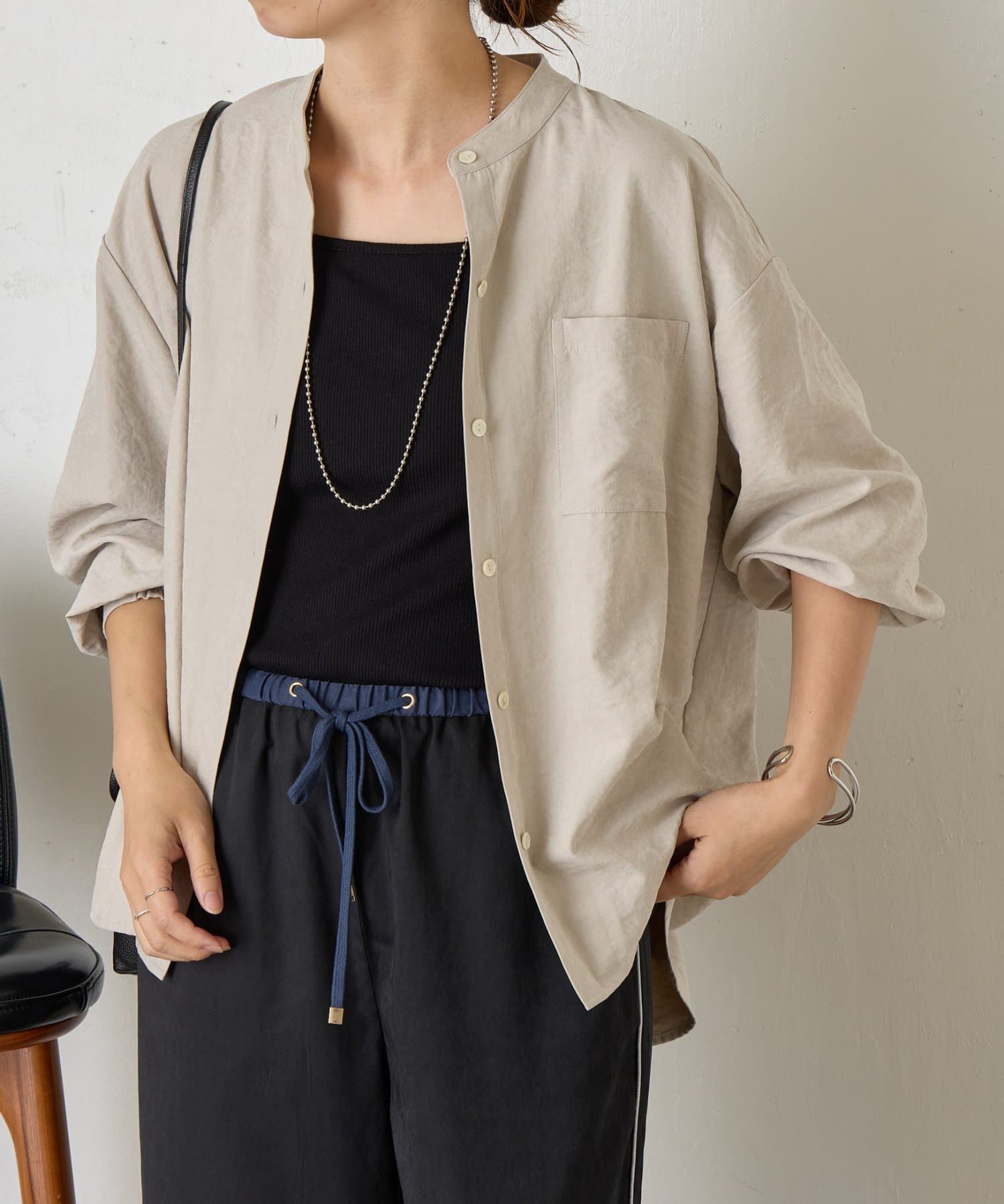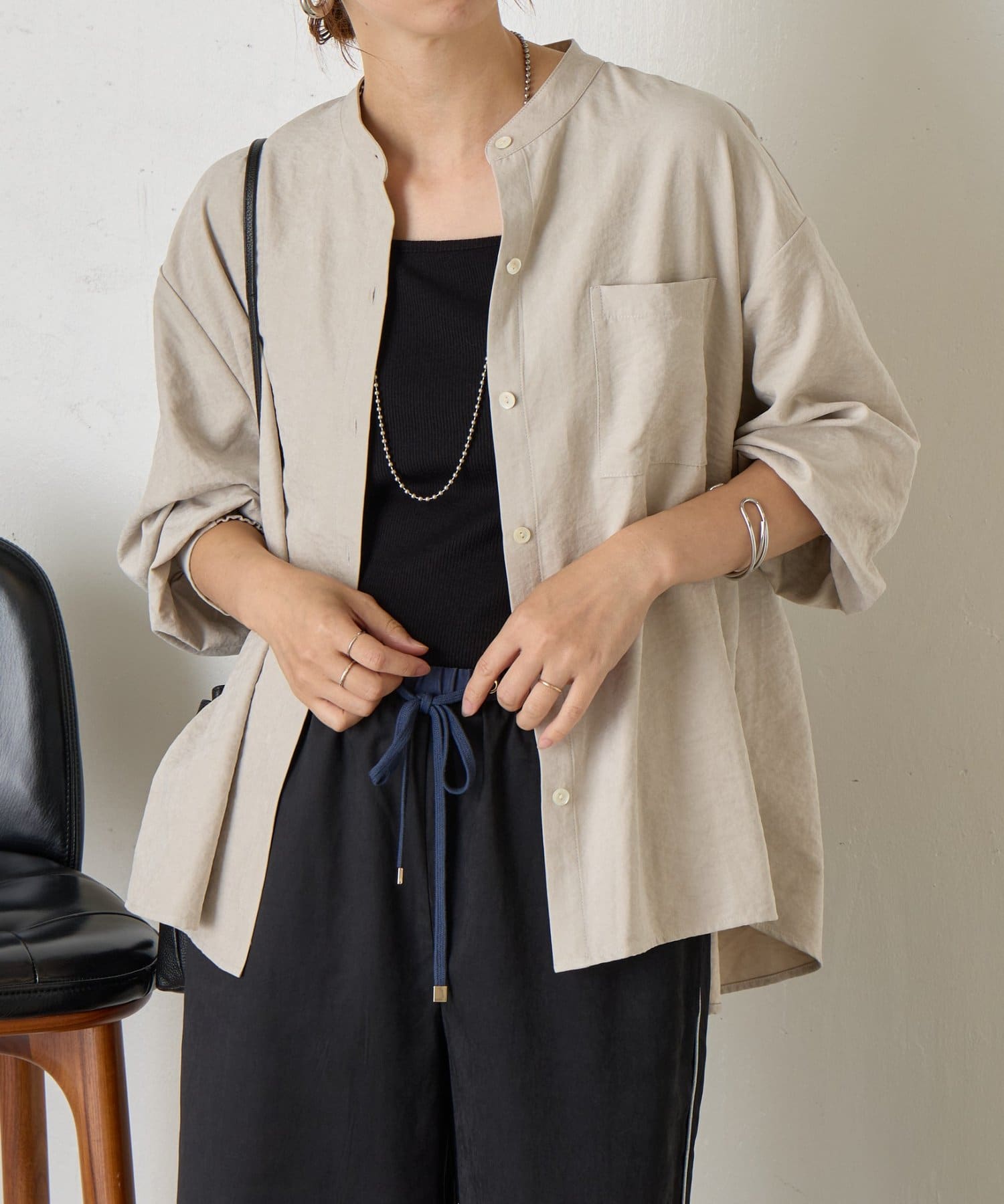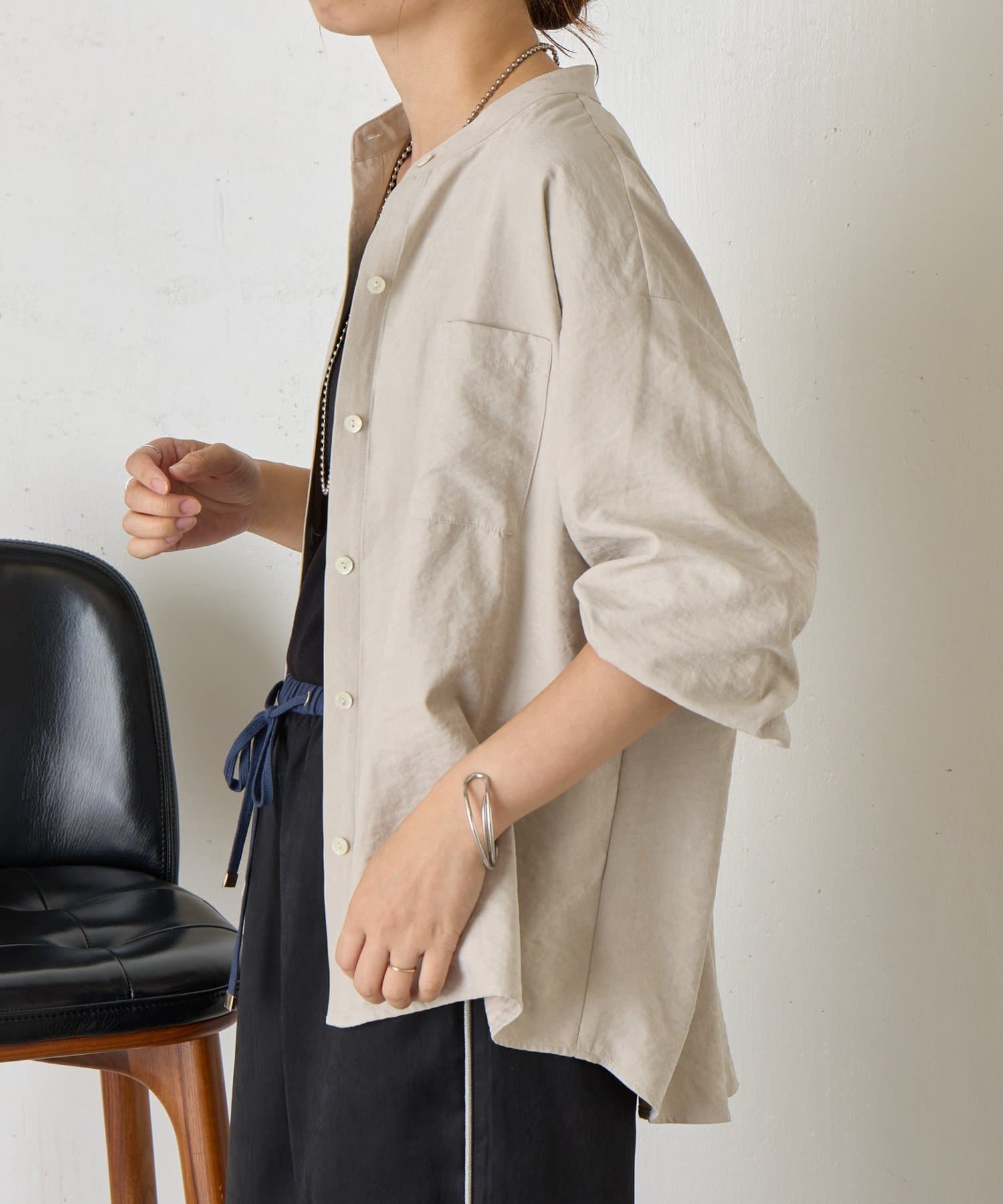 ・首元をすっきりと見せてくれるスタンドカラーは、ジャケットやカーディガンとも好相性。