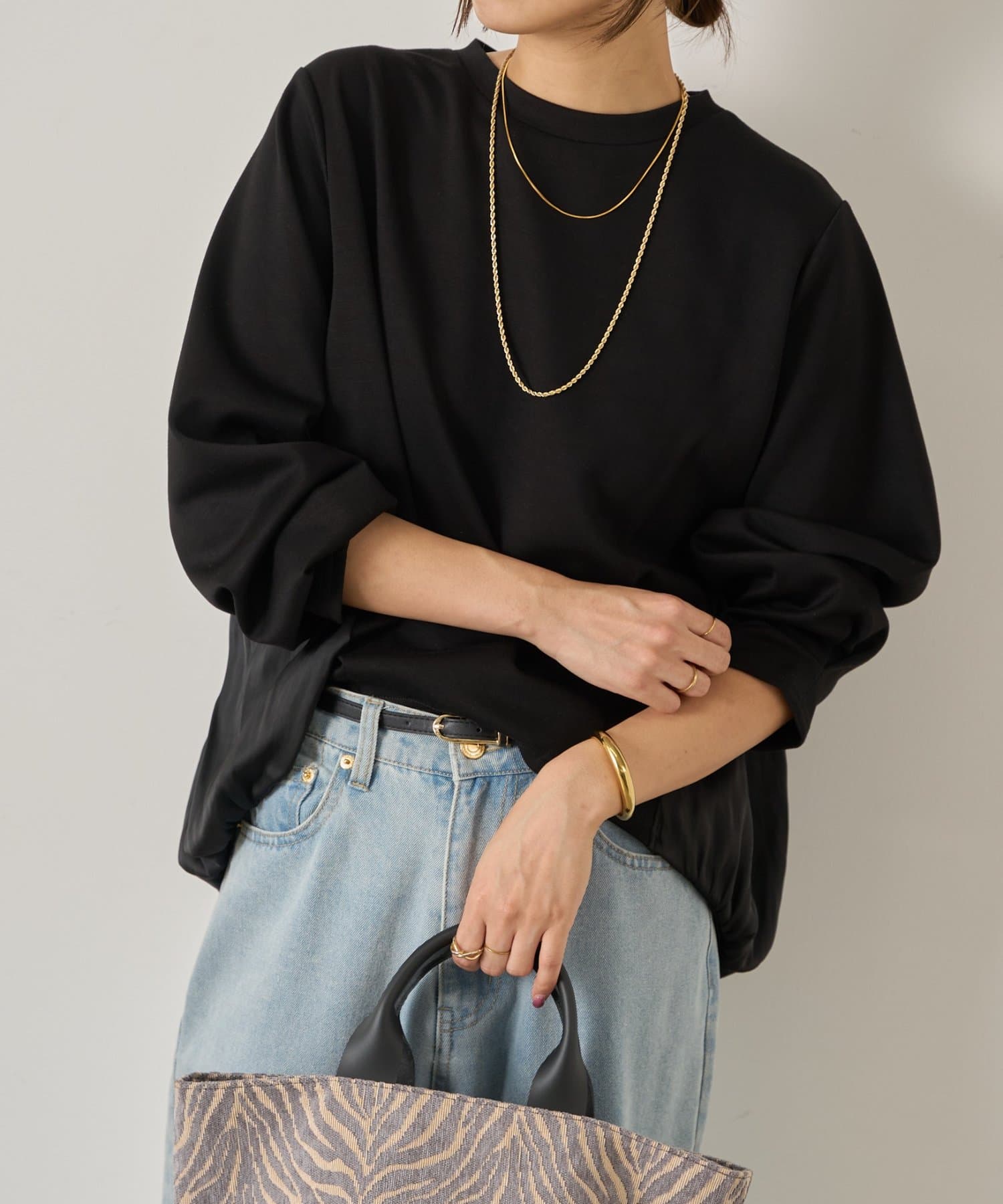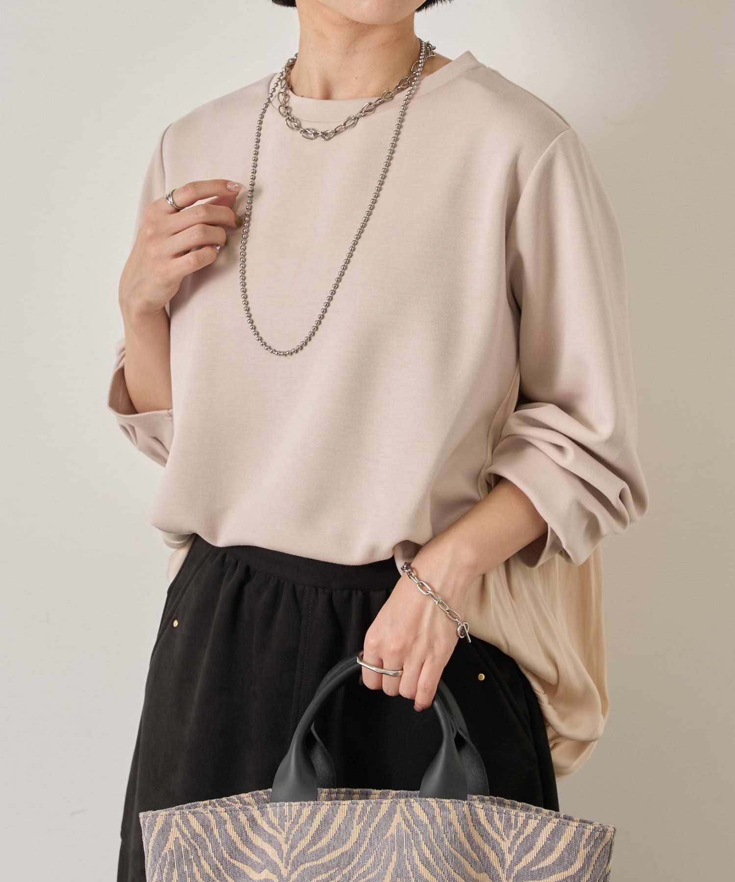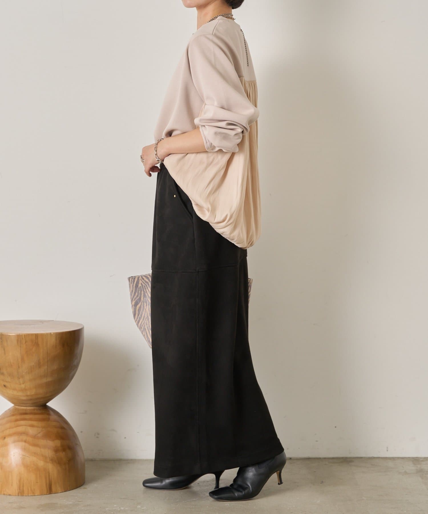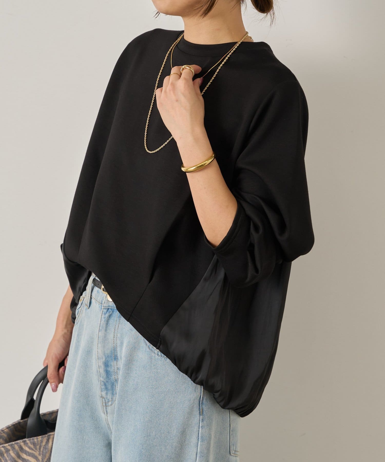 ・前はシンプルながら、後ろ身頃に異素材をドッキングすることで一枚で着映えするデザインに◎