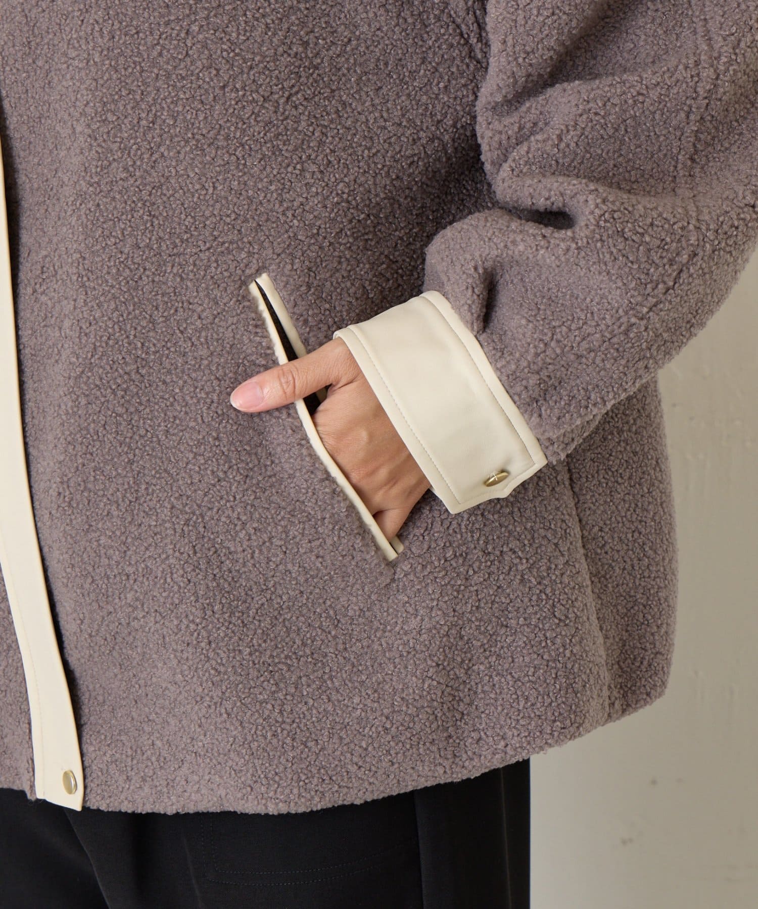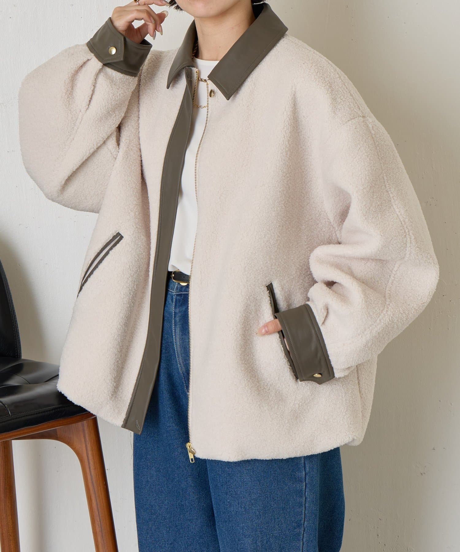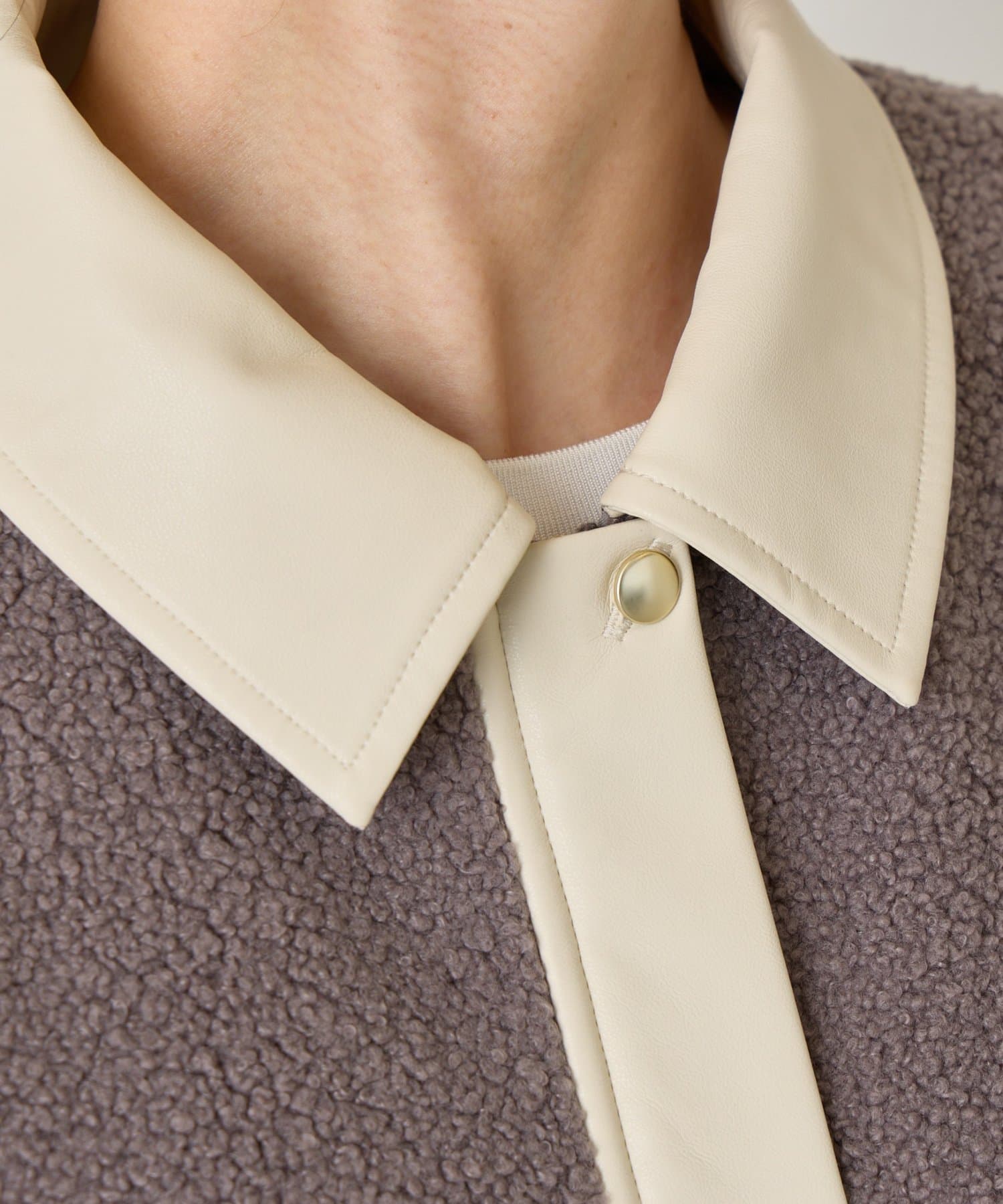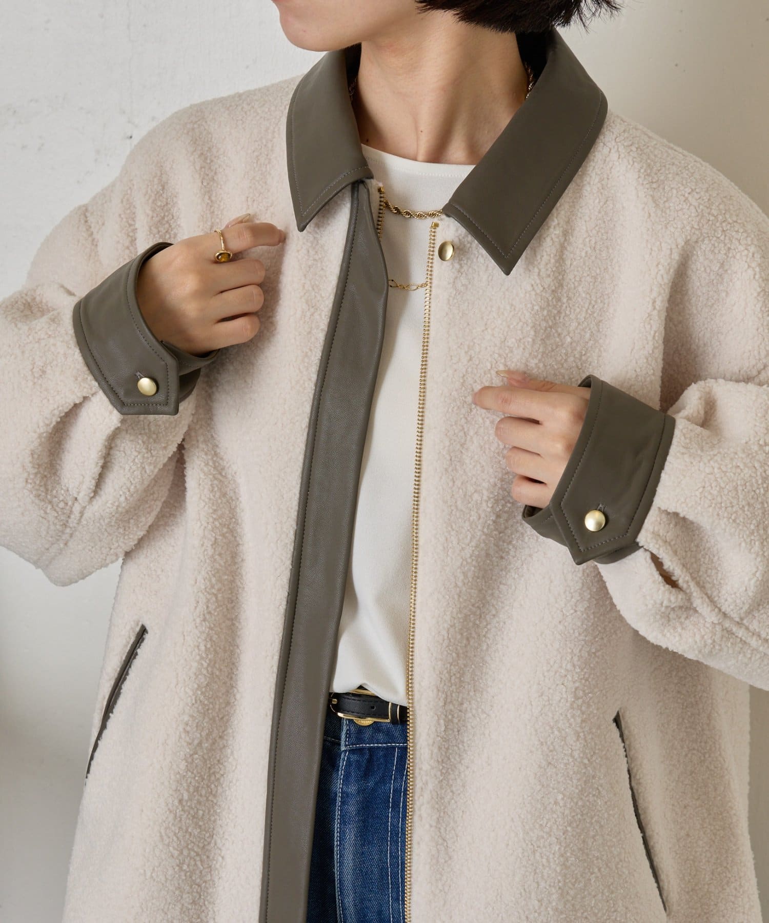 ・衿と袖口部分のエコレザー切替のデザインが全体をぐっと引き締め、甘さとクールさを絶妙にミックスしたボアジャケット。