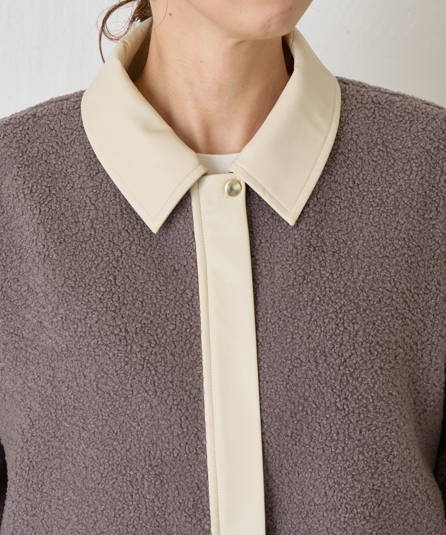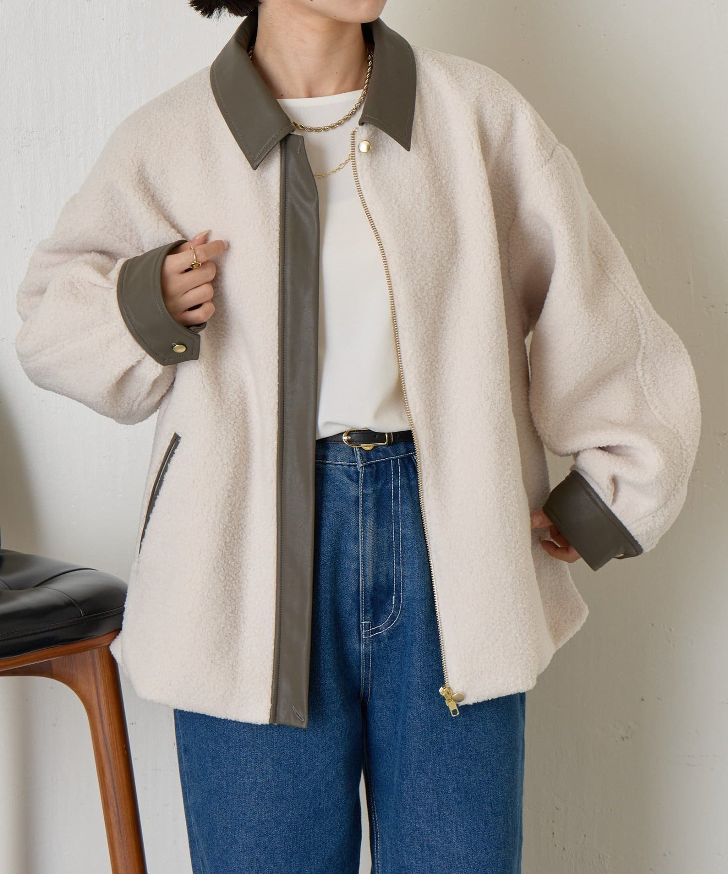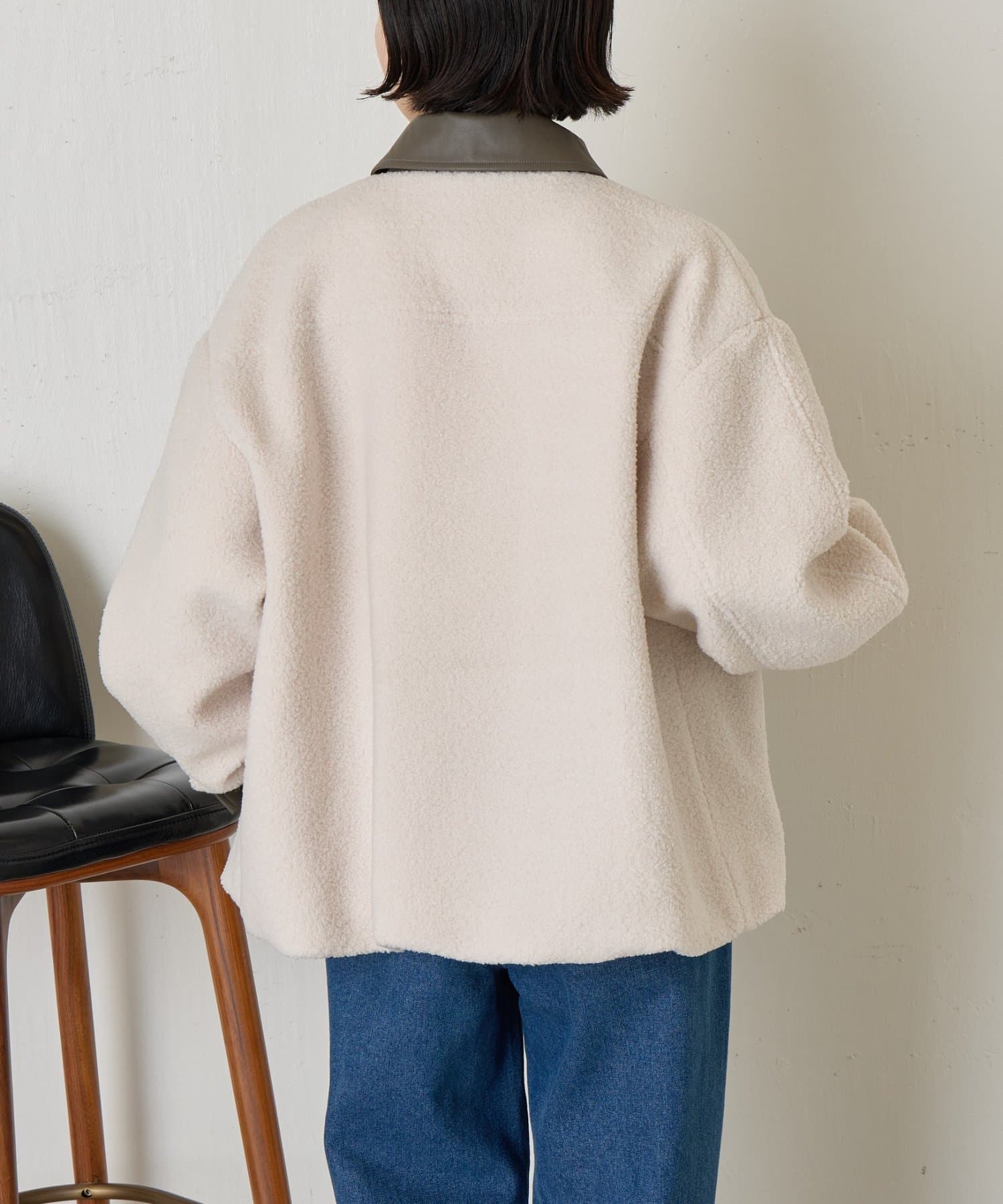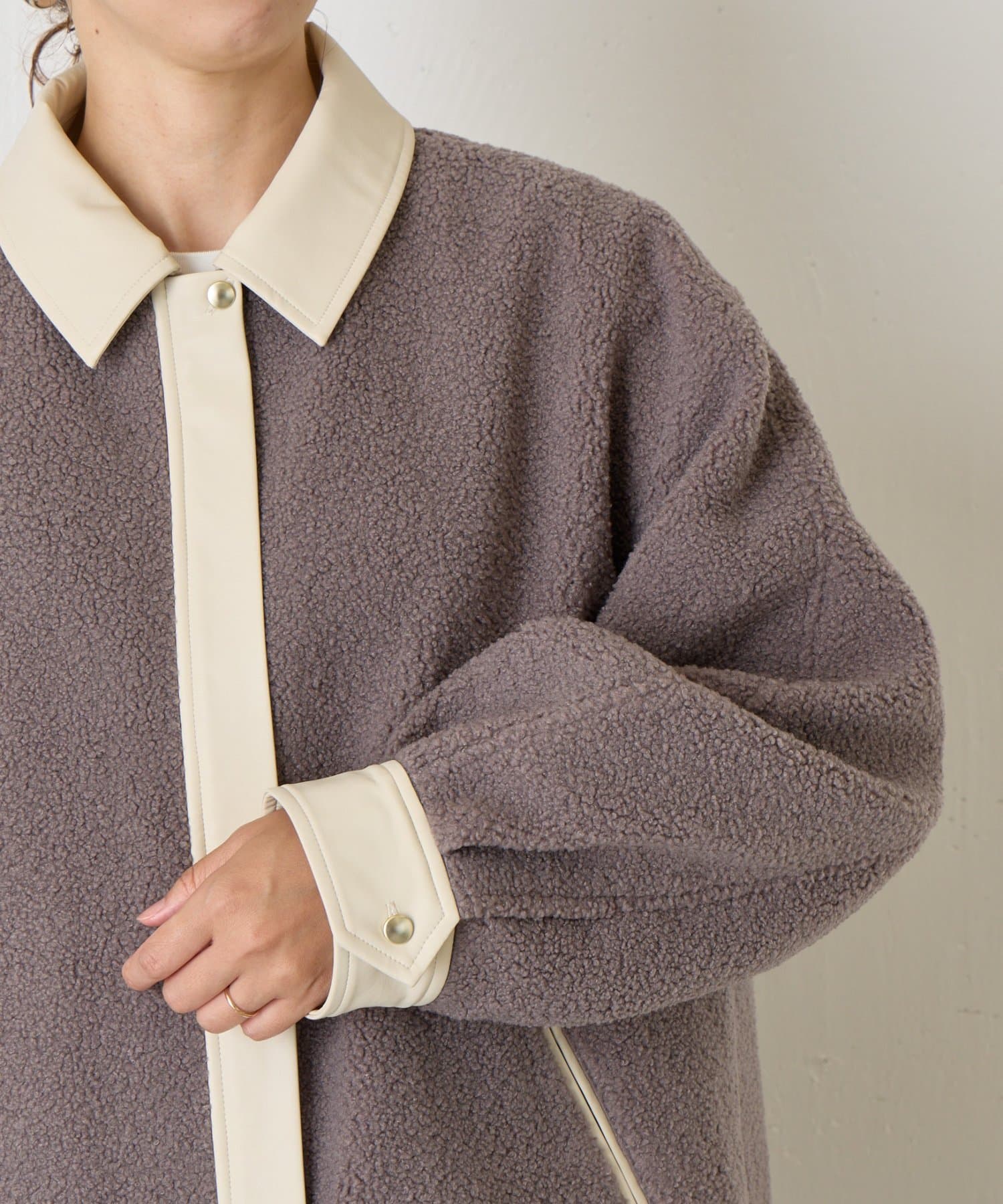 ・衿と袖口部分のエコレザー切替のデザインが全体をぐっと引き締め、甘さとクールさを絶妙にミックスしたボアジャケット。