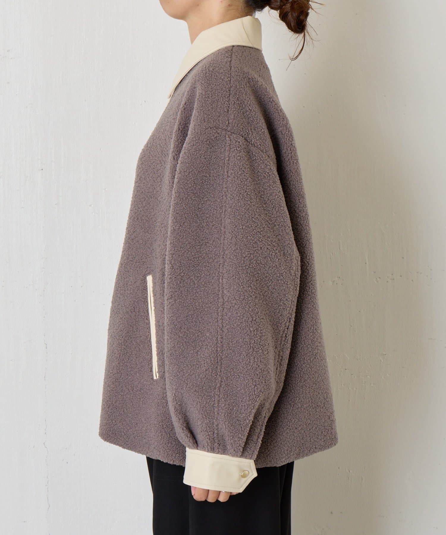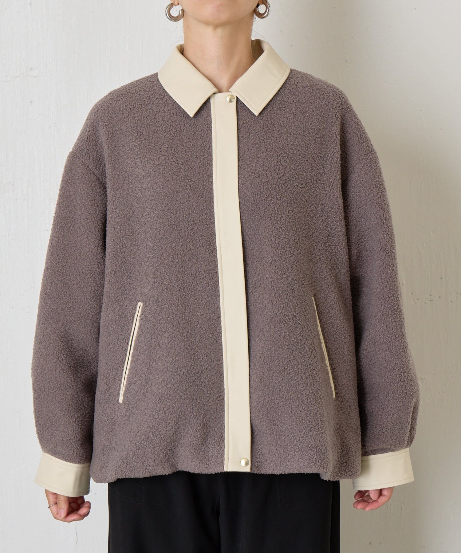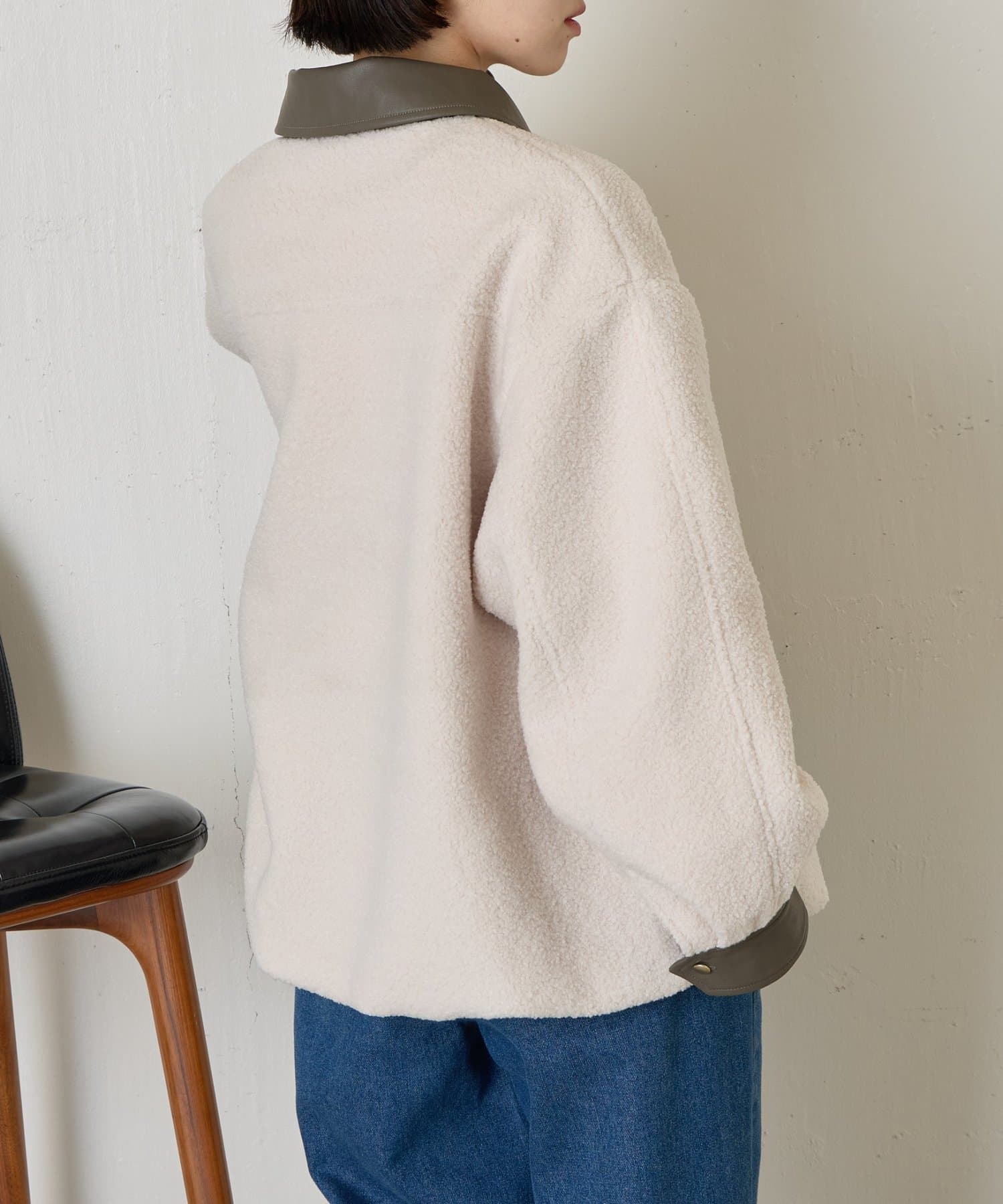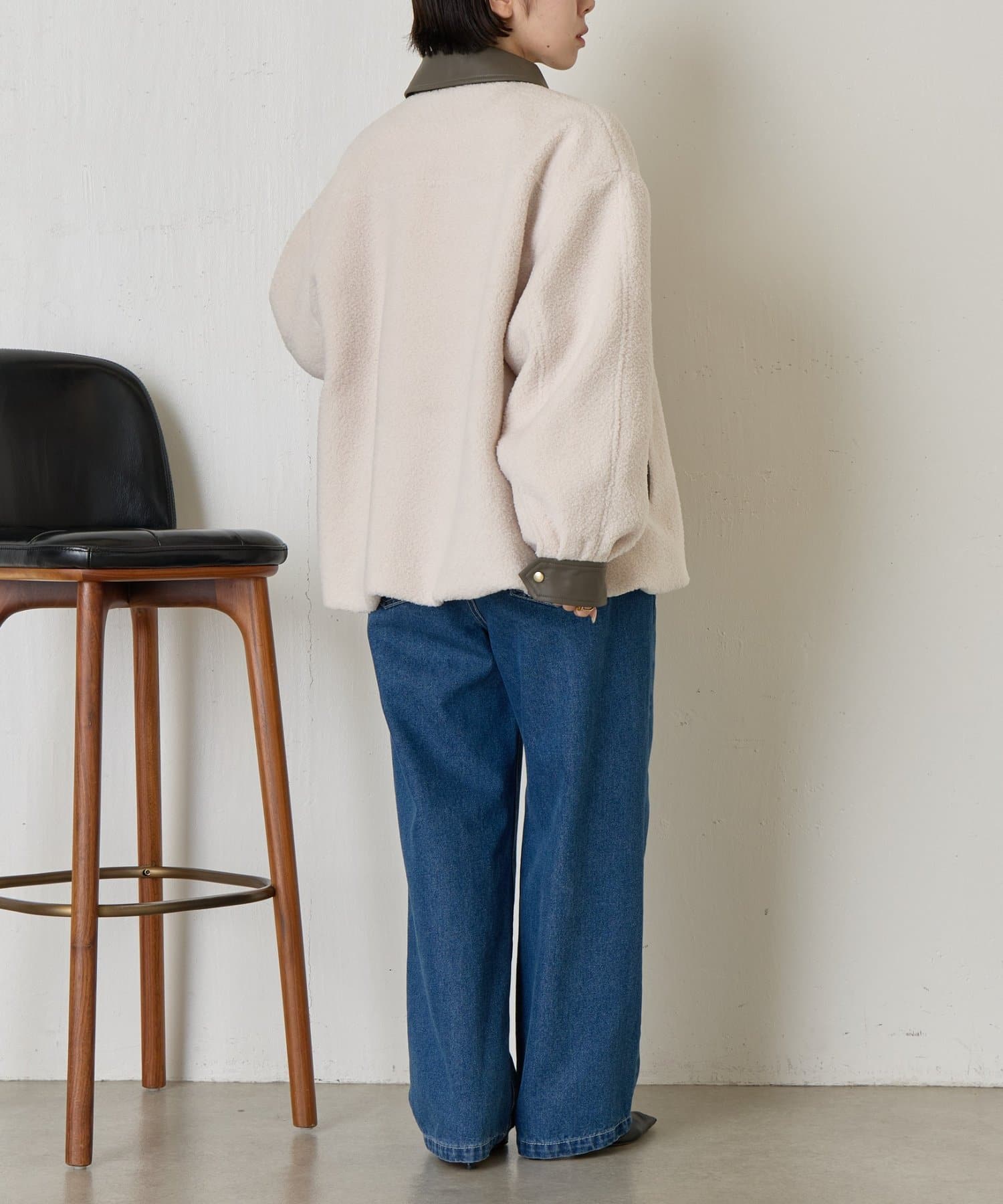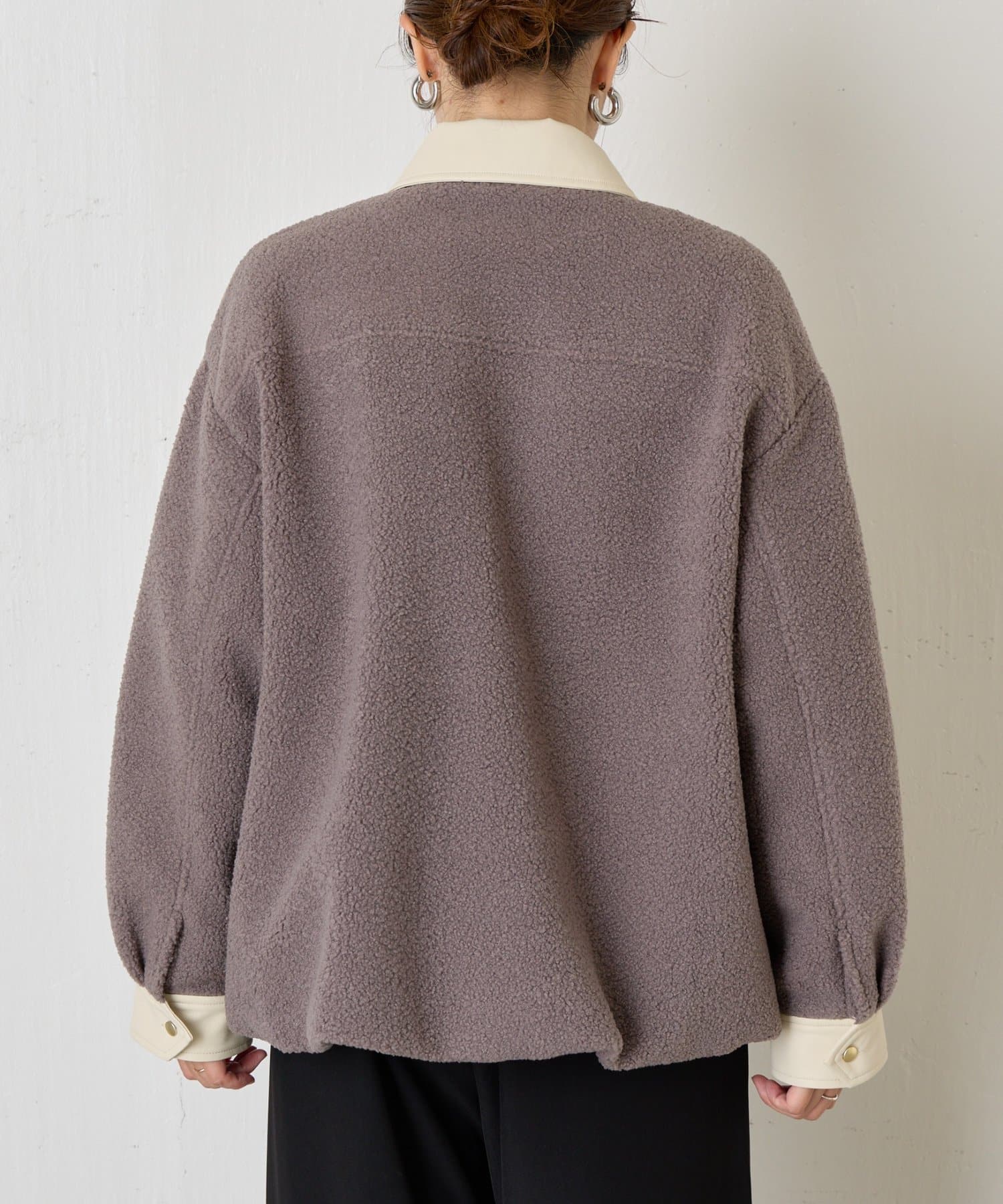 ・衿と袖口部分のエコレザー切替のデザインが全体をぐっと引き締め、甘さとクールさを絶妙にミックスしたボアジャケット。
