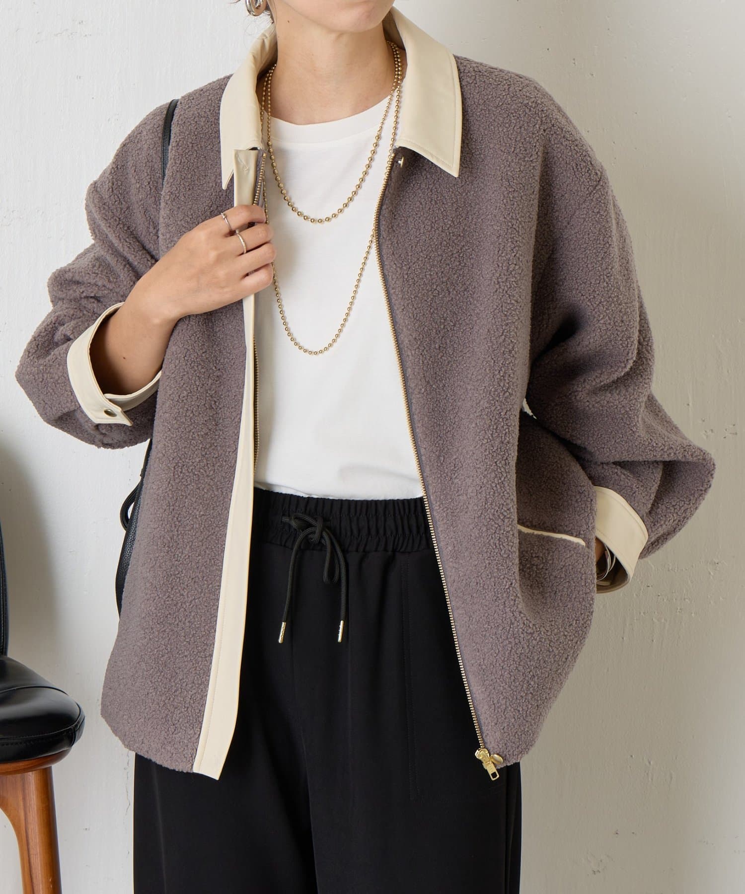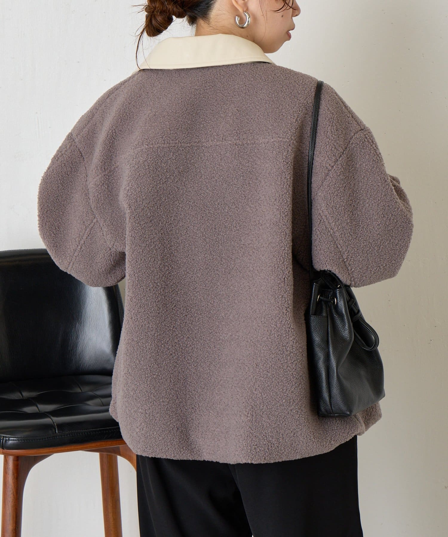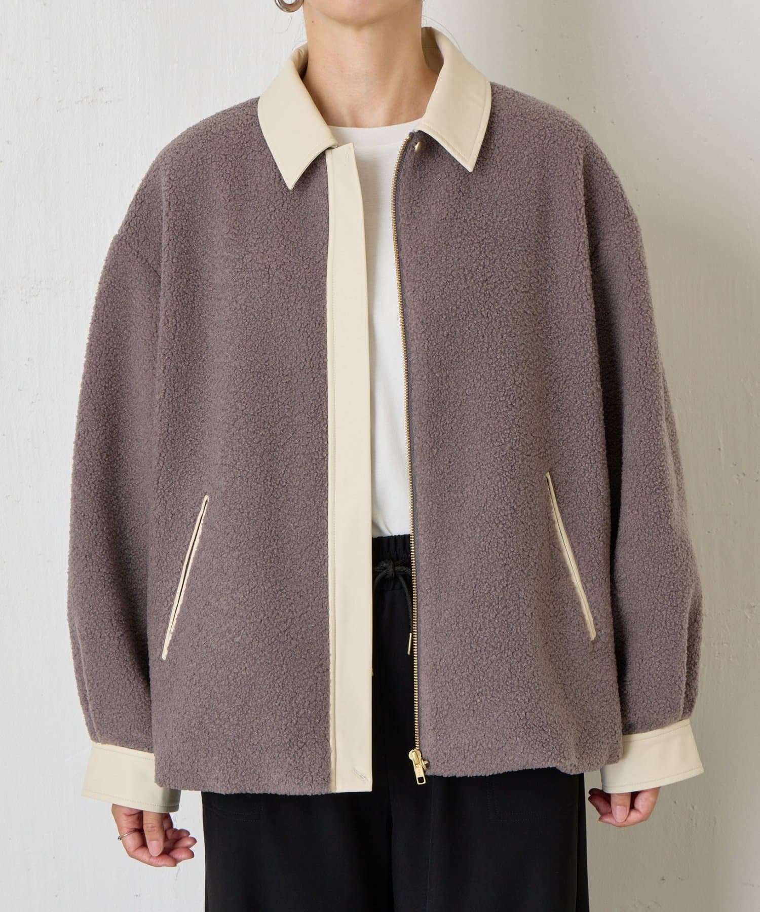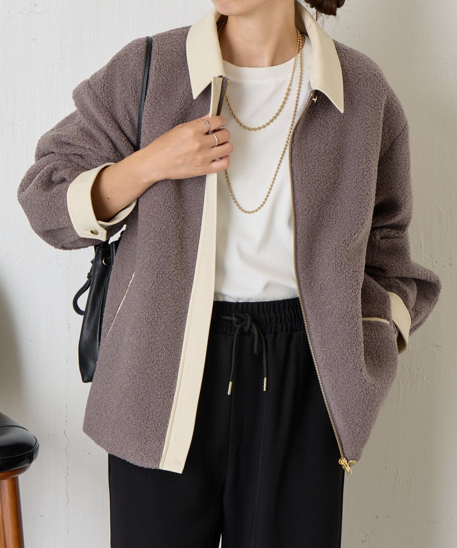 ・衿と袖口部分のエコレザー切替のデザインが全体をぐっと引き締め、甘さとクールさを絶妙にミックスしたボアジャケット。