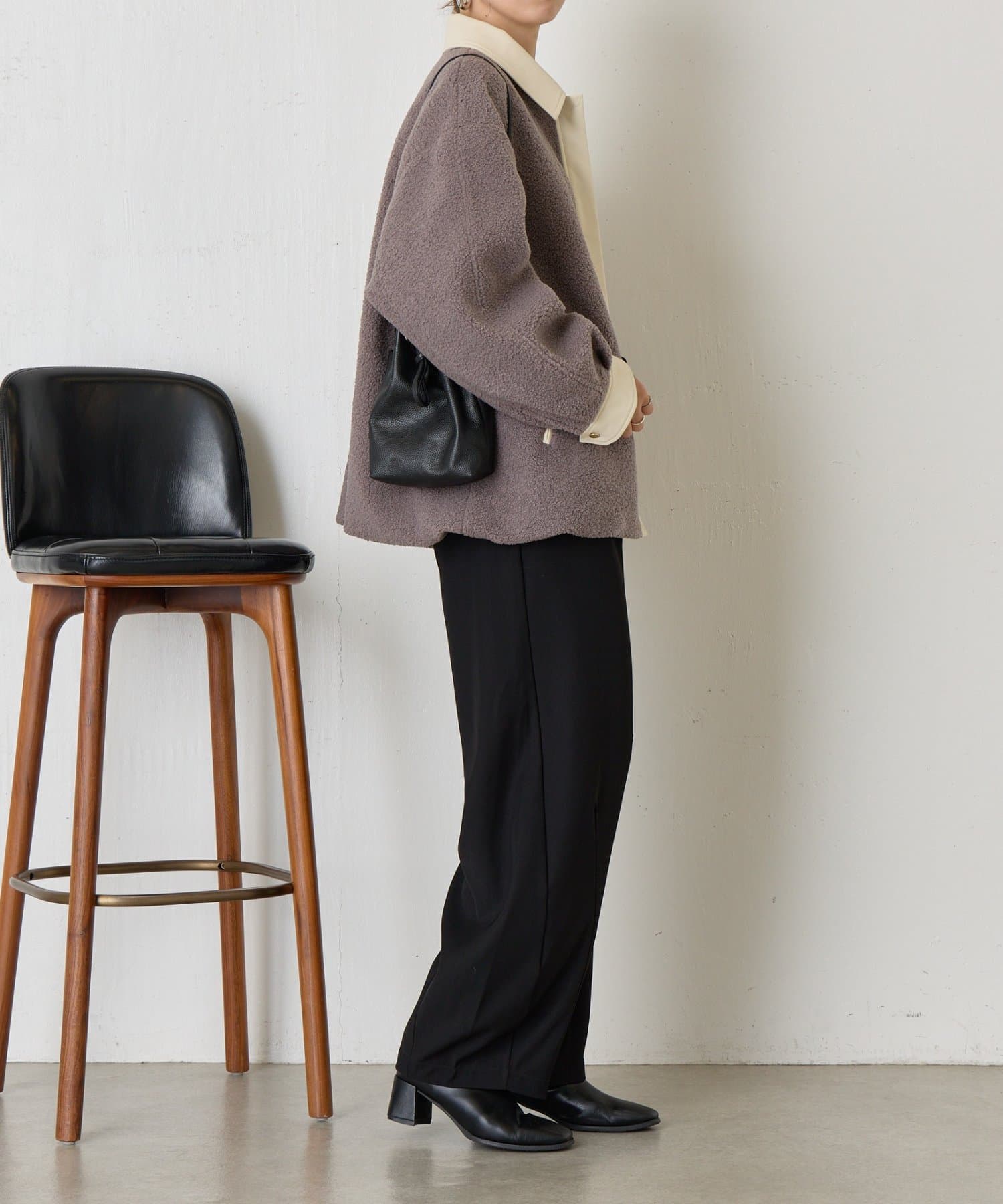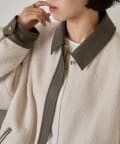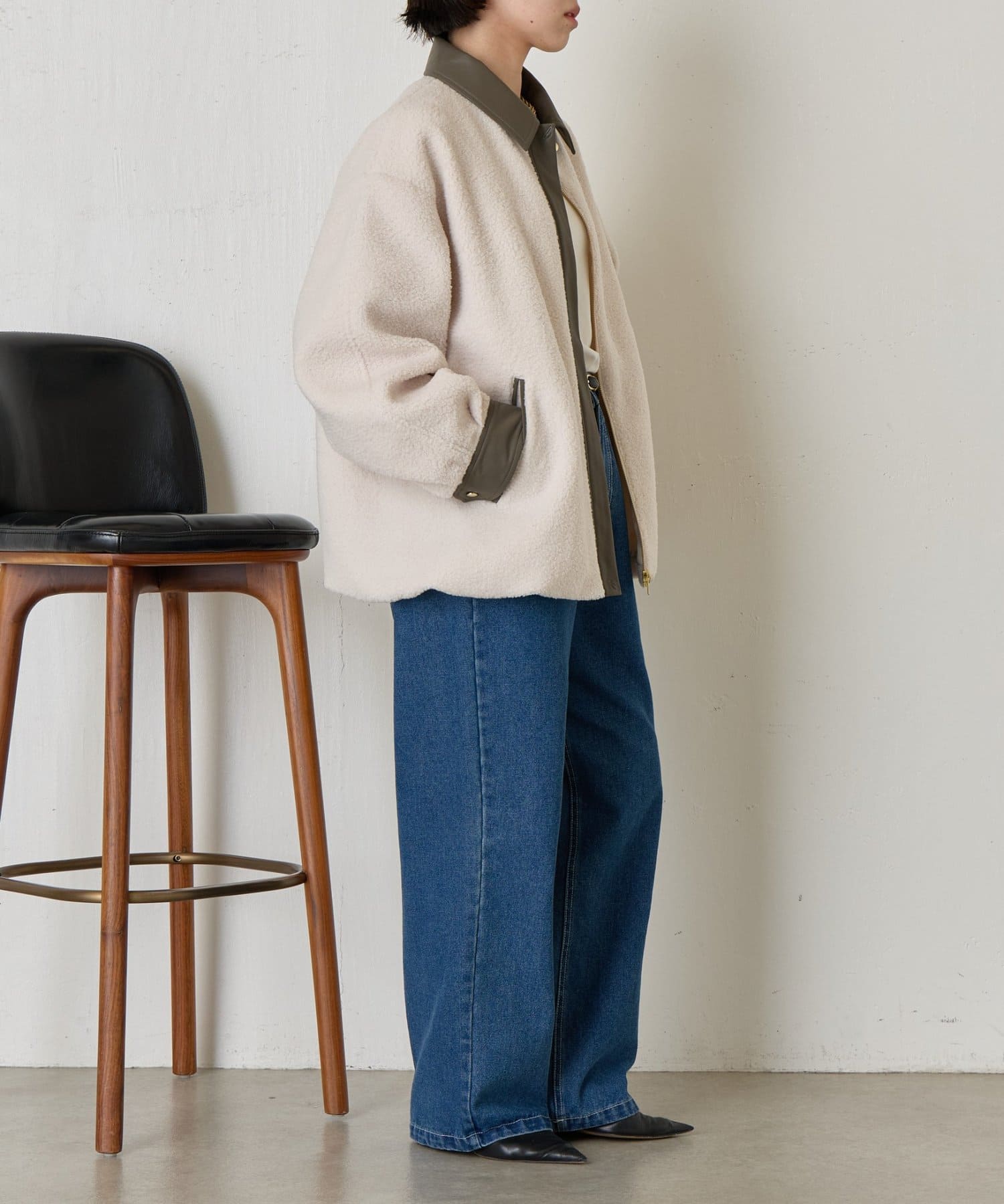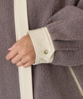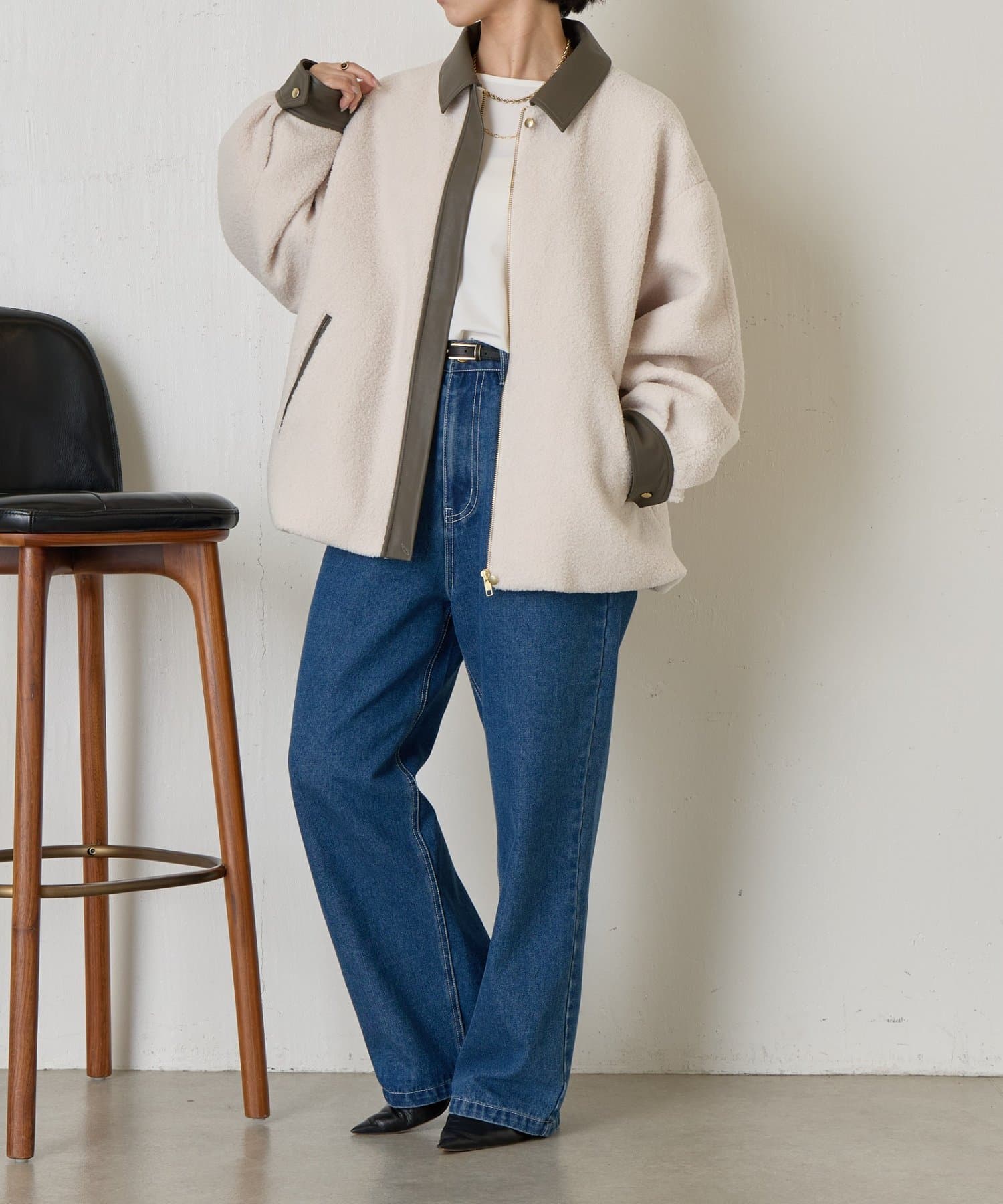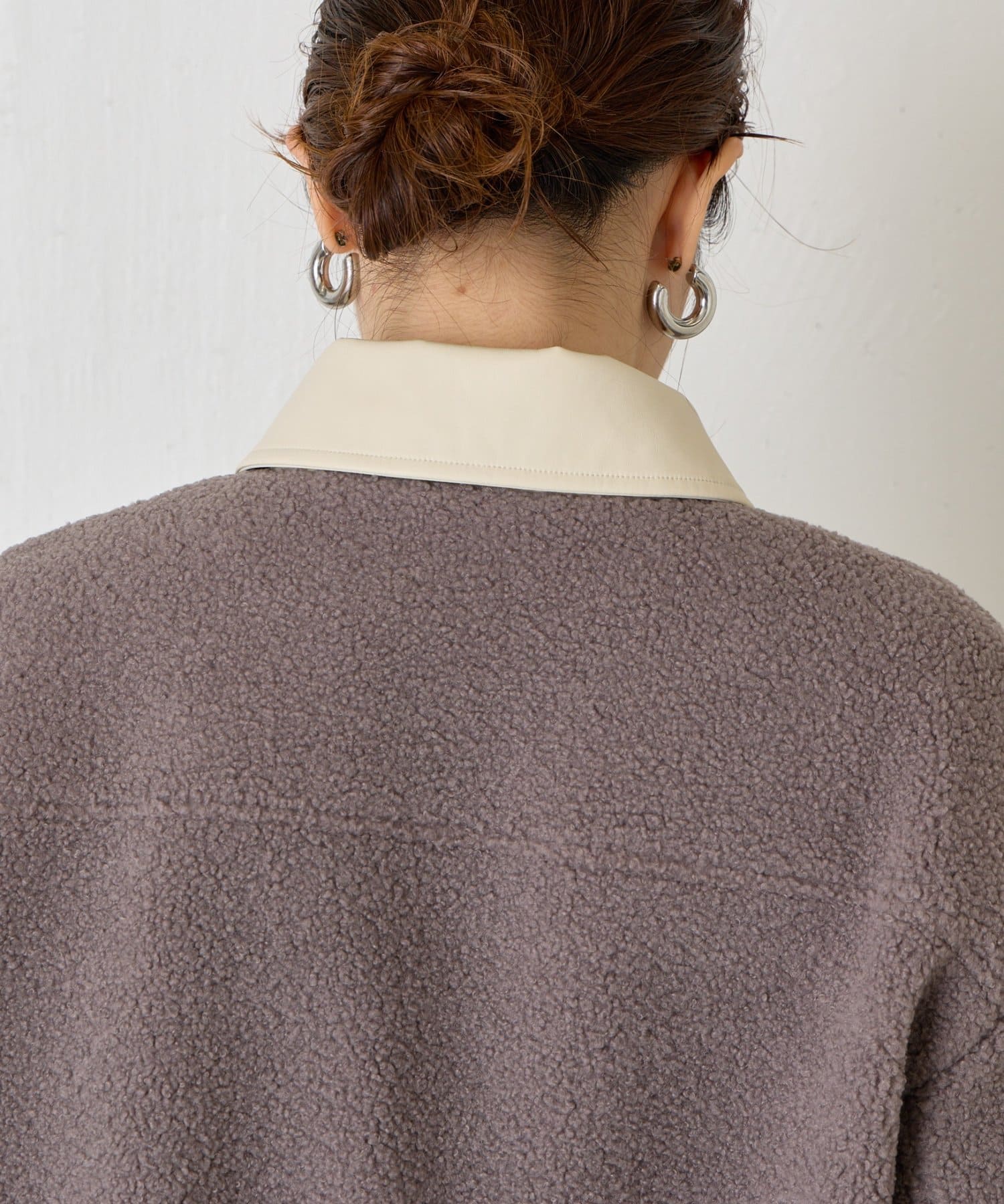 ・衿と袖口部分のエコレザー切替のデザインが全体をぐっと引き締め、甘さとクールさを絶妙にミックスしたボアジャケット。